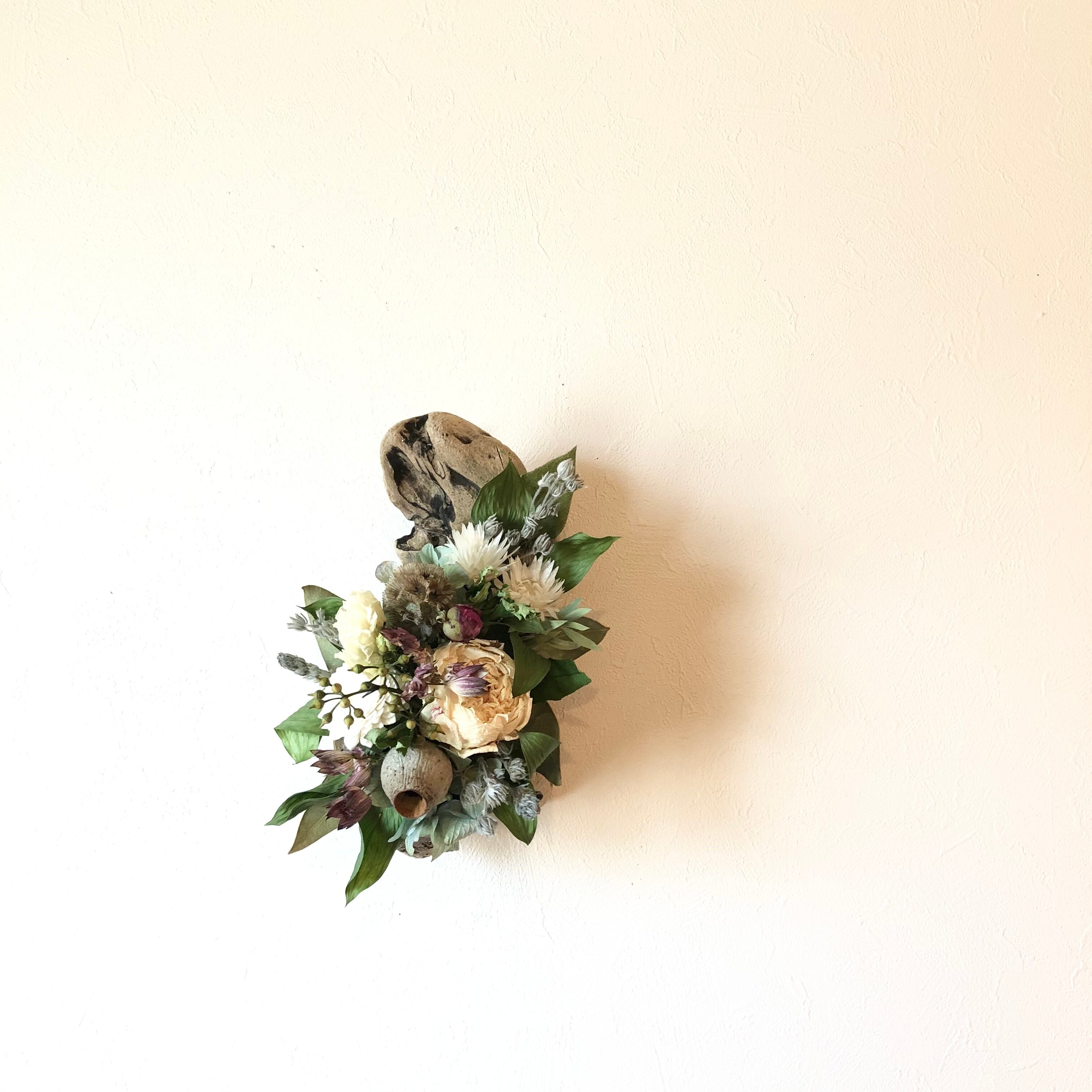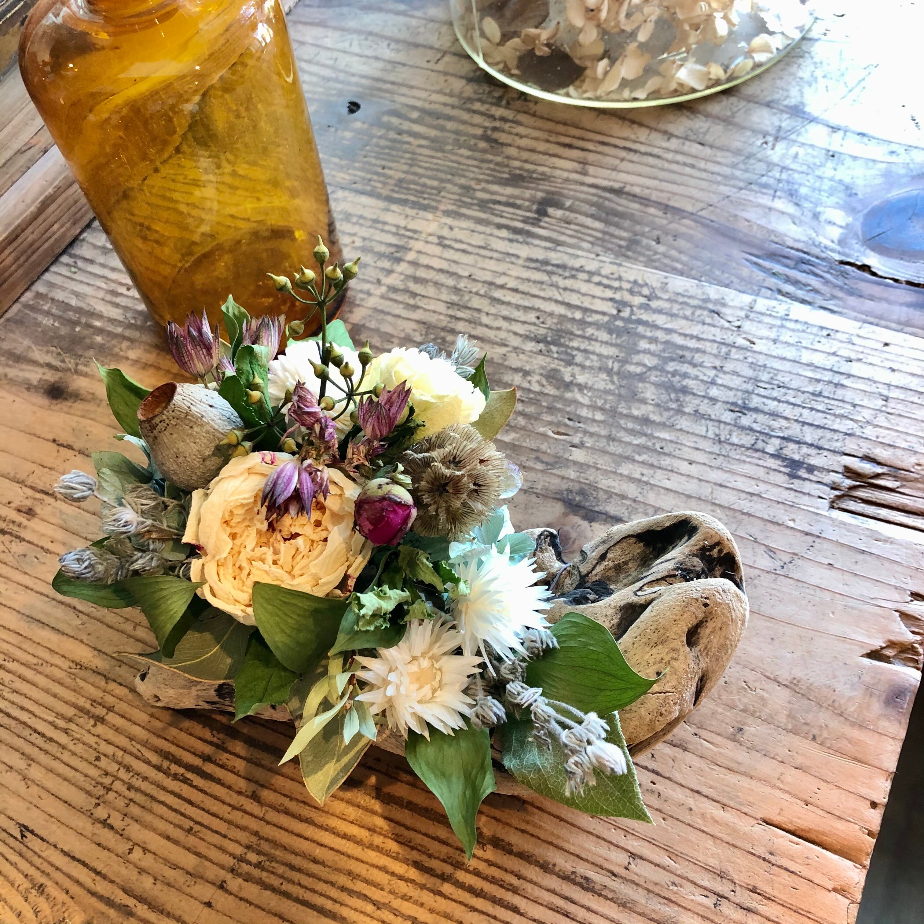 傷がついていたり、穴が開いていたり。その雰囲気はドライフラワーのシックな色合いともとても相性がいいです。