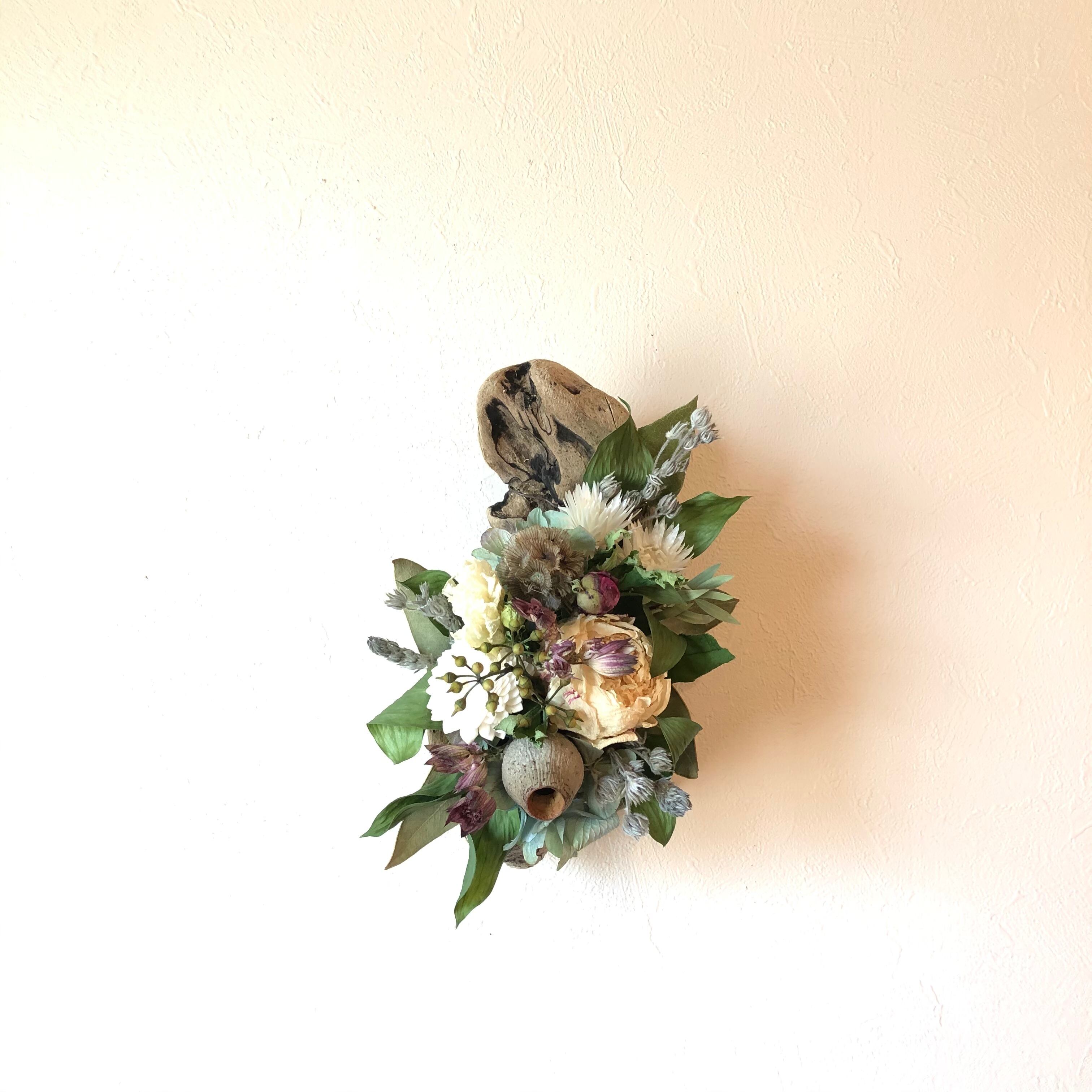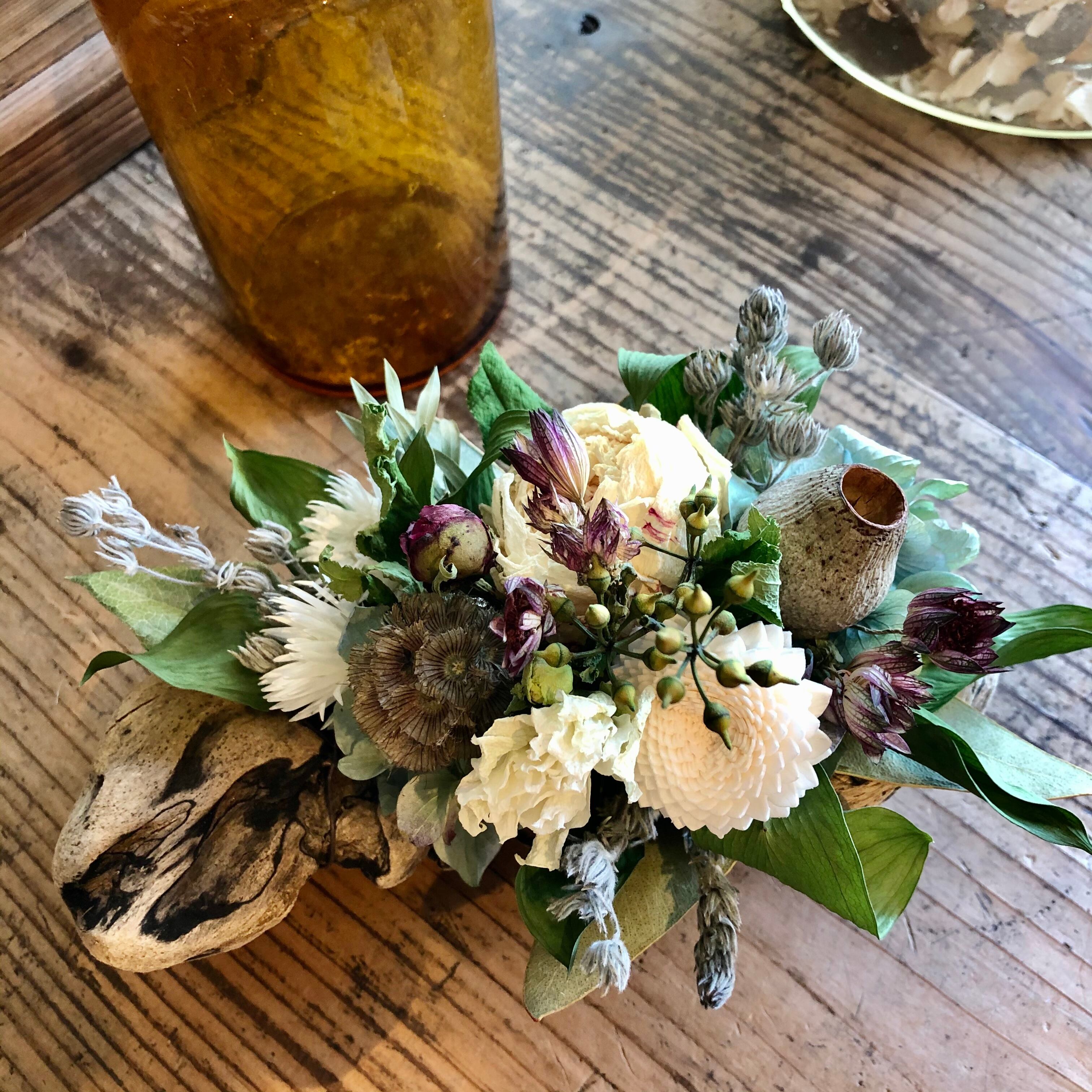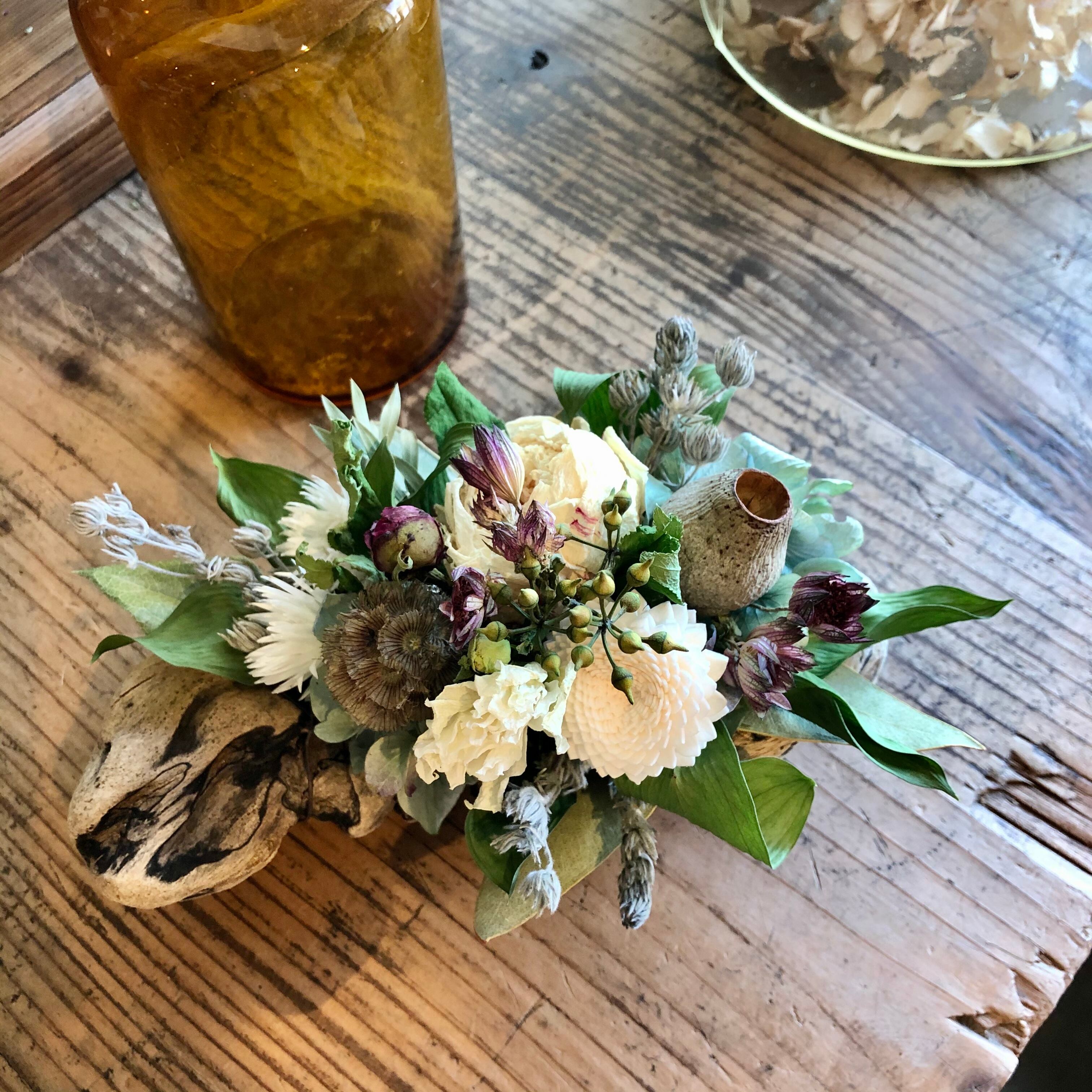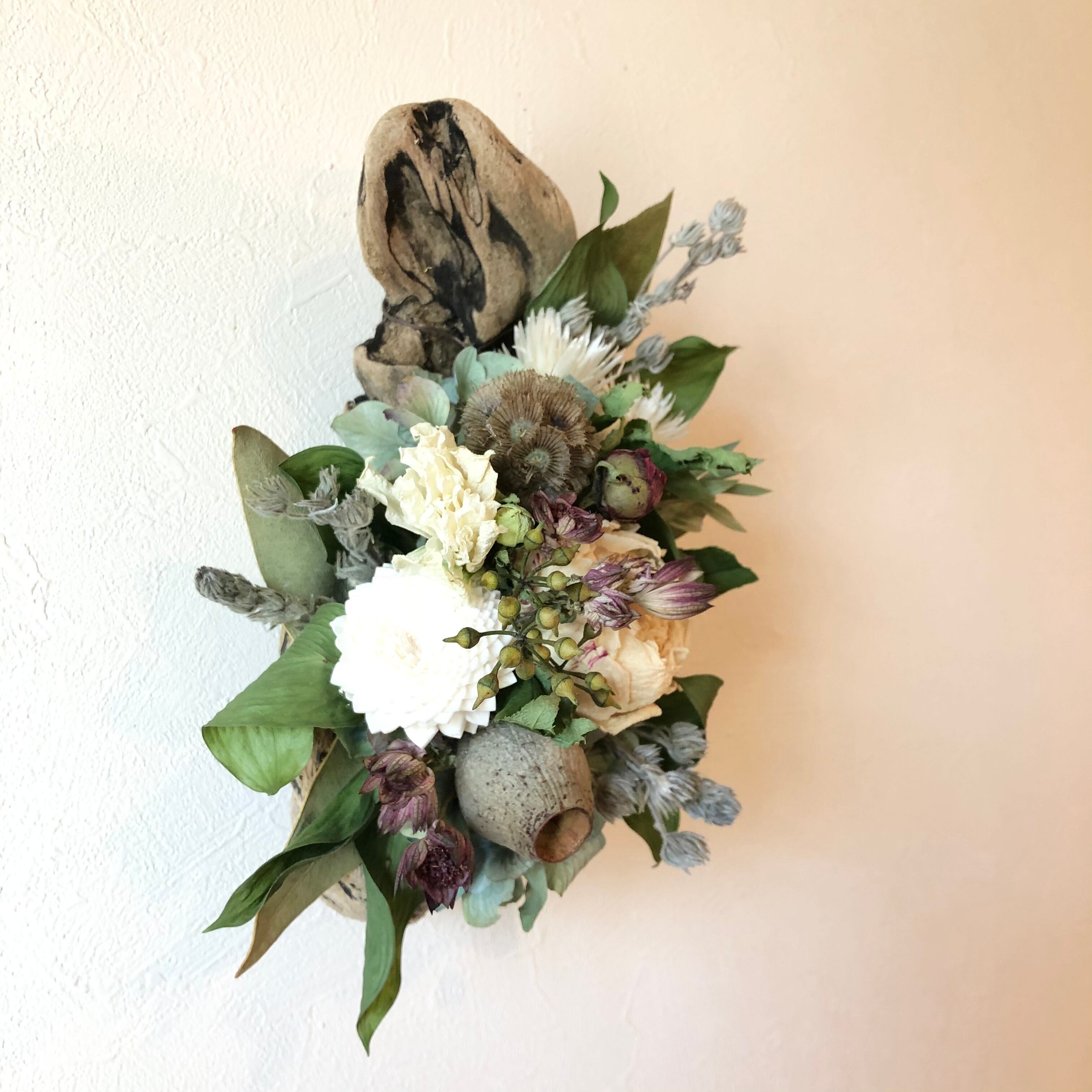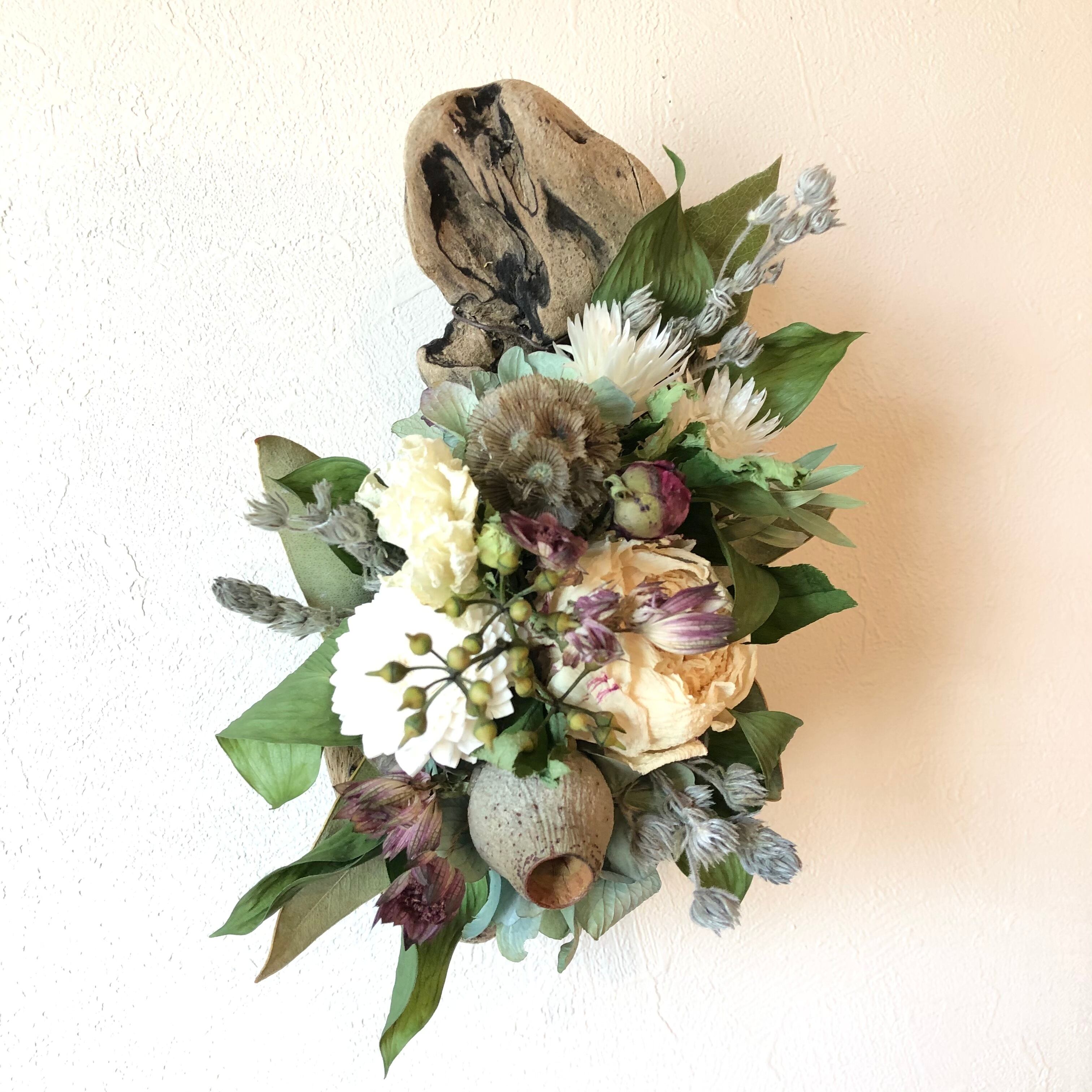 ぽってりとした丸みがかわいい流木に、白のシャクヤクをメインにアジサイ、ユーカリの実、ステルンクーゲルなどを入れてシックで落ち着いた色合いに。