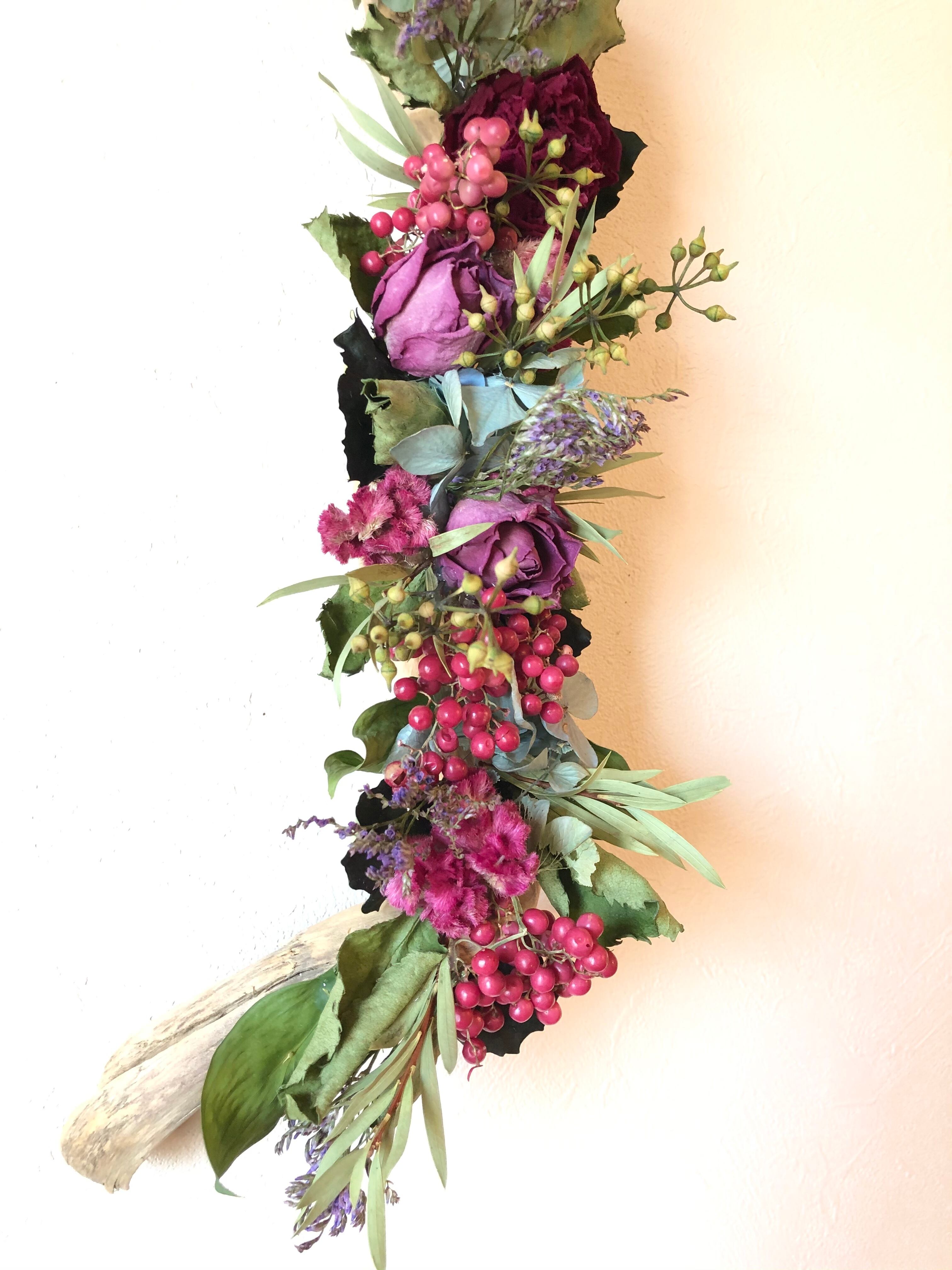 細長い流木にアジサイ、ペッパーベリー、クリスマスローズなどをたっぷりと入れて縦に長いアレンジに。