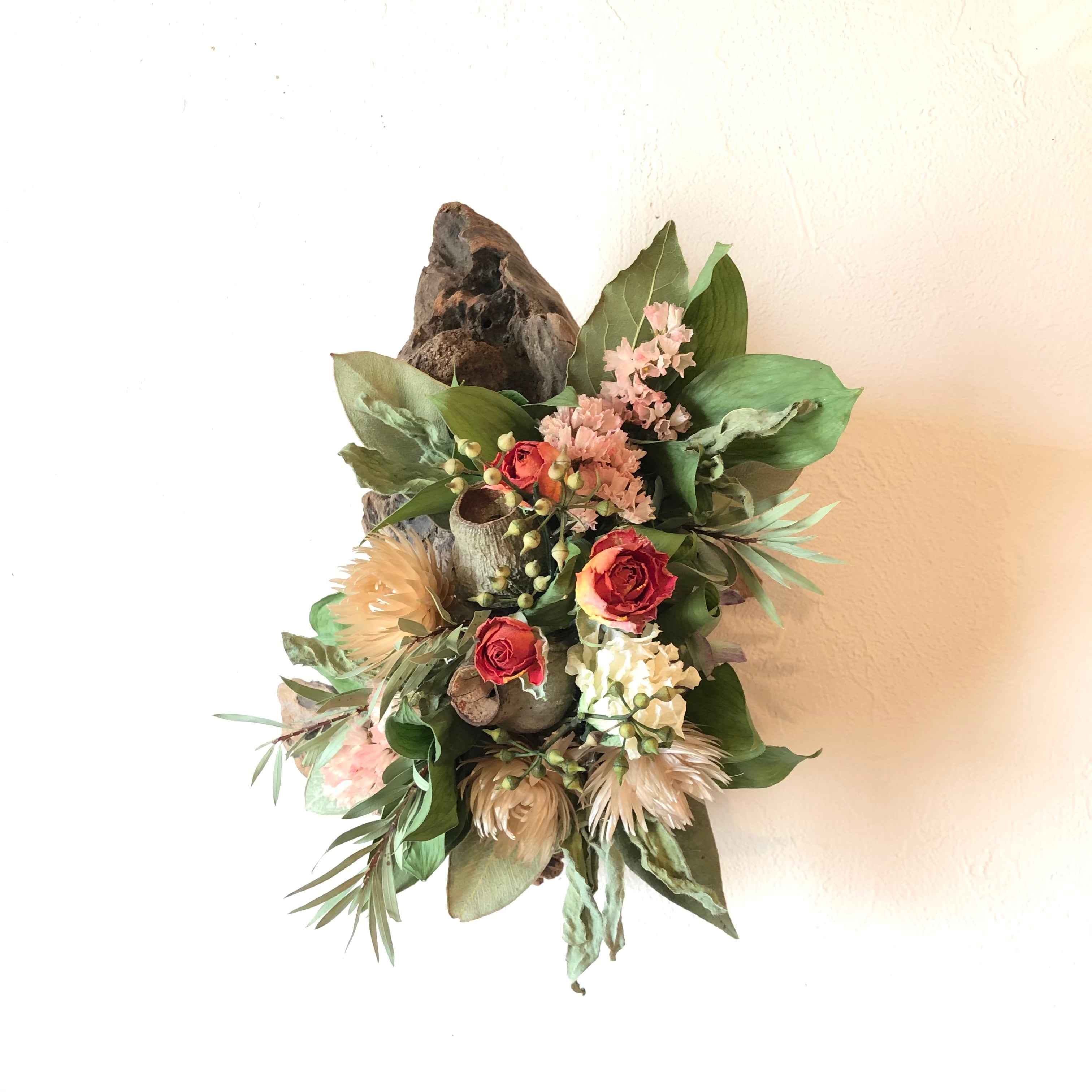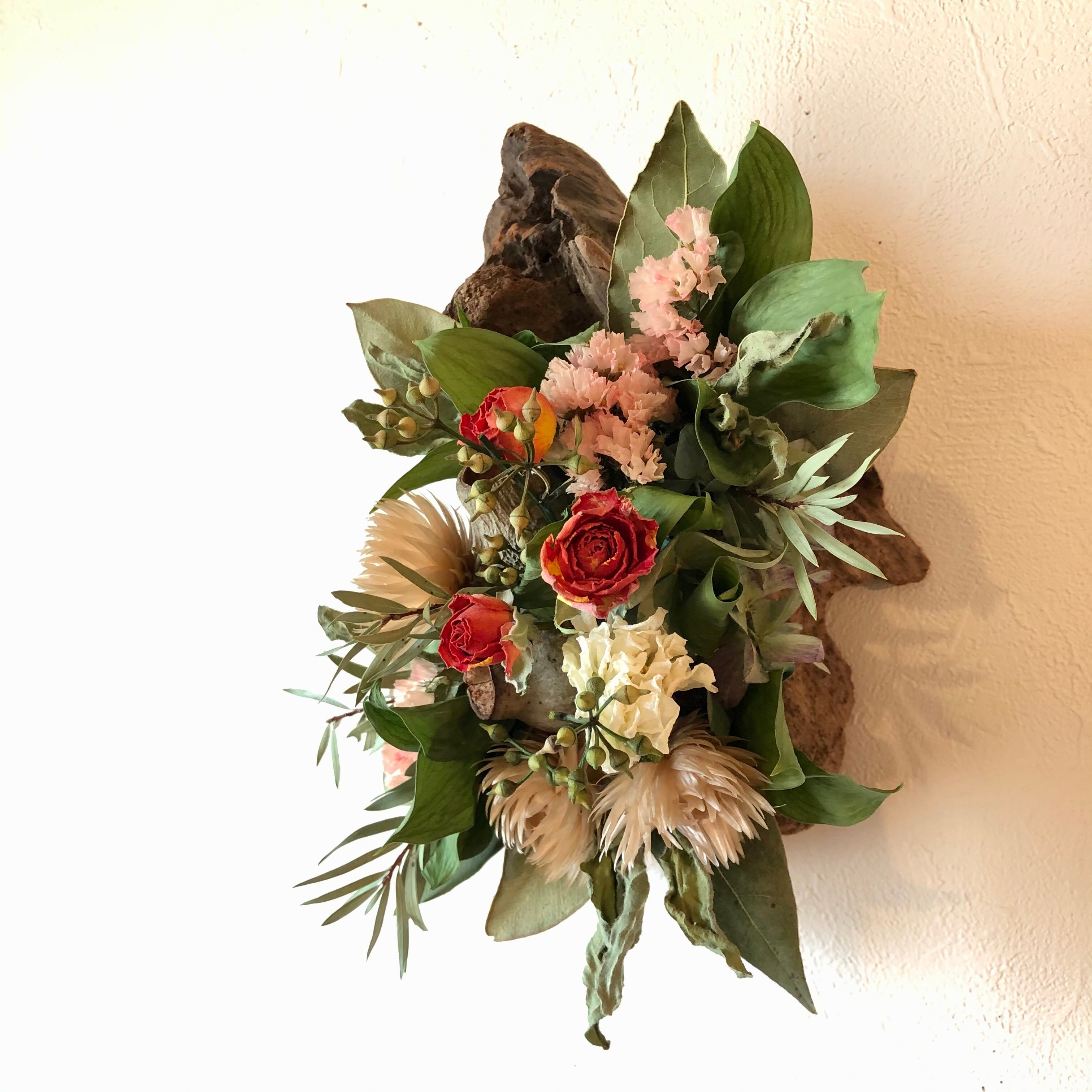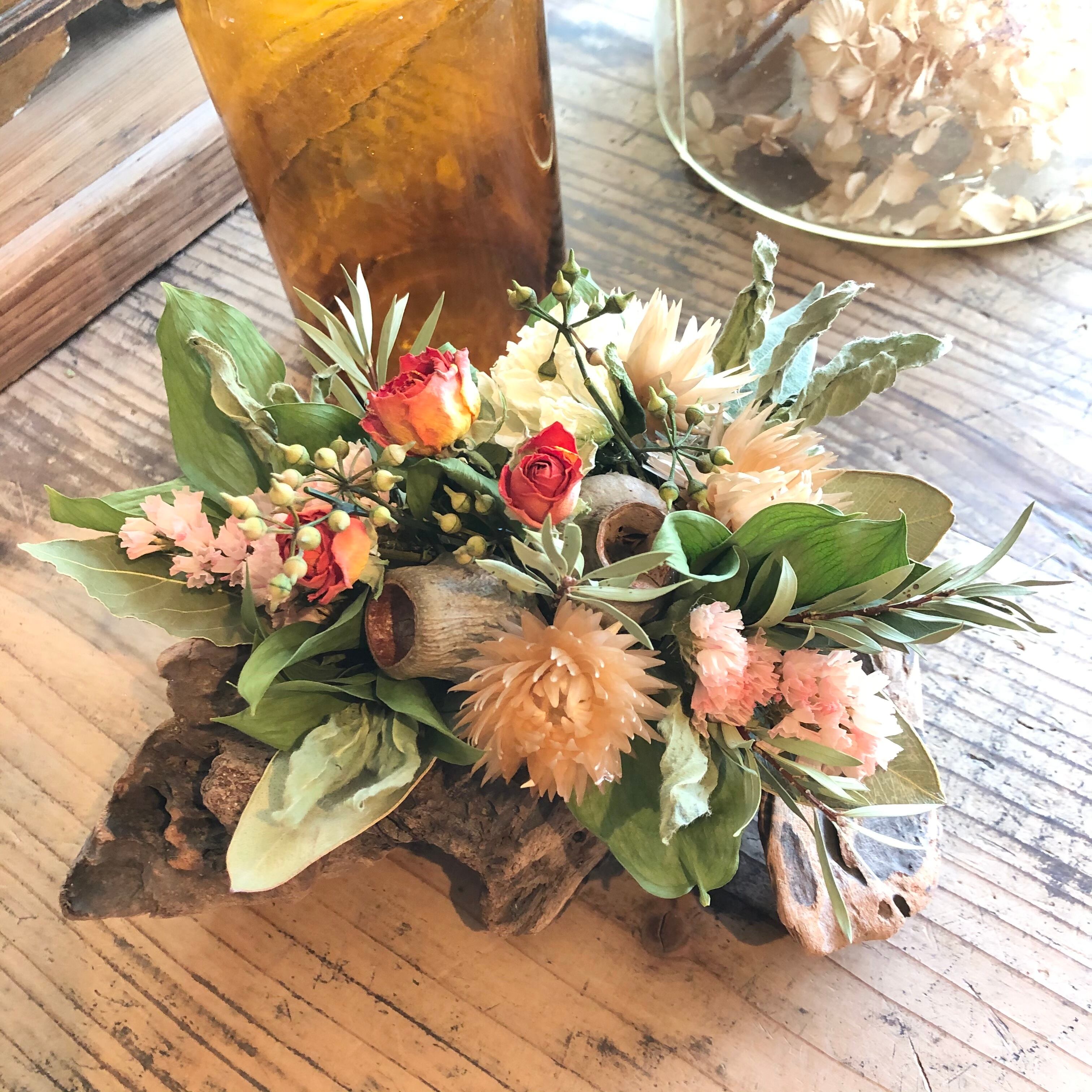 茶色が少し濃い流木に、オレンジ系の花材をタップ糸入れて。