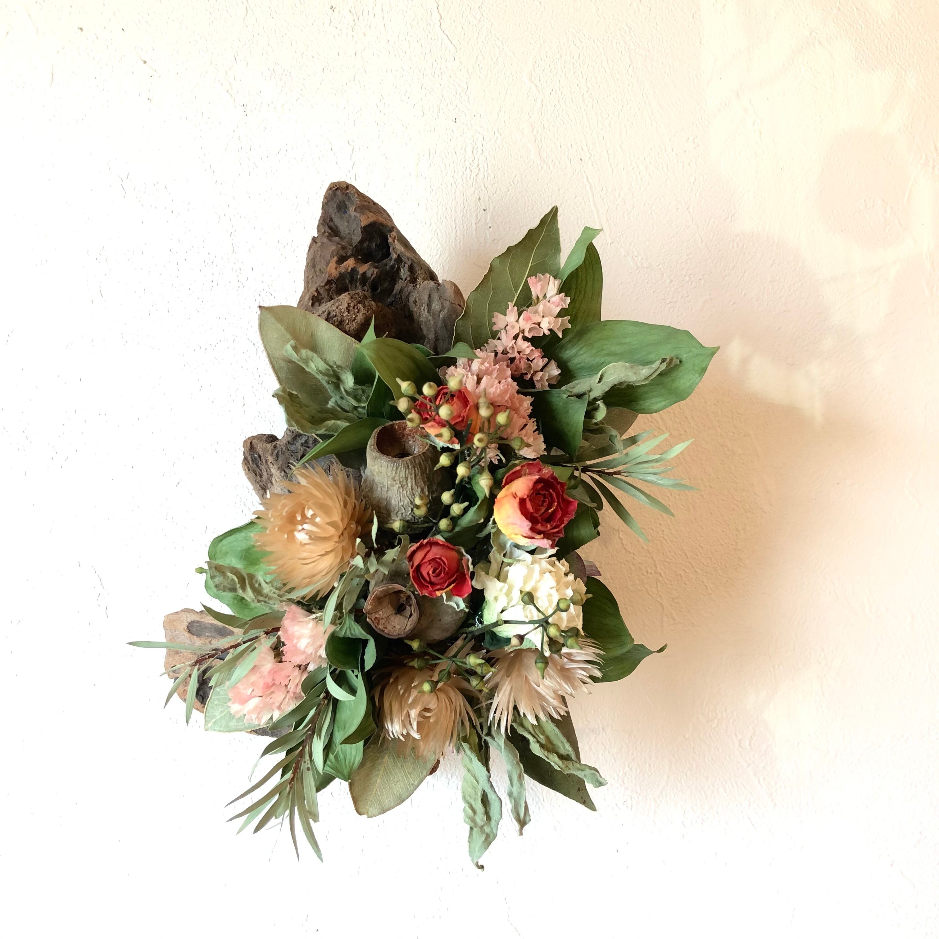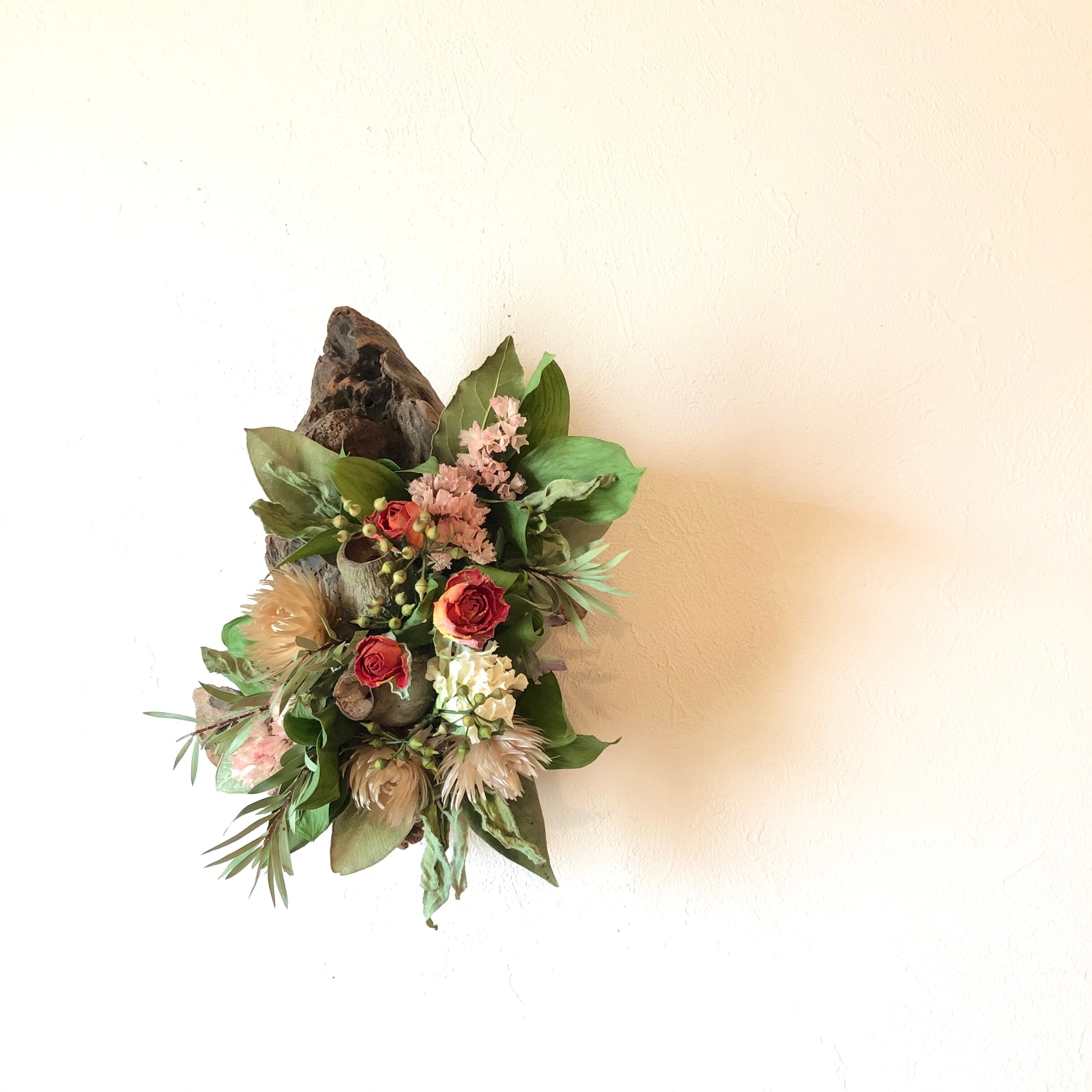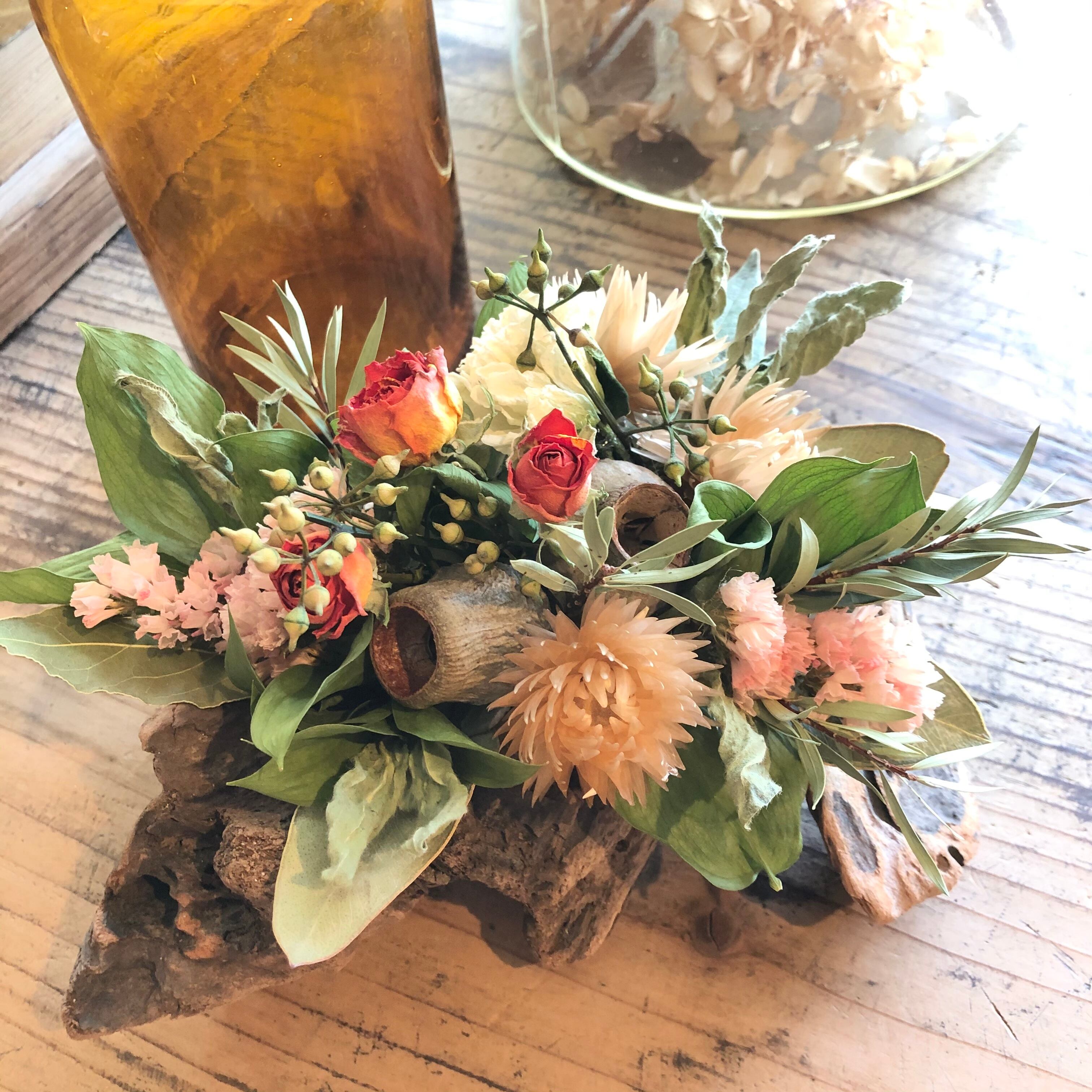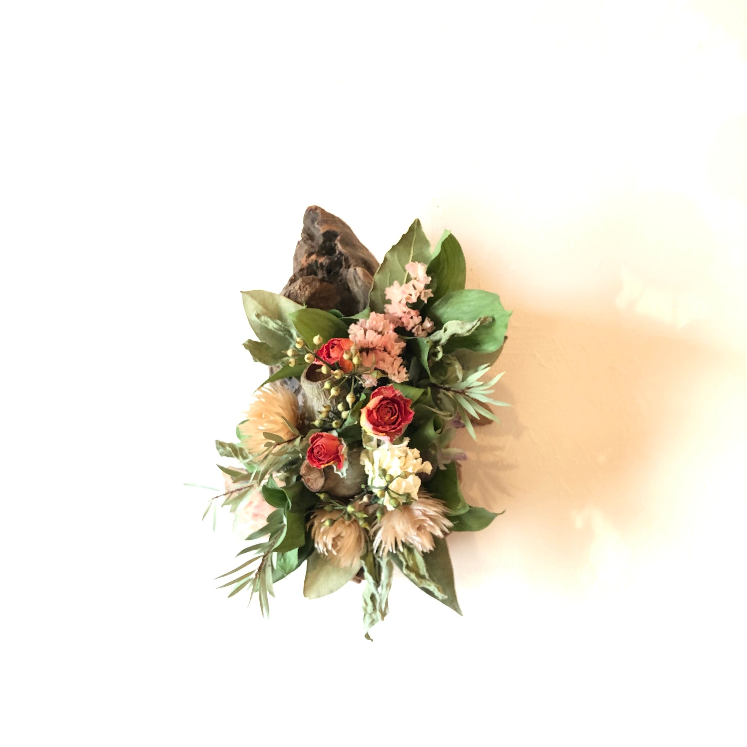 茶色が少し濃い流木に、オレンジ系の花材をタップ糸入れて。