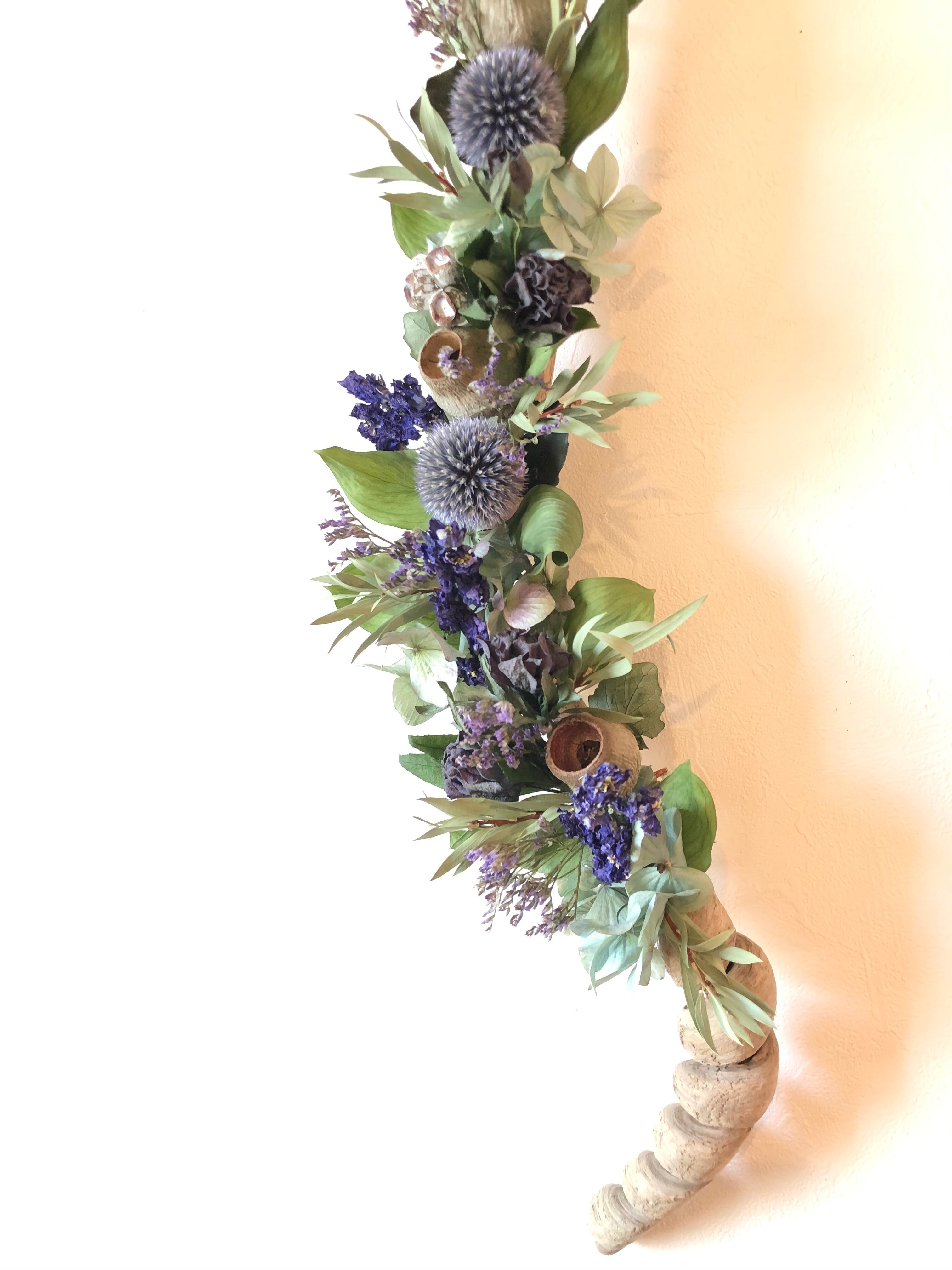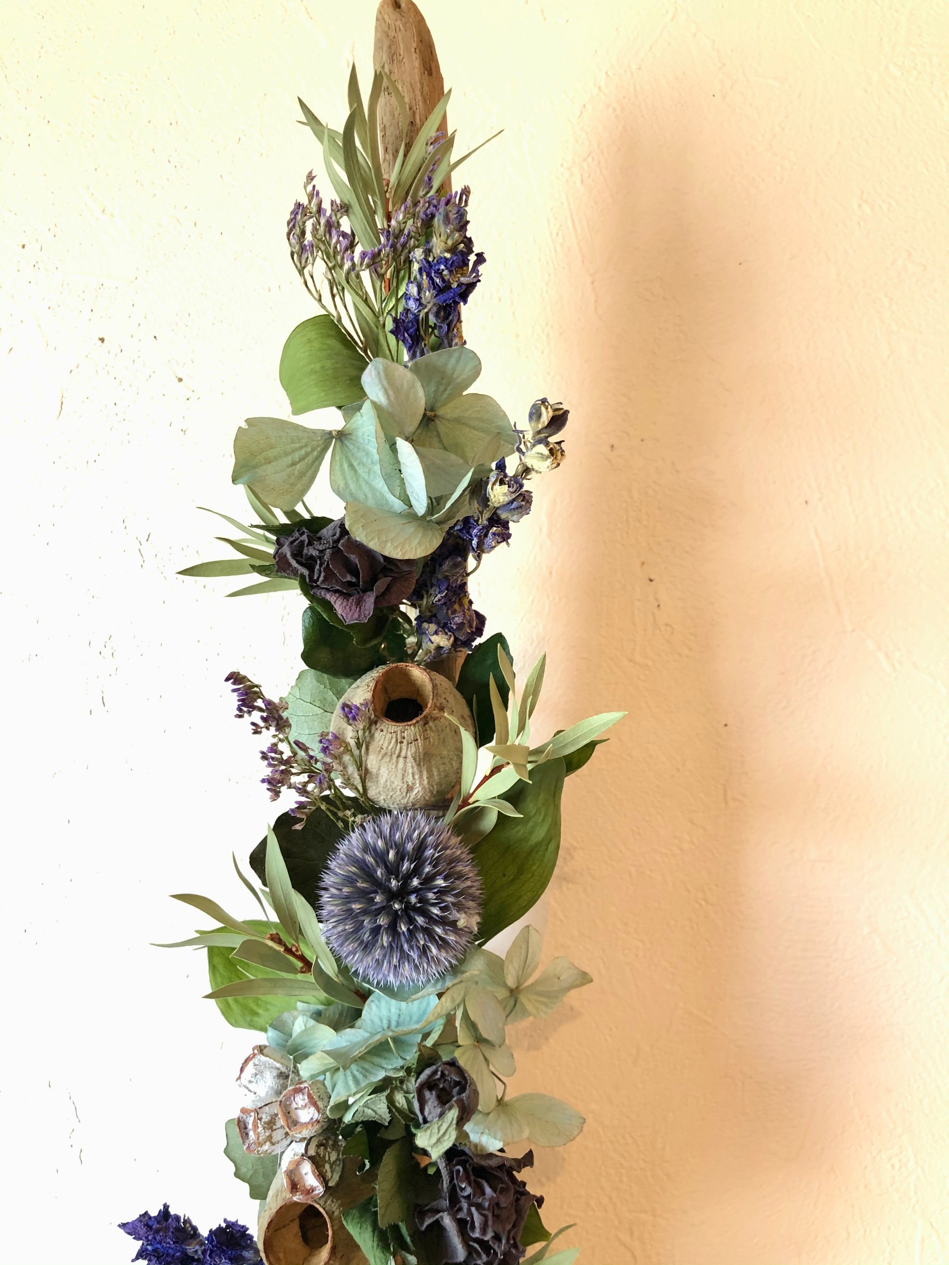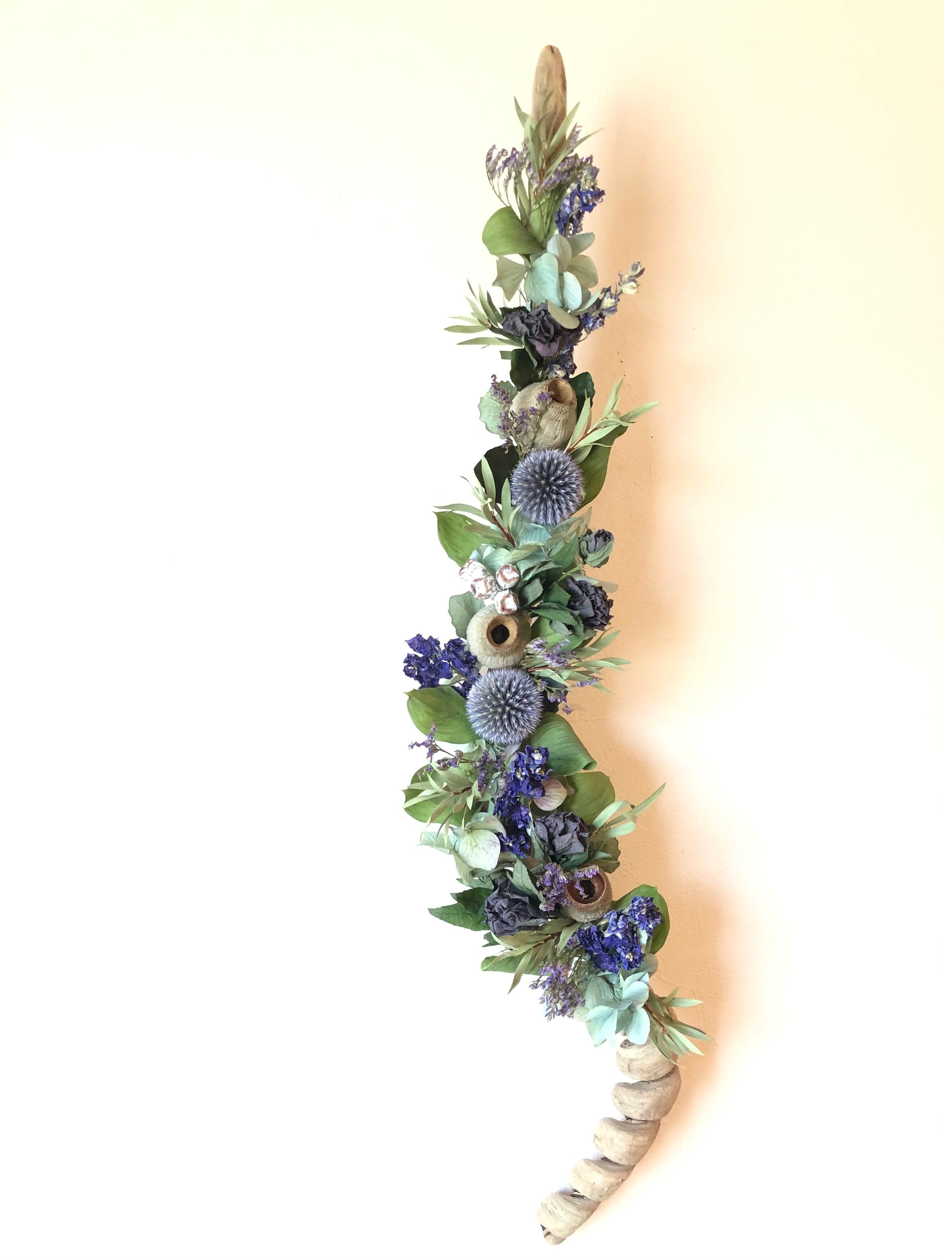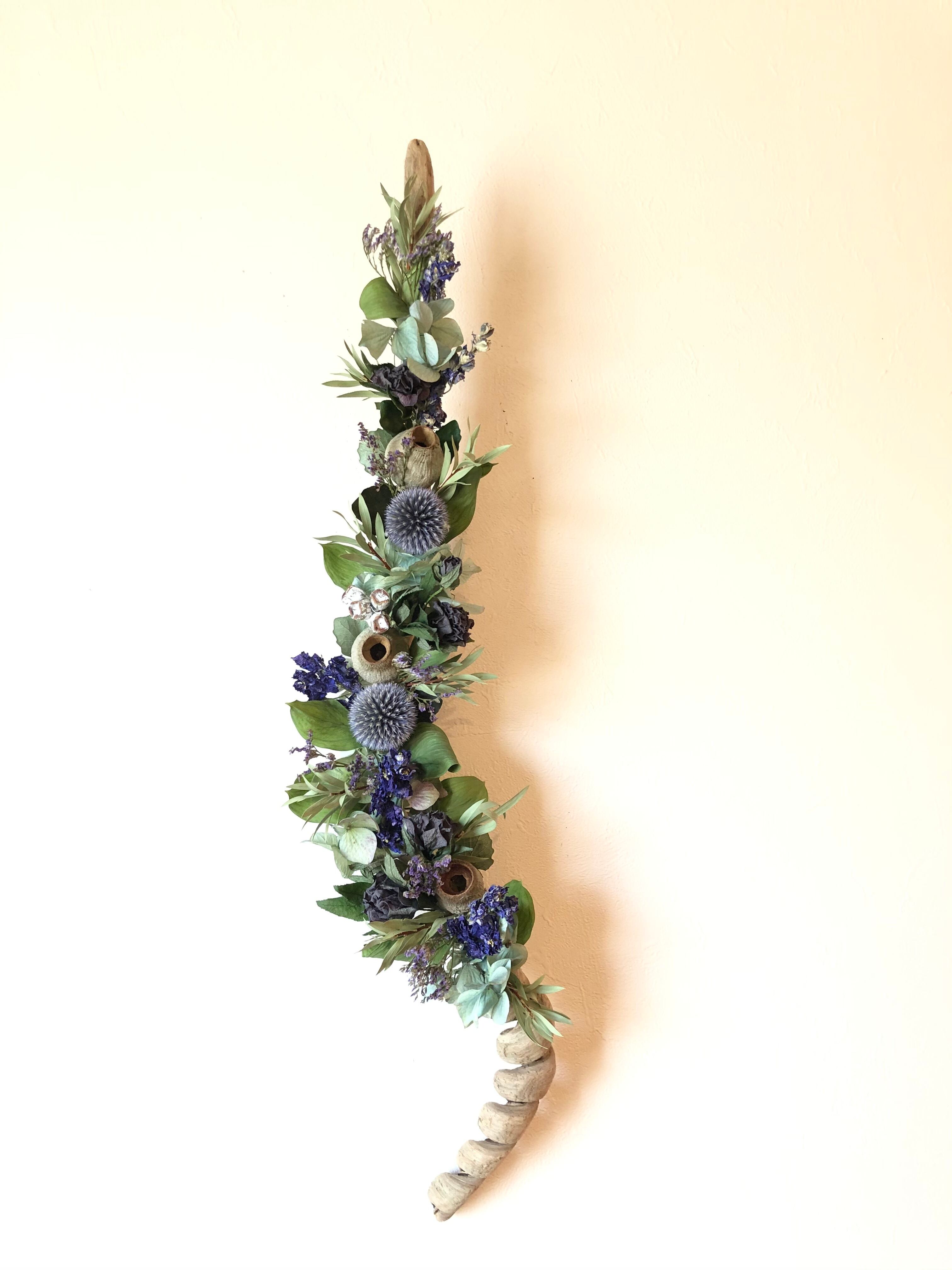 クルクルと…先端が丸まった珍しい流木。優しい白木の流木にブルー系の花材を流れるようにアレンジ。