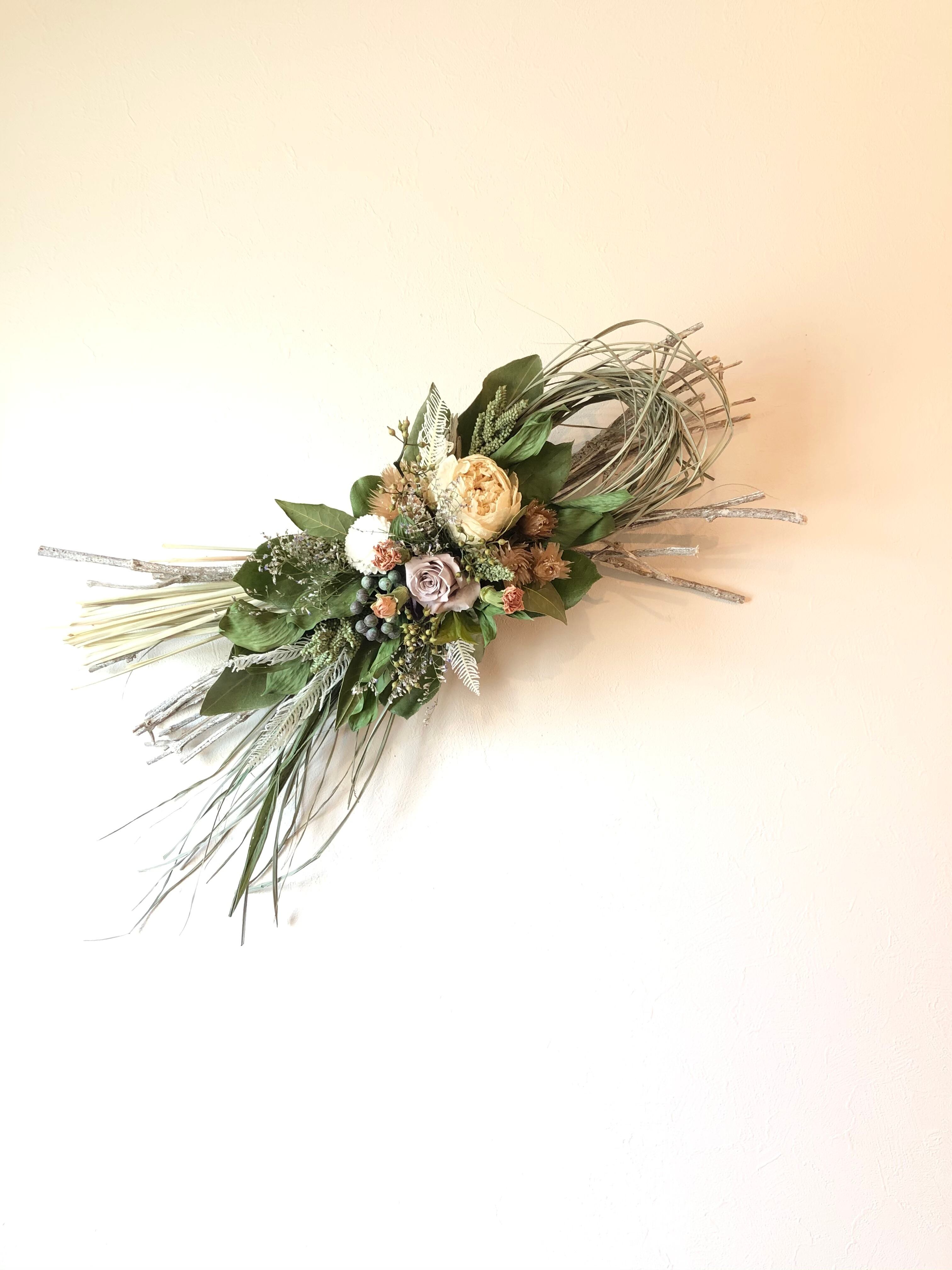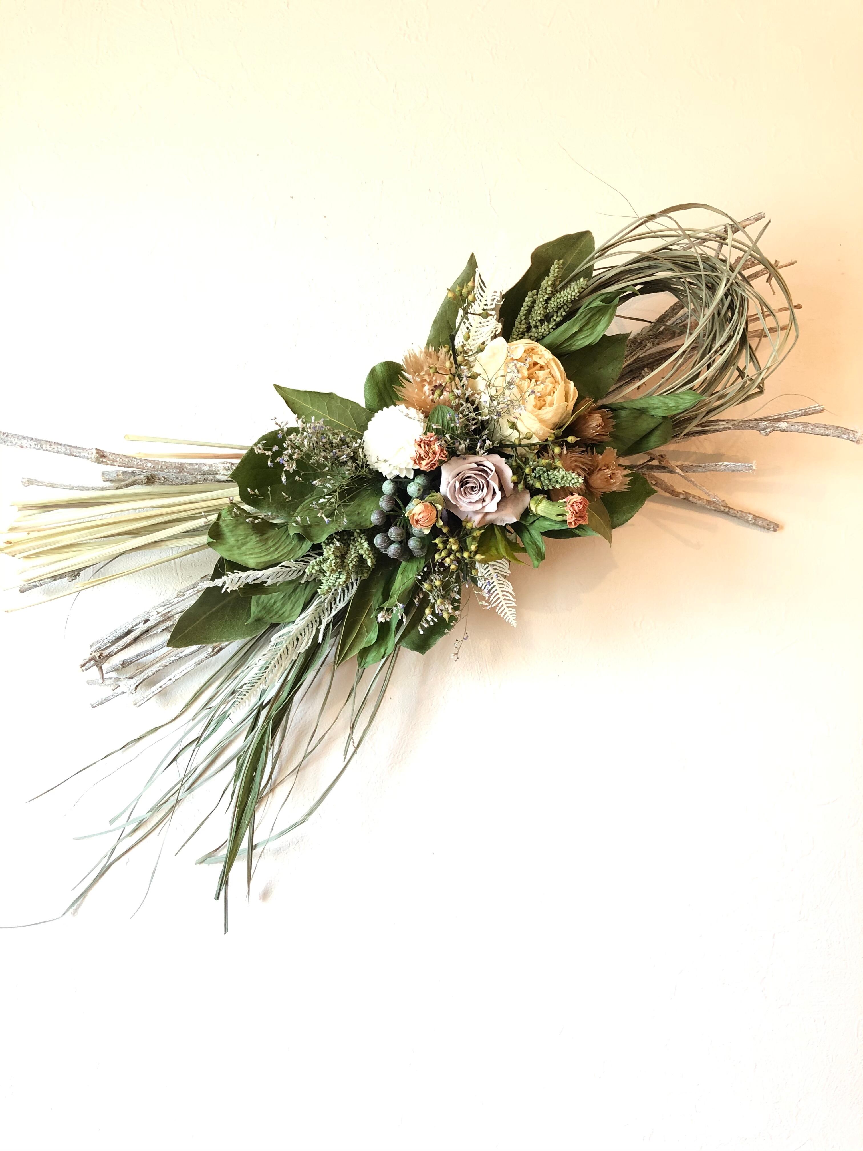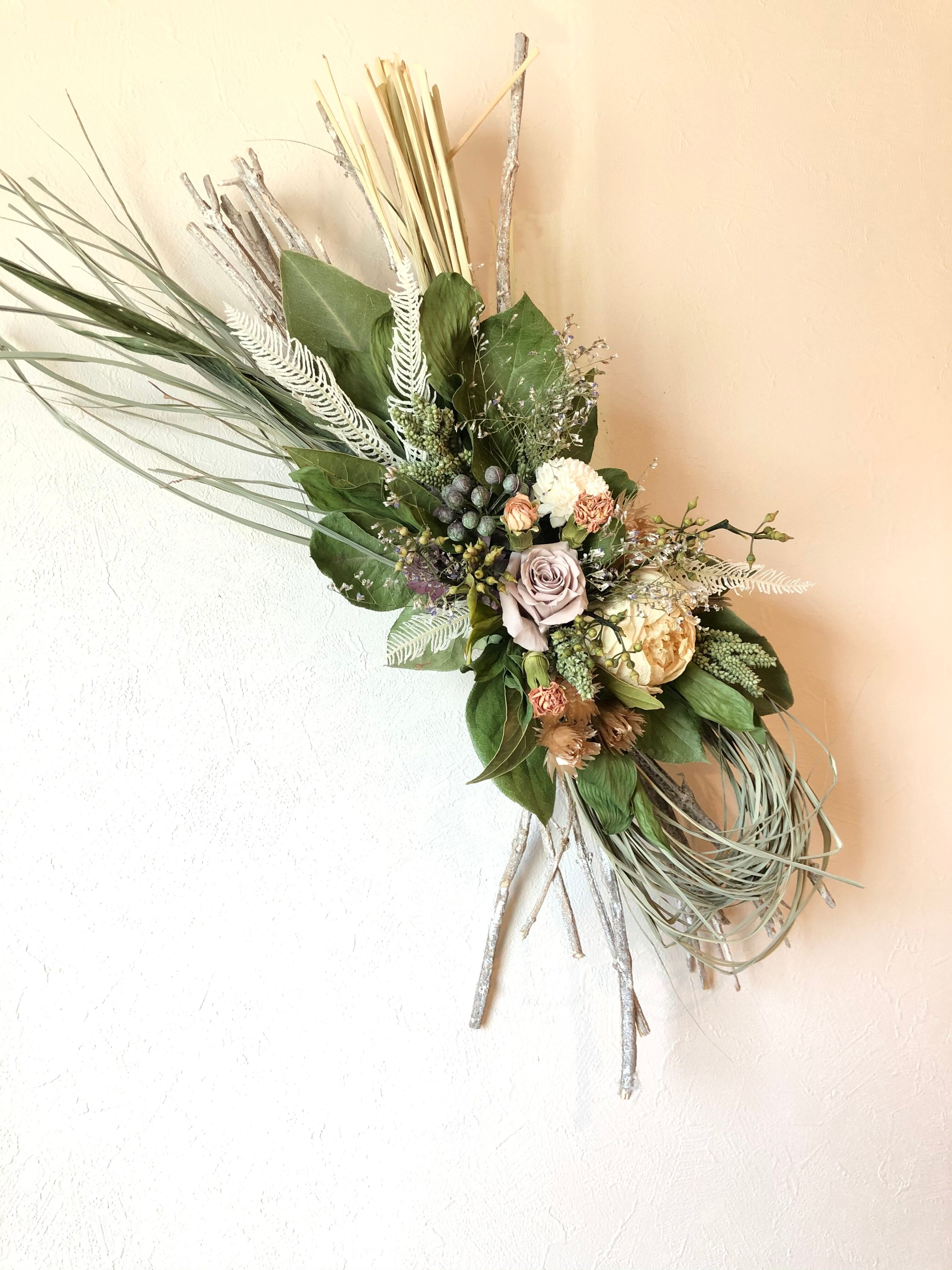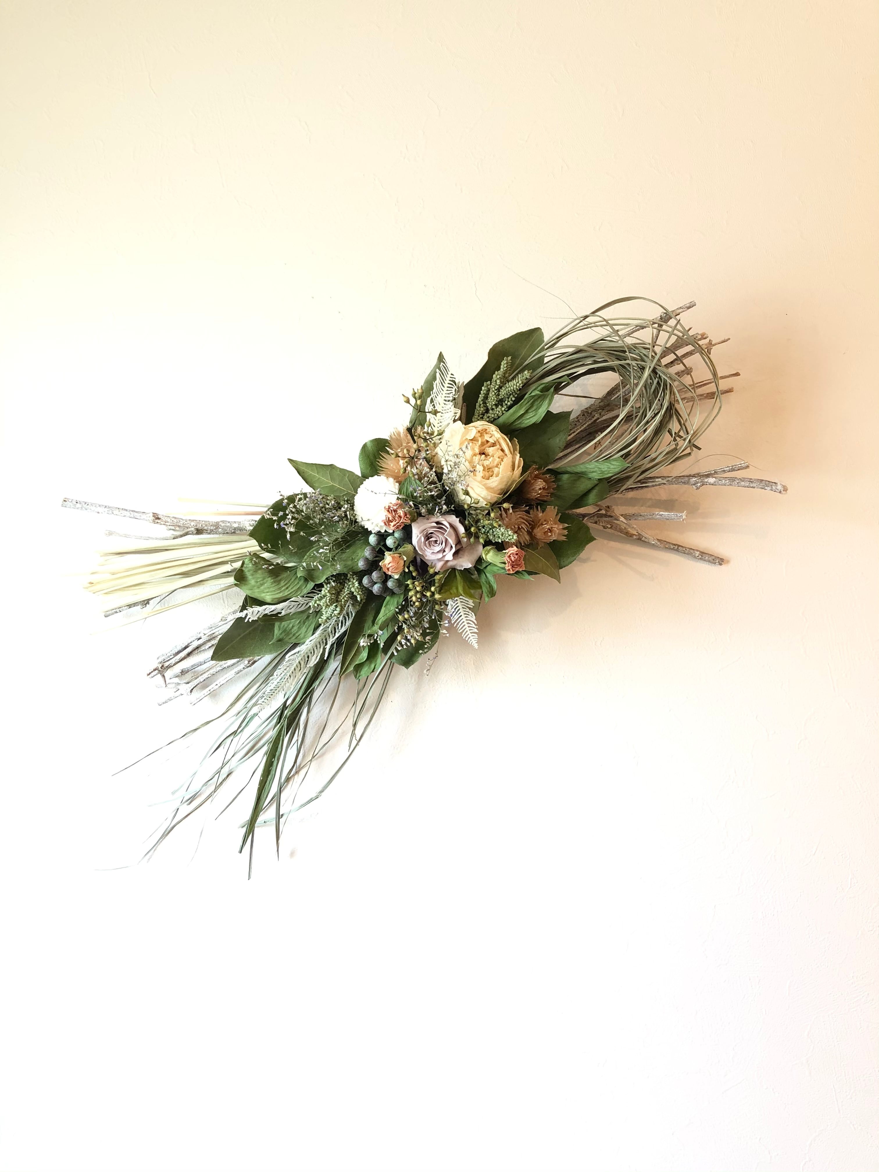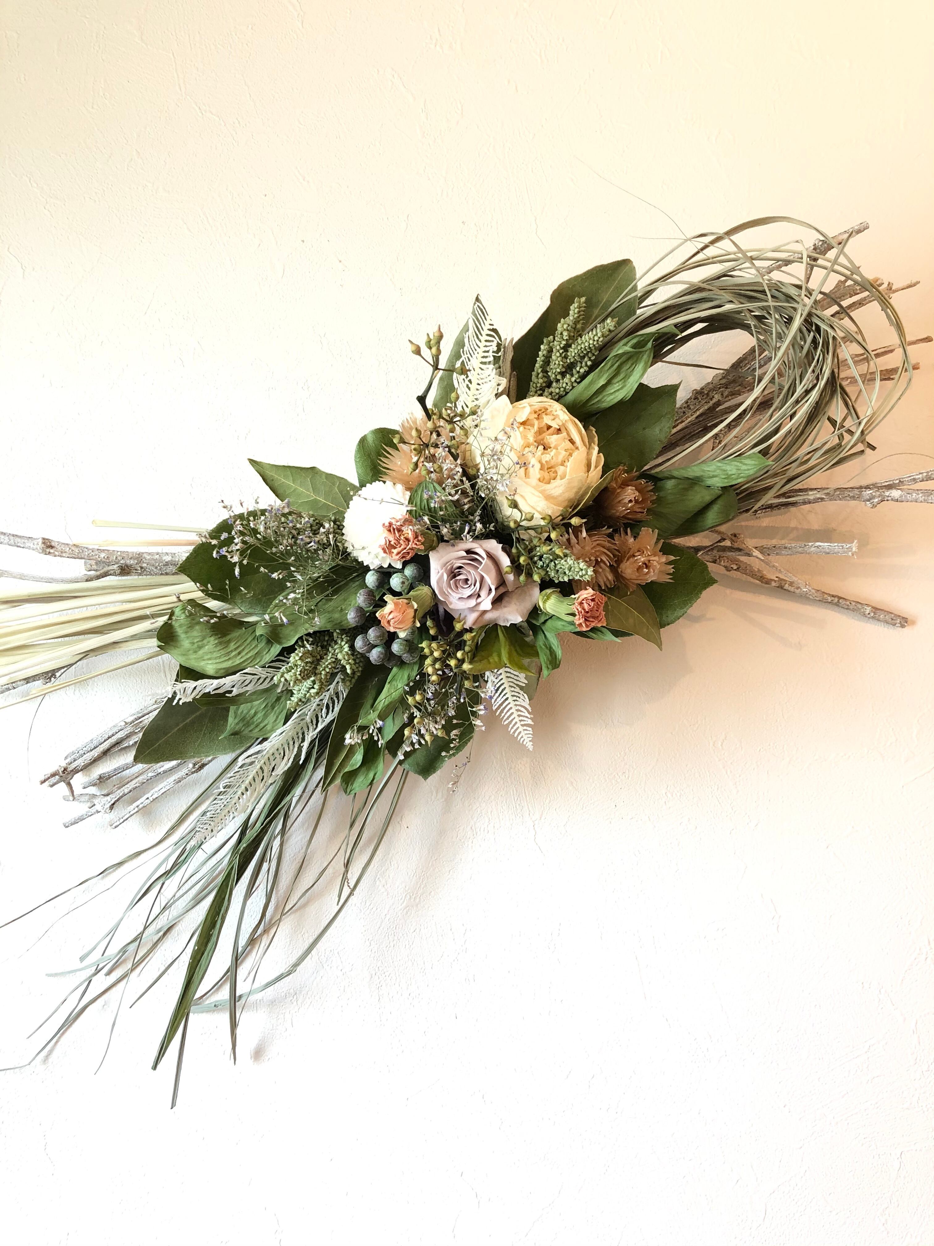 ホワイトウォッシュにペイントした枝とレモングラスを合わせたベースに、シックな白ベージュ系の花材をアレンジ。