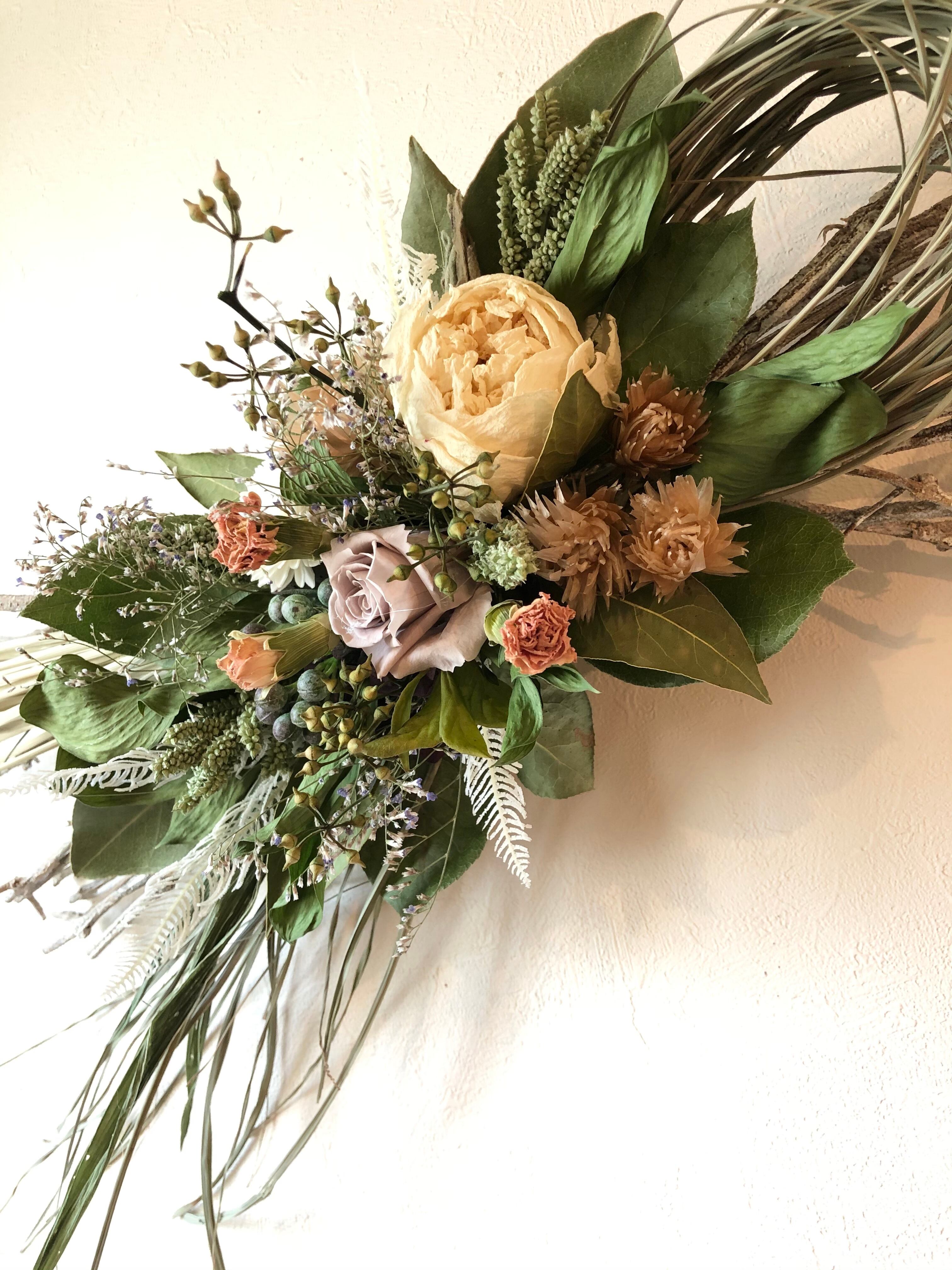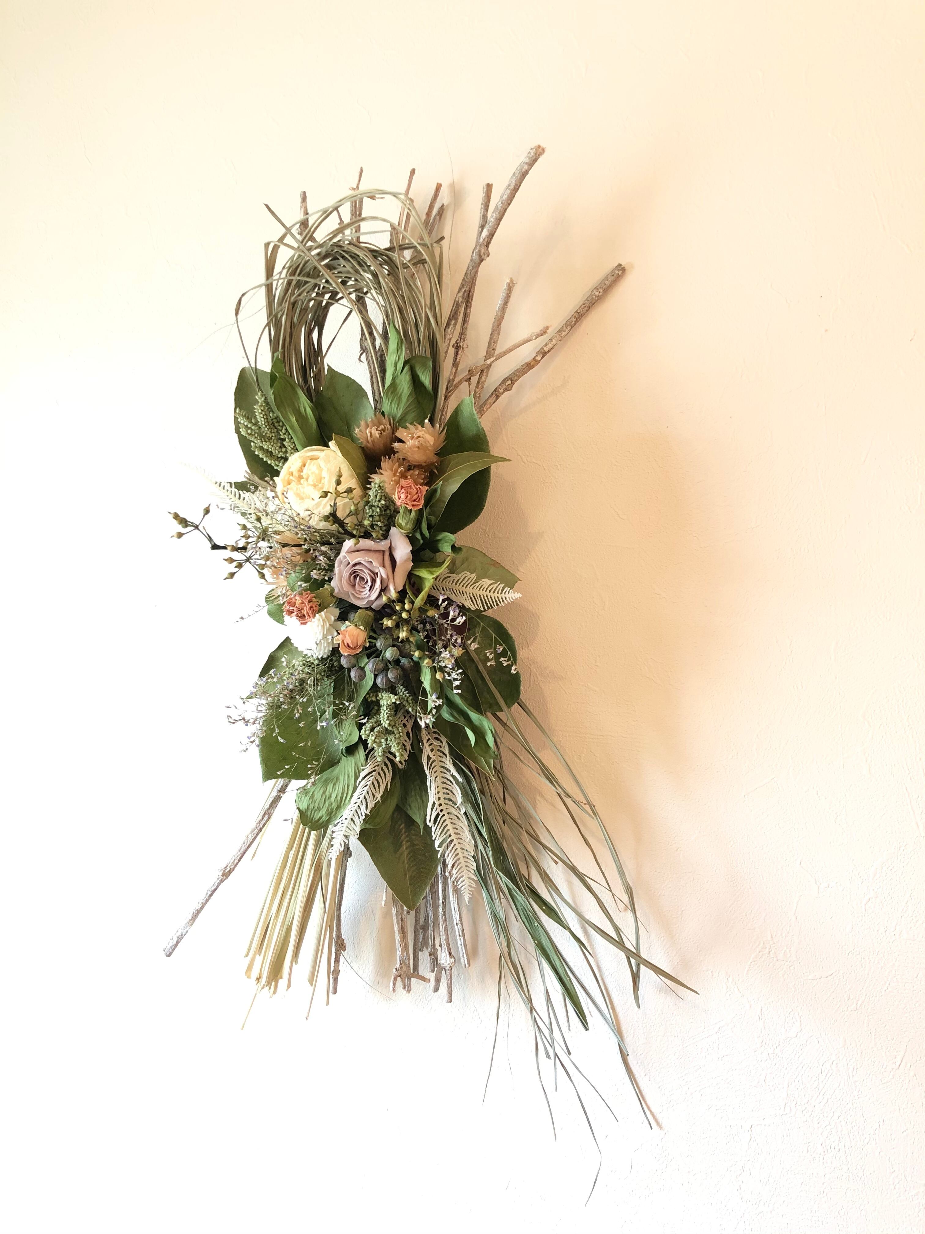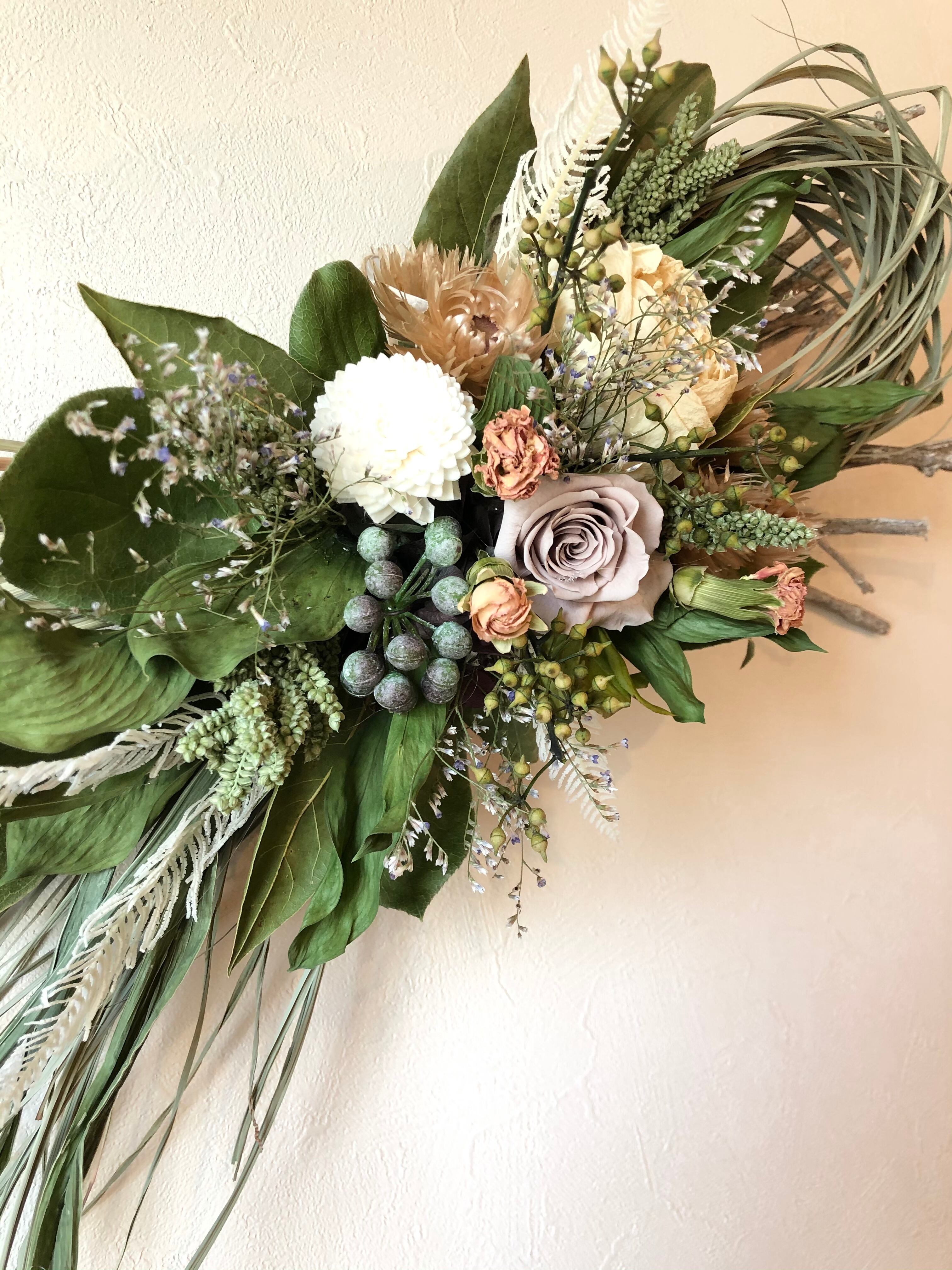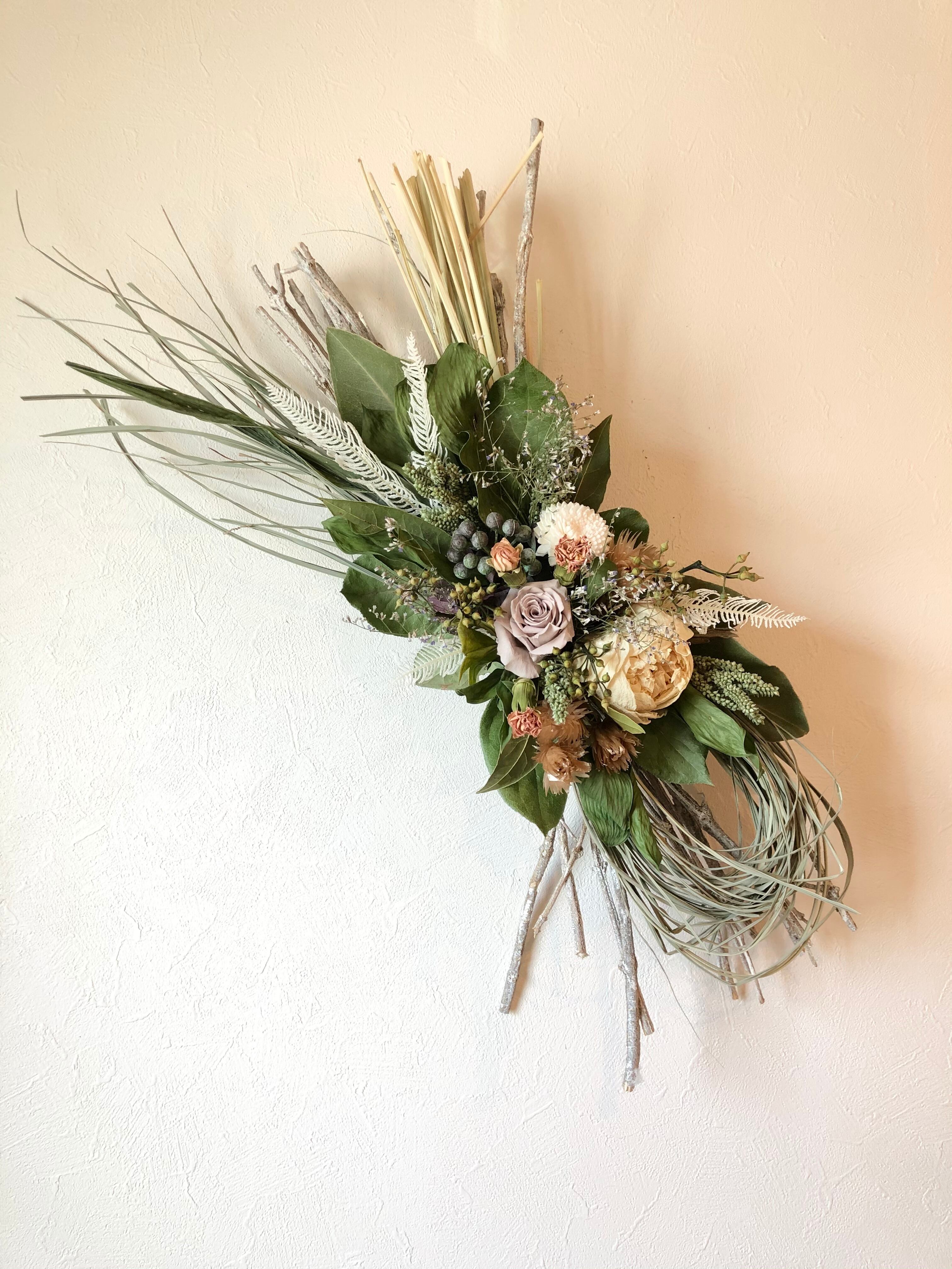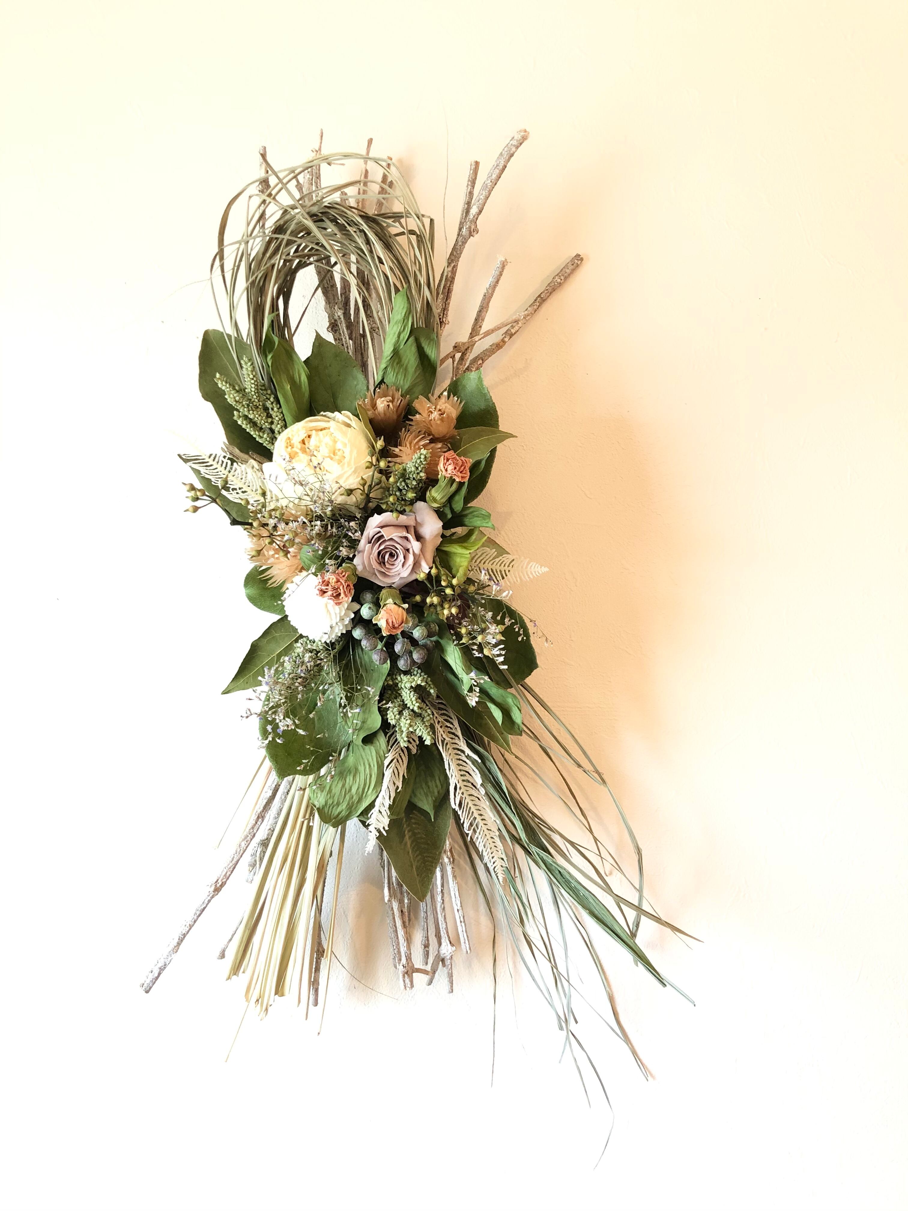 ホワイトウォッシュにペイントした枝とレモングラスを合わせたベースに、シックな白ベージュ系の花材をアレンジ。