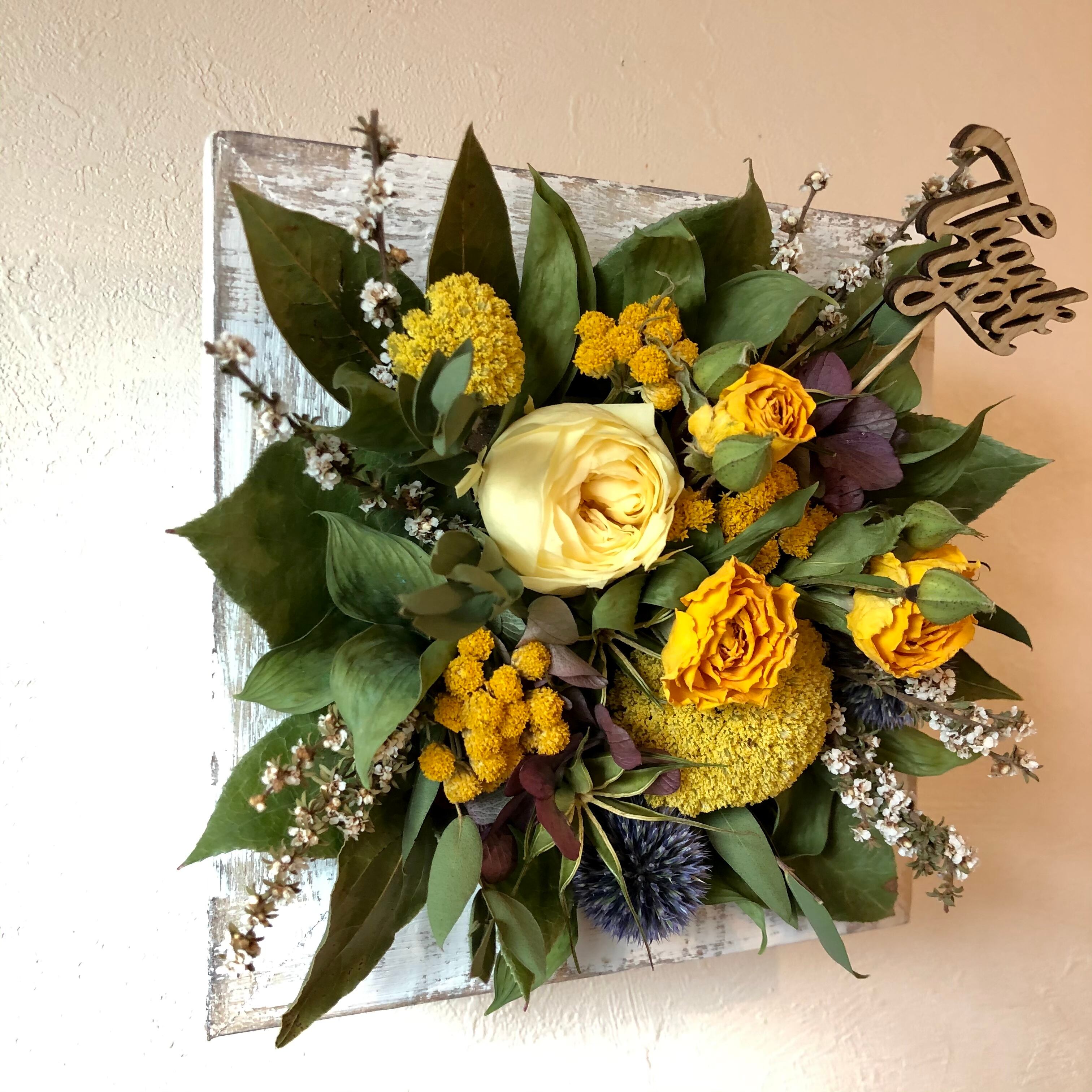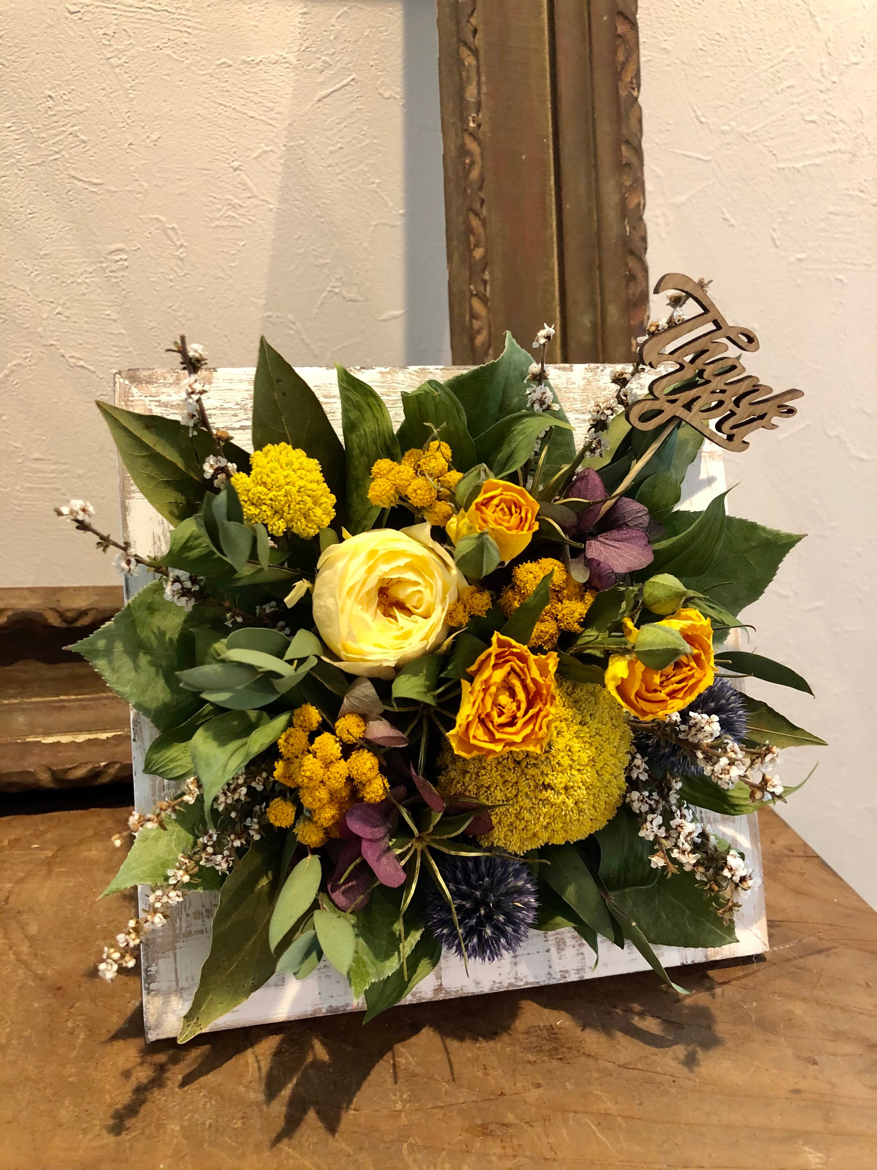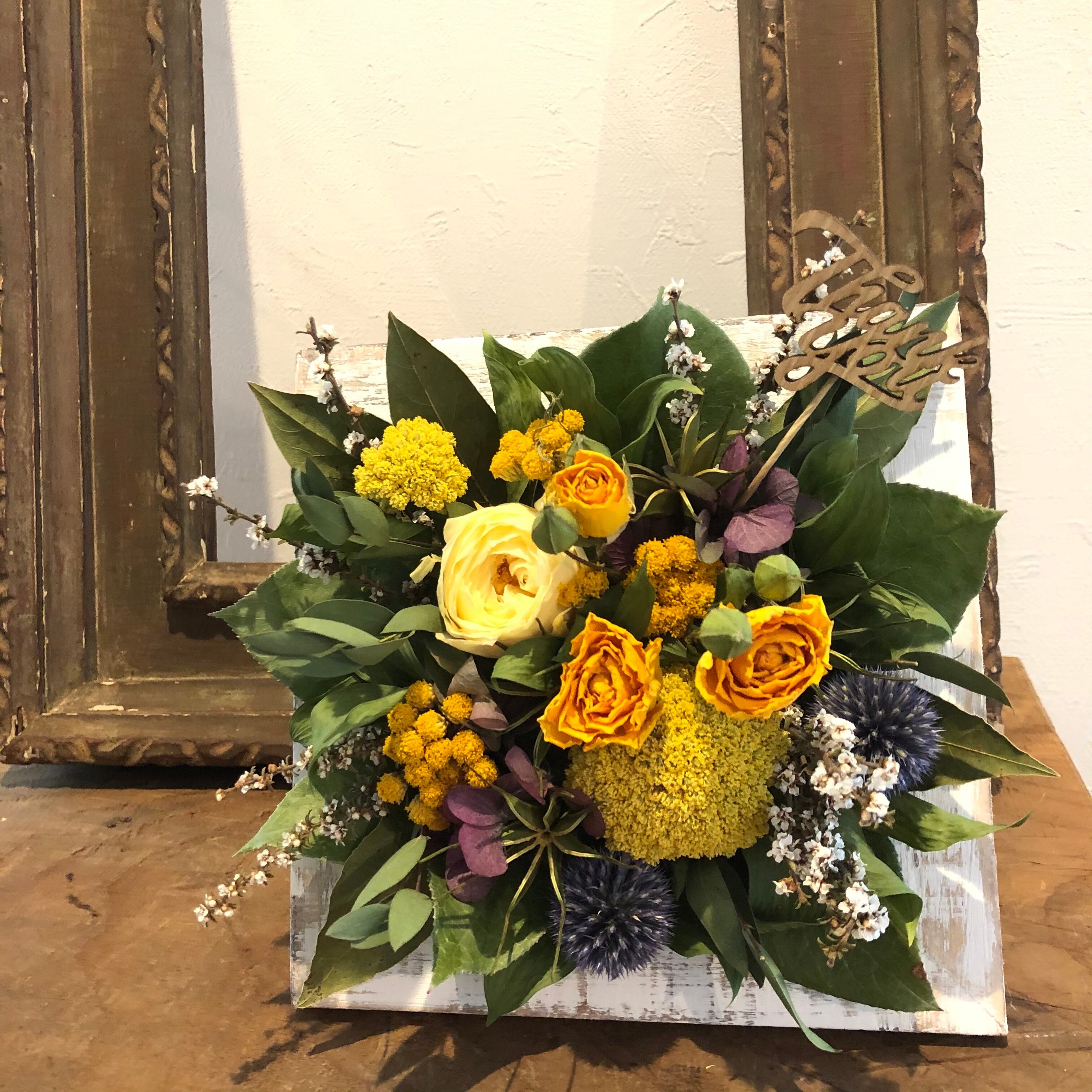 白のウッドフレームにドライフラワーをたっぷりとアレンジしたギフトに最適のアレンジ。