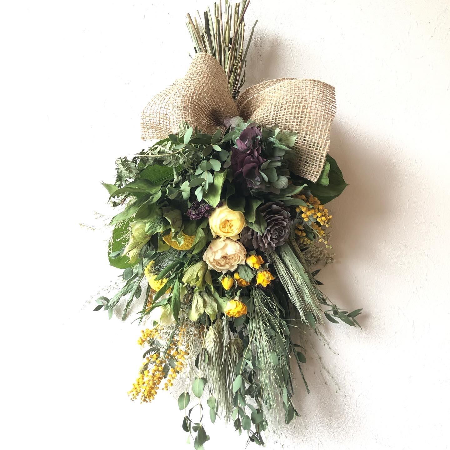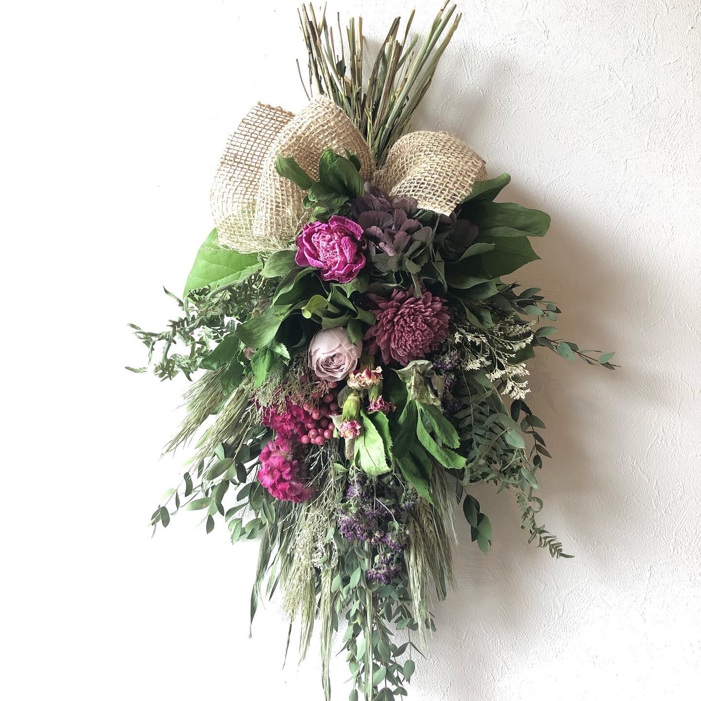 ベースにユーカリと雑穀をたっぷりと使って、ドライフラワーの香りも楽しめる、ボリュームのあるスワッグ。お母様への感謝の気持ちを込めて…。