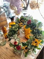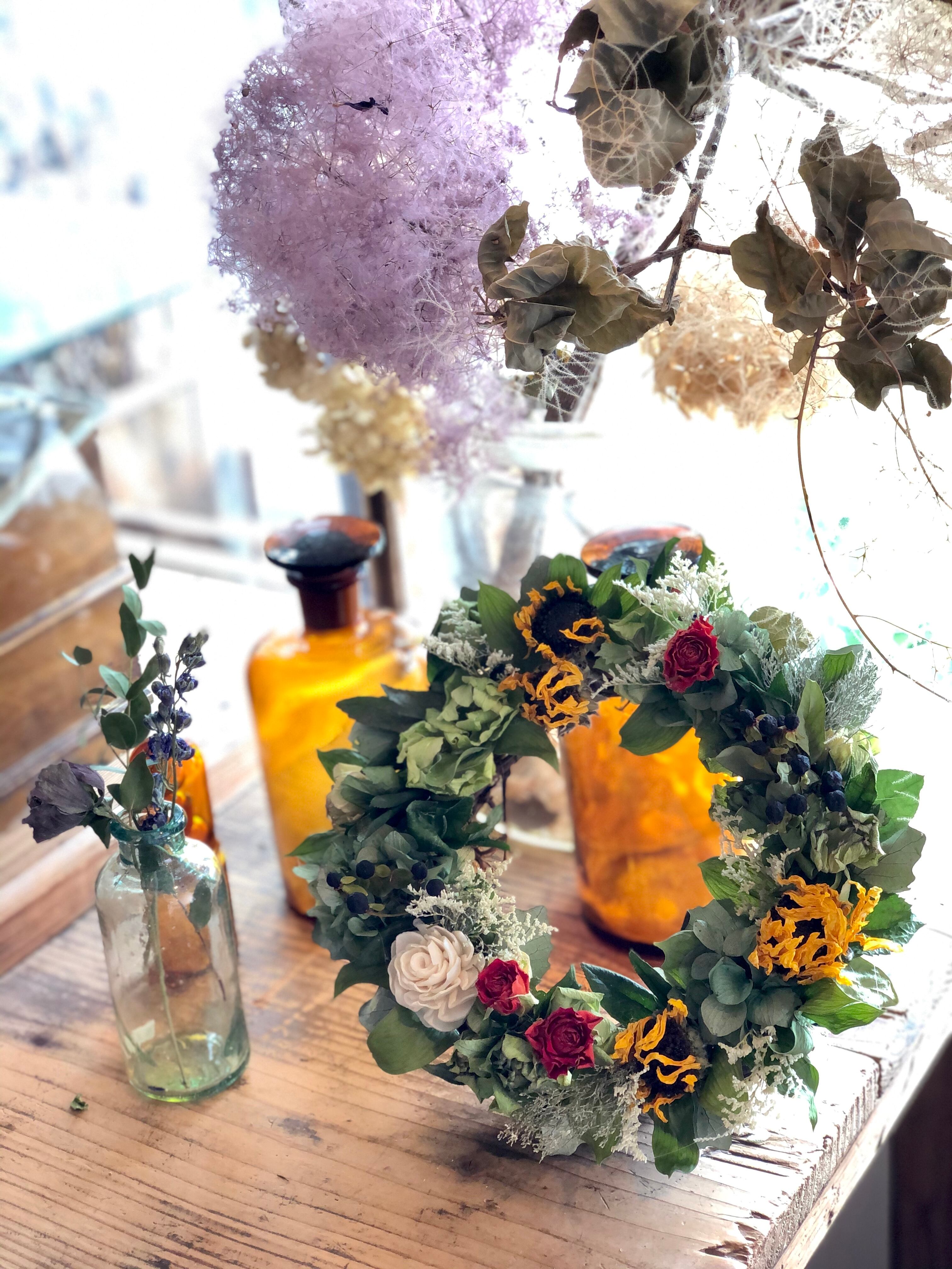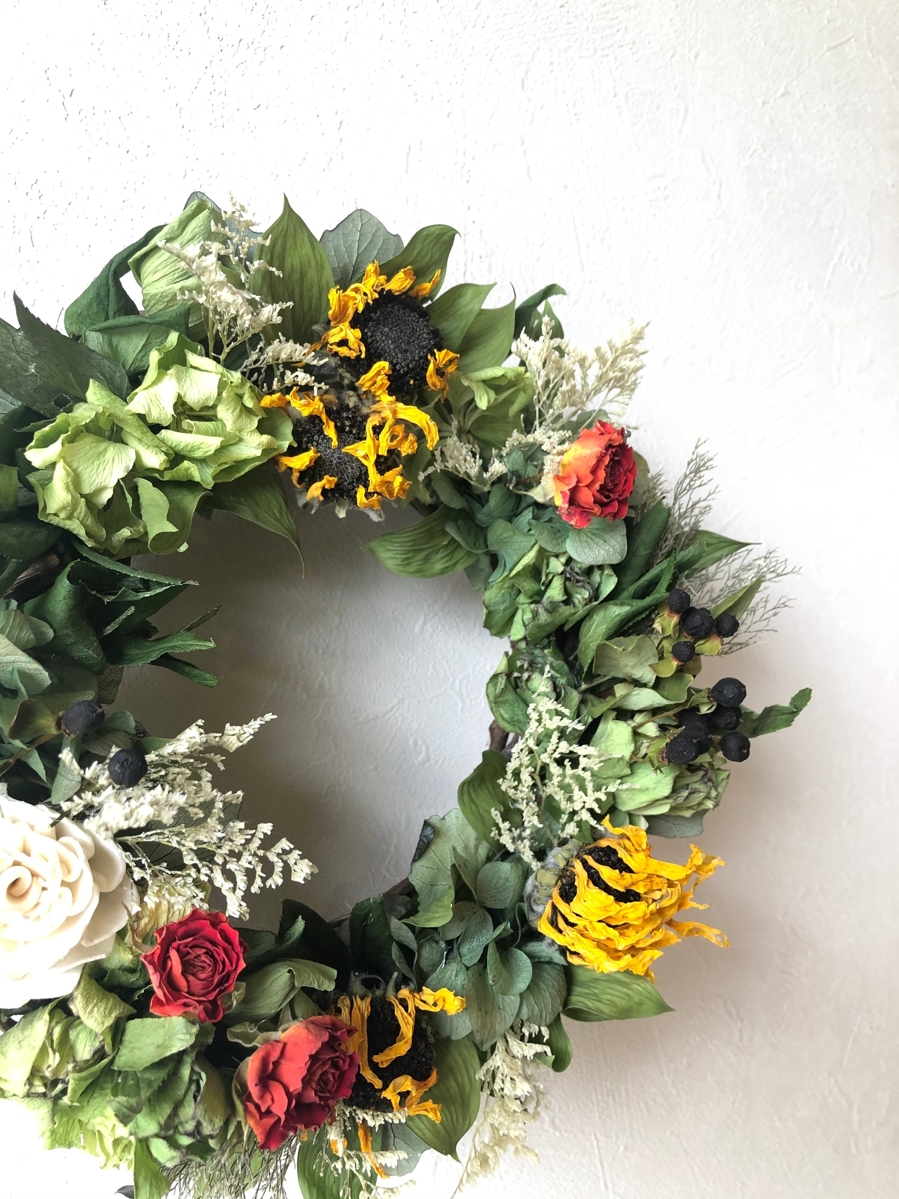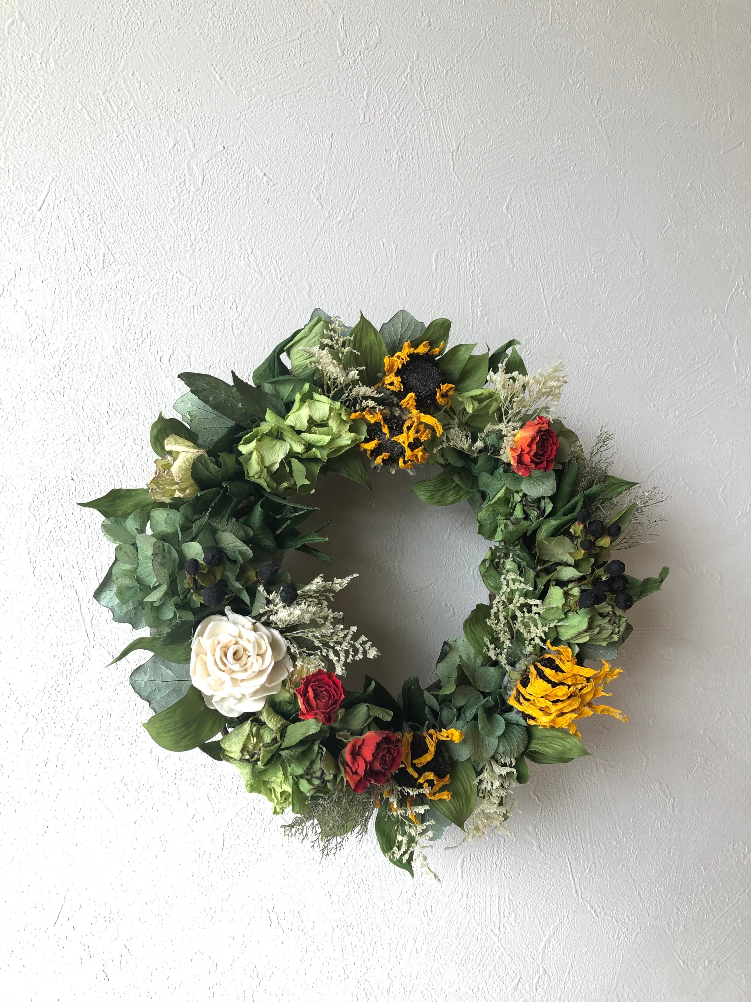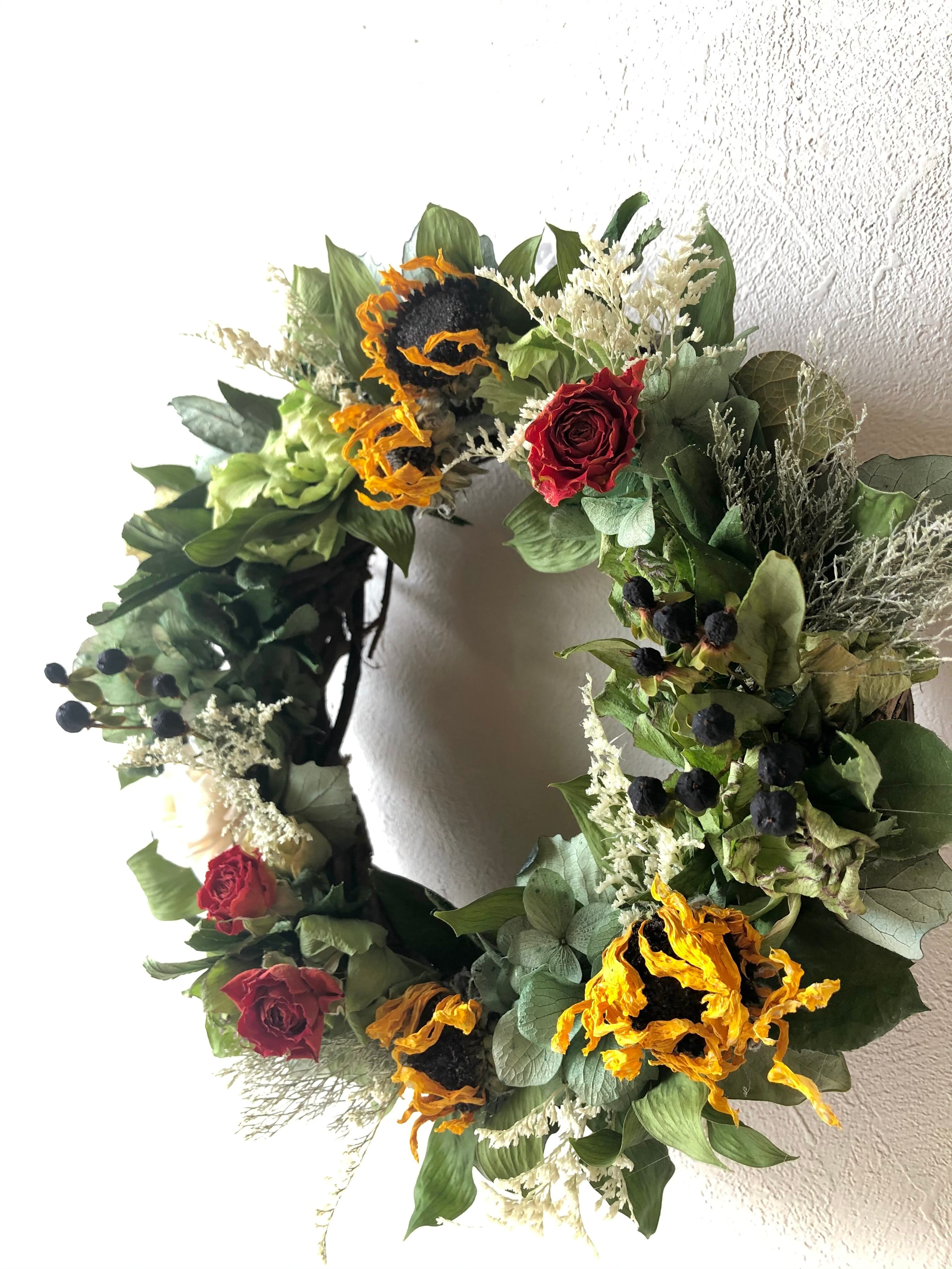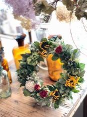 オレンジのミニバラや姫向日葵がなんとも可愛らしい、夏色リース。