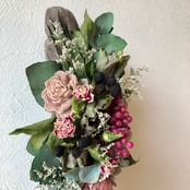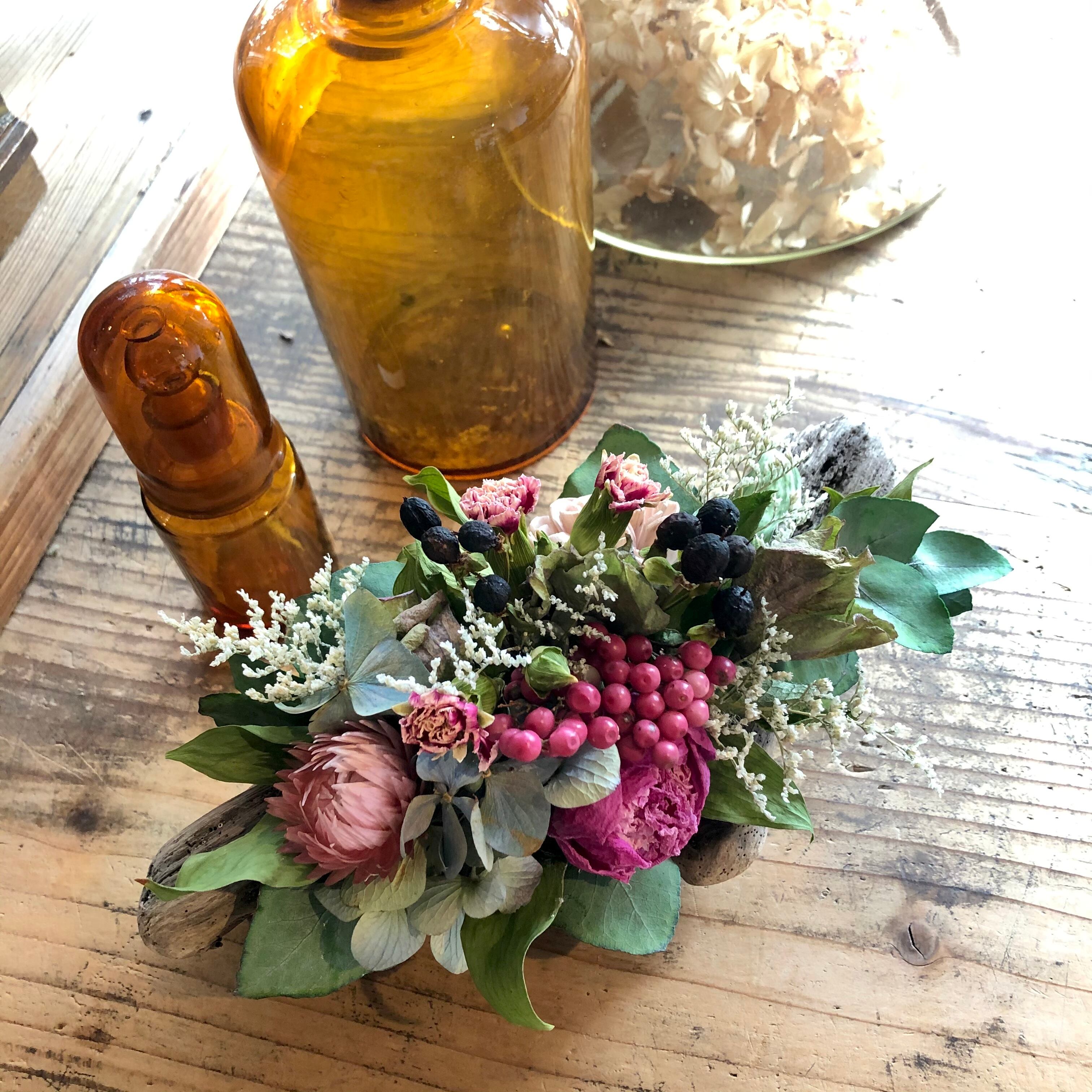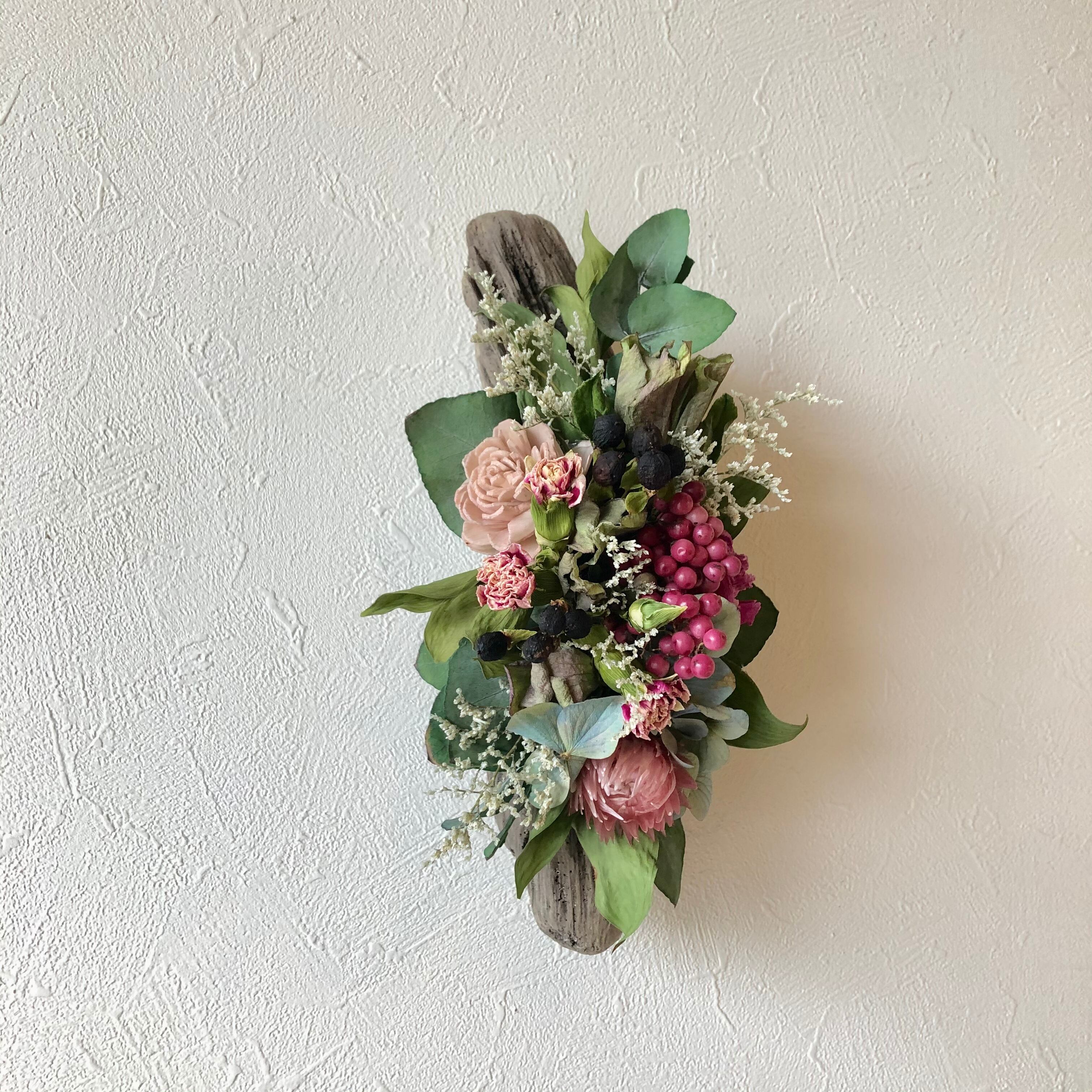 ぽってりとした可愛らしい流木に、ピンク系の花材をアレンジしました。