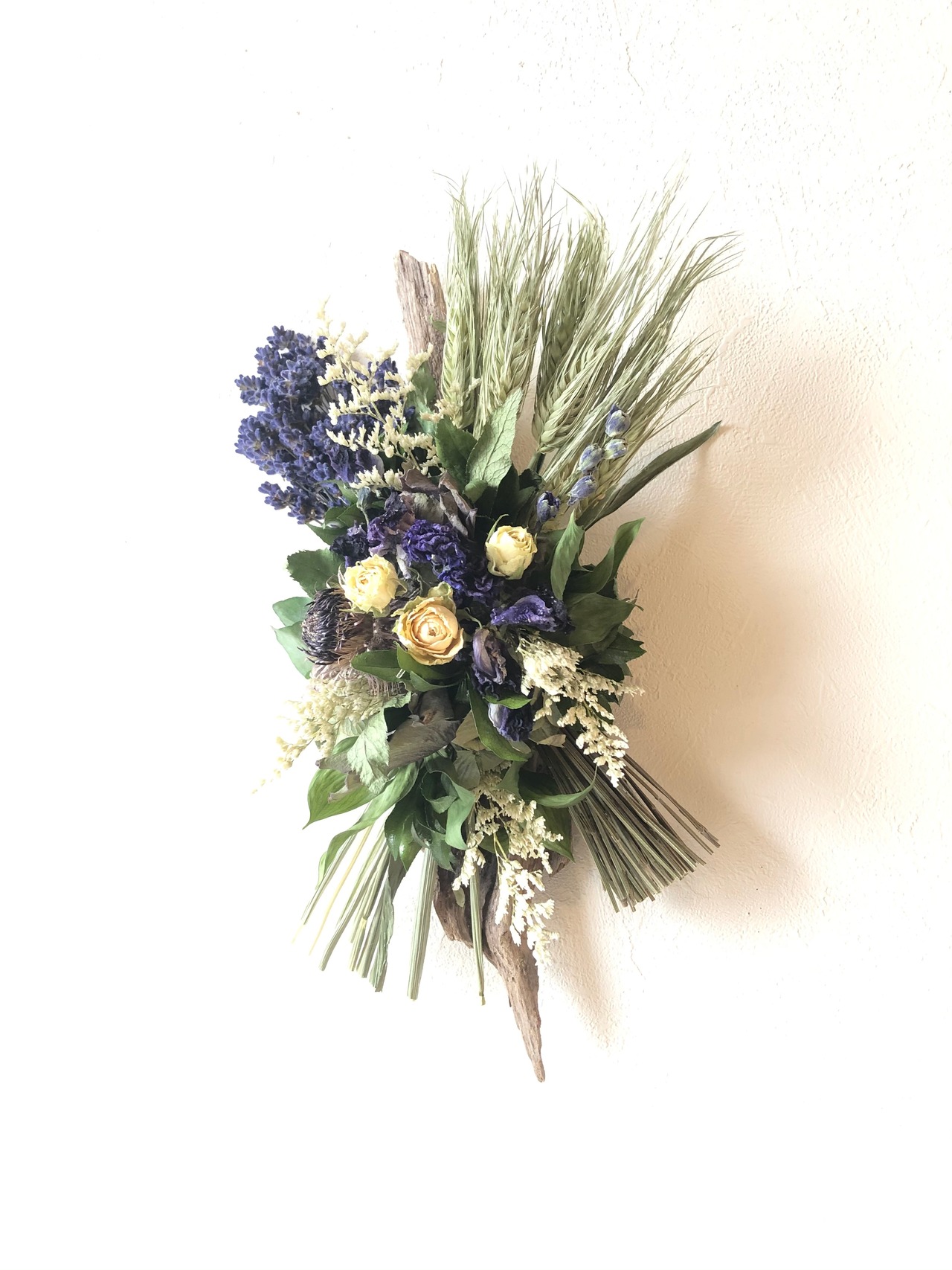 ラベンダーと麦をたっぷりと使った、爽やかな色合いの流木アレンジ。