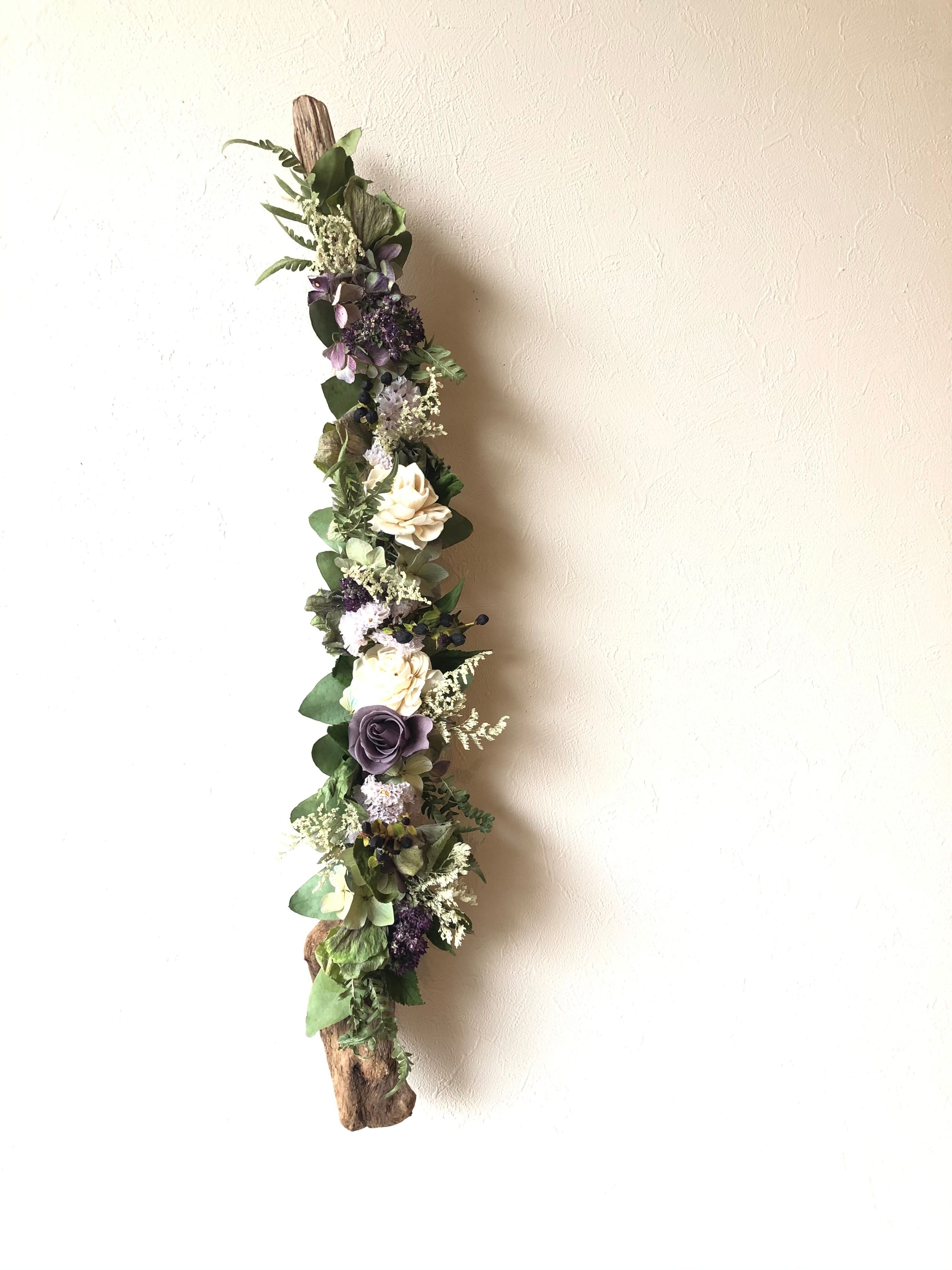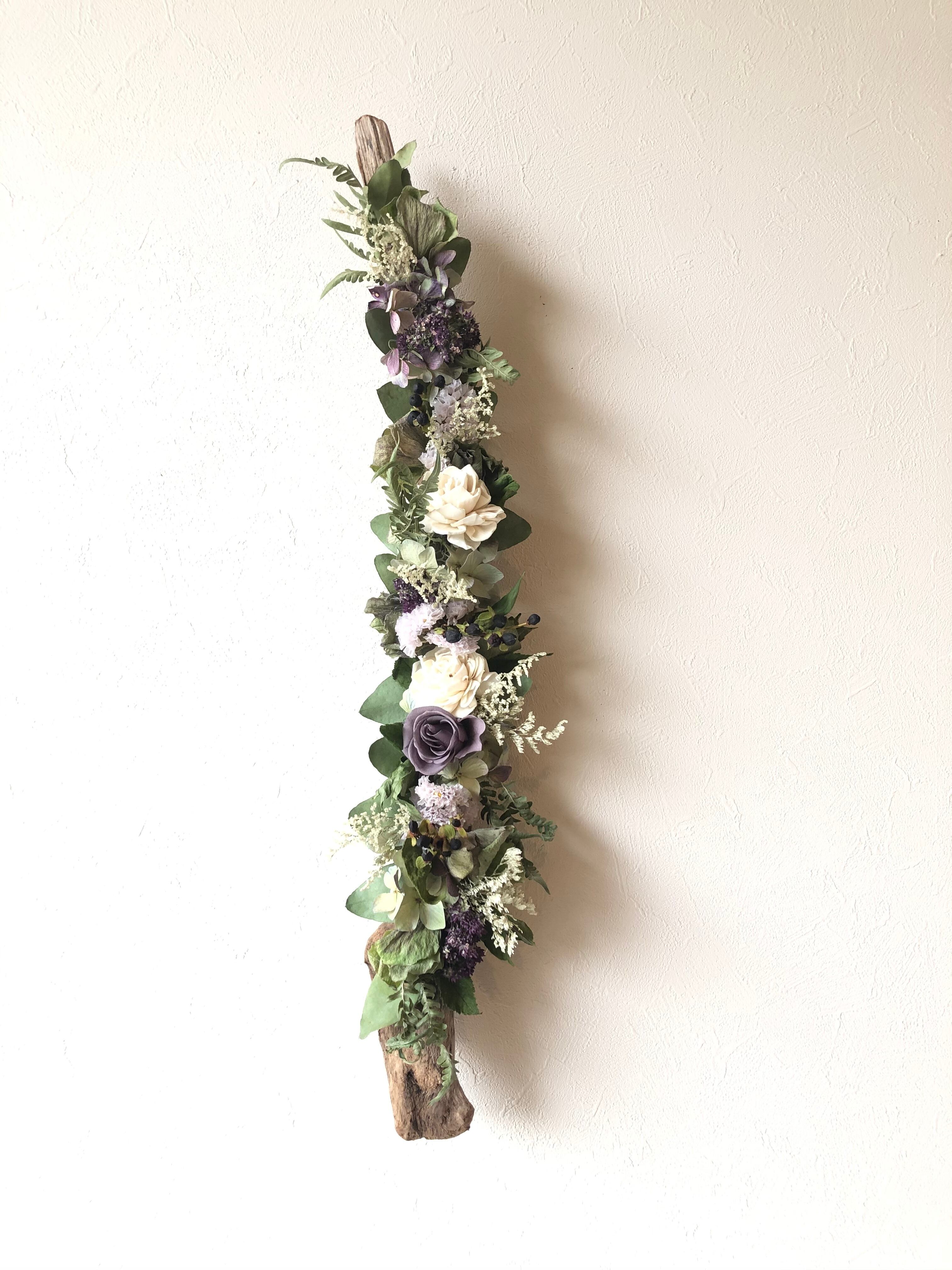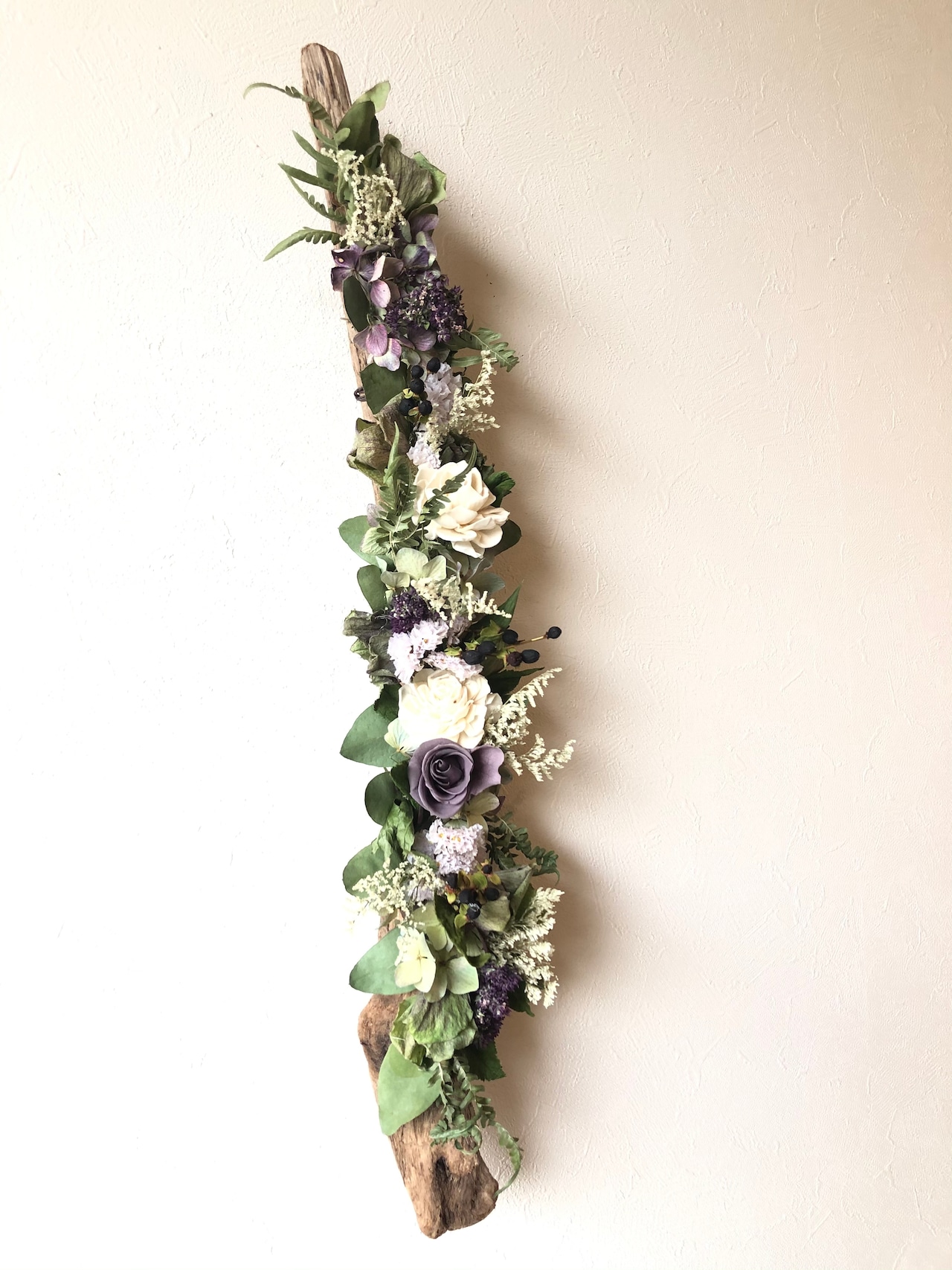 長さのある流木に、アジサイをたっぷり入れて、淡い白とパープルの花材をアレンジ。