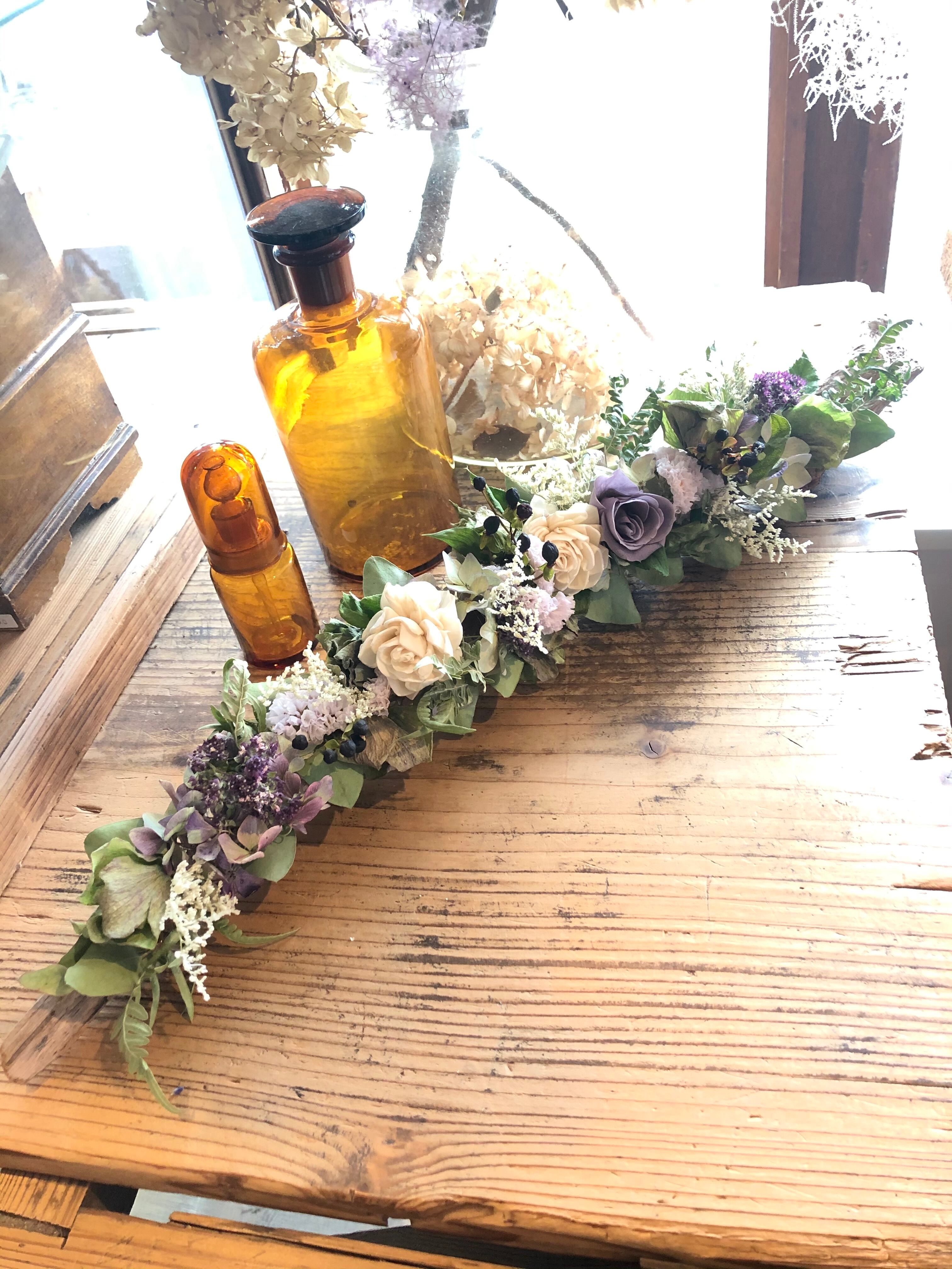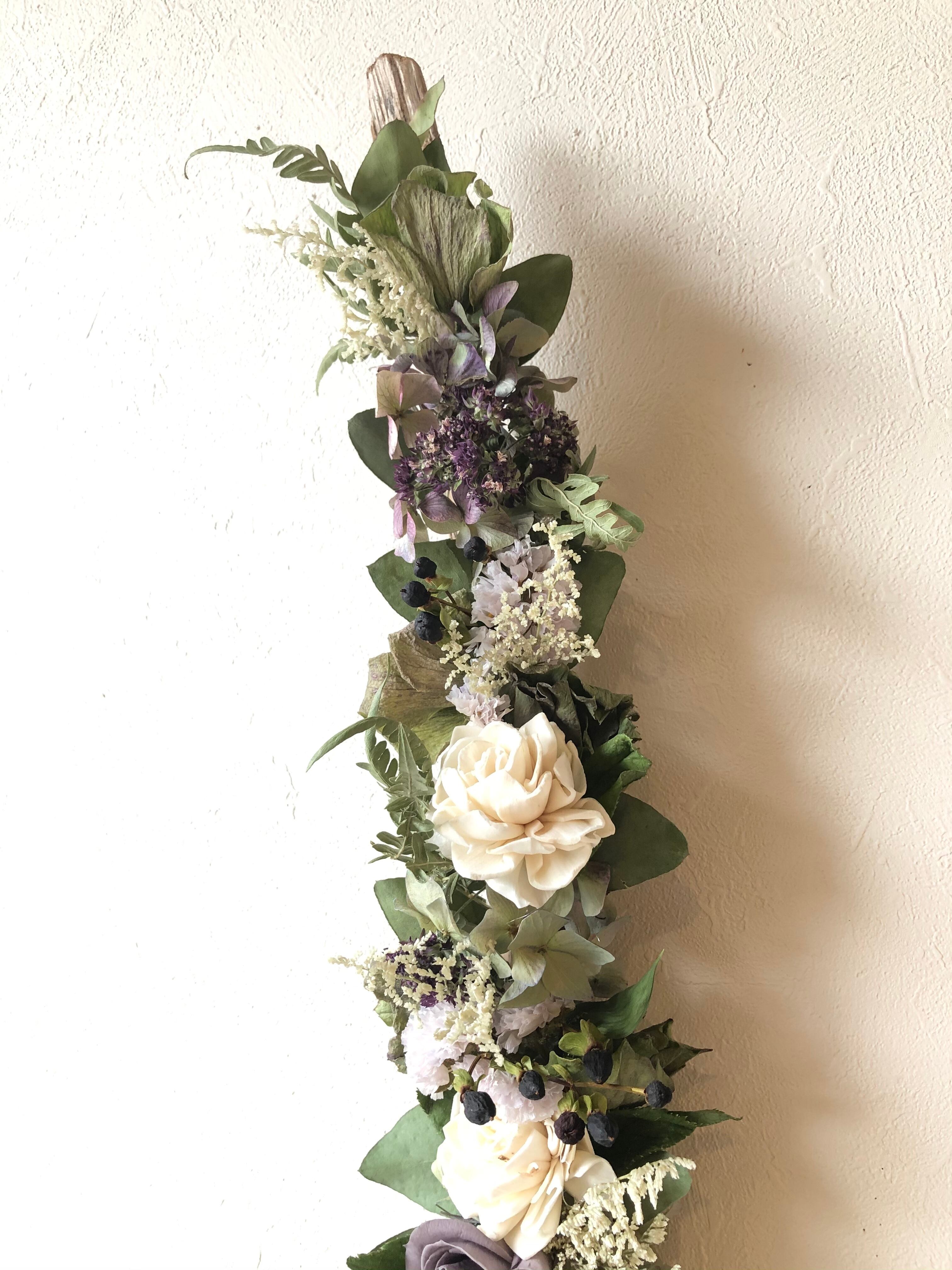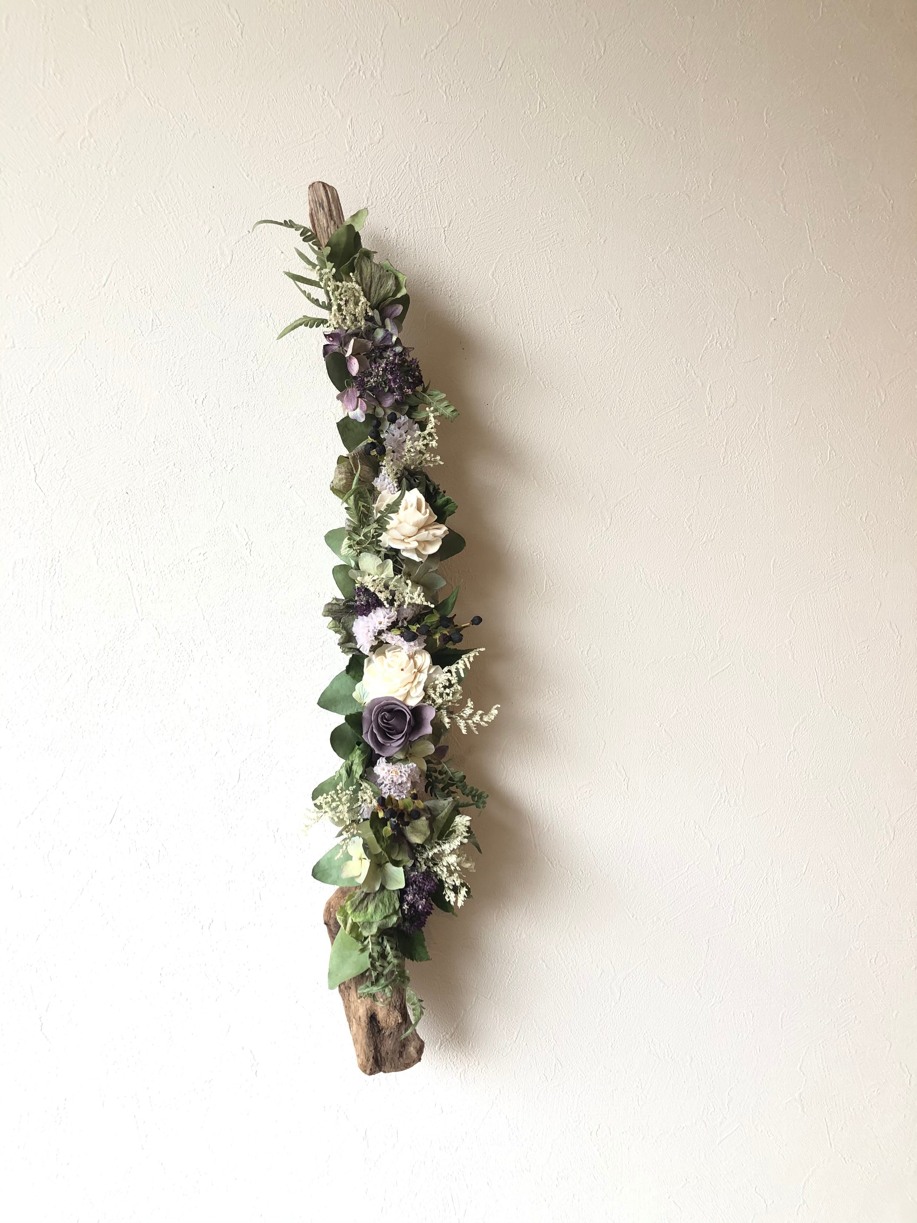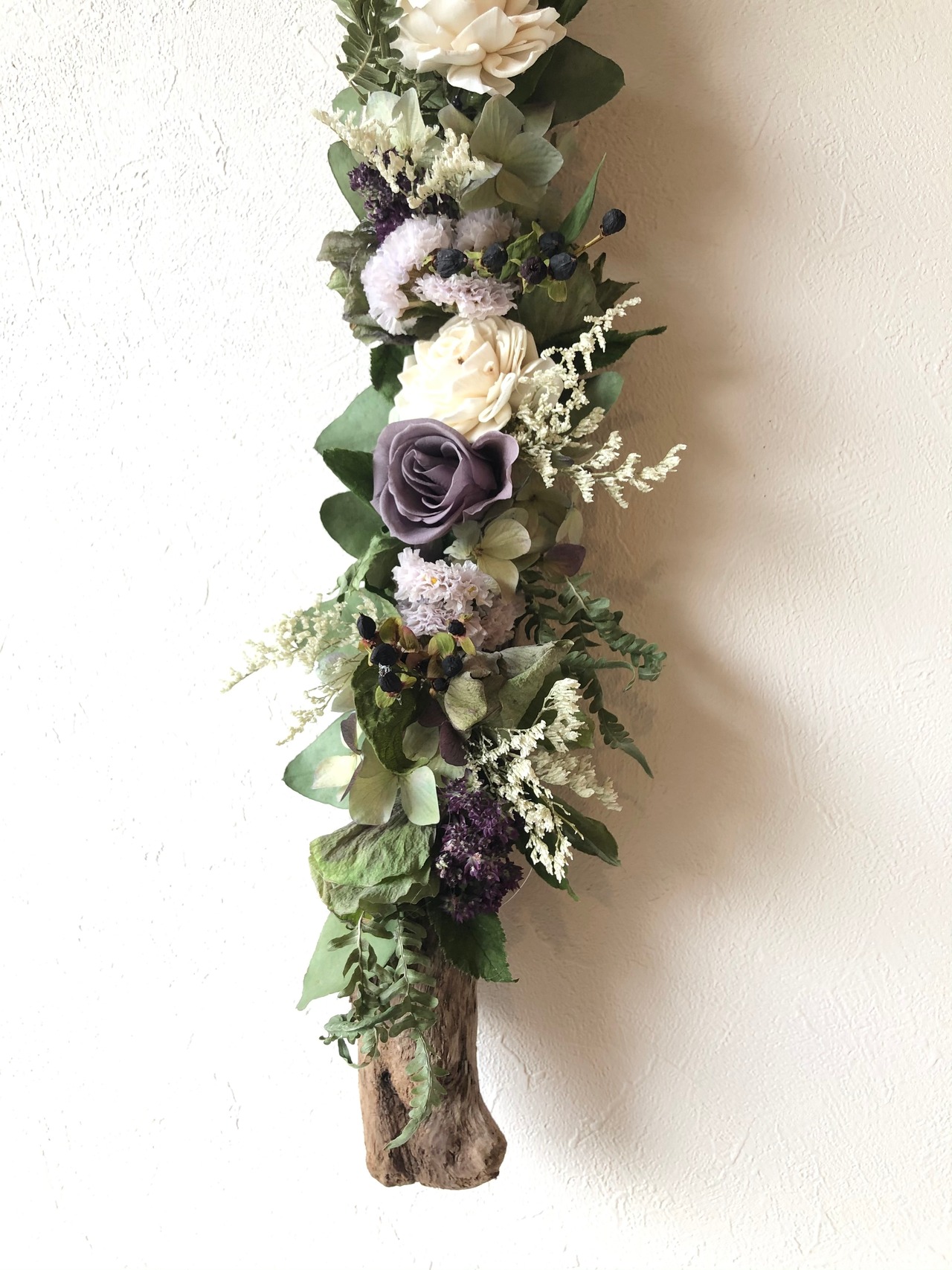 長さのある流木に、アジサイをたっぷり入れて、淡い白とパープルの花材をアレンジ。