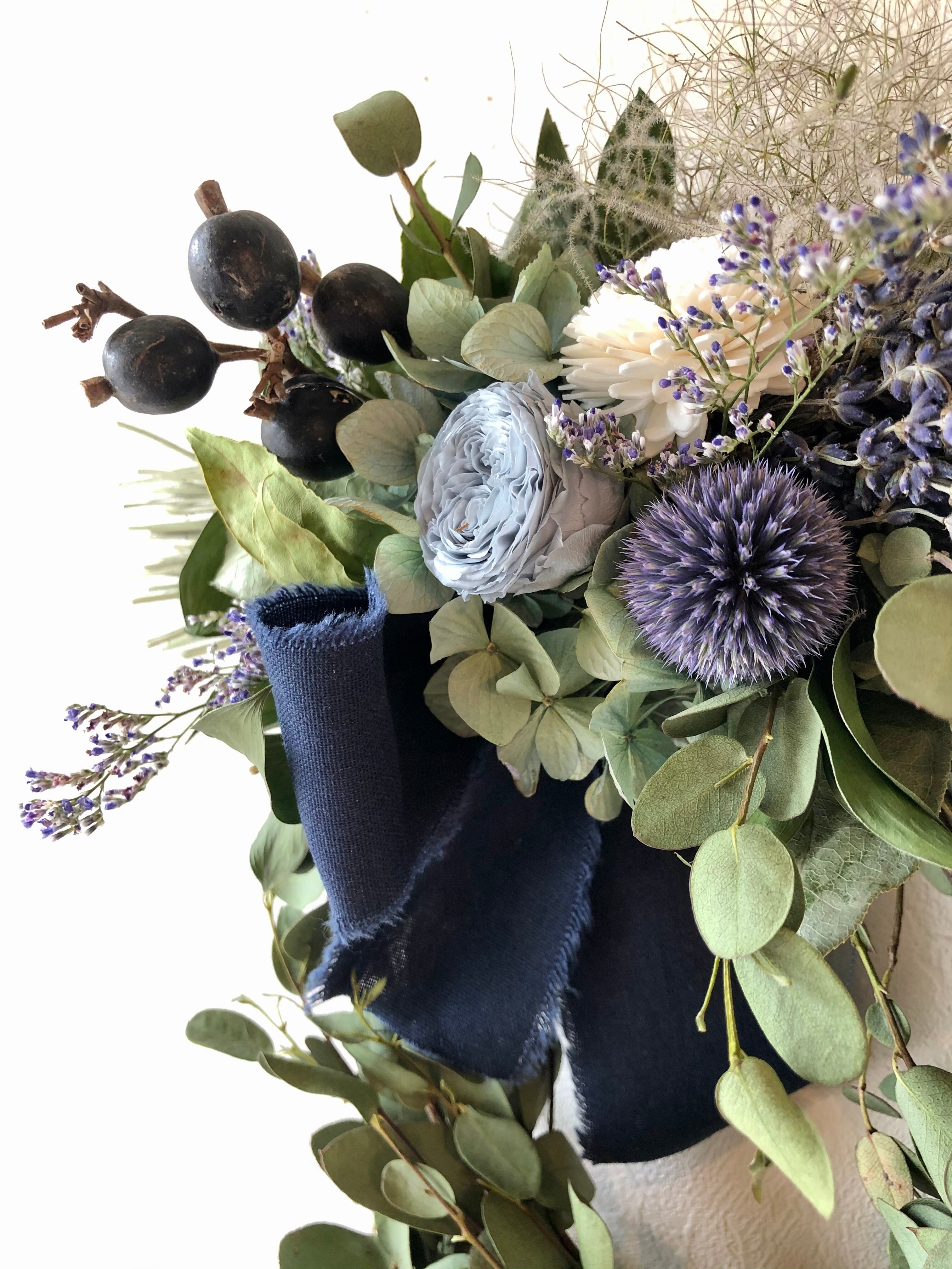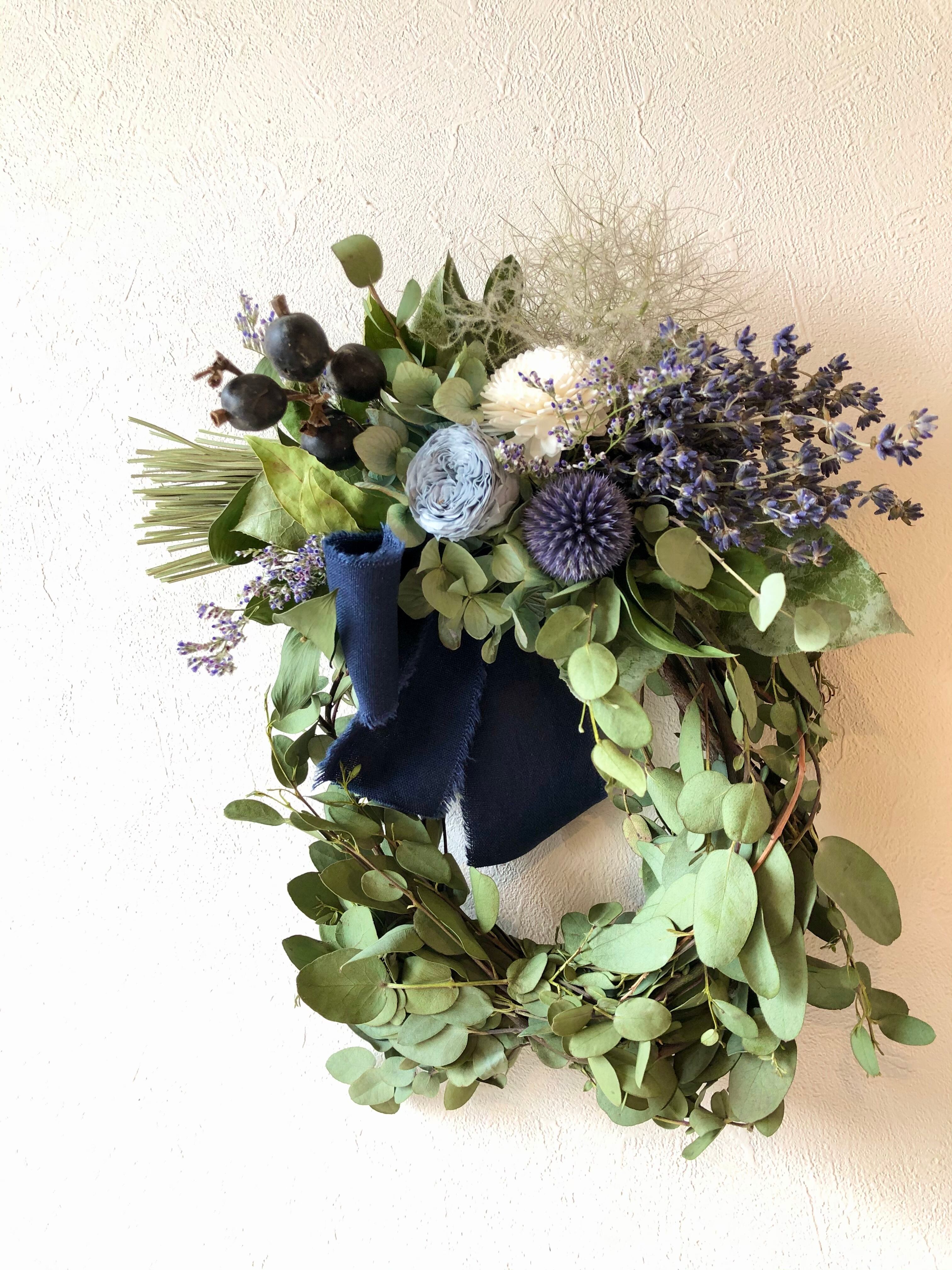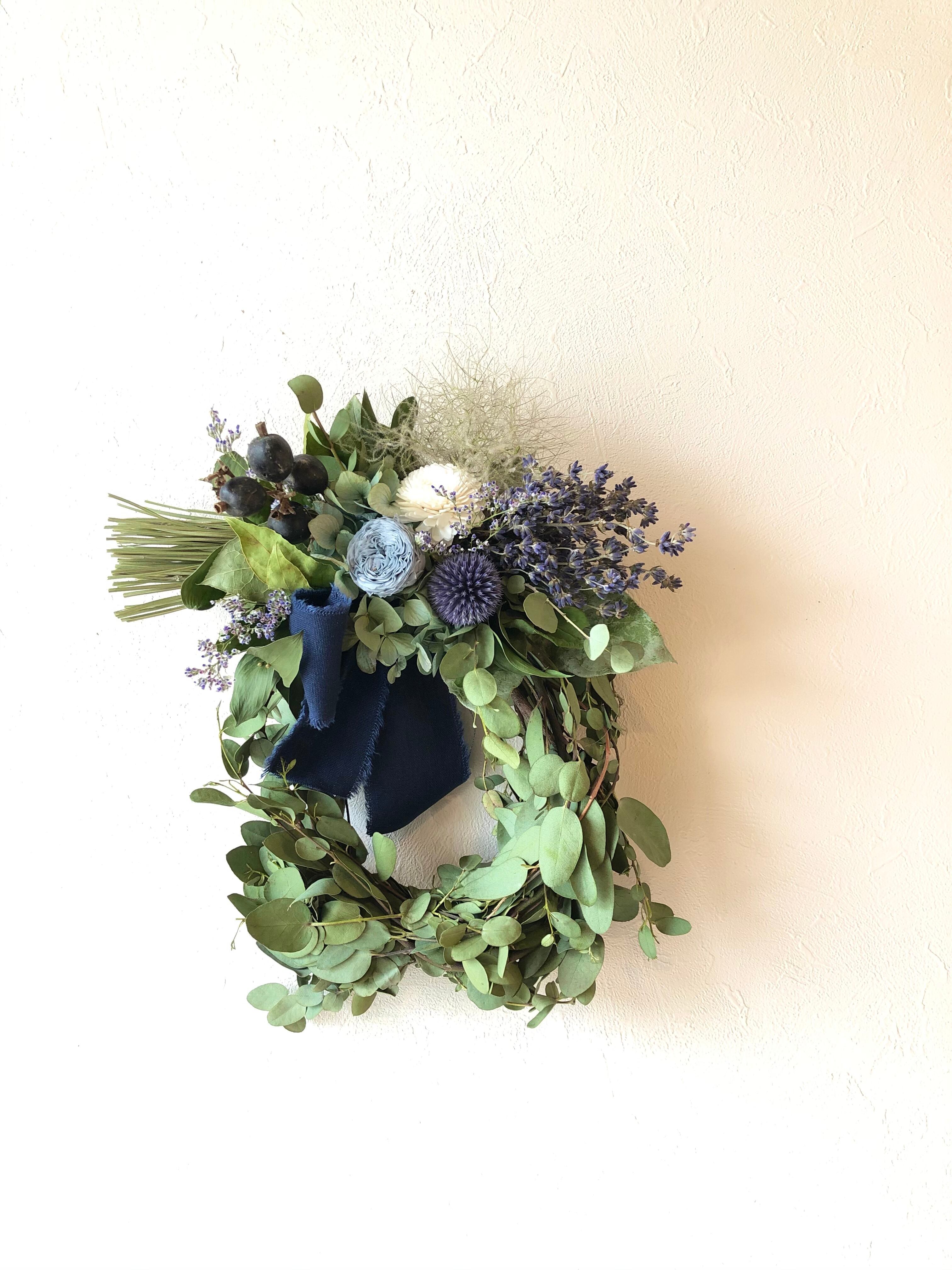 新鮮なユーカリをたっぷりと使ったベースに、香り高い北海道産のラベンダー、今が旬のスモークツリーをアレンジしたユーカリリース。小ぶりで飾りやすいサイズのリースです。シックなネイビーのコットンリボンもポイントに。