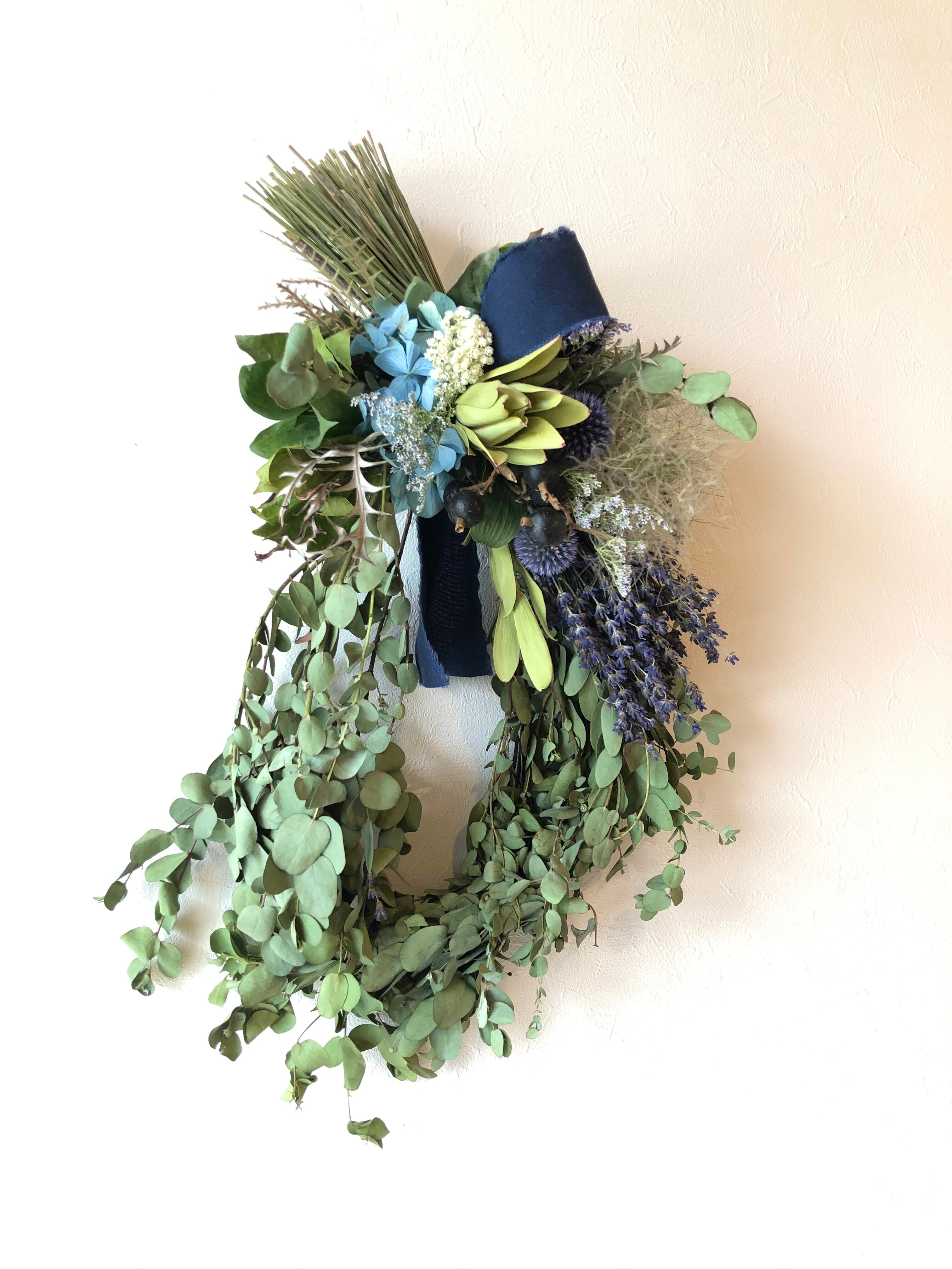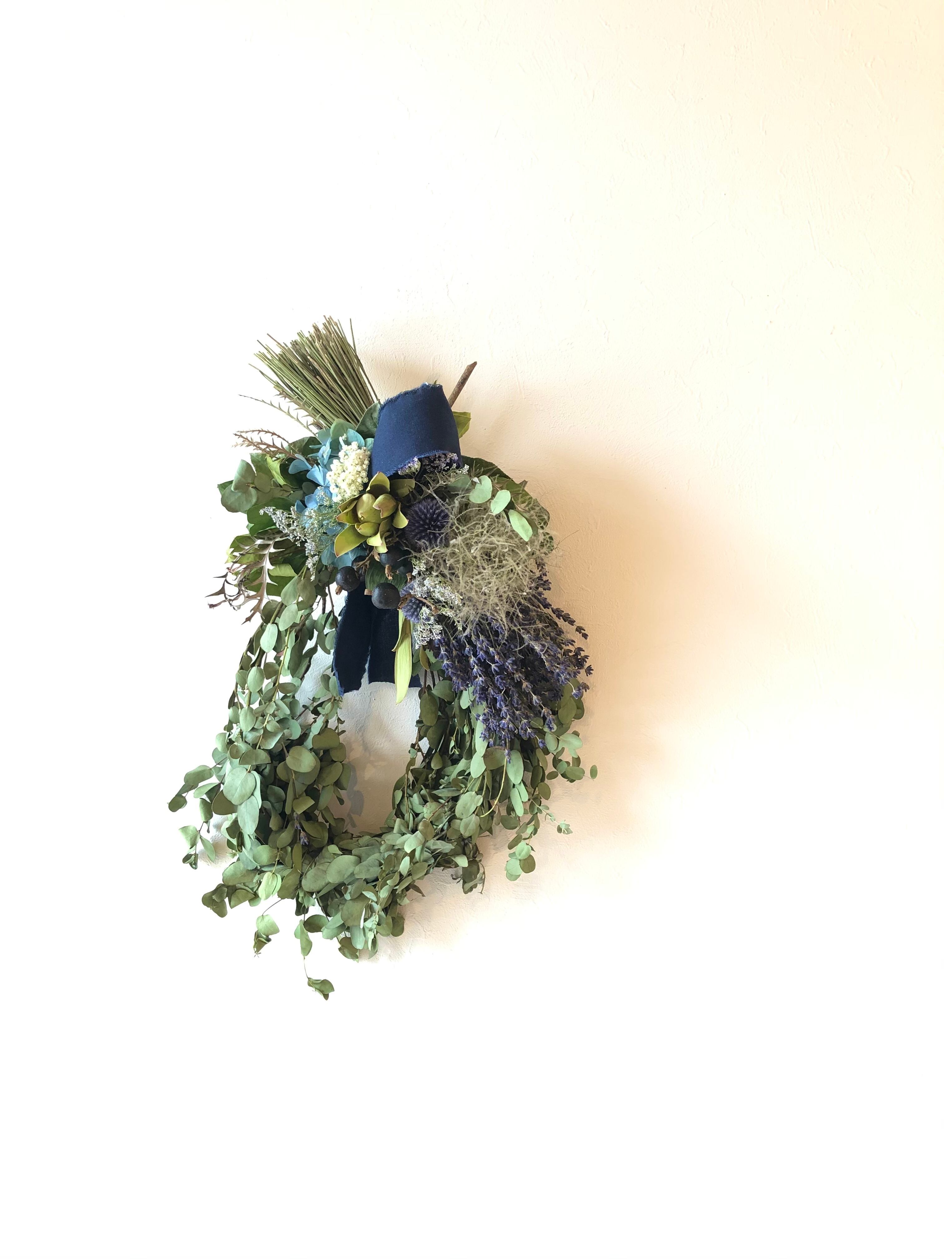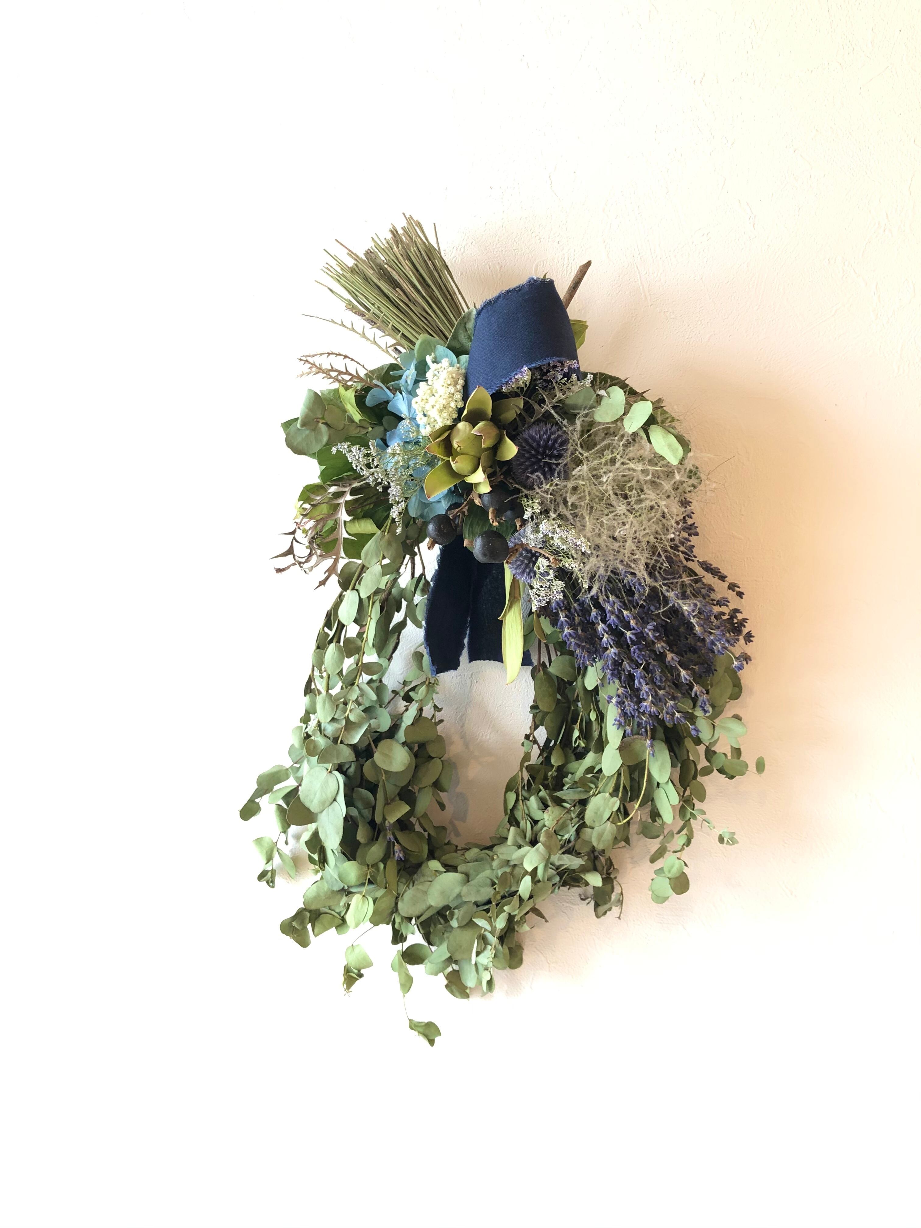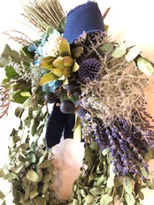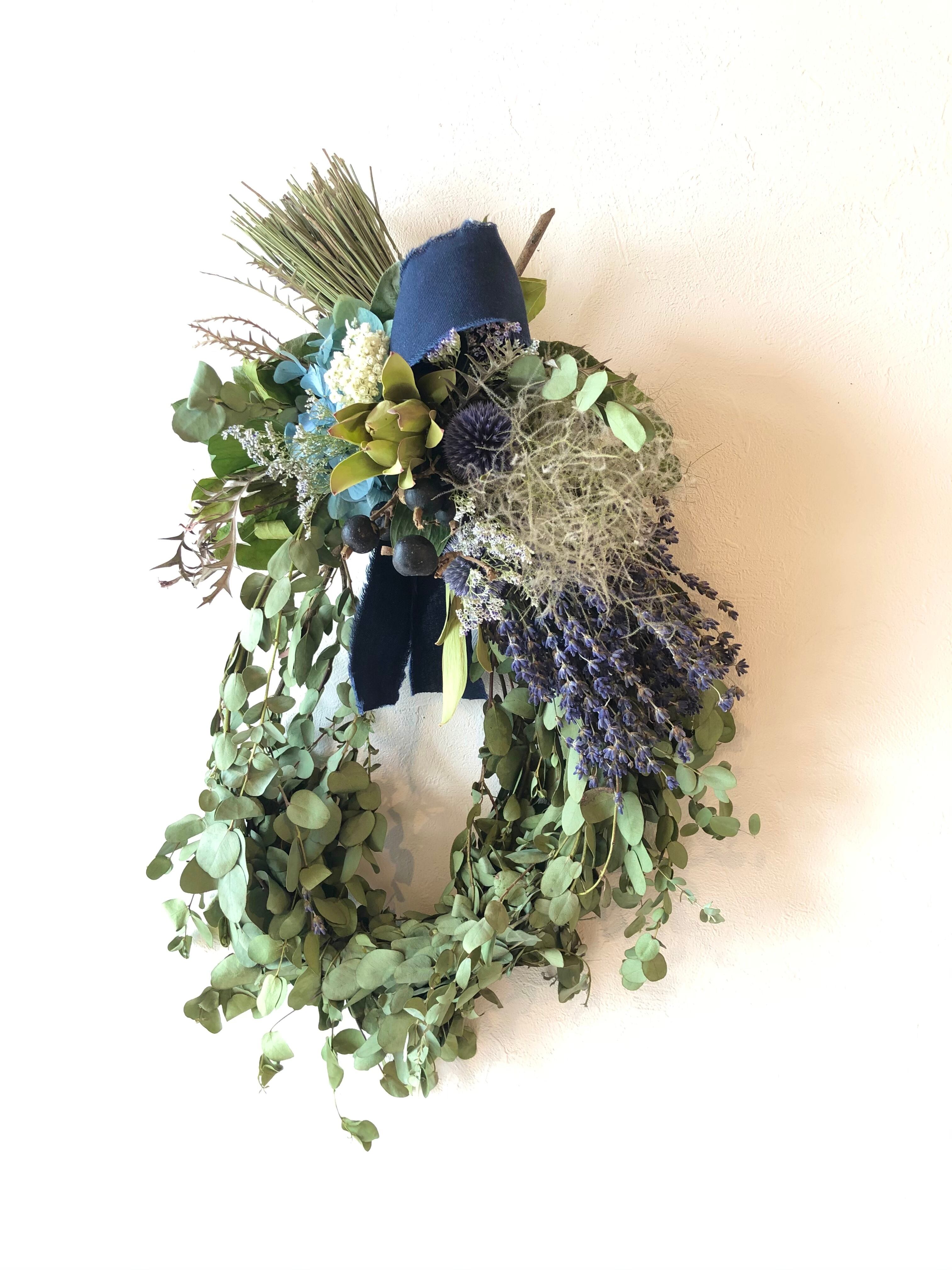 新鮮なユーカリをたっぷりと使ったベースに、香り高い北海道産のラベンダーをたっぷりとアレンジしたユーカリリース。人気のスモークツリーも入れてボリュームのあるリースです。