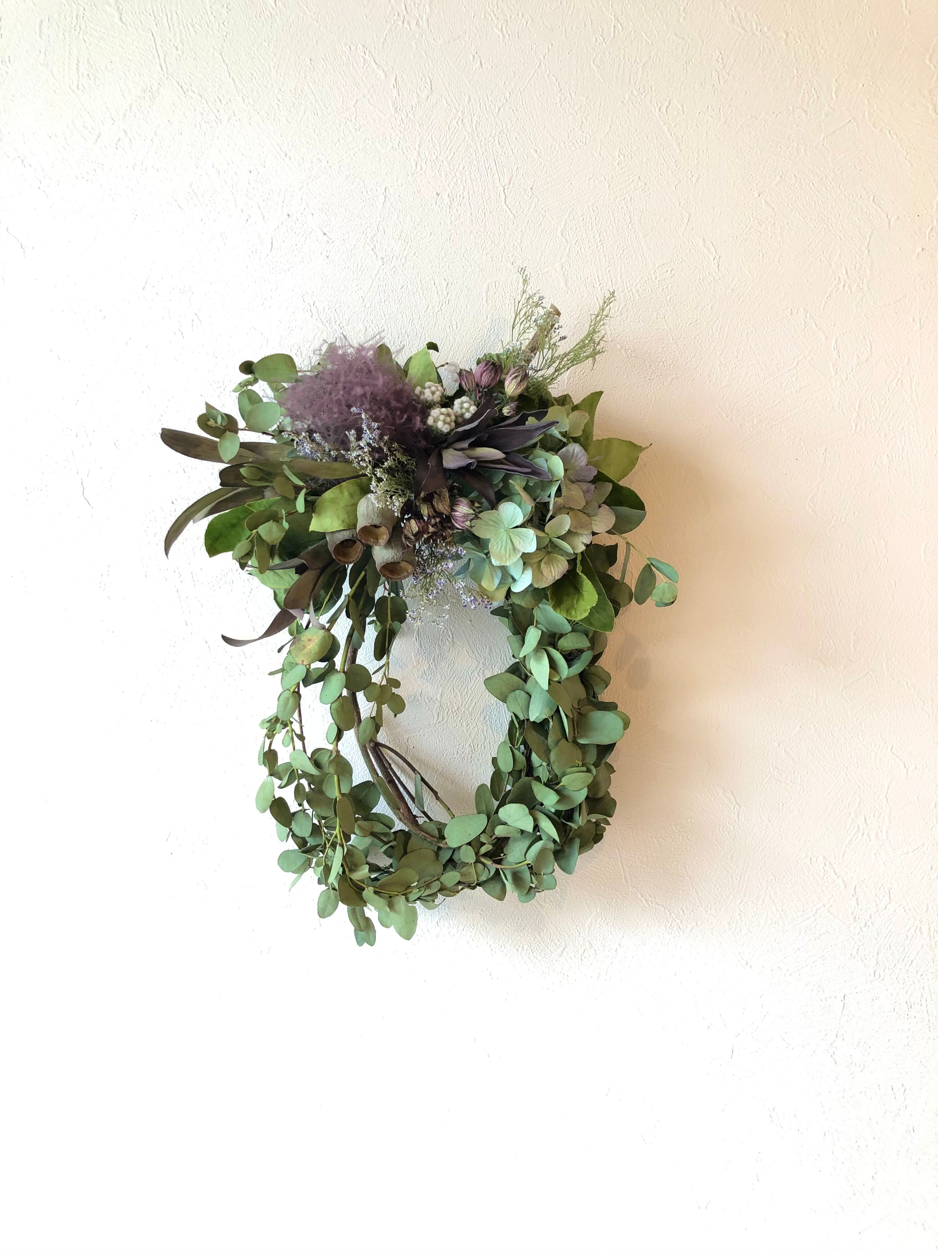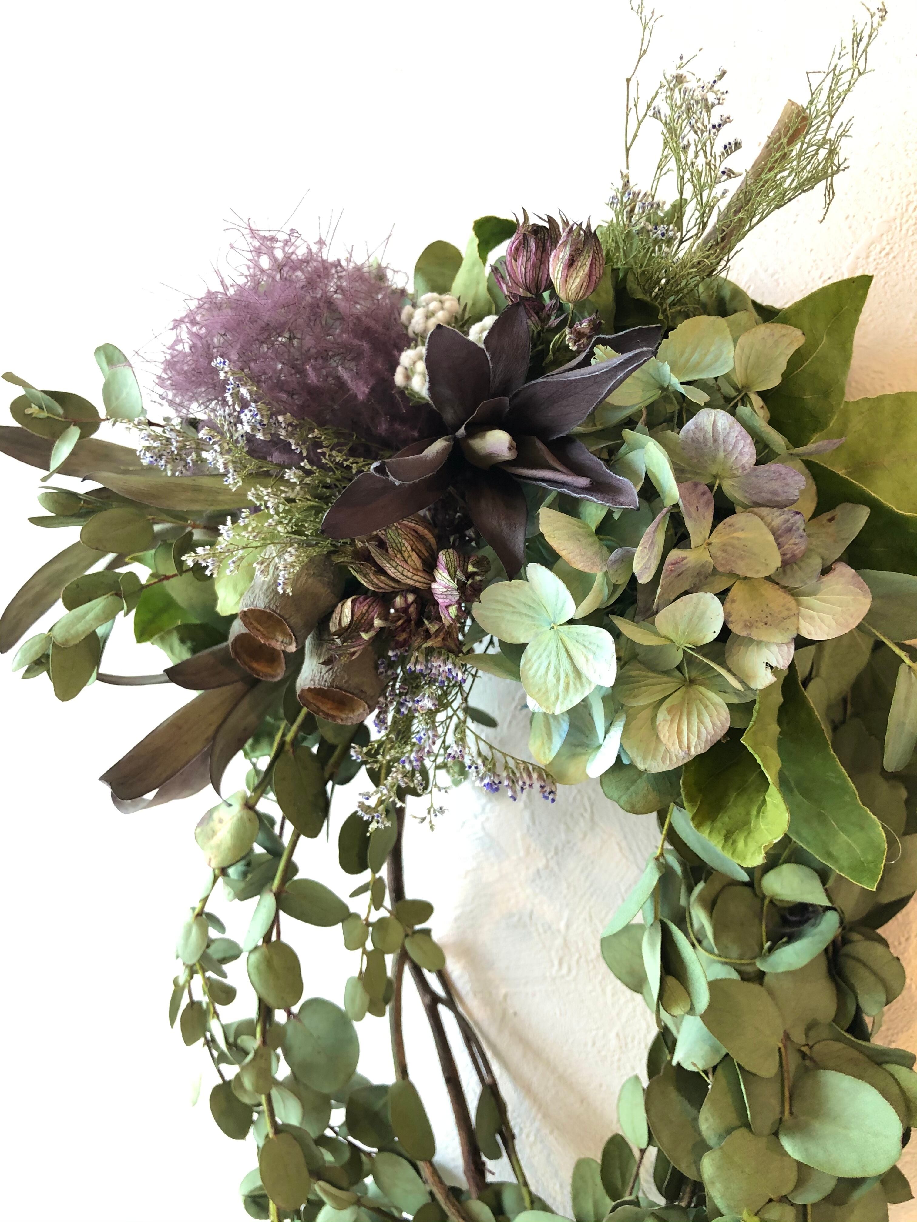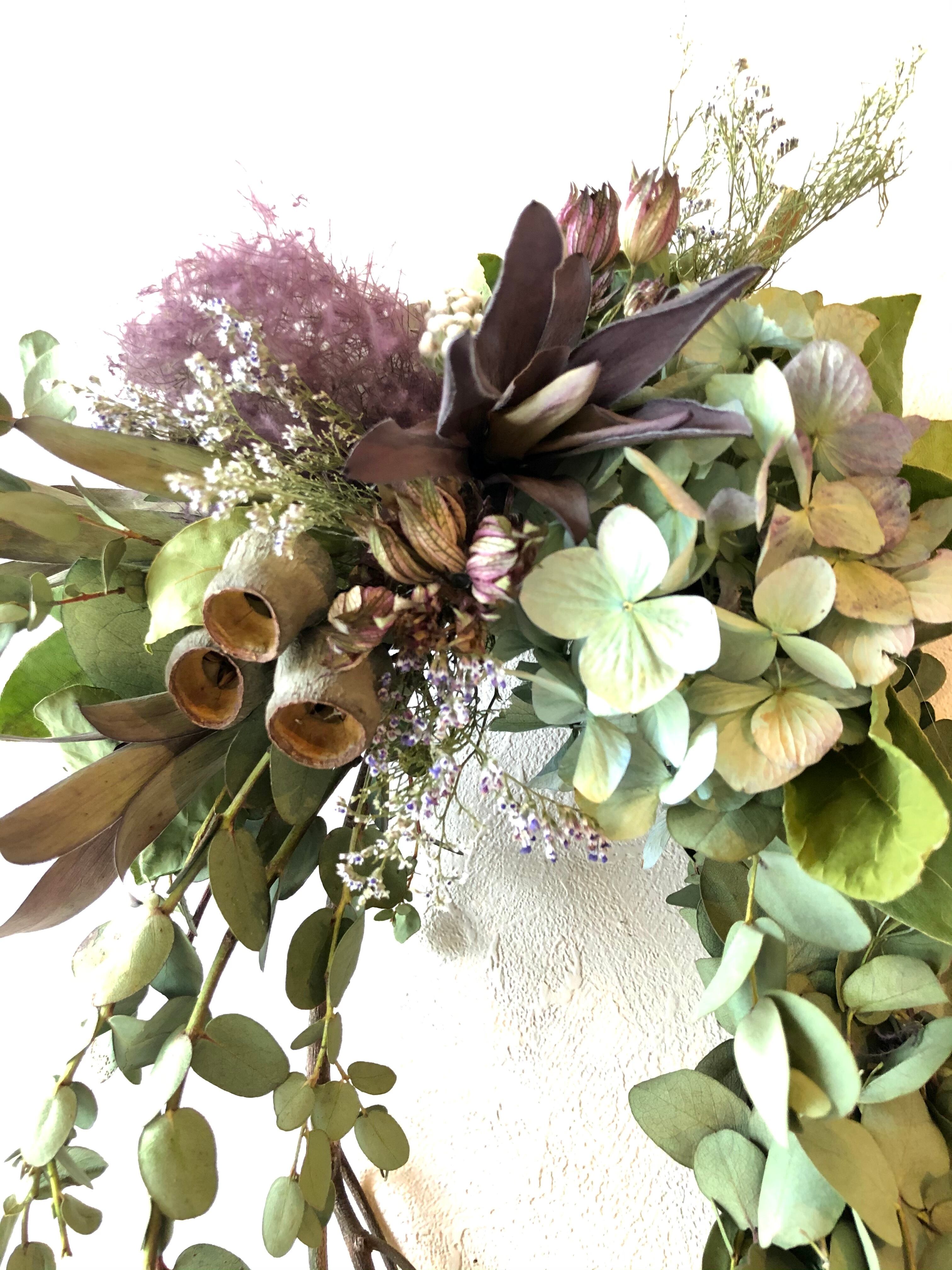 新鮮なユーカリをたっぷりと使ったベースに、アジサイ、ボルドーのスモークツリー、そしてシックなボルドーのリュウカデンドロンなど人気の花材をアレンジしたユーカリリース。