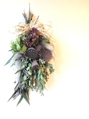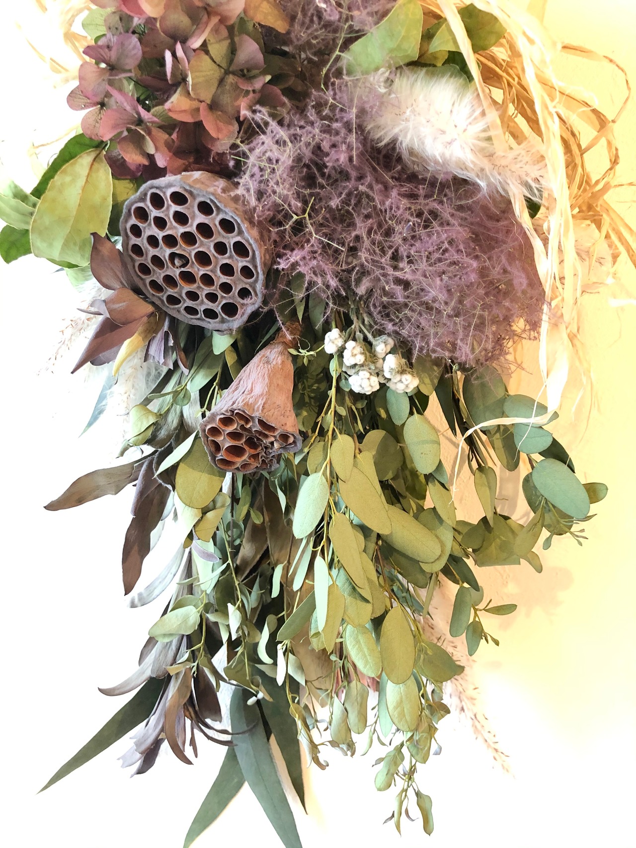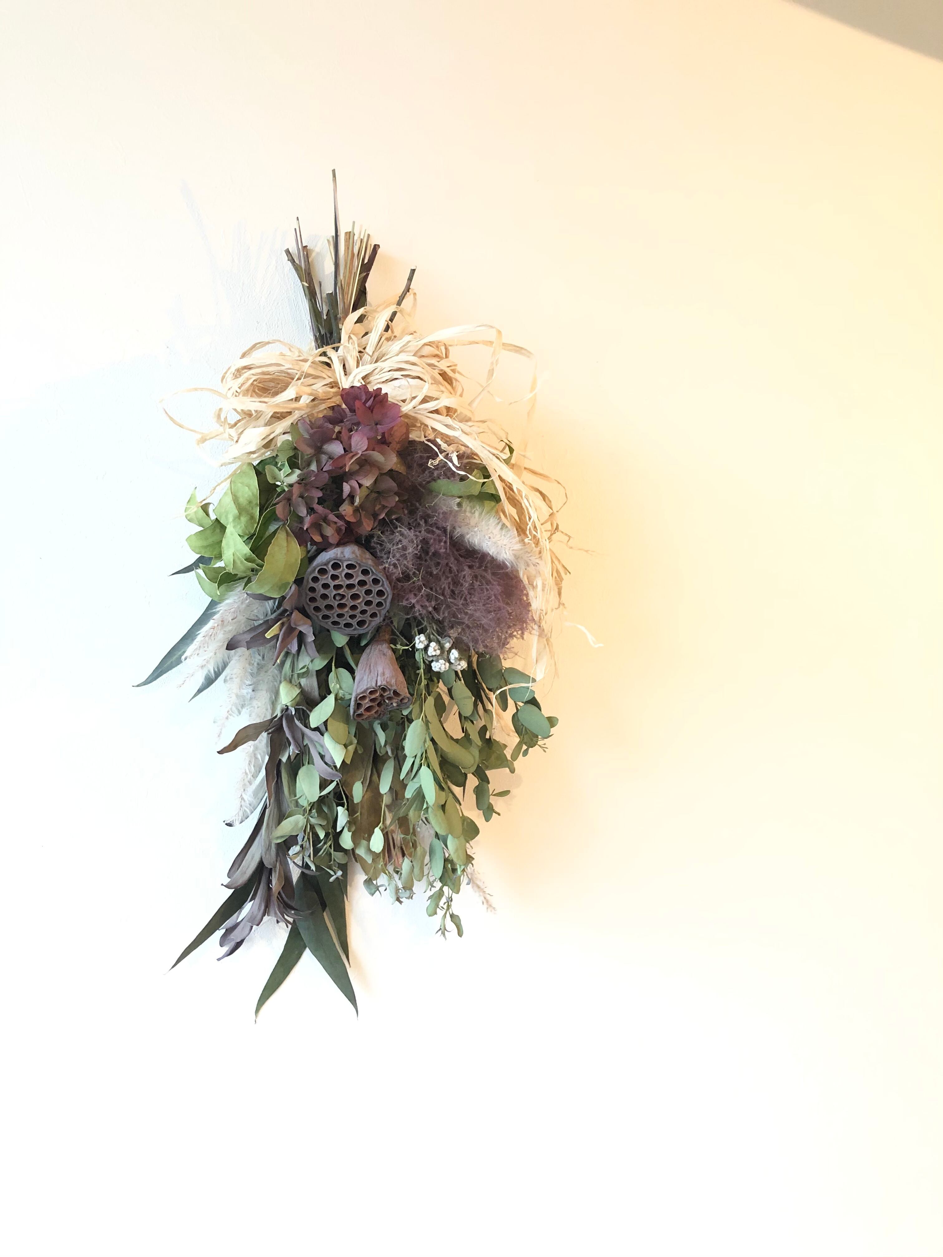 新鮮なユーカリをたっぷり使ったベースに、スモーキーなチガヤ、ボルドーのスモークツリー、ハスやリュウカデンドロンなど、落ち着いた色合いのスワッグ。
