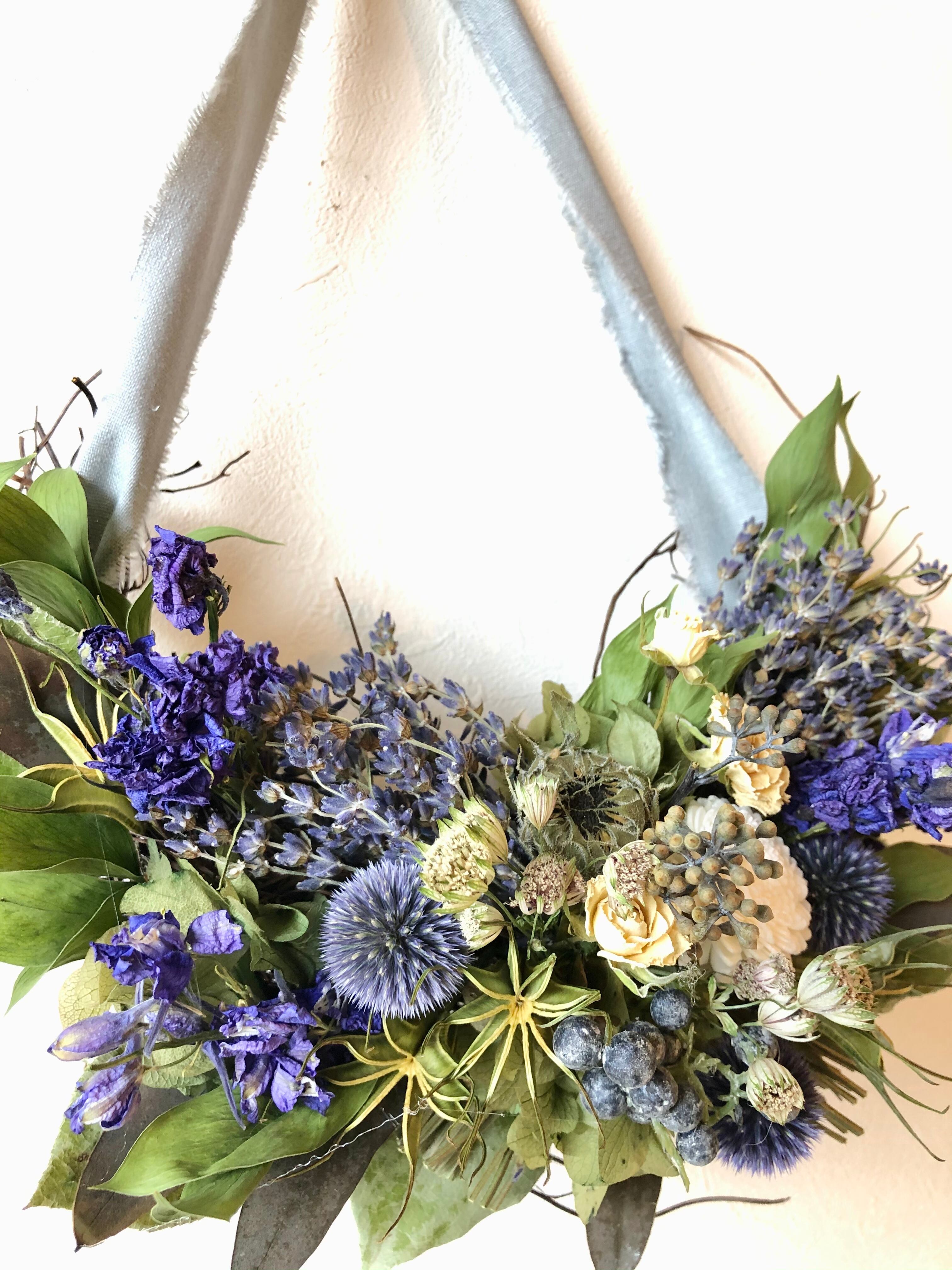 ブルー系の花材をたっぷりと使って夏らしい色合いに。ユーカリの実やアストランティアの白がなんとも可愛い花合わせです。