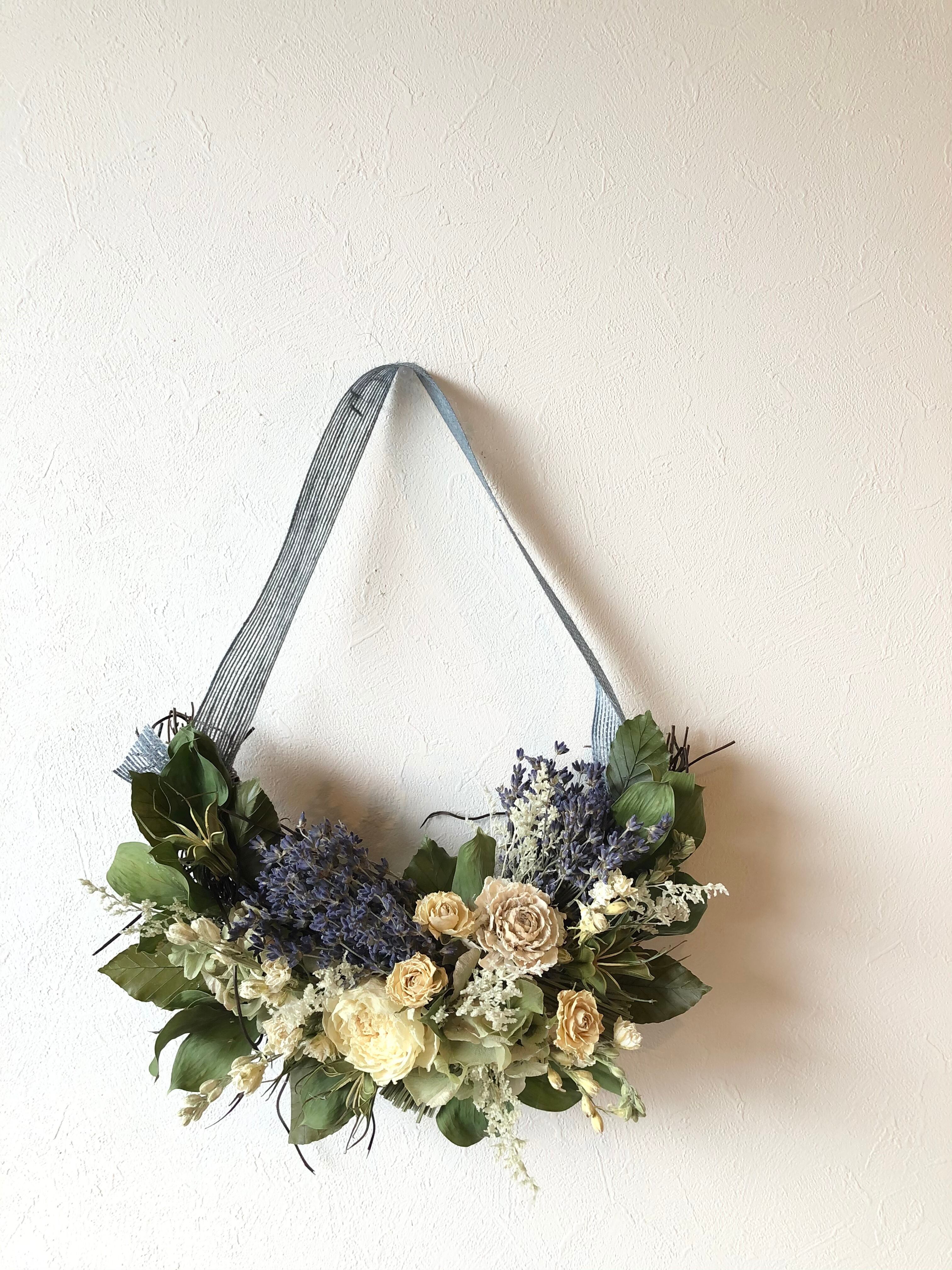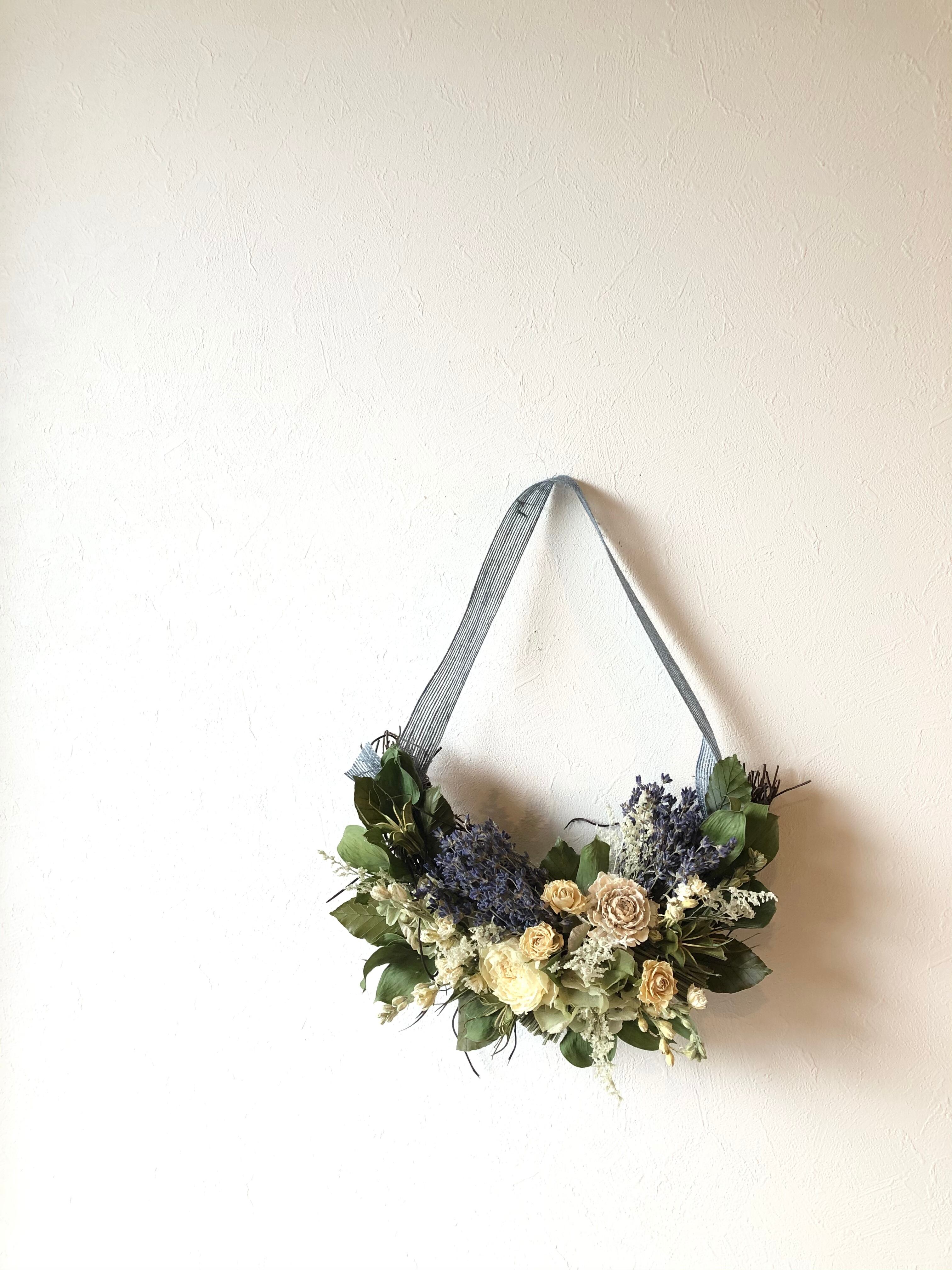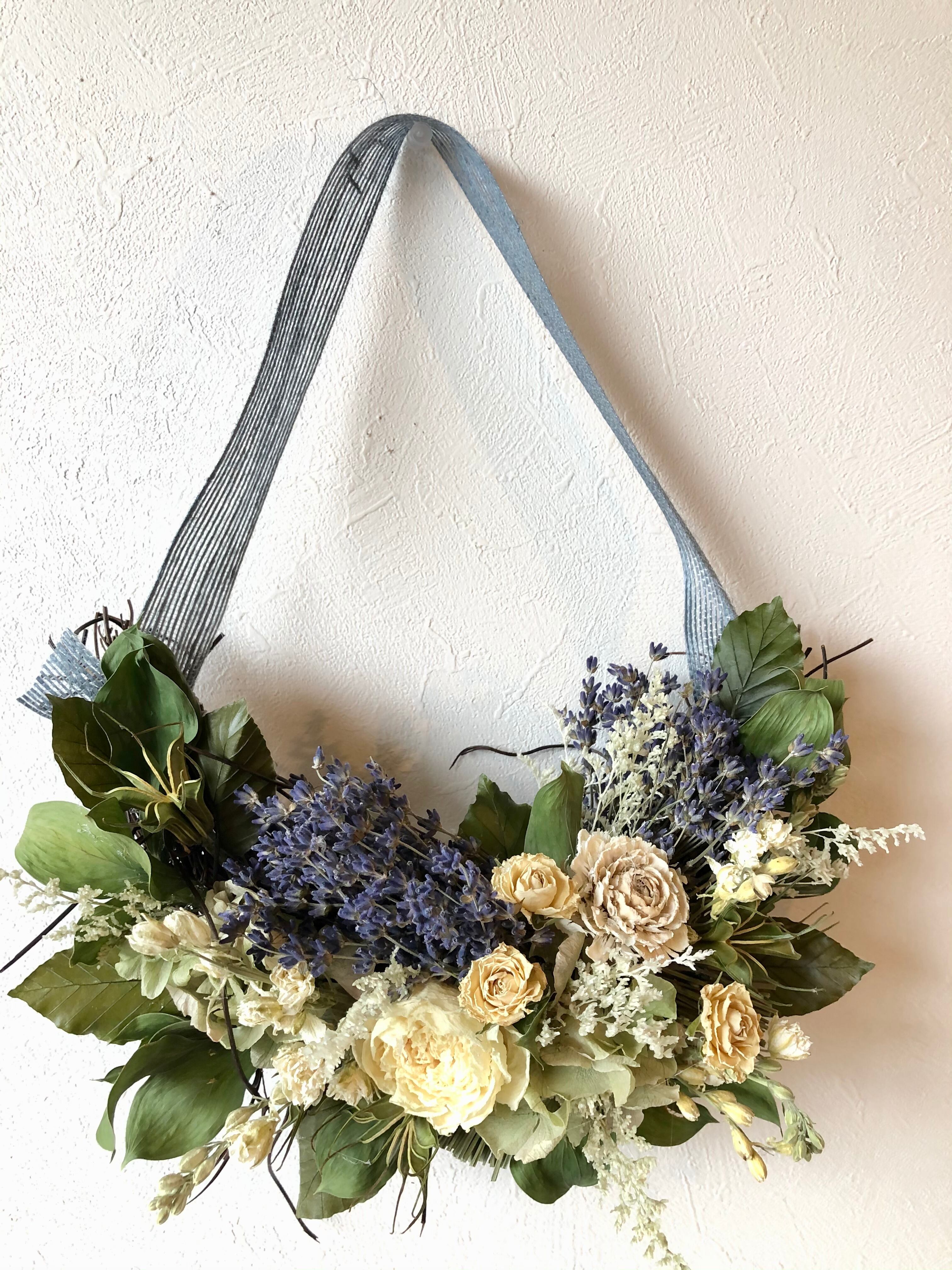 ぽってりとしたハーフリースのベースに、香りのいいラベンダーをたっぷりと入れて。白のシャクヤクやチドリソウの白を入れて白とブルーのコントラストが涼やかなハーフリースです。