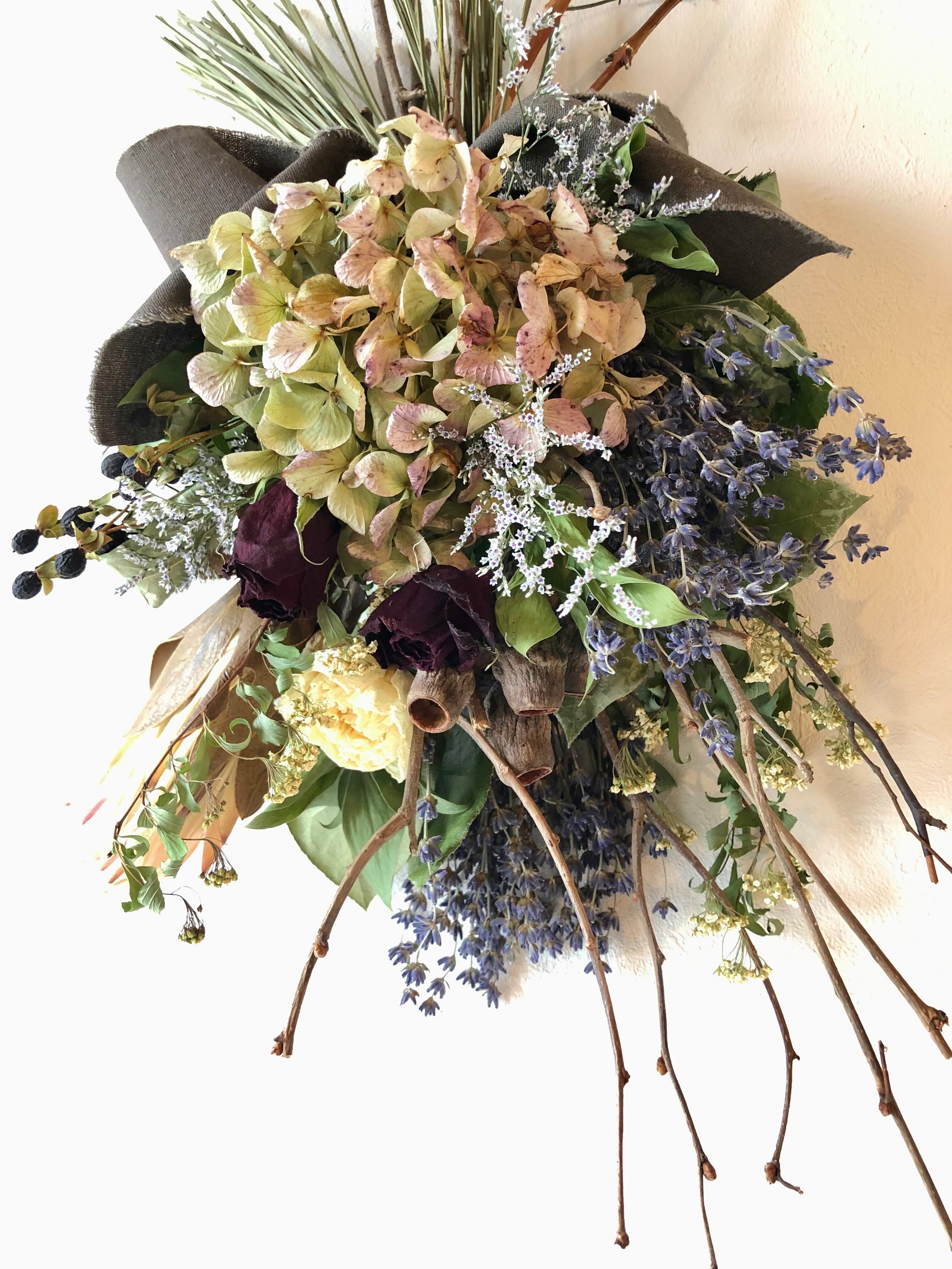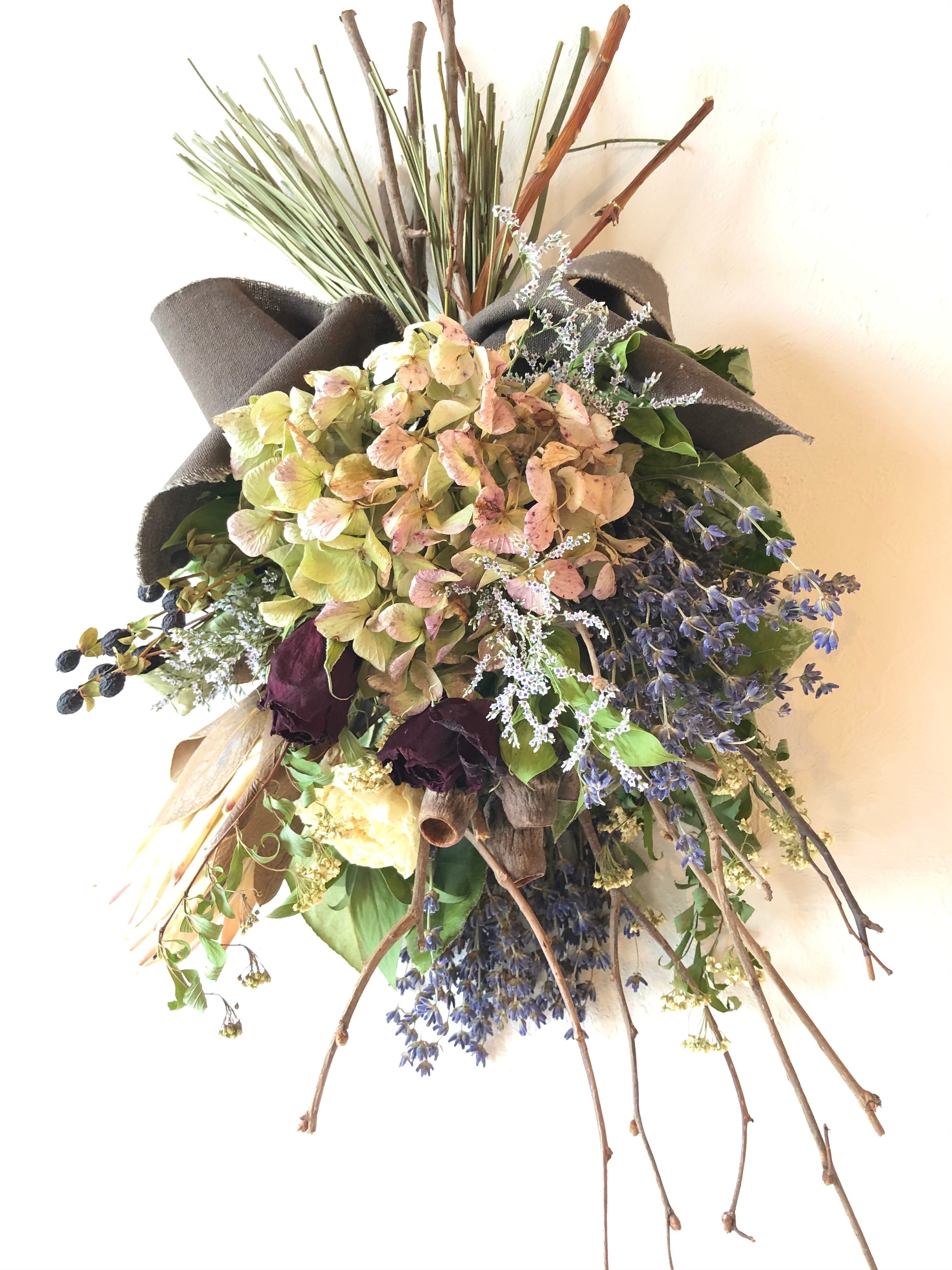 シックなグリーンの紫陽花もたっぷりと入れてボリュームのあるスワッグに。