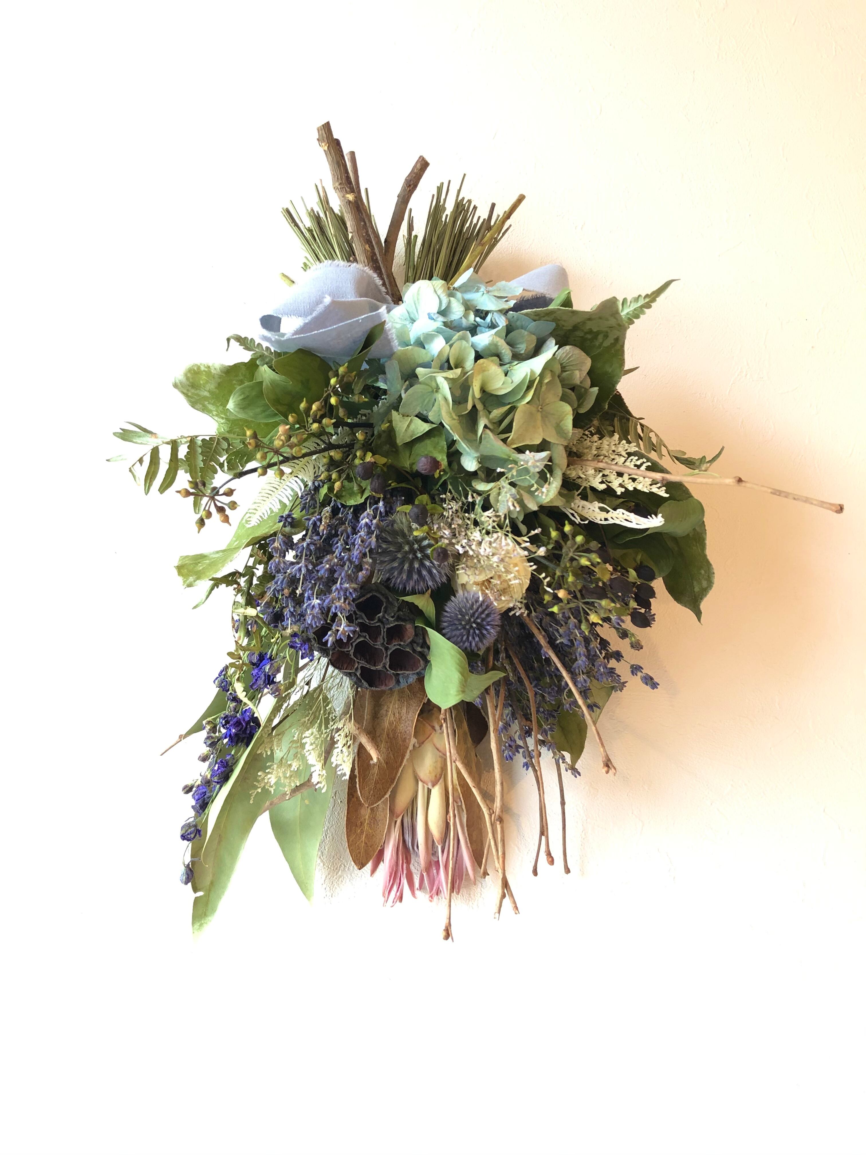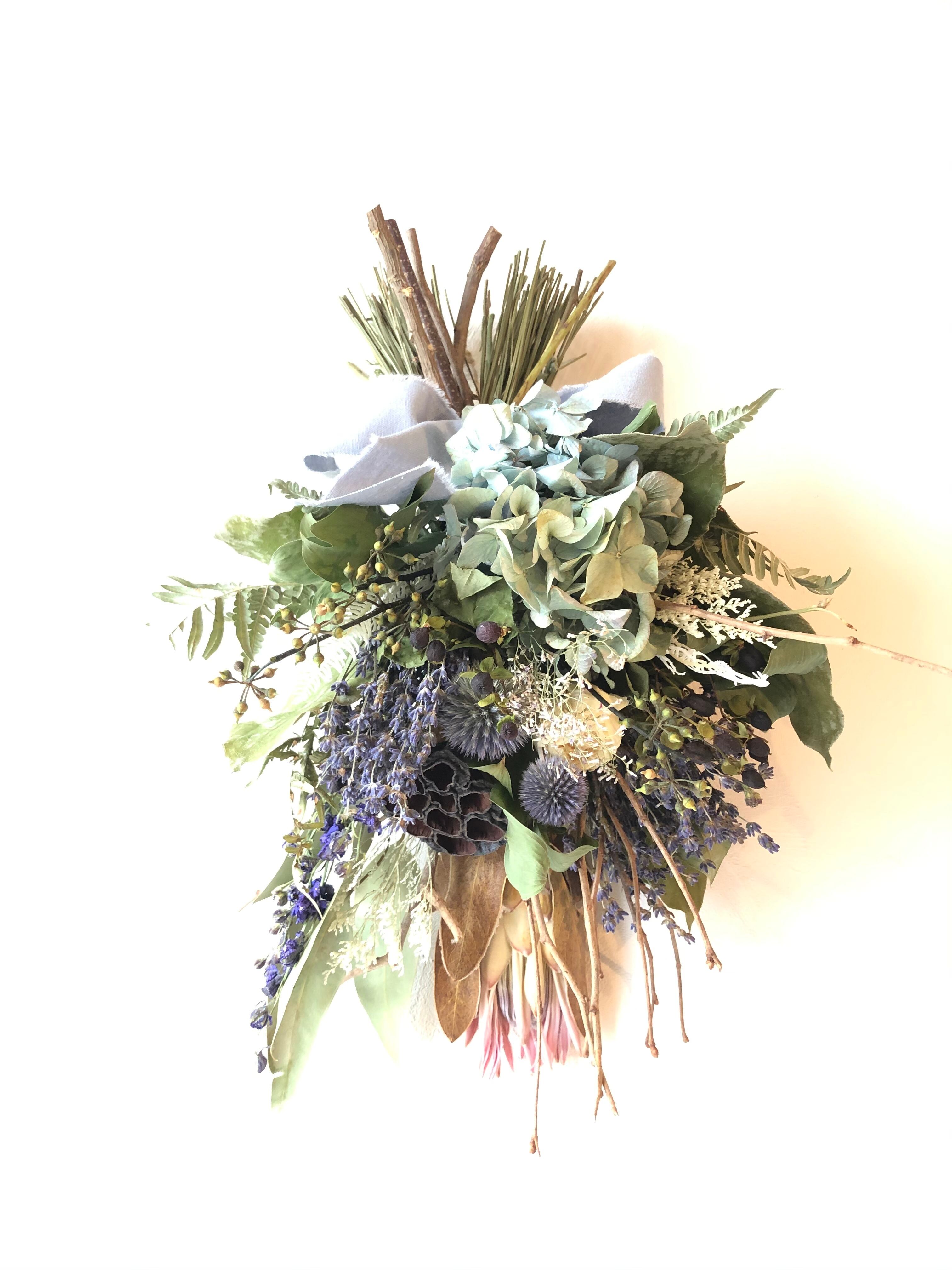 ピンクコンパクタが目を引くスワッグ。ラベンダーをたっぷり入れシックなハスを合わせて落ち着いた色合いに。