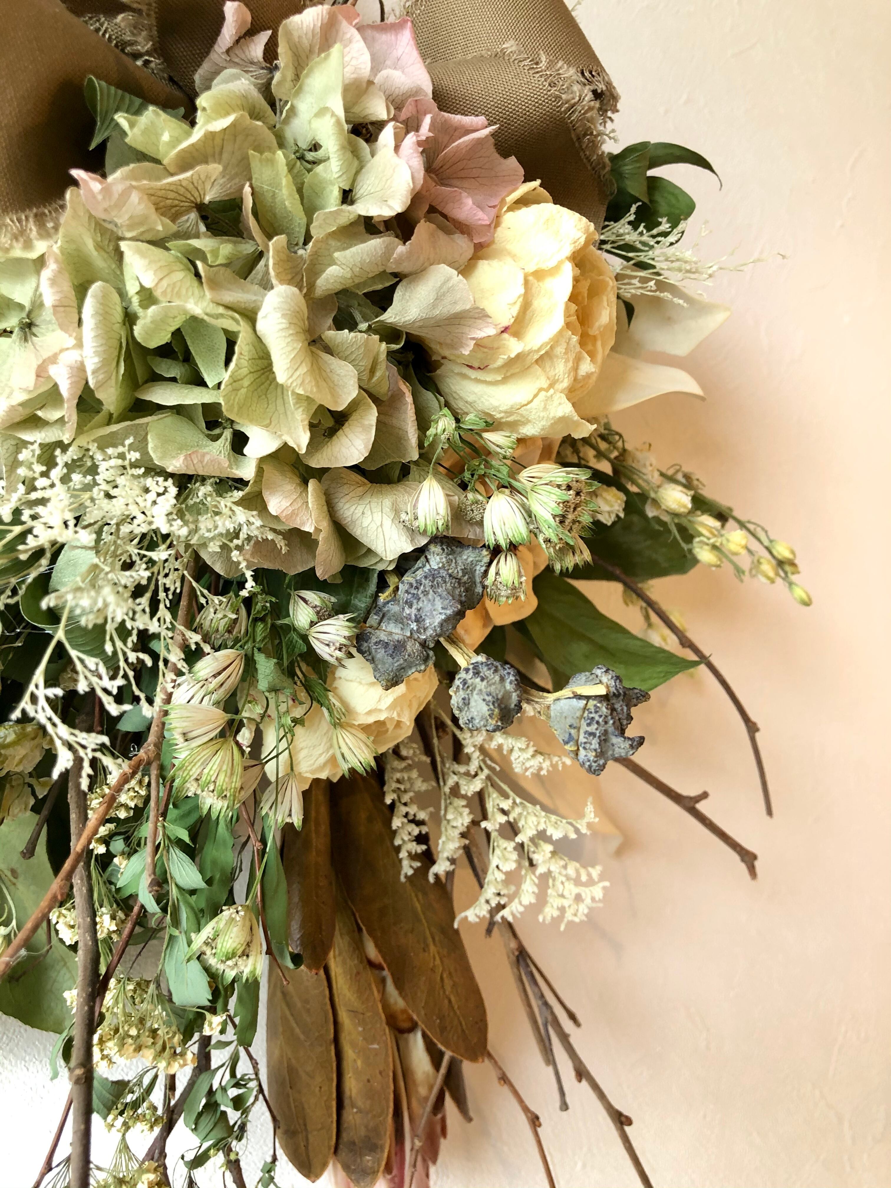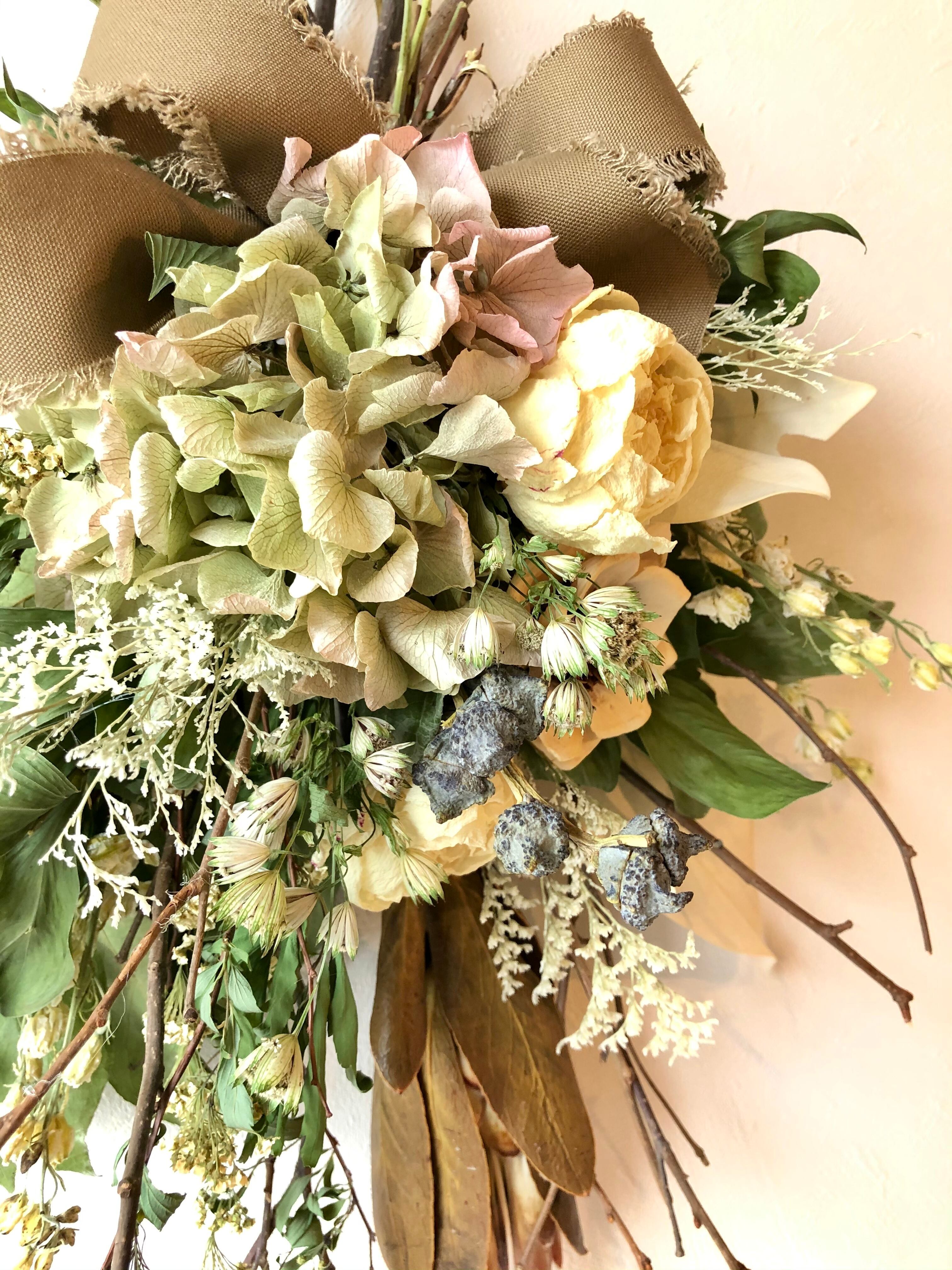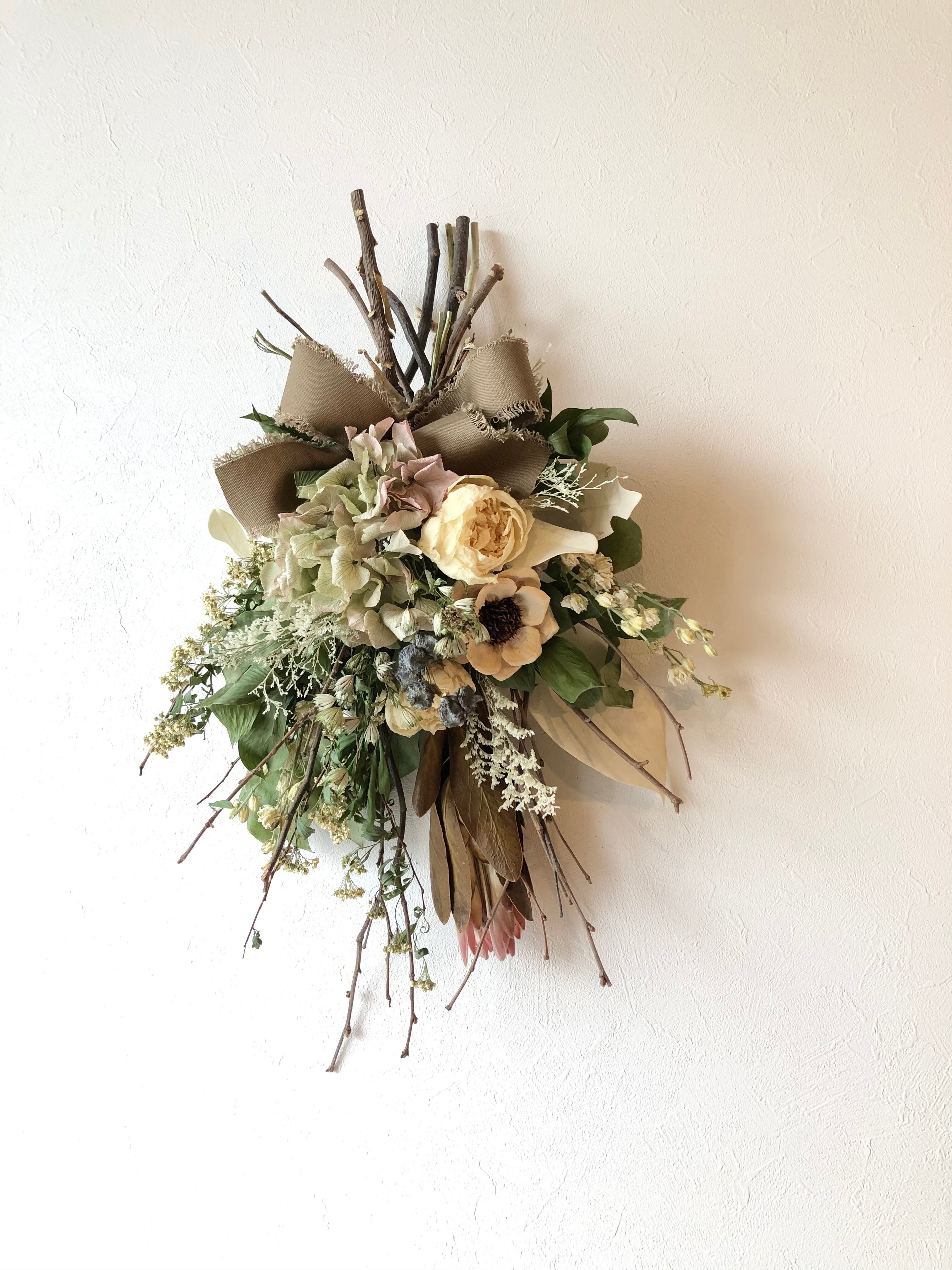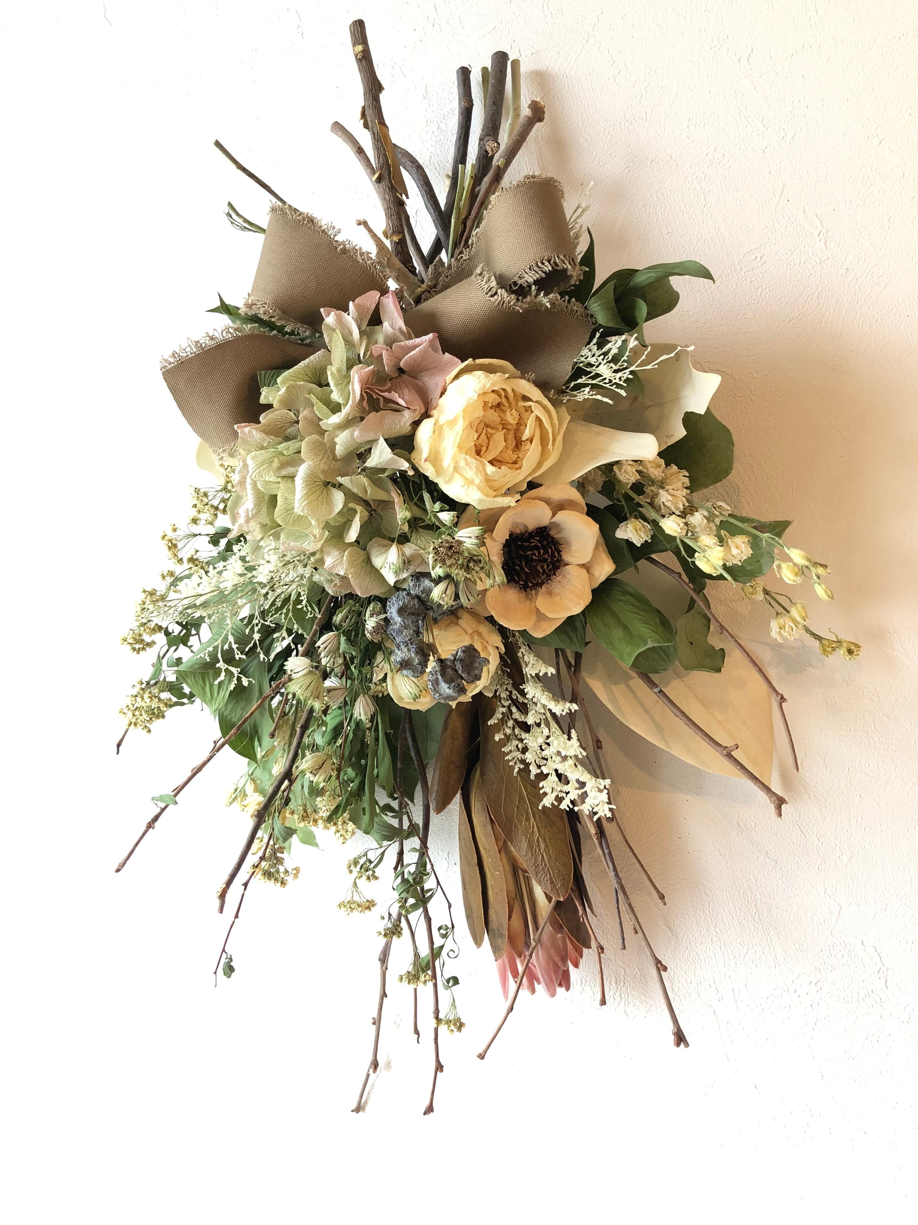 ピンクコンパクタが目を引くスワッグ。白のシャクヤク、パインフラワー、コデマリなど涼やかな白系の花材をたっぷりと入れたスワッグ。ユーカリの実やアストランティアなどの小花がなんとも可愛い花合わせ。