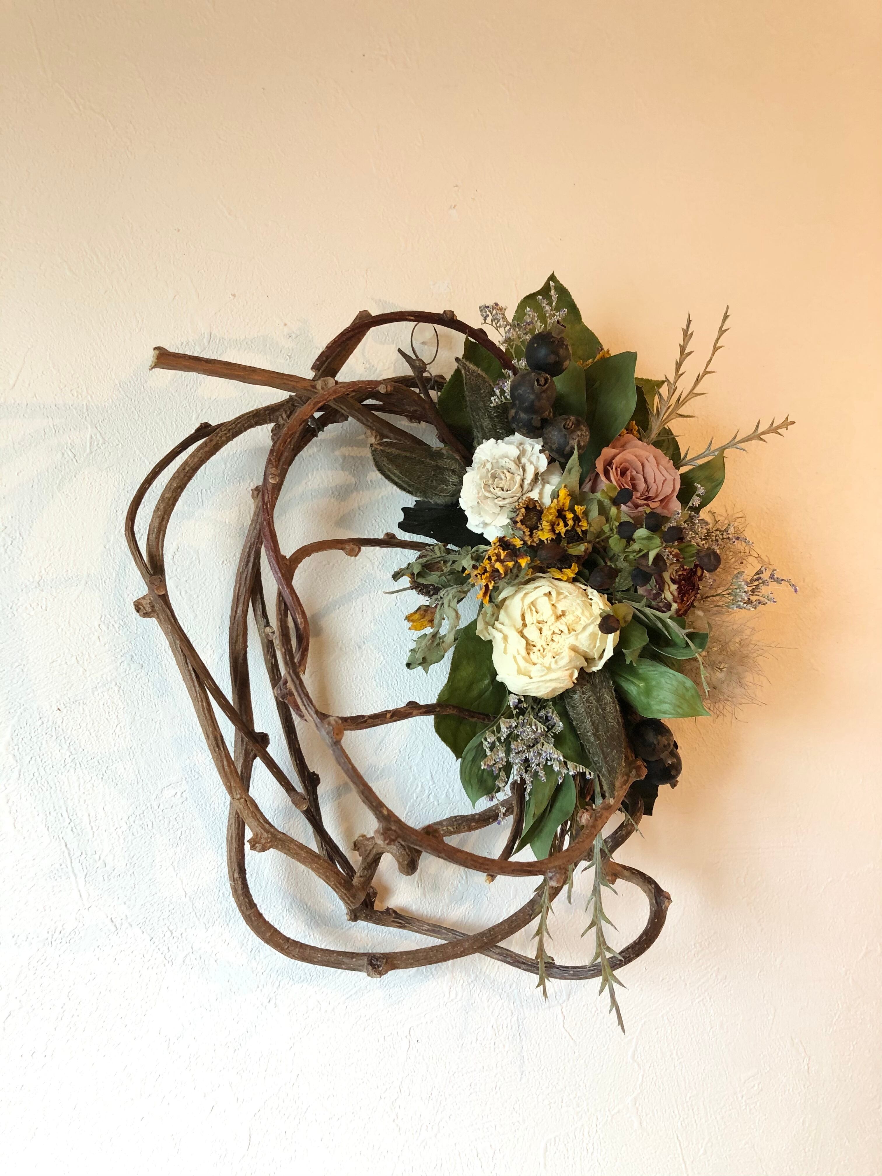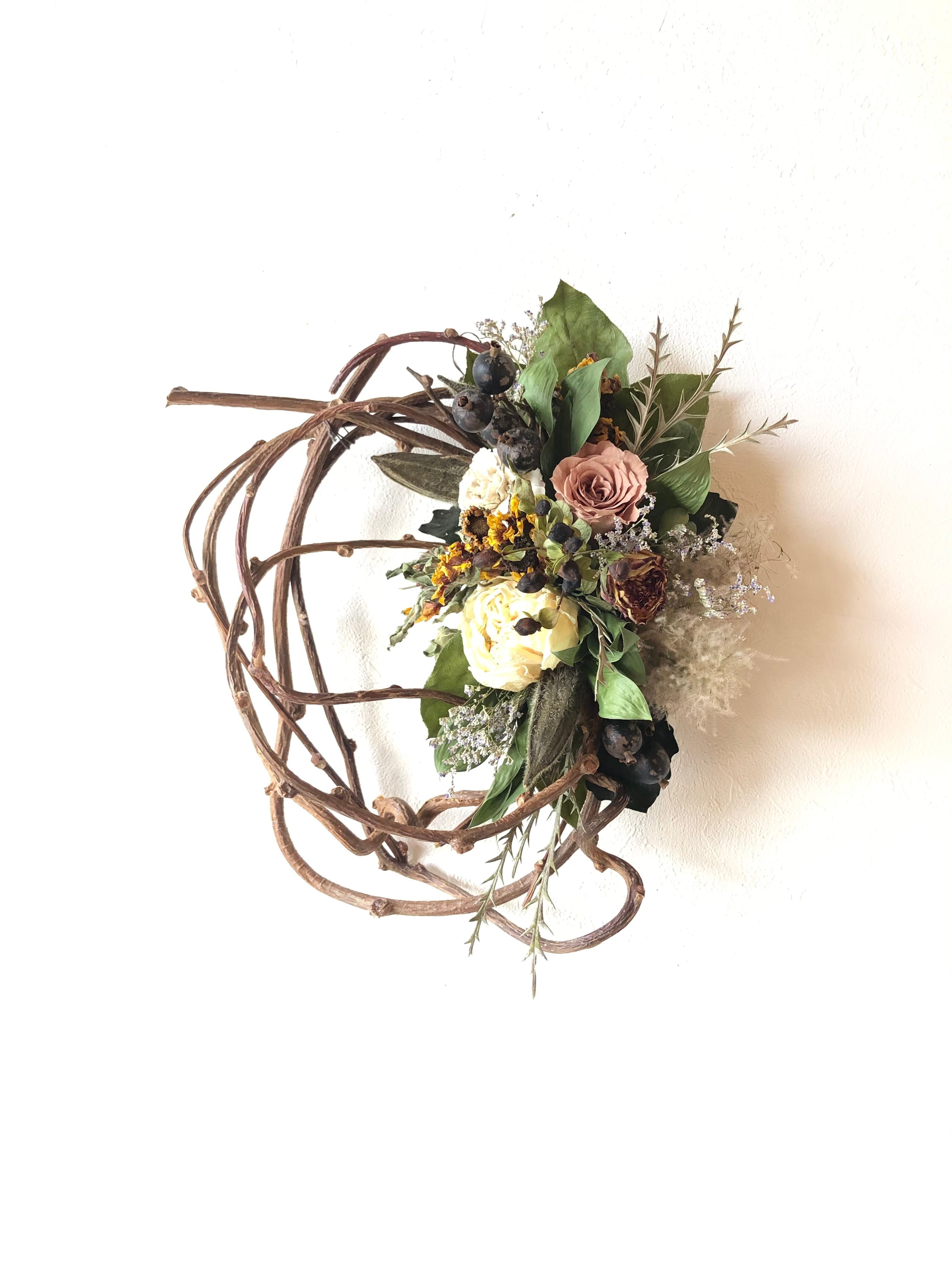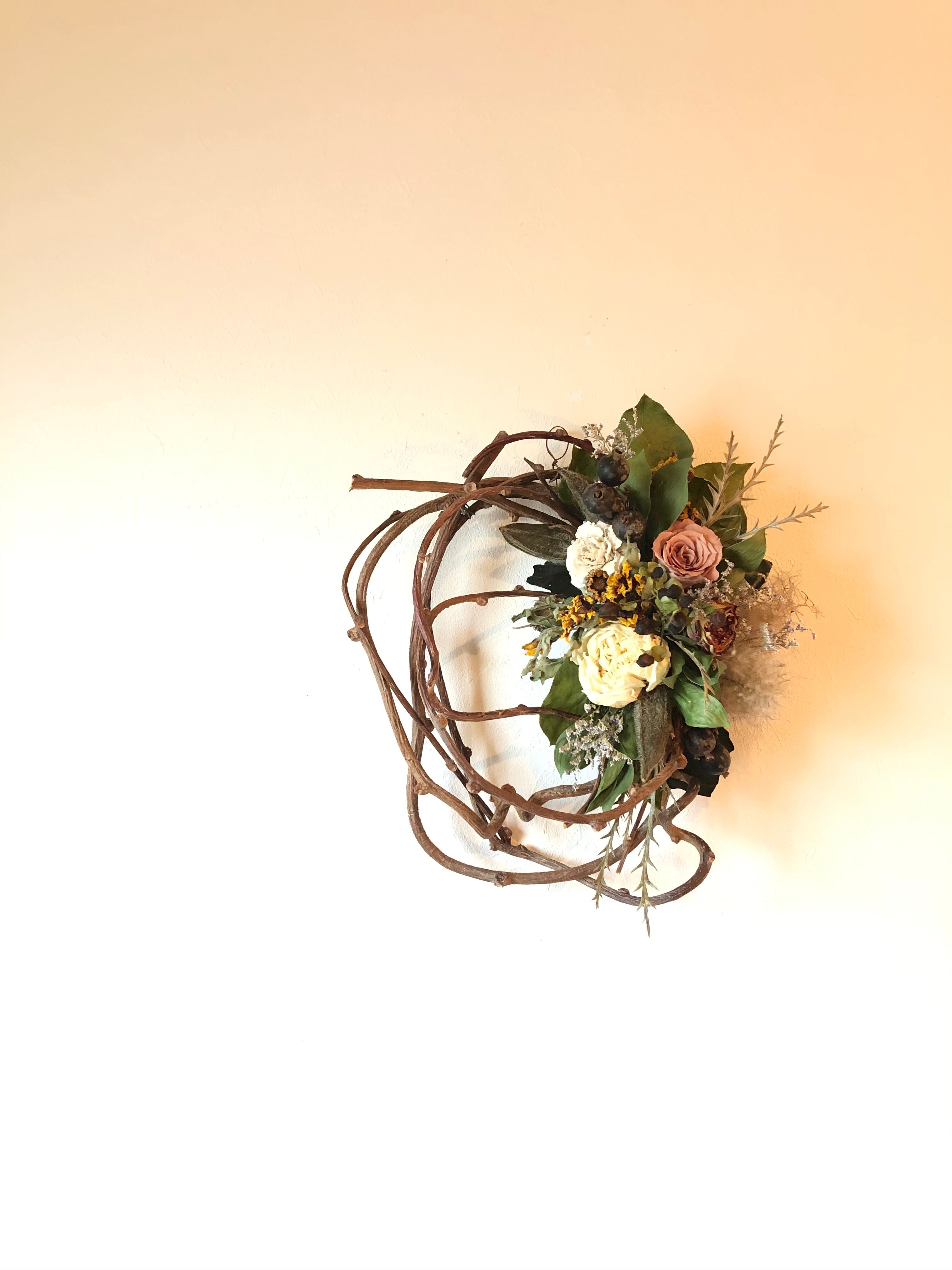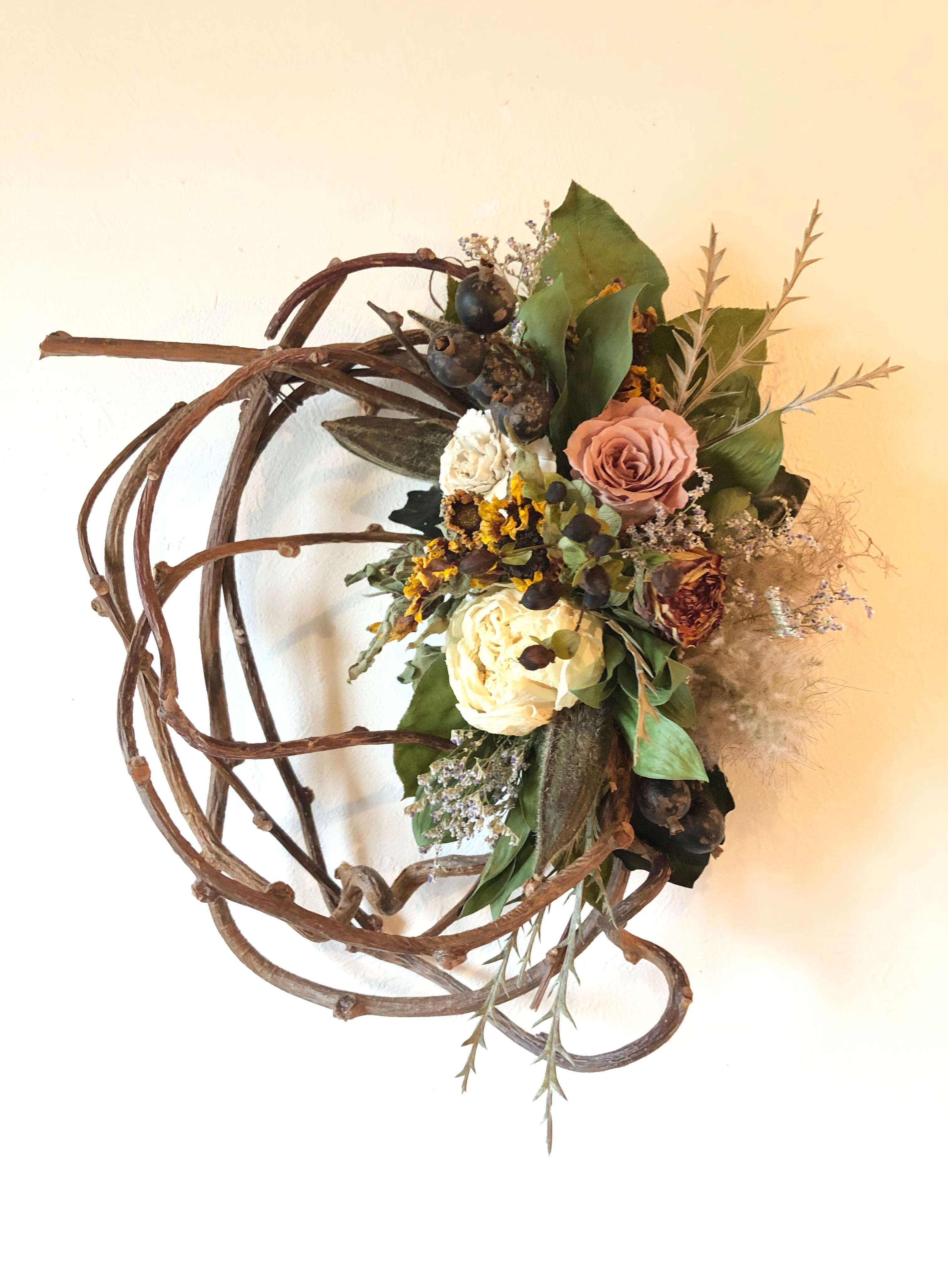 シックなベージュのバラに合わせて落ち着いたオレンジ系の花材を入れた、初秋色のキウイヅルリース。