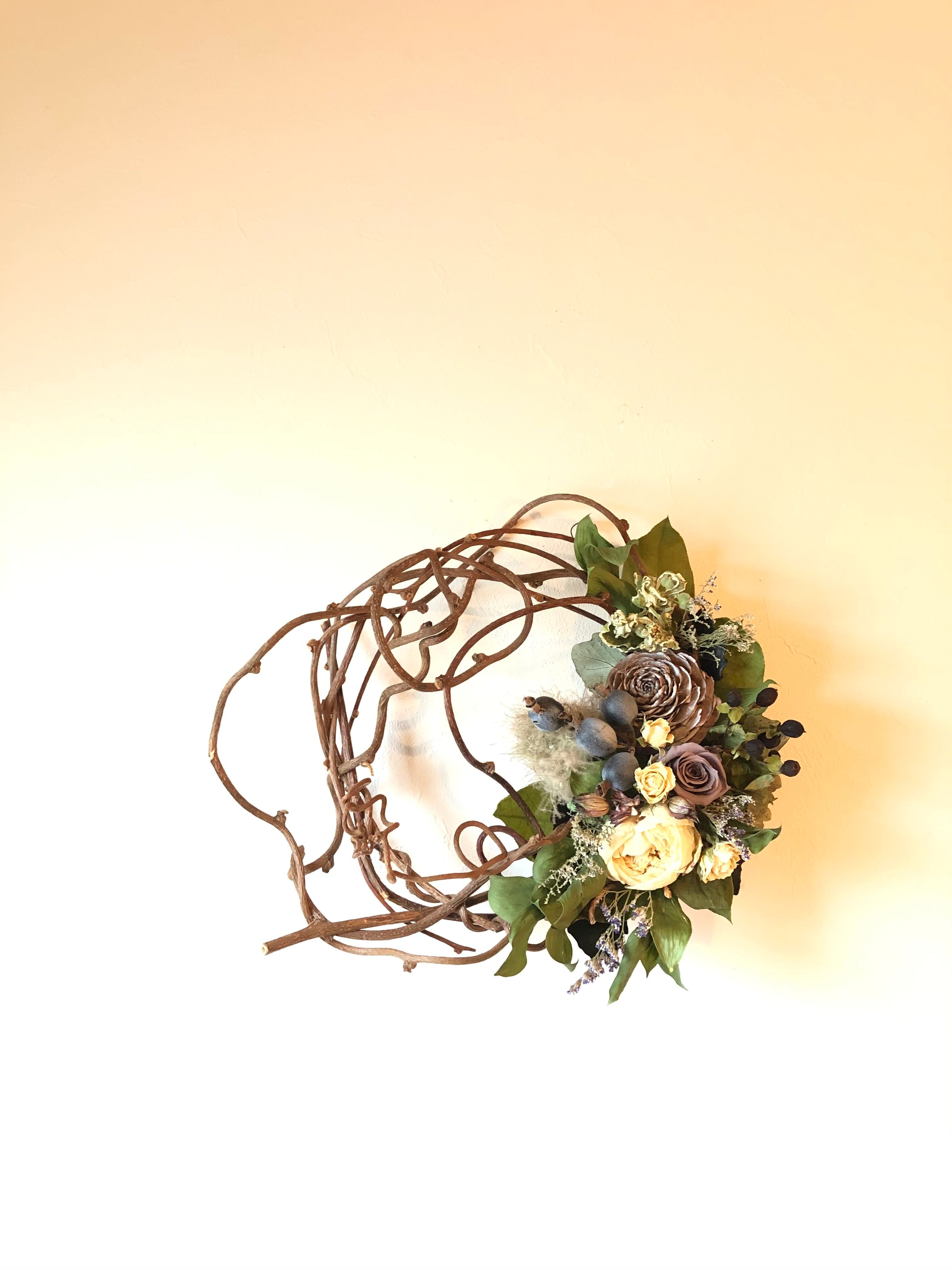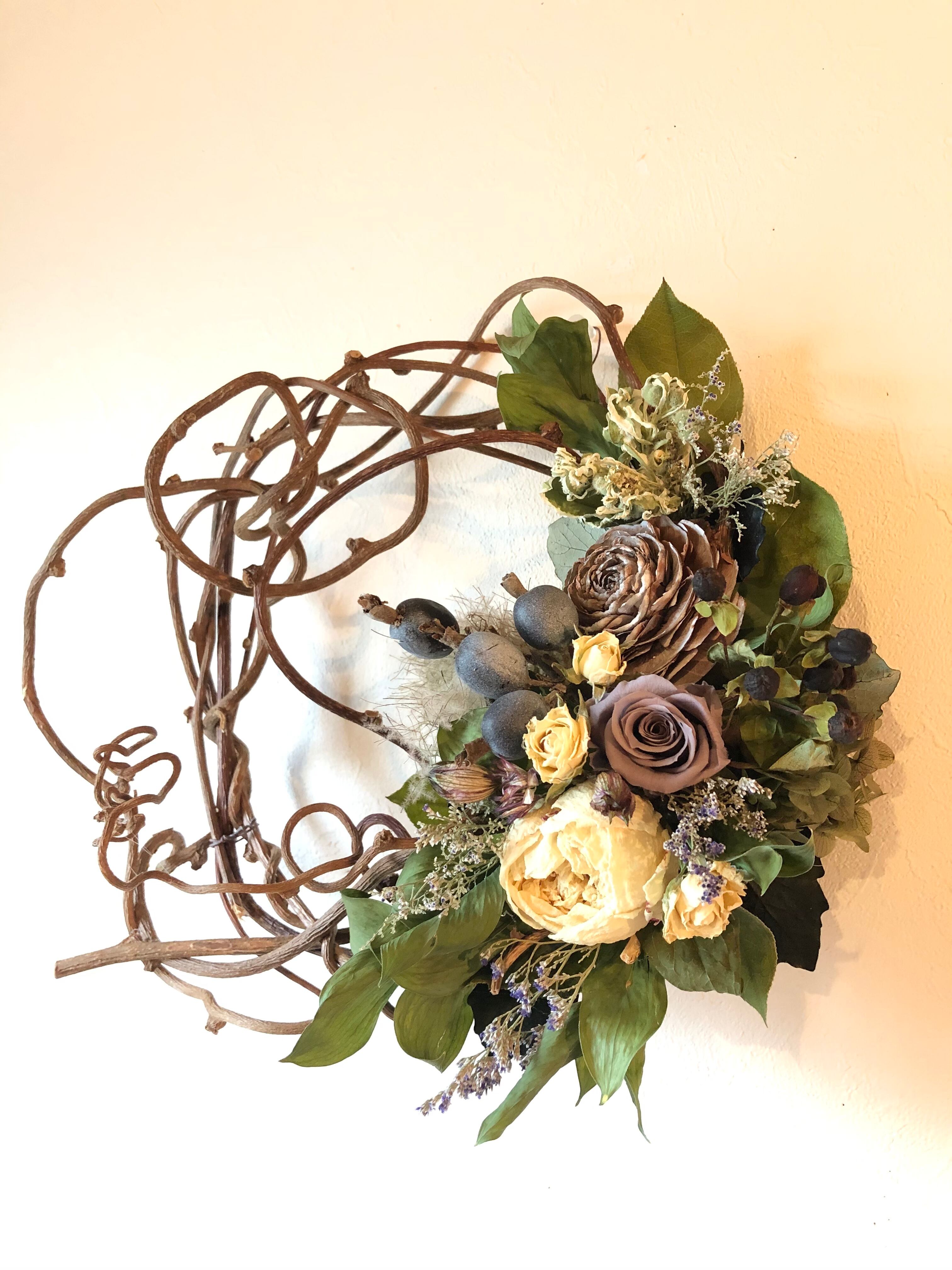 スモークツリーも入ってボリューム感もあるキウイヅルリース。