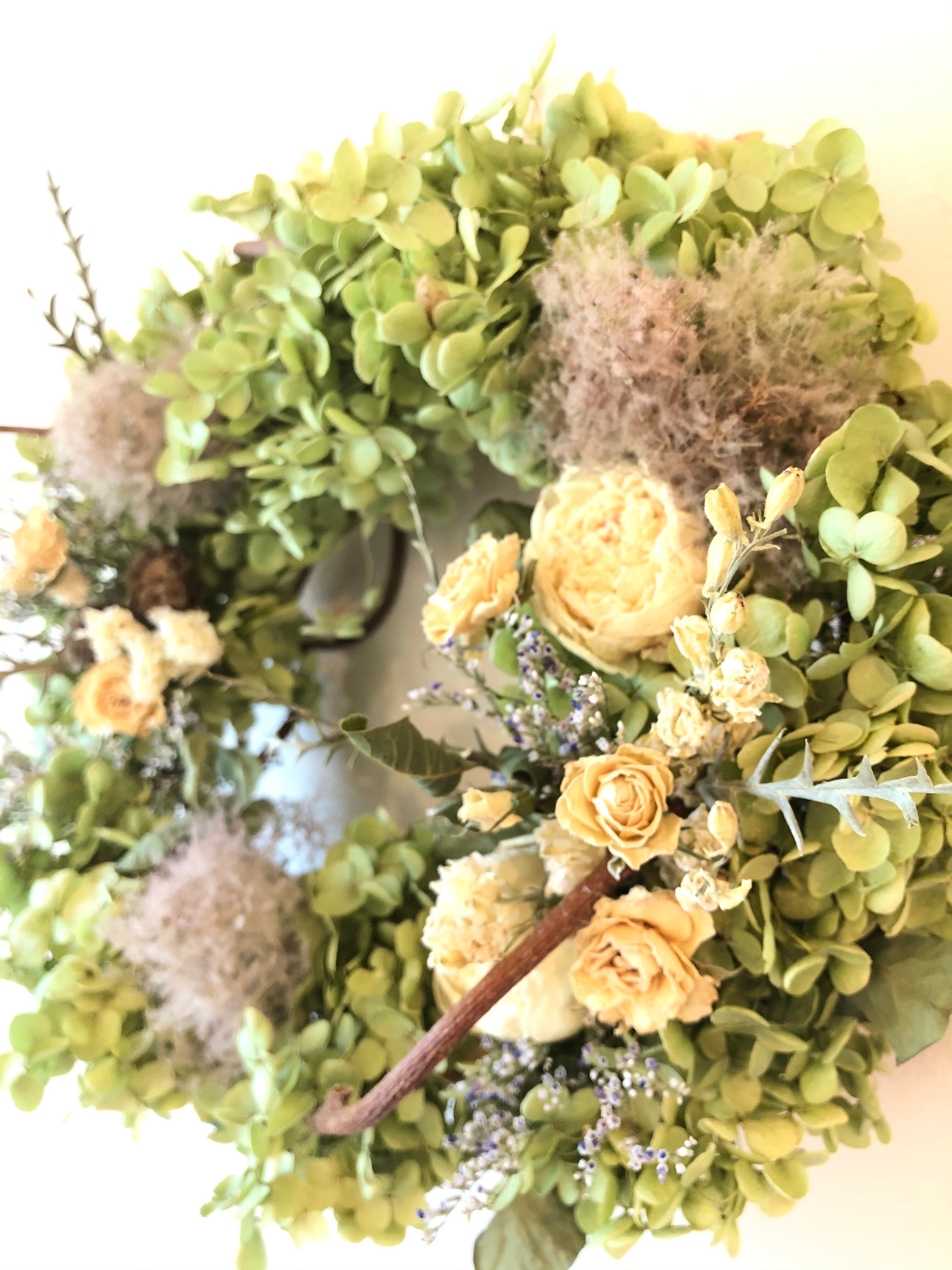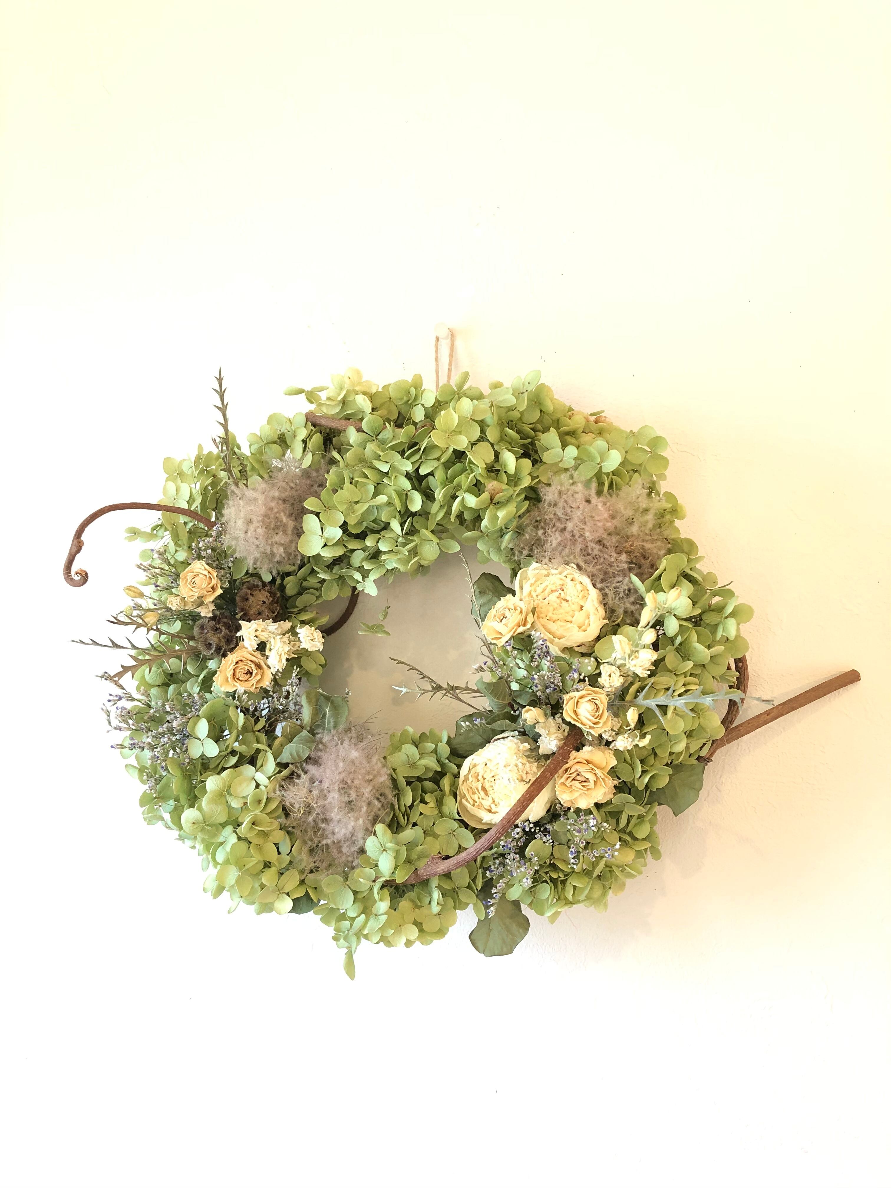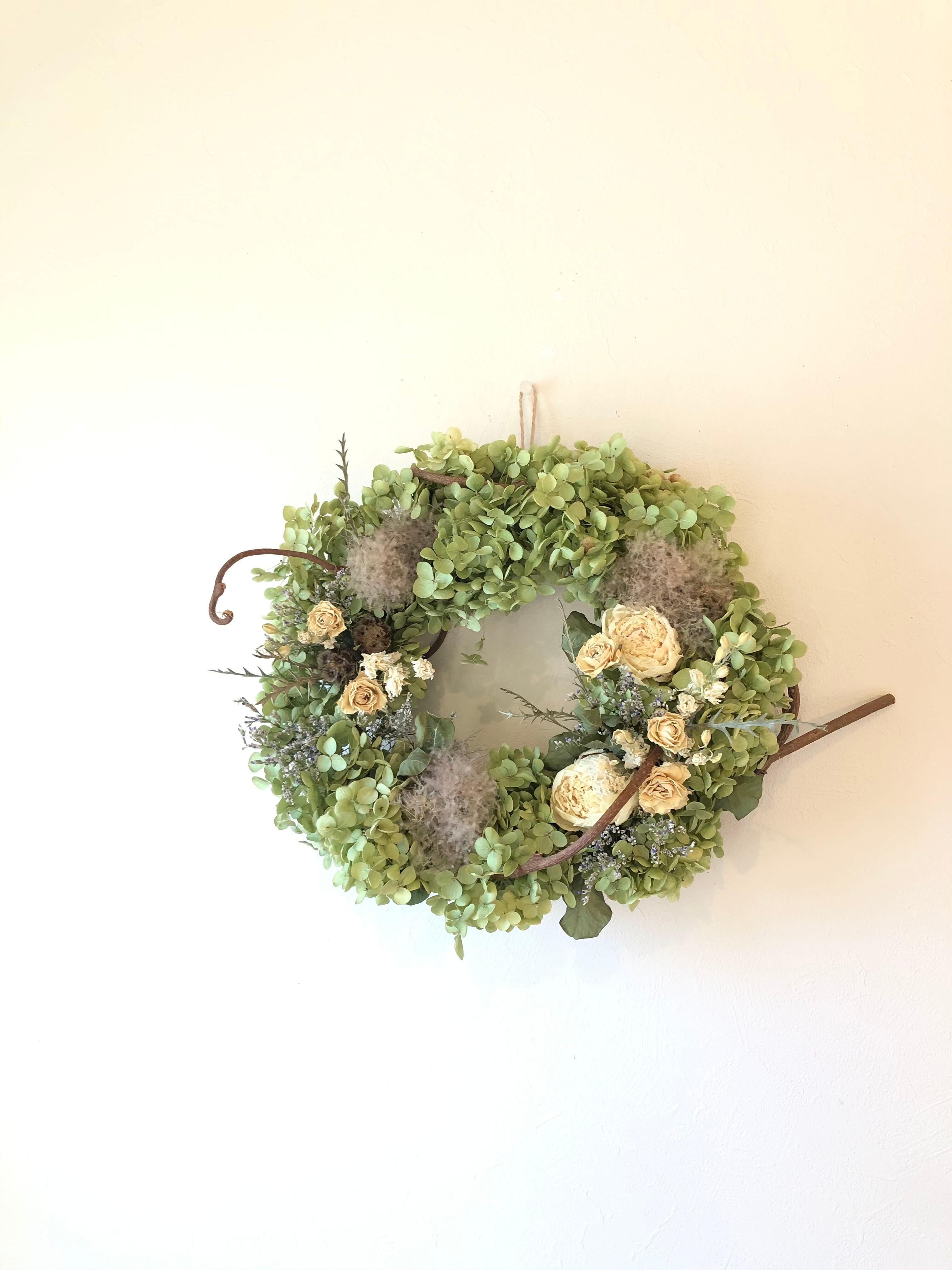 シンプルながら存在感のあるアナベルリース。ライトグリーンのアナベルに、白のシャクヤクやスモークツリーなど、飽きのこない色合いです。