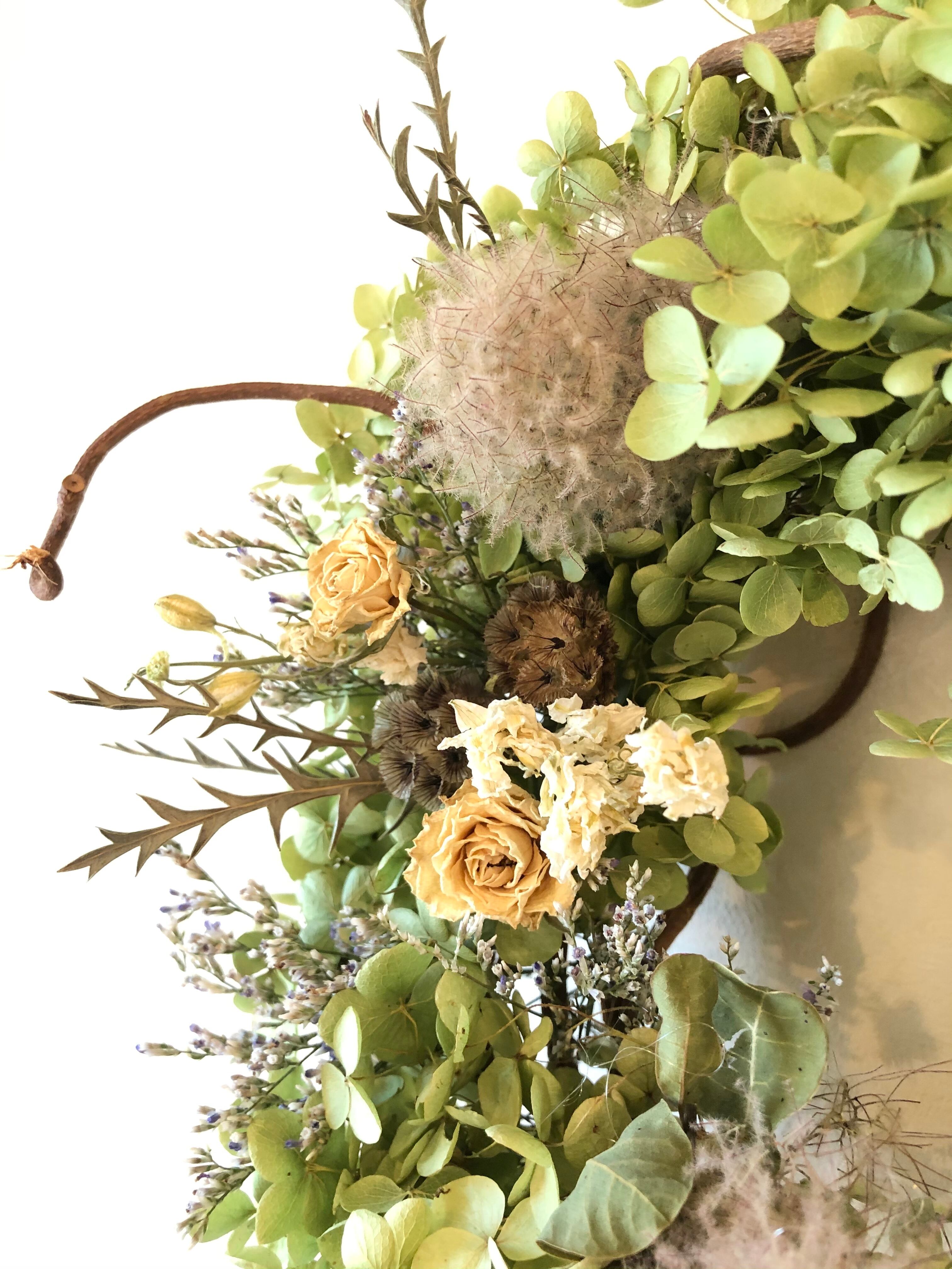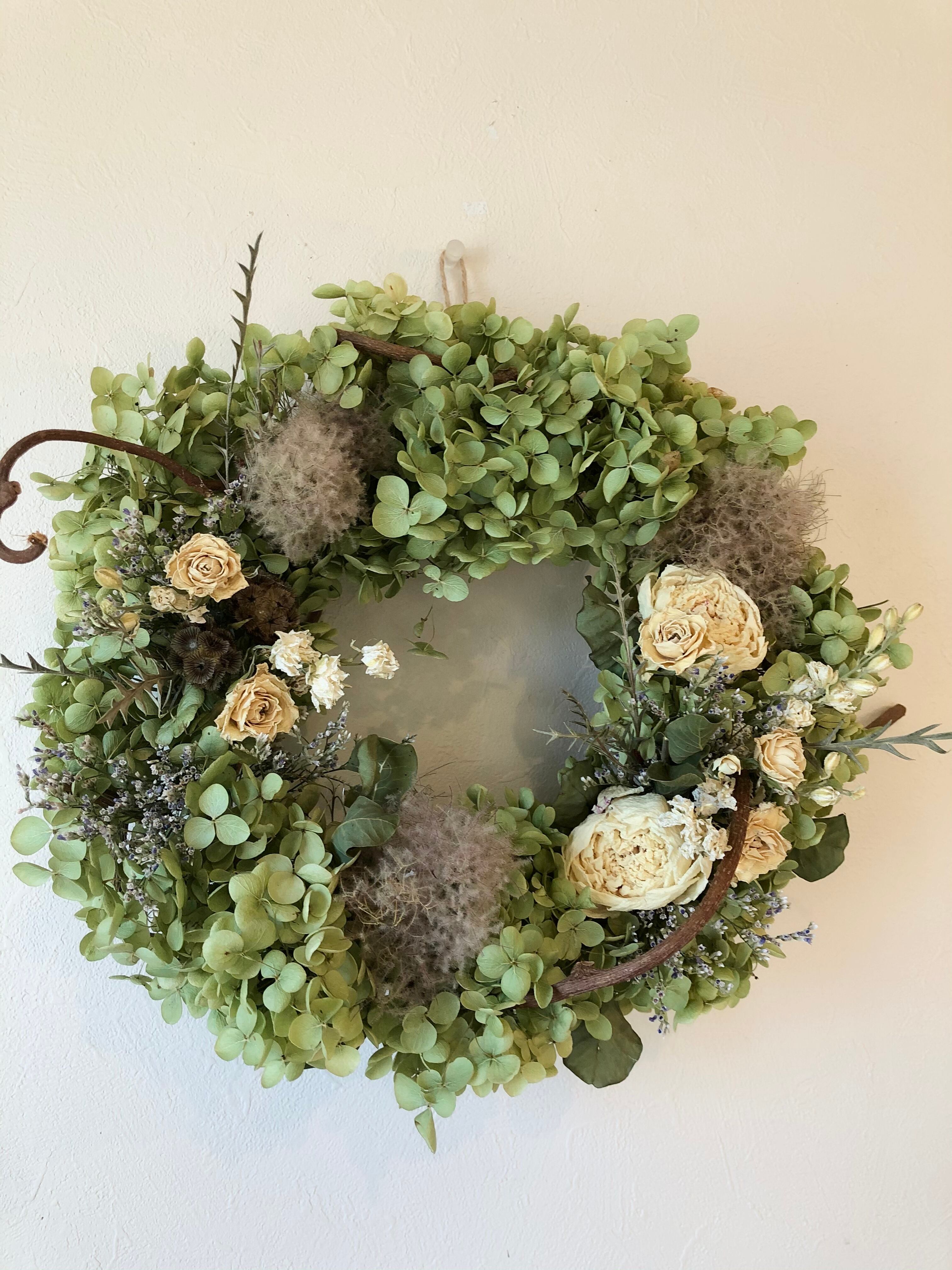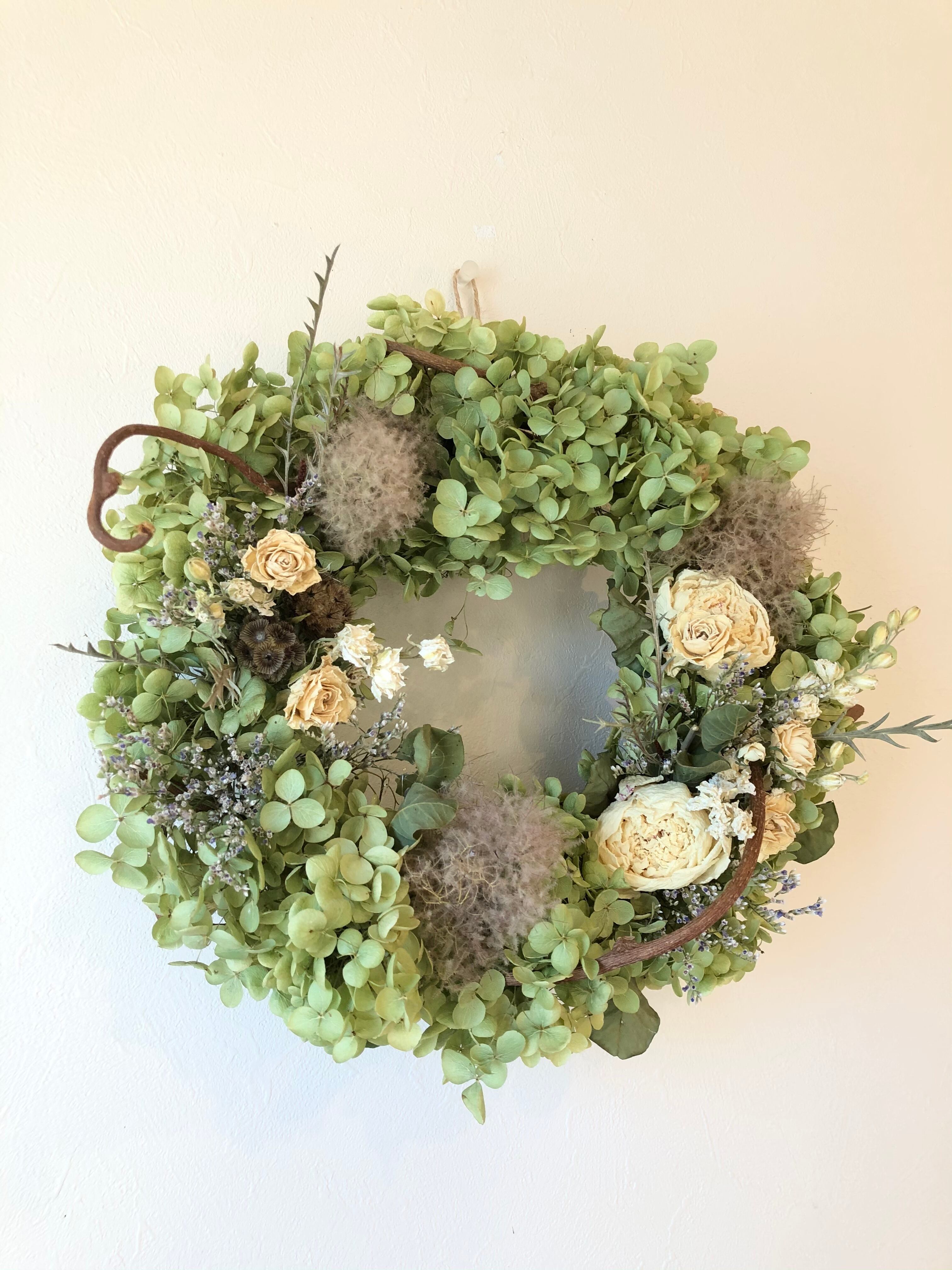 シンプルながら存在感のあるアナベルリース。ライトグリーンのアナベルに、白のシャクヤクやスモークツリーなど、飽きのこない色合いです。