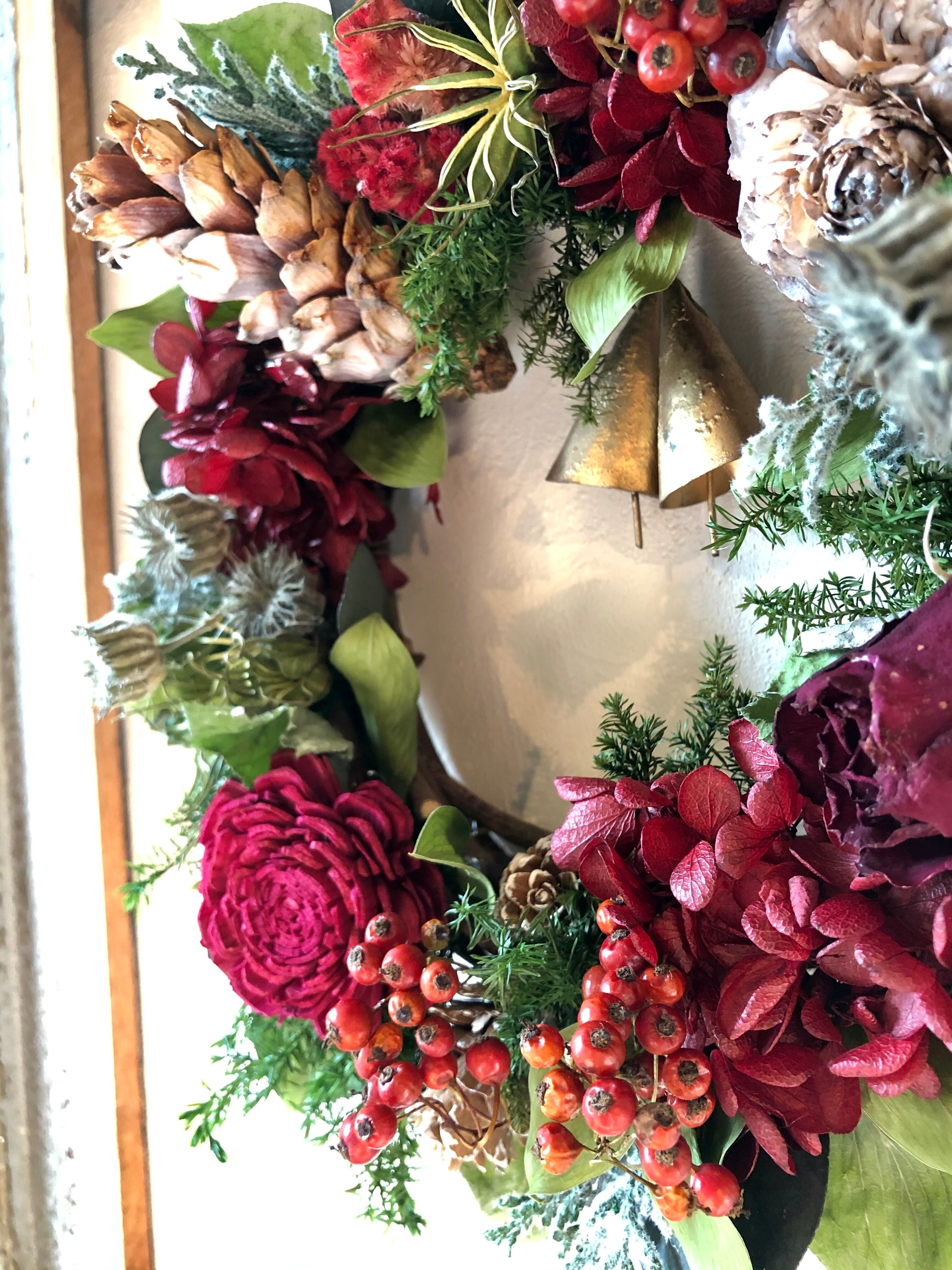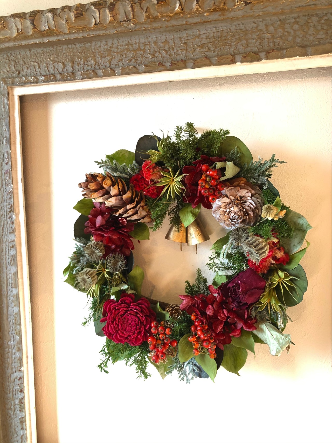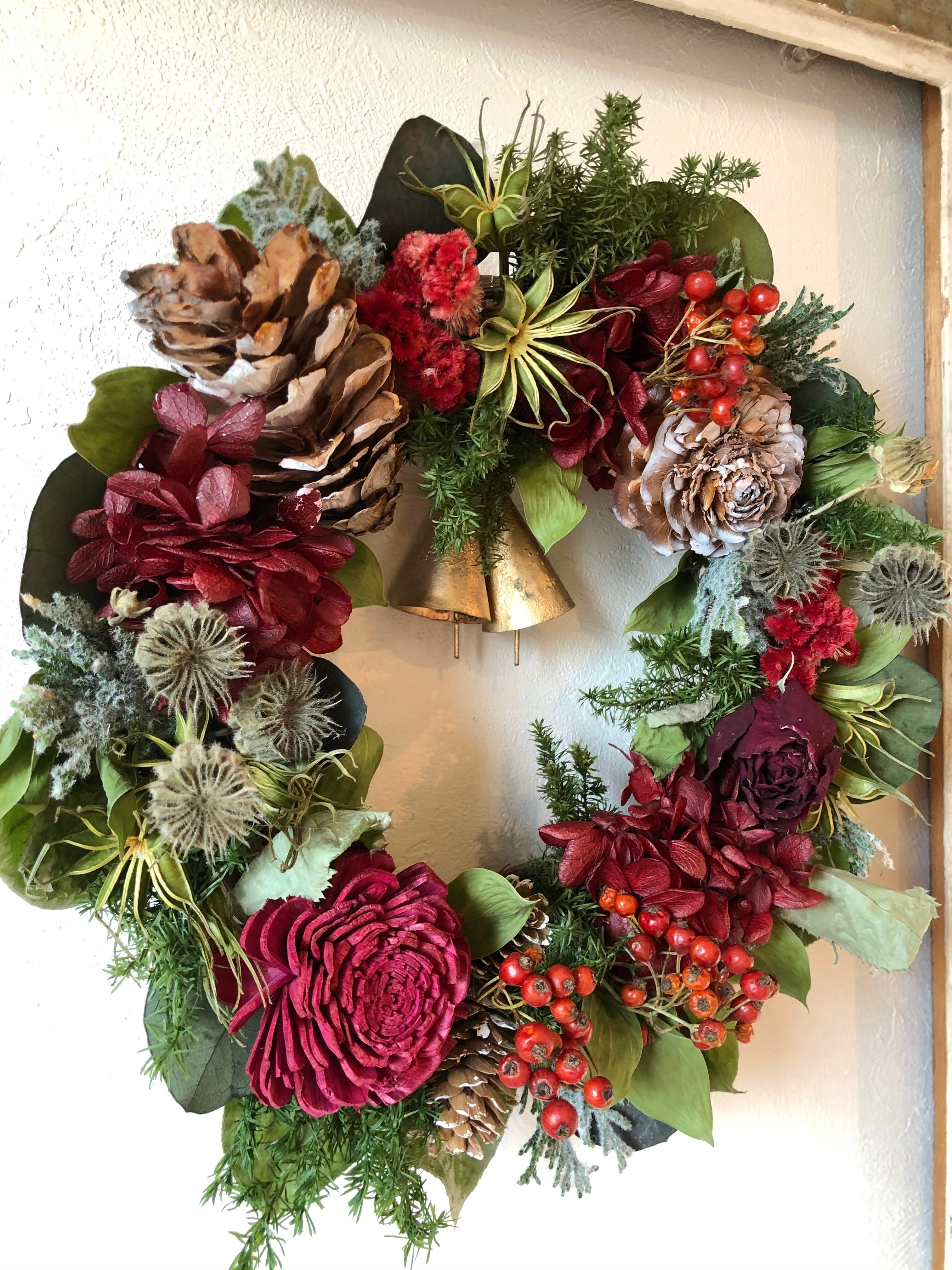 ケイトウや野ばらの実、松ぼっくりなど、クリスマスの花材をふんだんにたっぷり使ったクリスマスリース。小さな三角のミニベルを2つつけた可愛らしいクリスマスリースです。