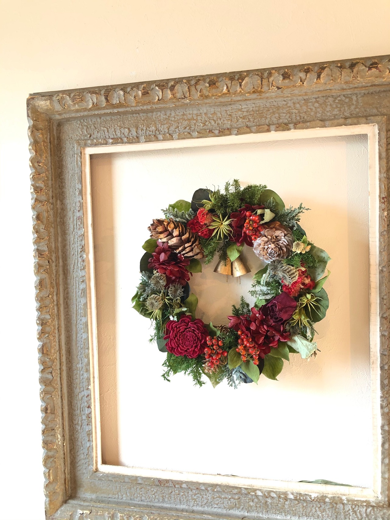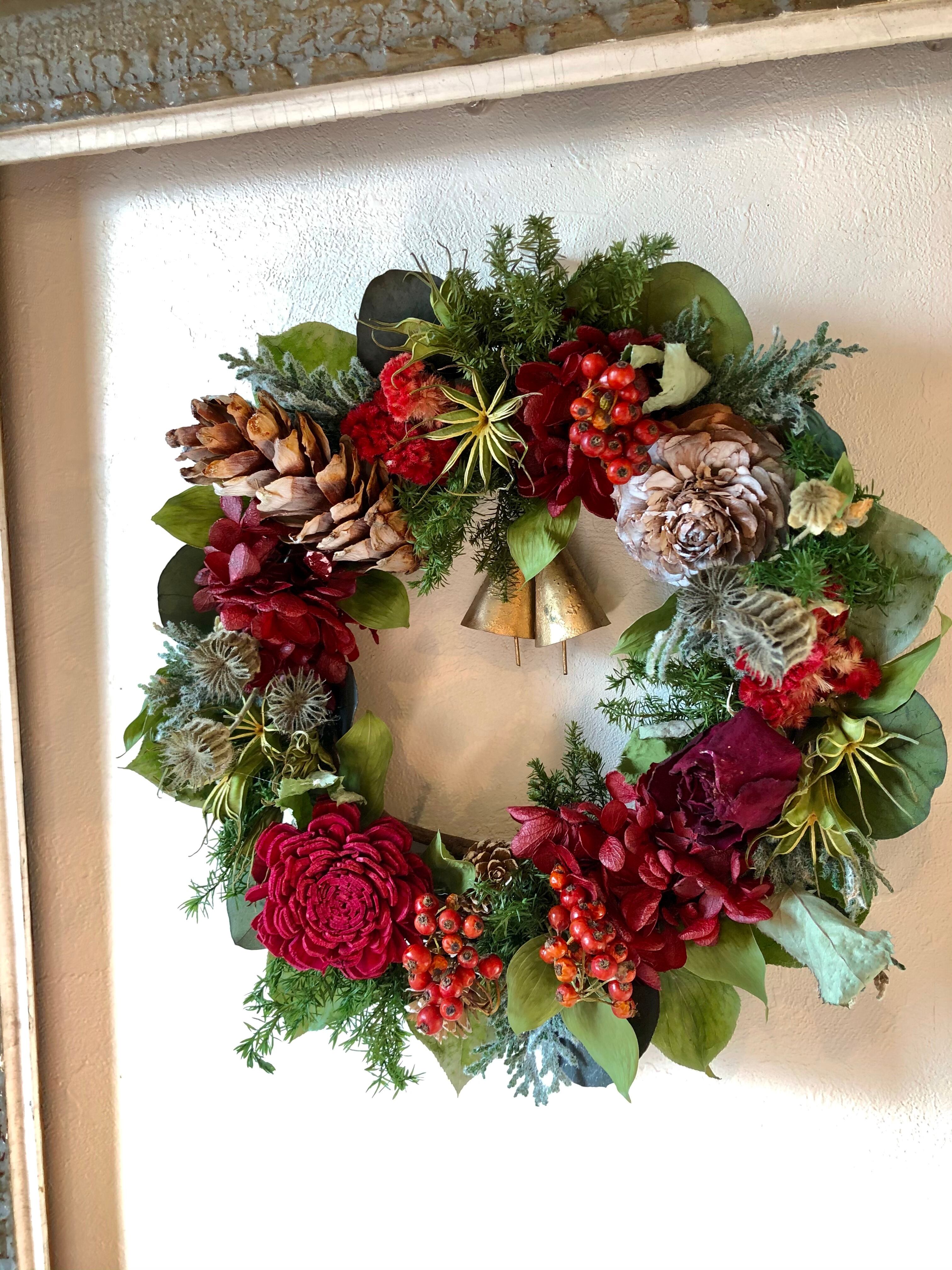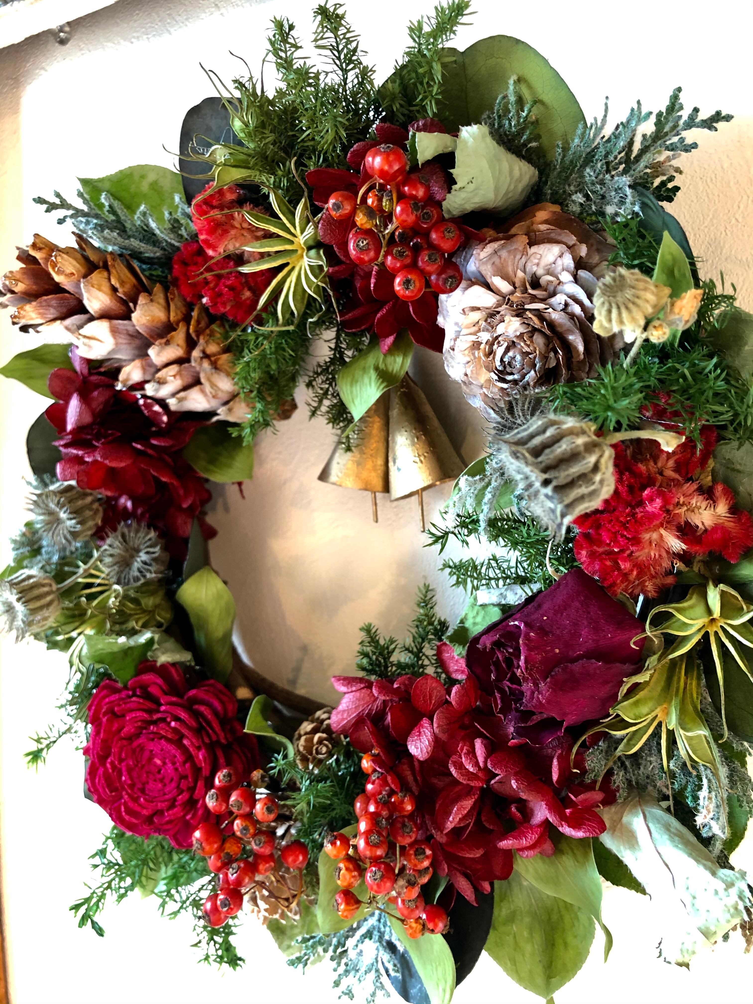 ケイトウや野ばらの実、松ぼっくりなど、クリスマスの花材をふんだんにたっぷり使ったクリスマスリース。小さな三角のミニベルを2つつけた可愛らしいクリスマスリースです。