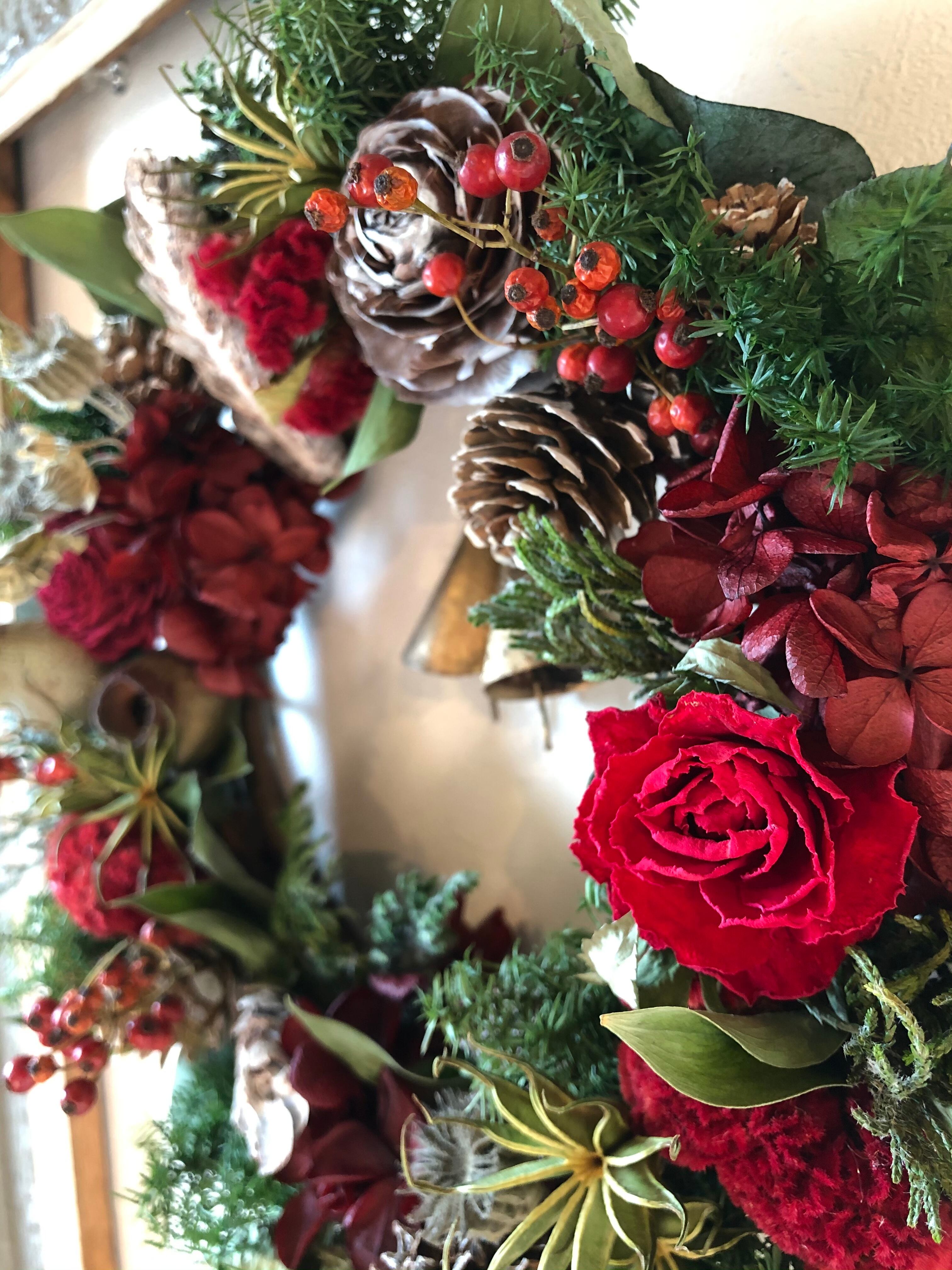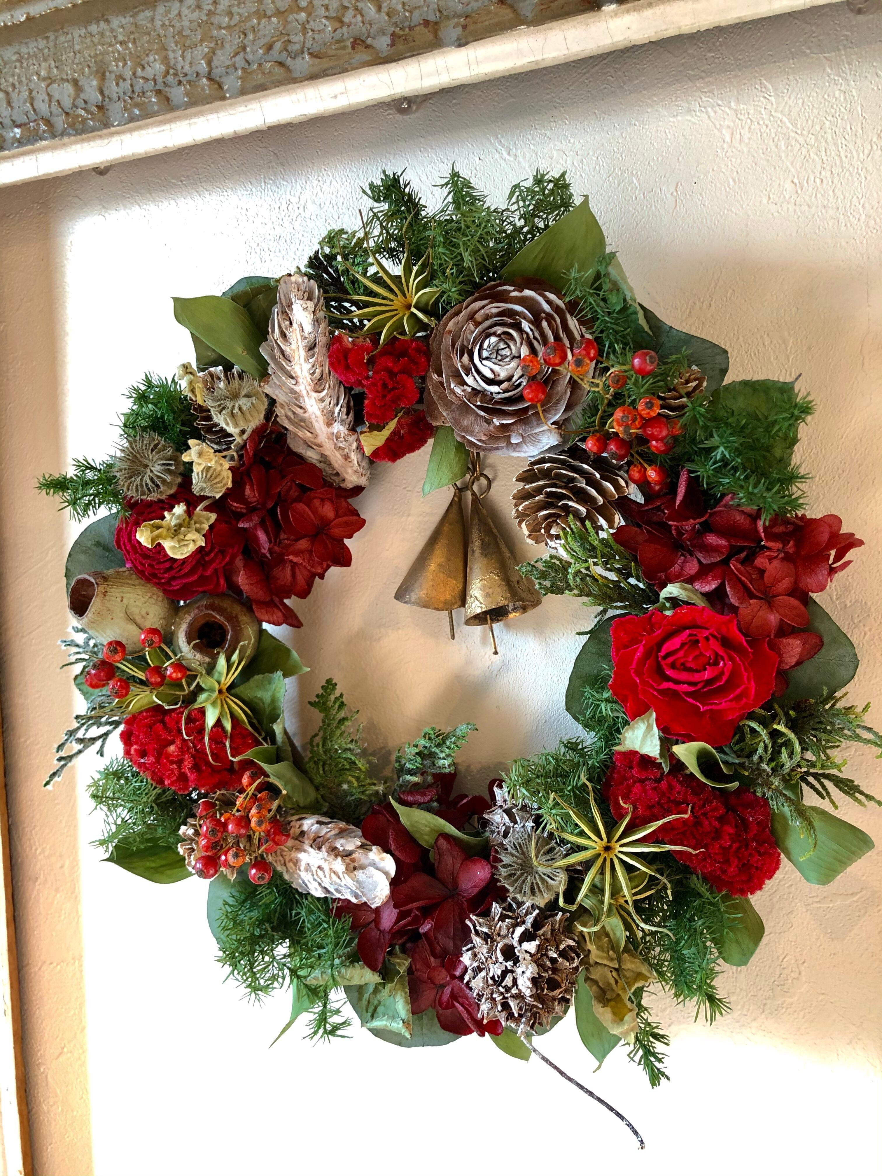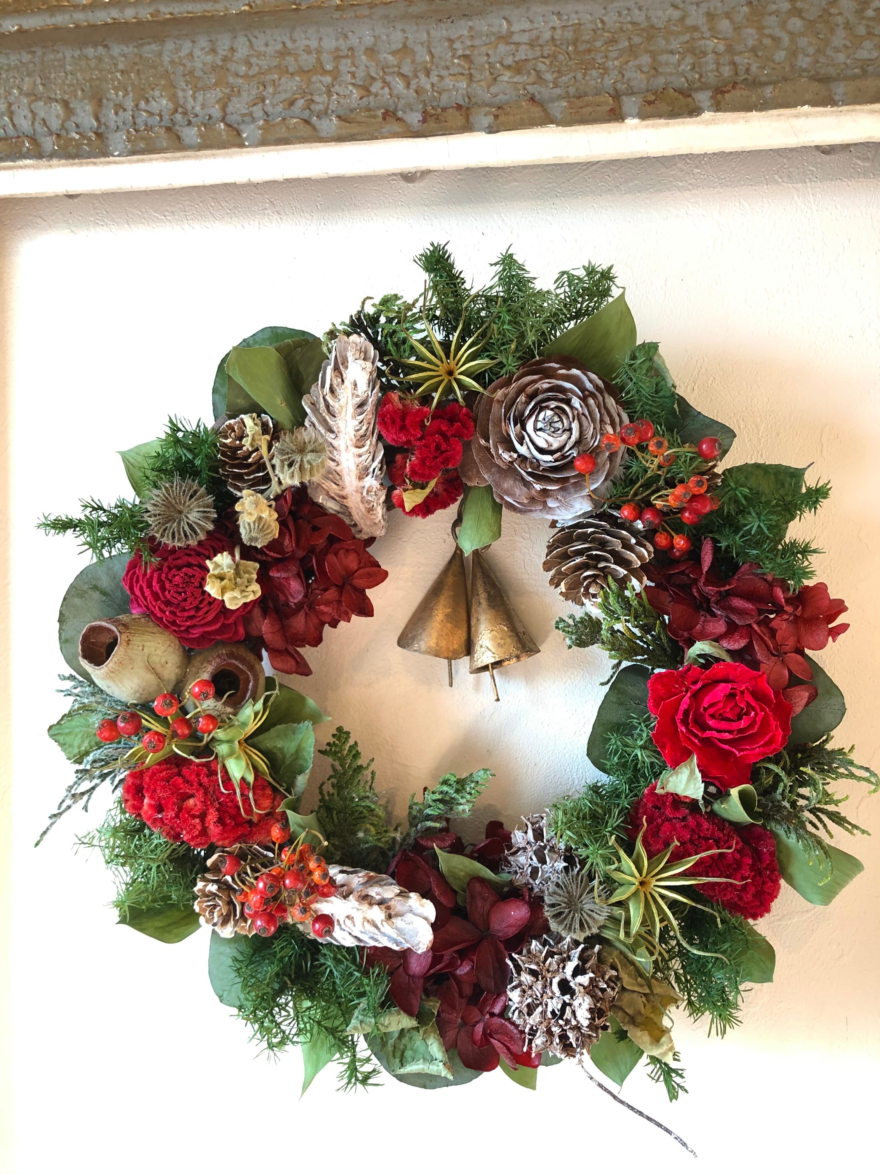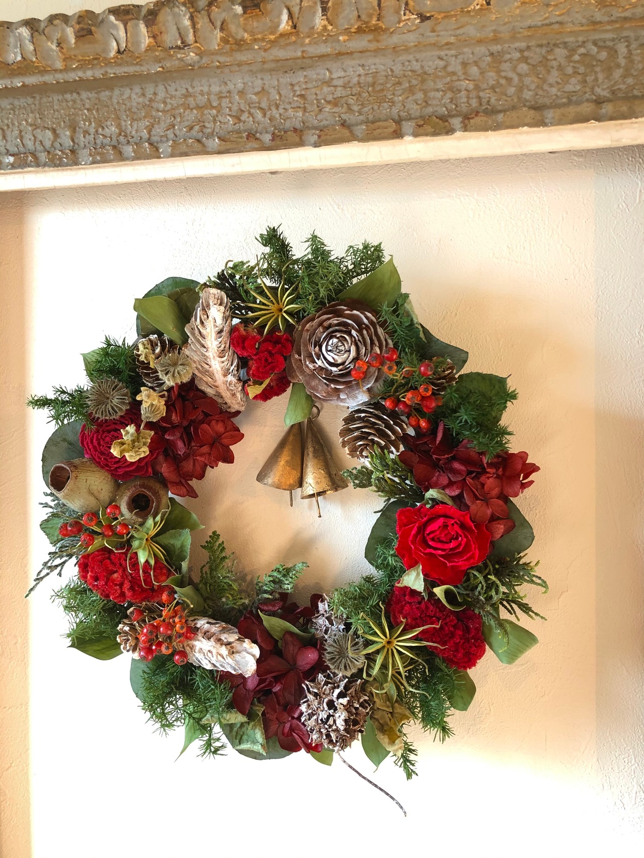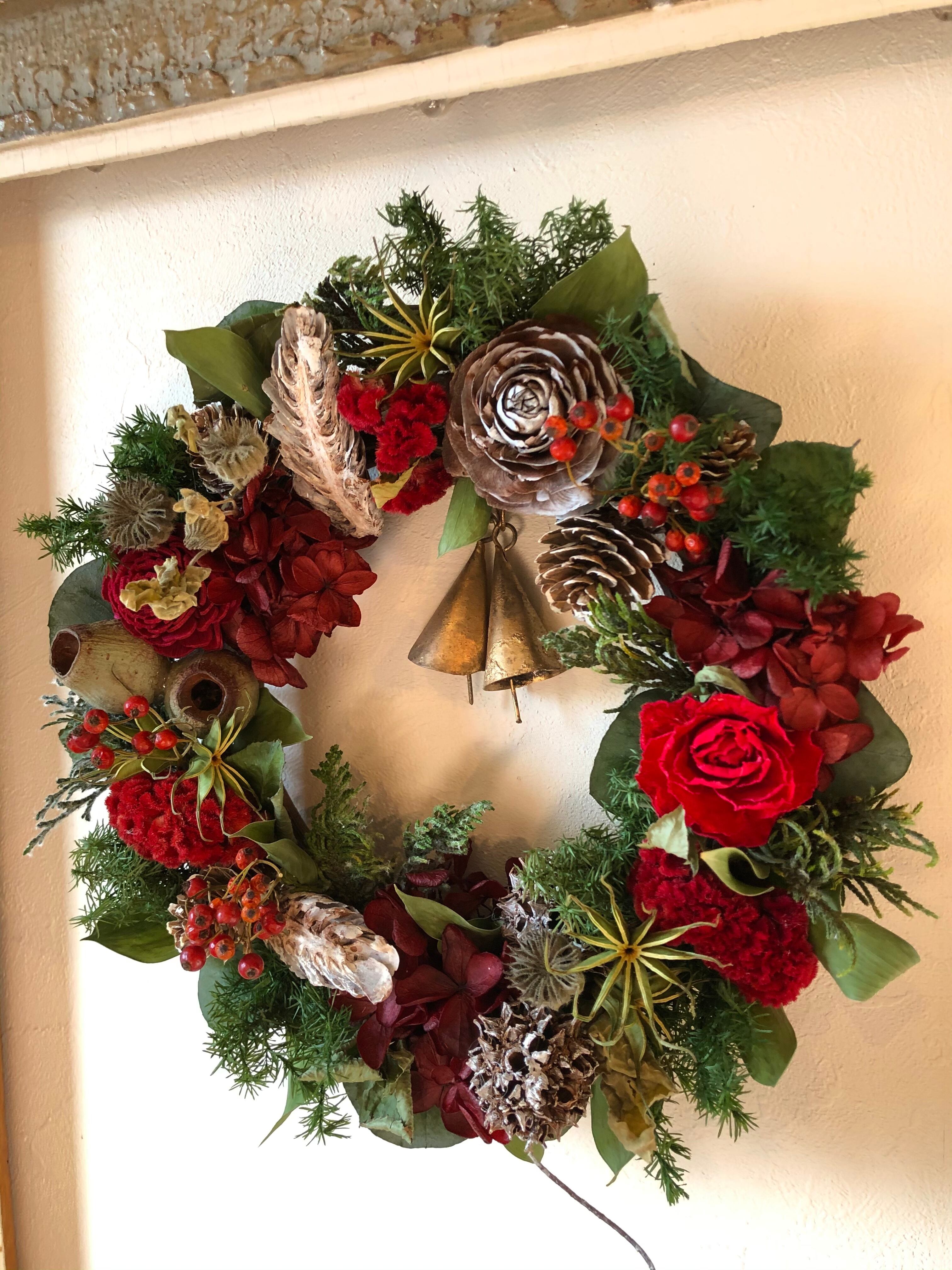 ケイトウや野ばらの実、松ぼっくりなど、クリスマスの花材をふんだんにたっぷり使ったクリスマスリース。小さな三角のミニベルを2つけた、可愛らしいクリスマスリースです。