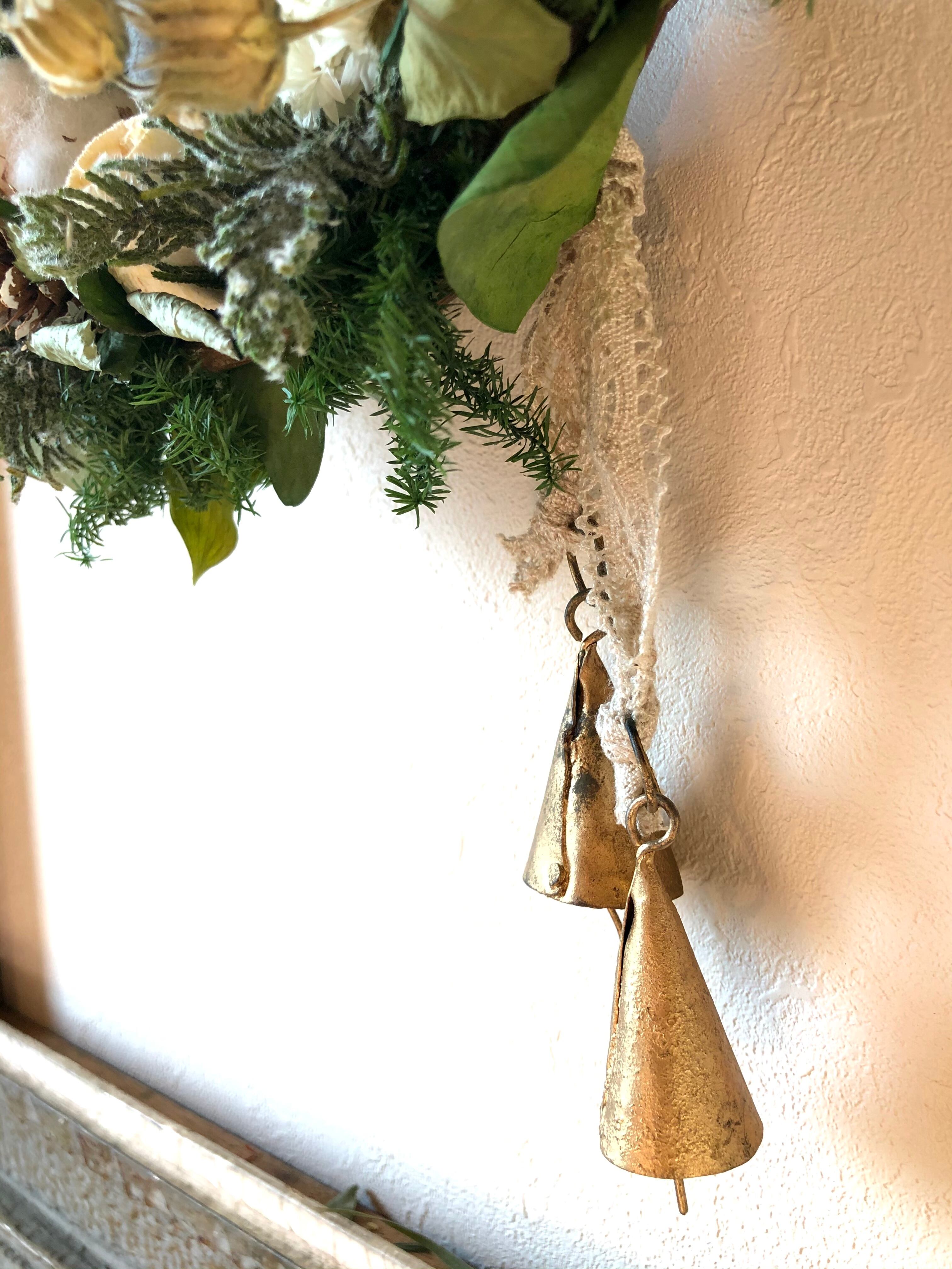 コットンのリボンでアンティーク調のミニ三角カウベルをつけました。