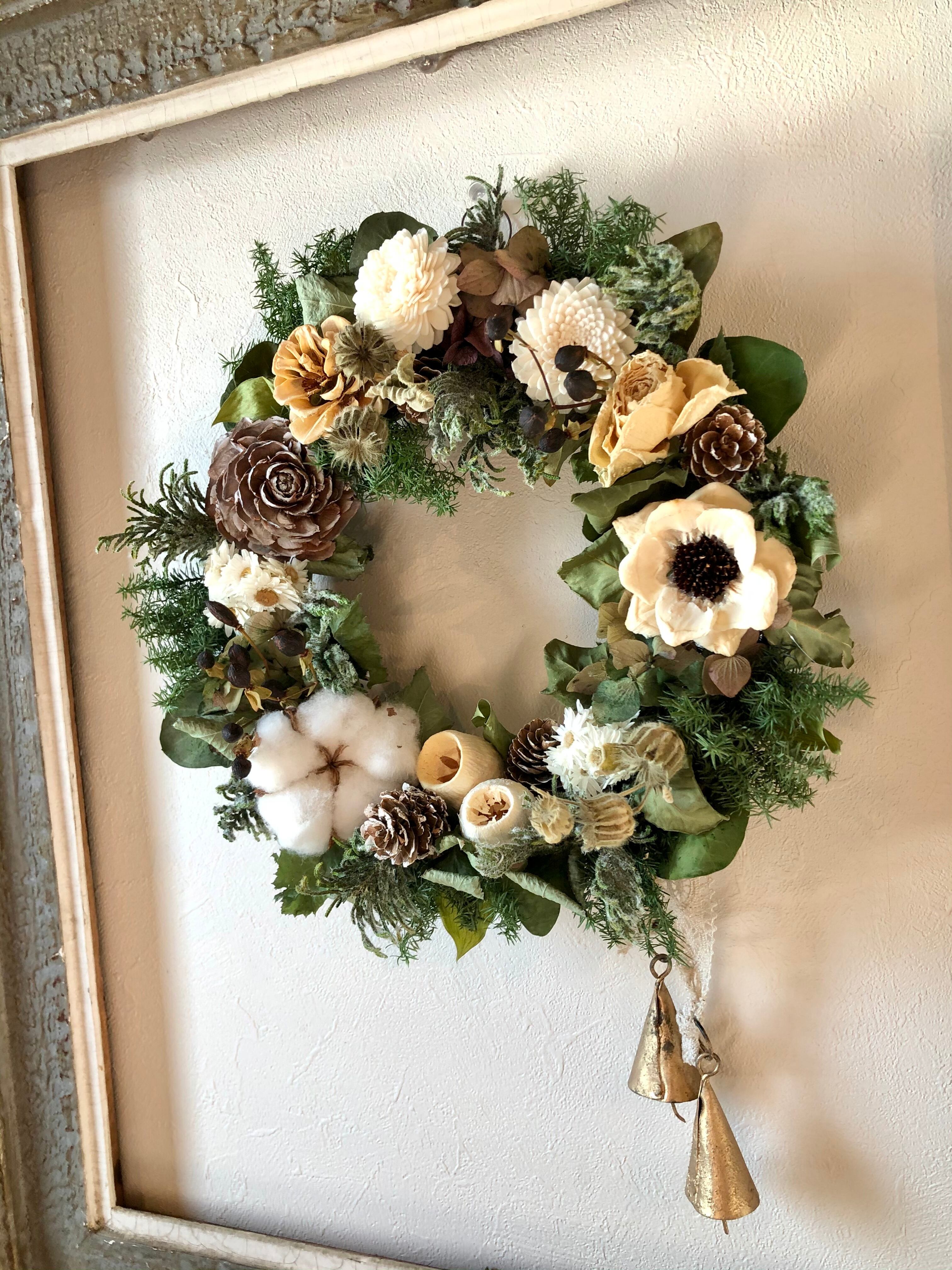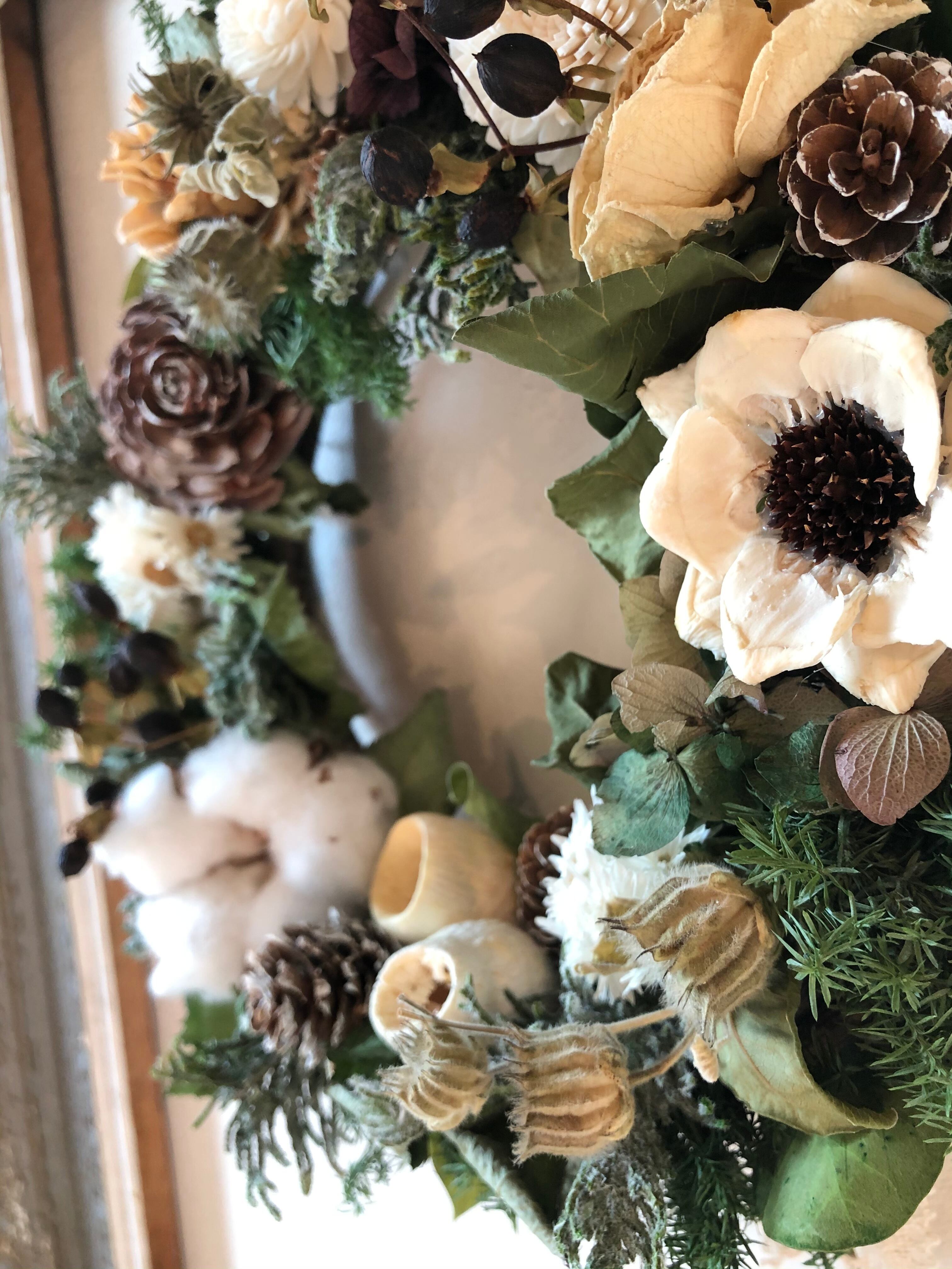 コットンや白の松ぼっくり、白のユーカリの実などを入れたシックな色合いのクリスマスリース。
