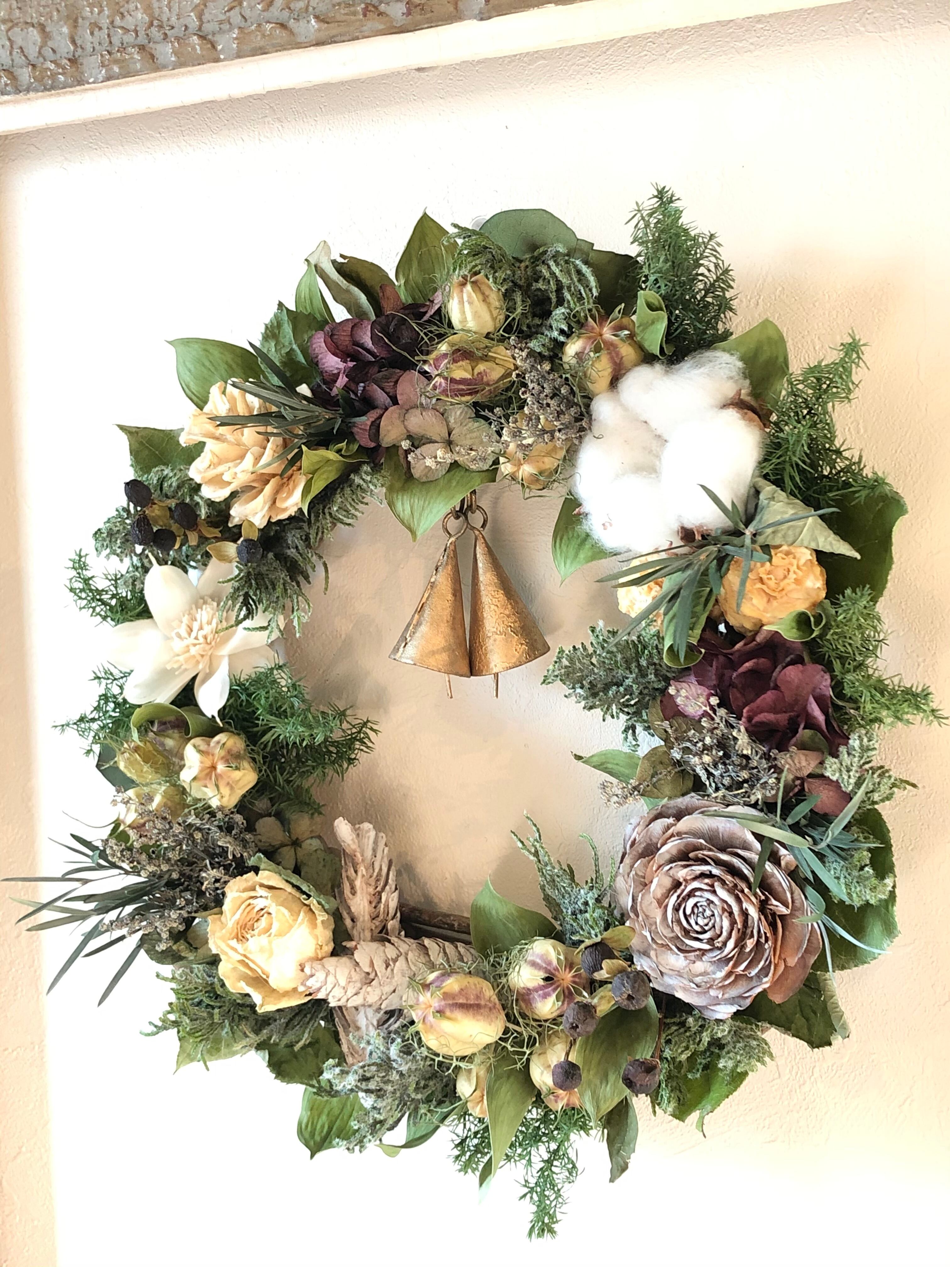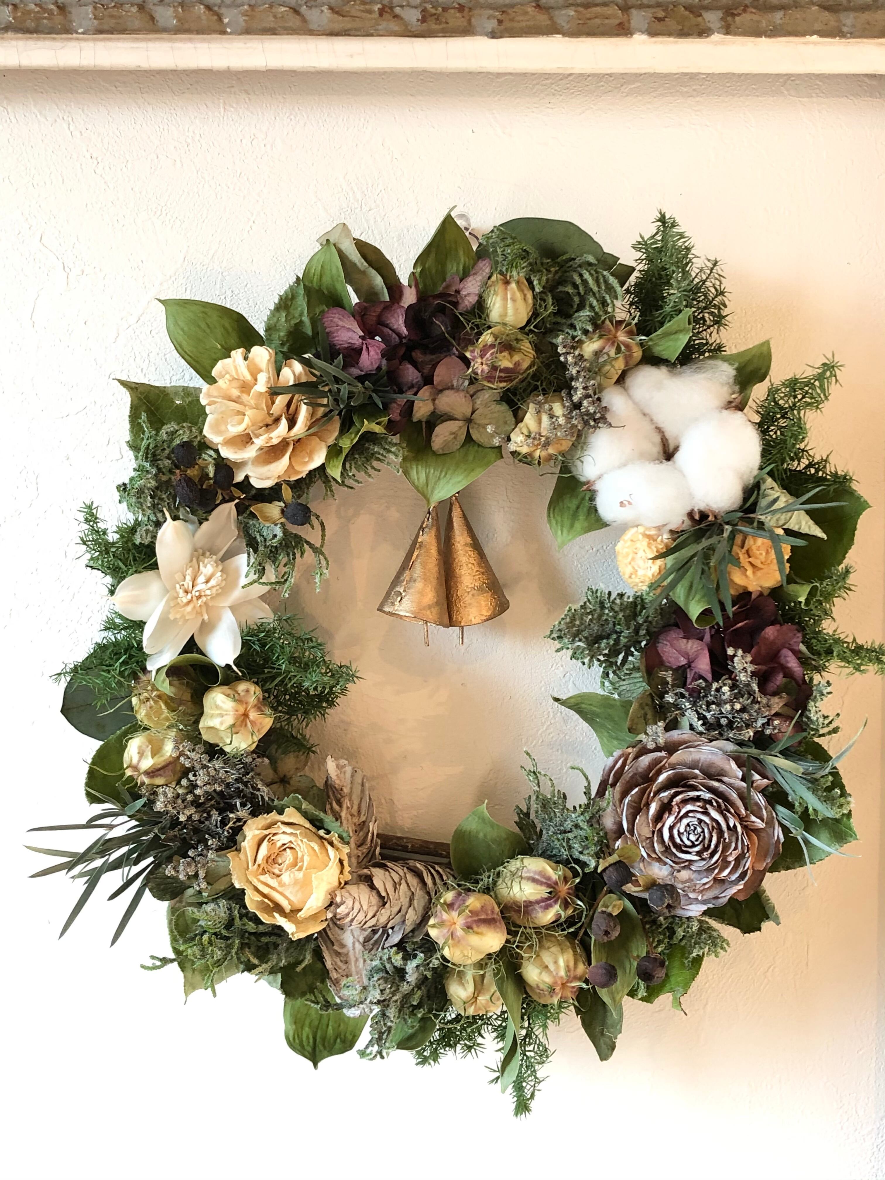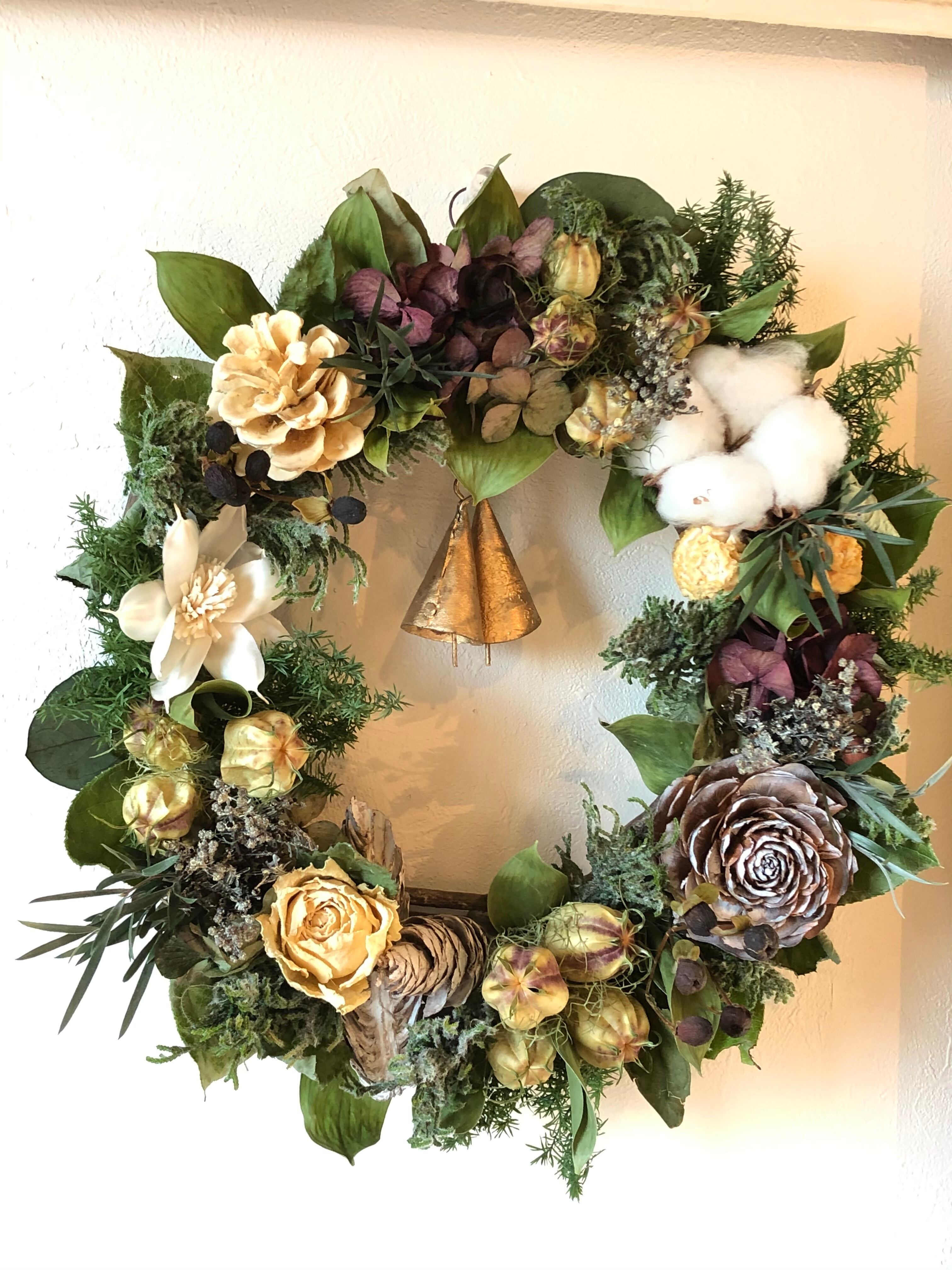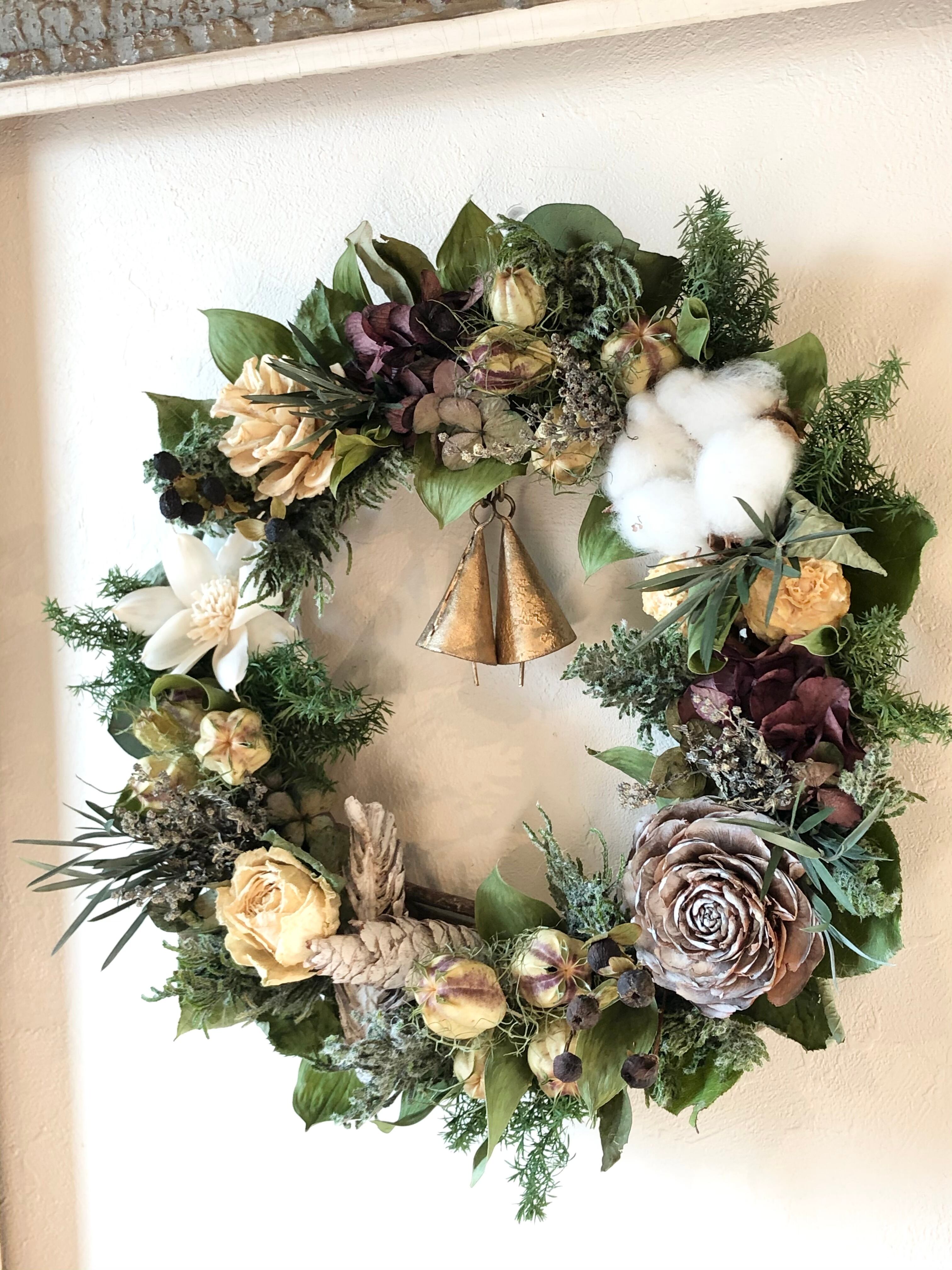 アンティーク調のミニカウベルを2つつけました。ボルドーの紫陽花が入ることで少しシックな印象に。少し縦長のオーバルに仕上がっています。