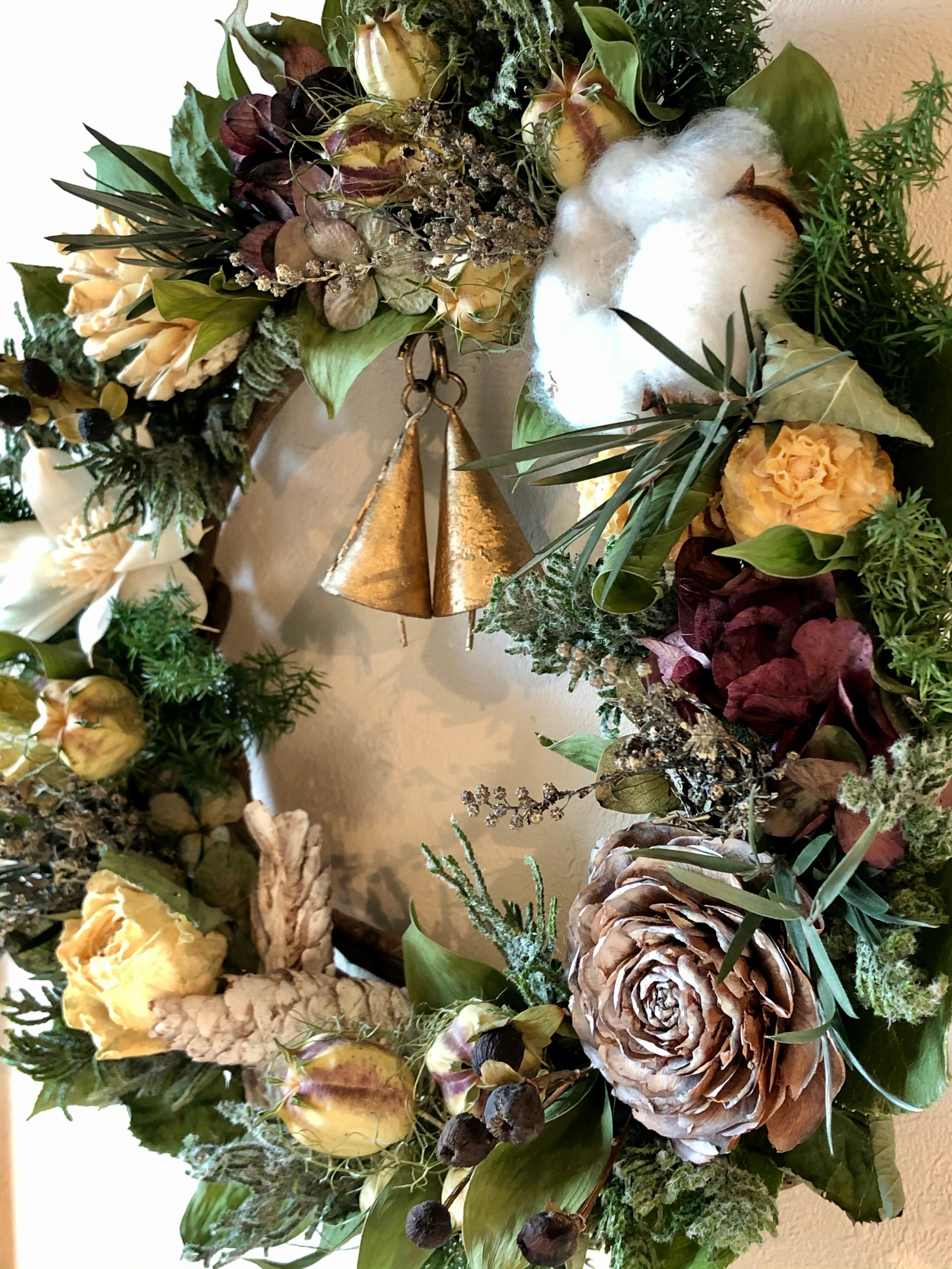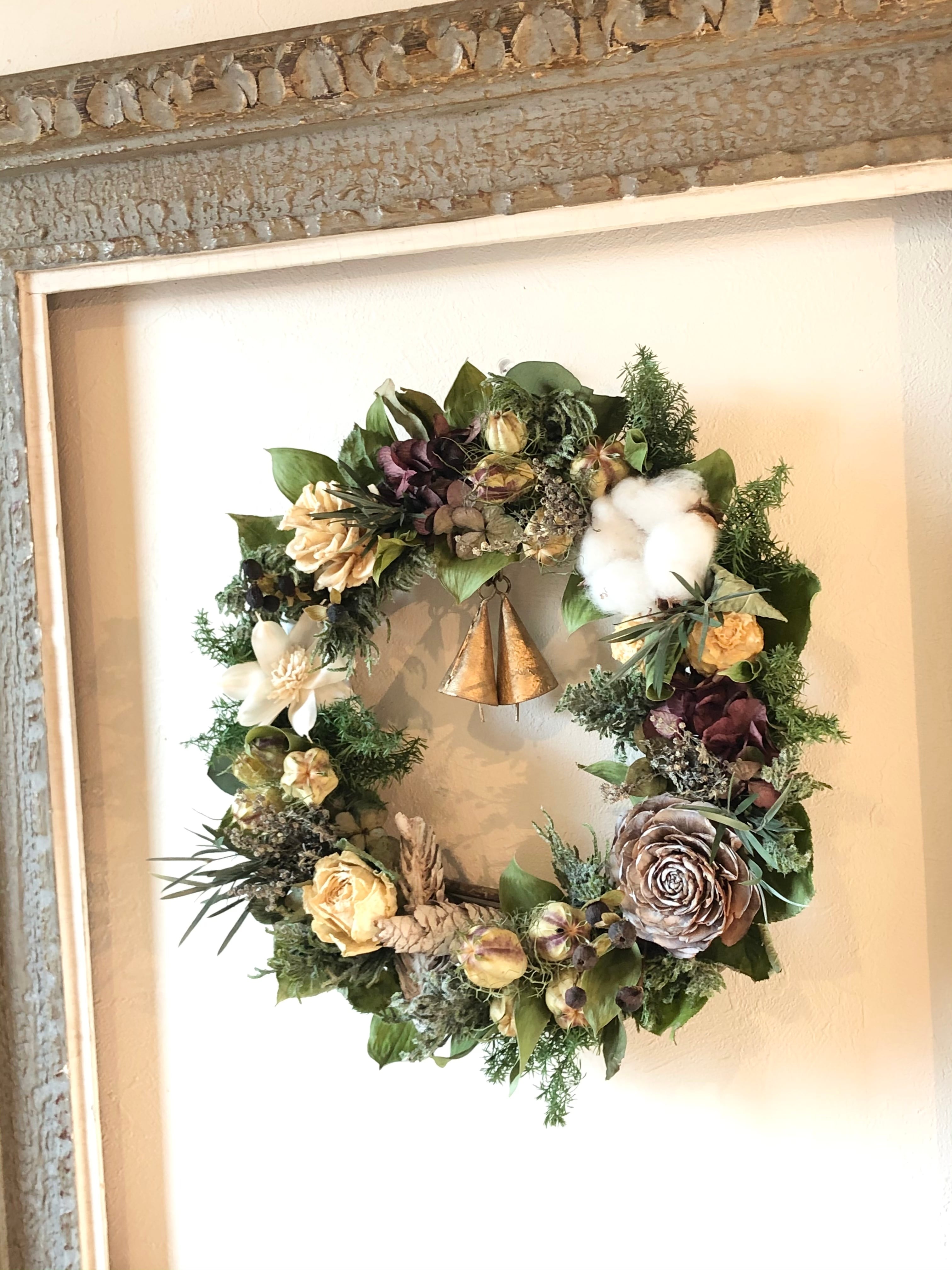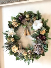 コットンや白の松ぼっくり、白のソーラークリスマスローズなども入れたシックな色合いのクリスマスリース。