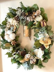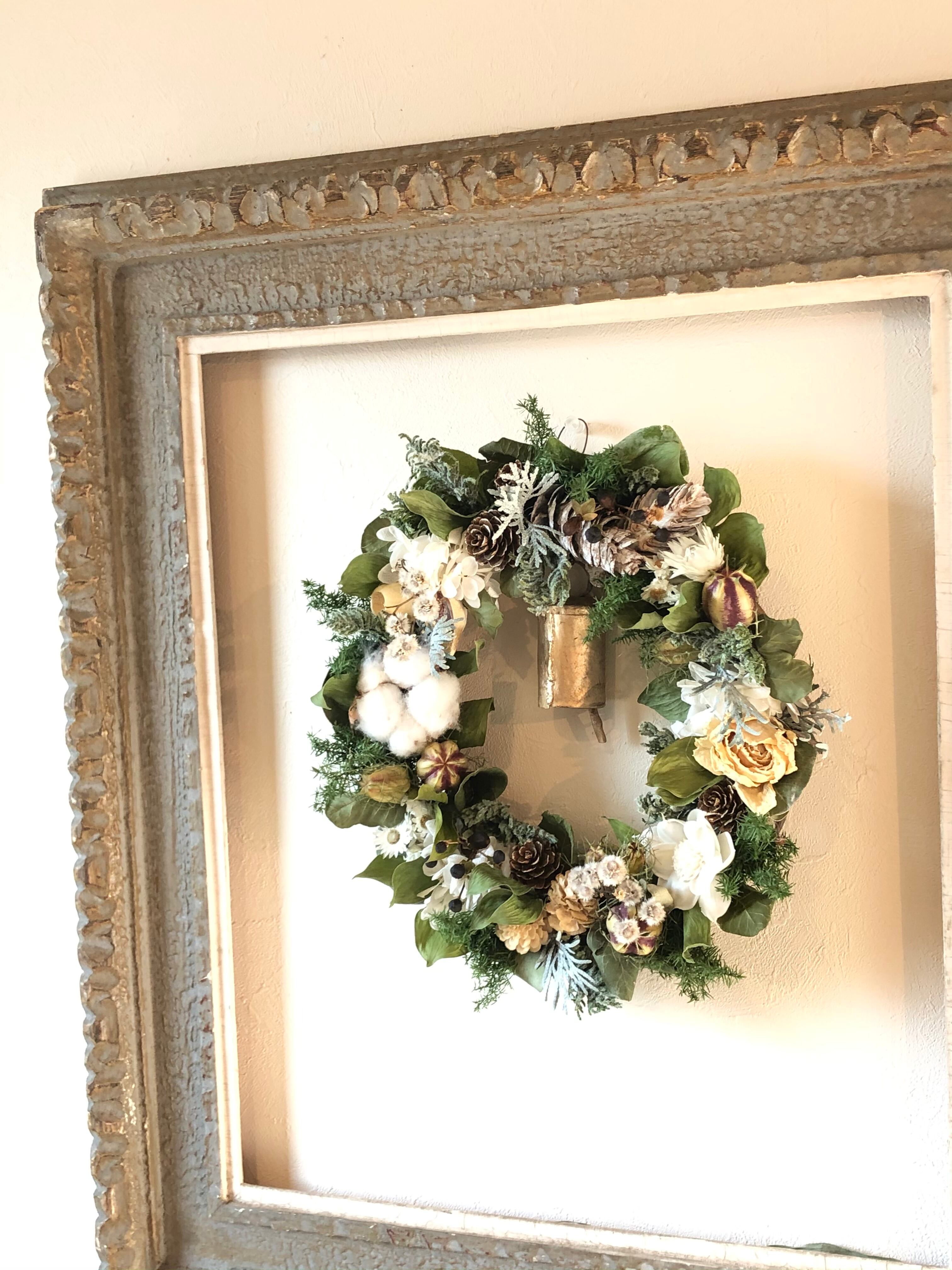 コットンや白の松ぼっくり、白の紫陽花も入れたシックな色合いのクリスマスリース。