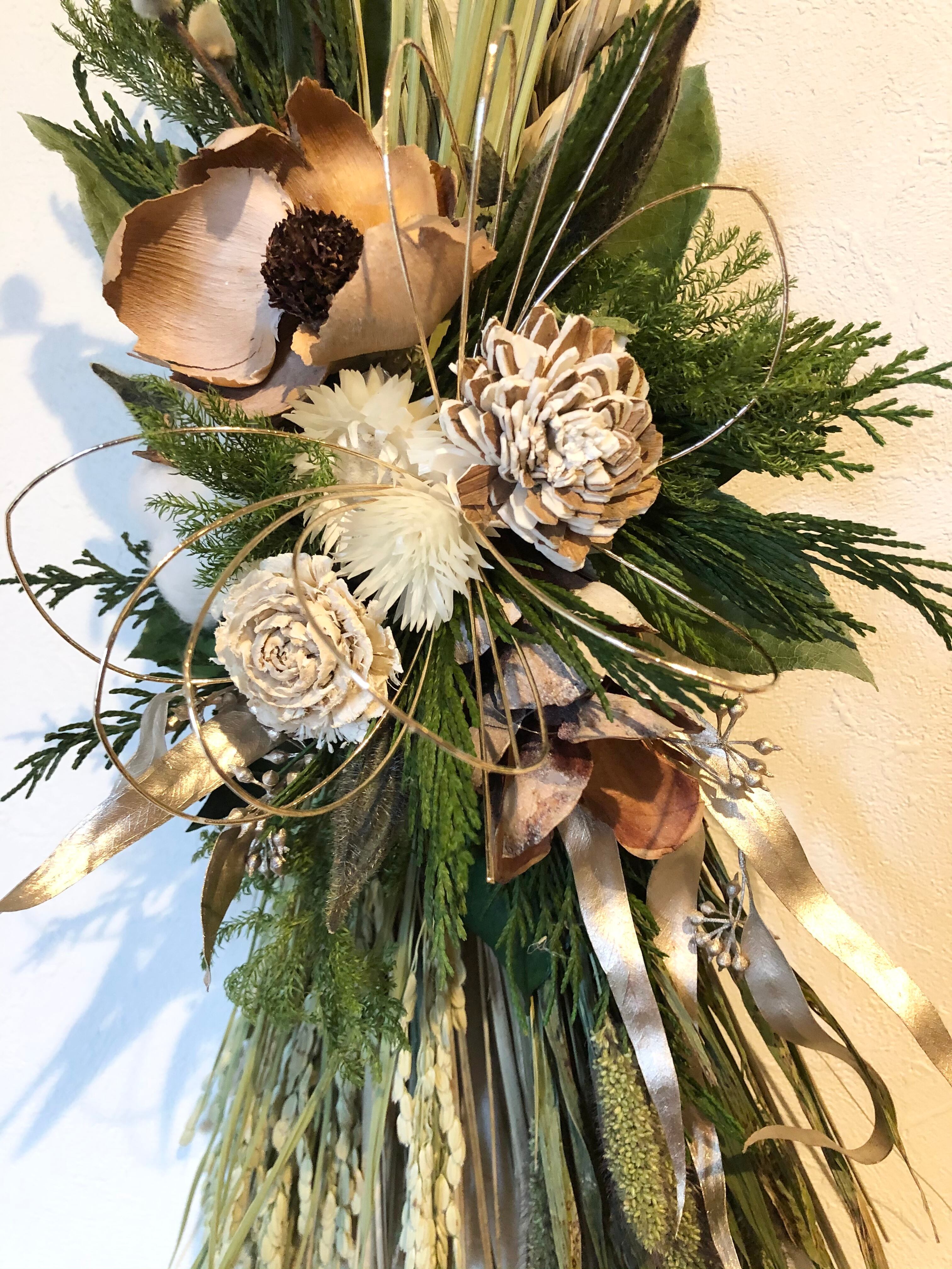 ゴールドのユーカリやコットンも入れて、落ち着いた冬色に。