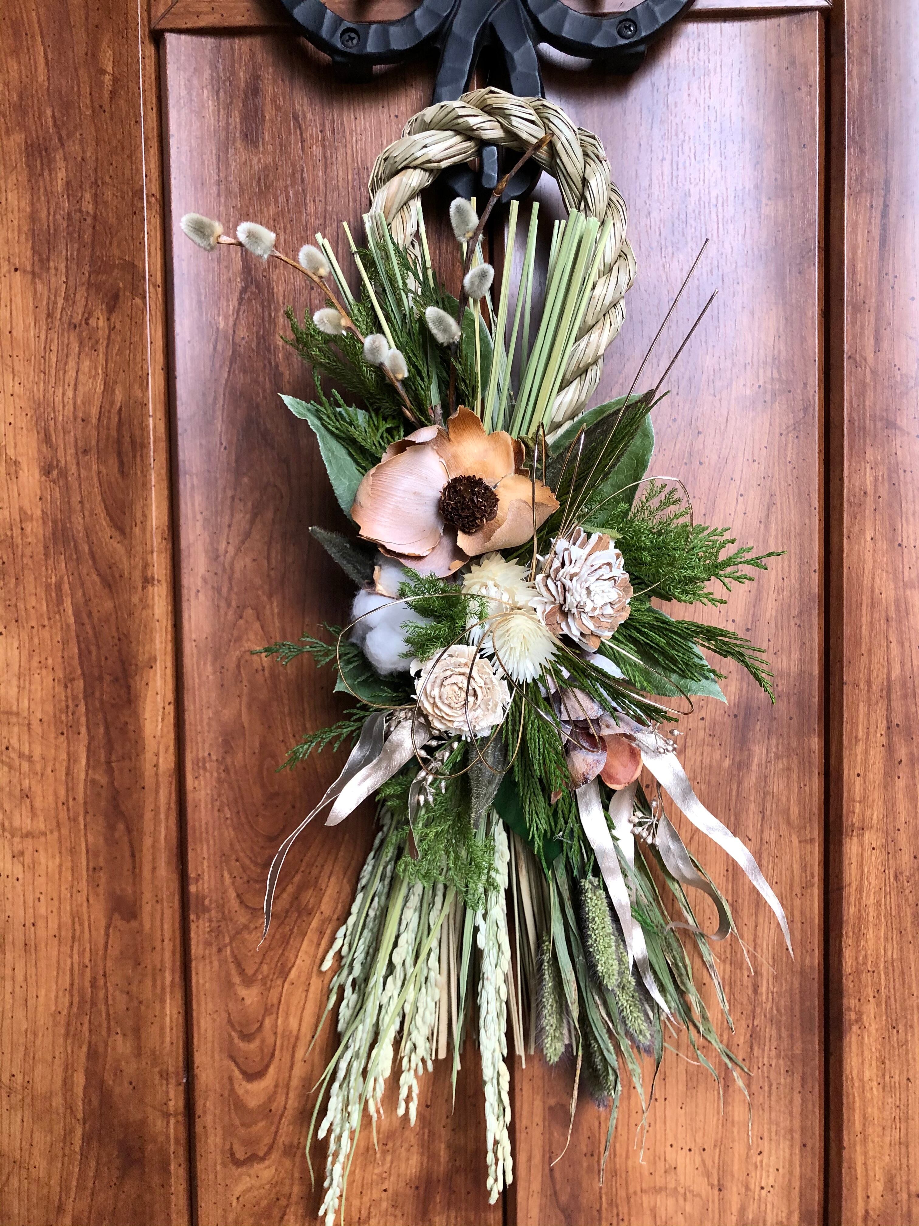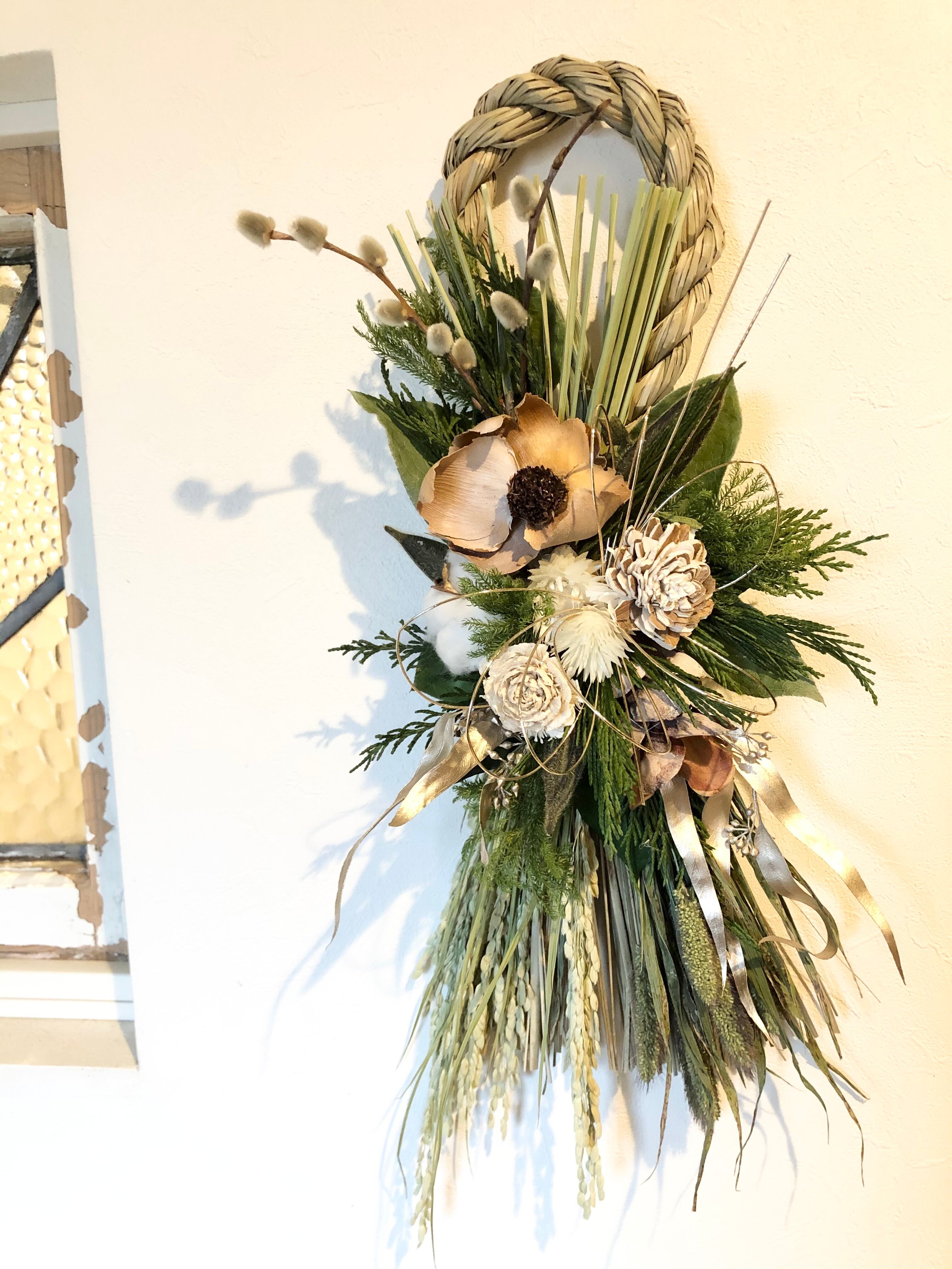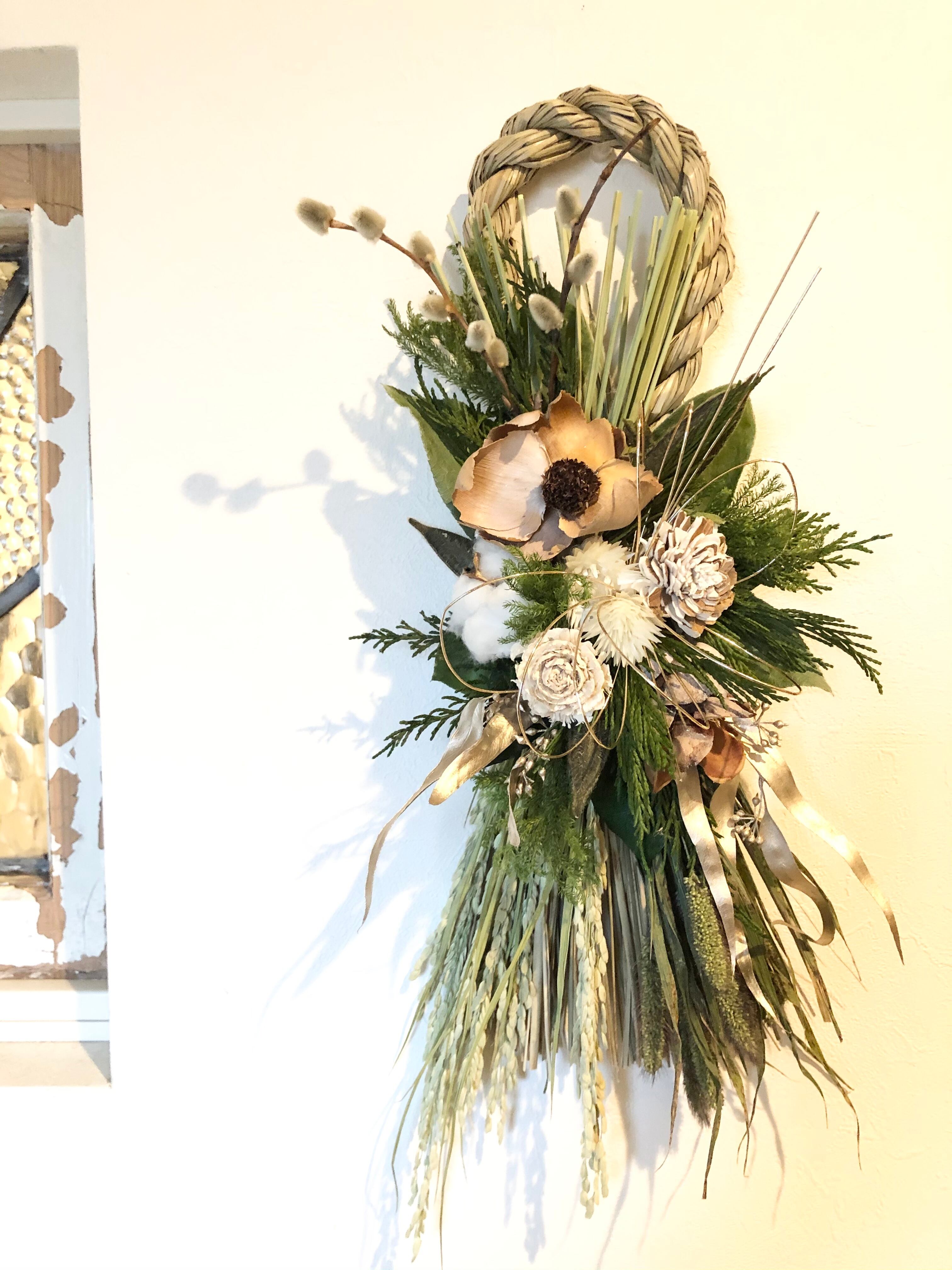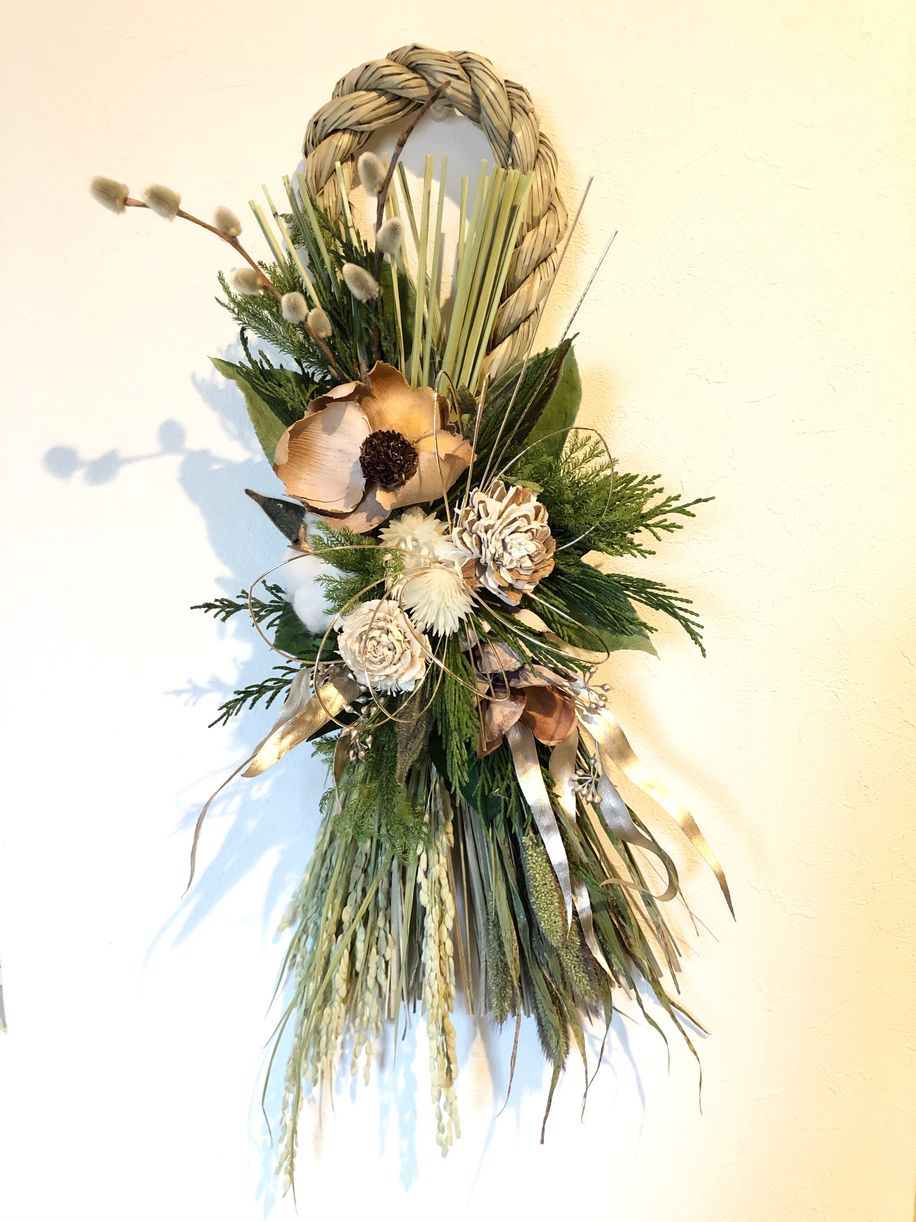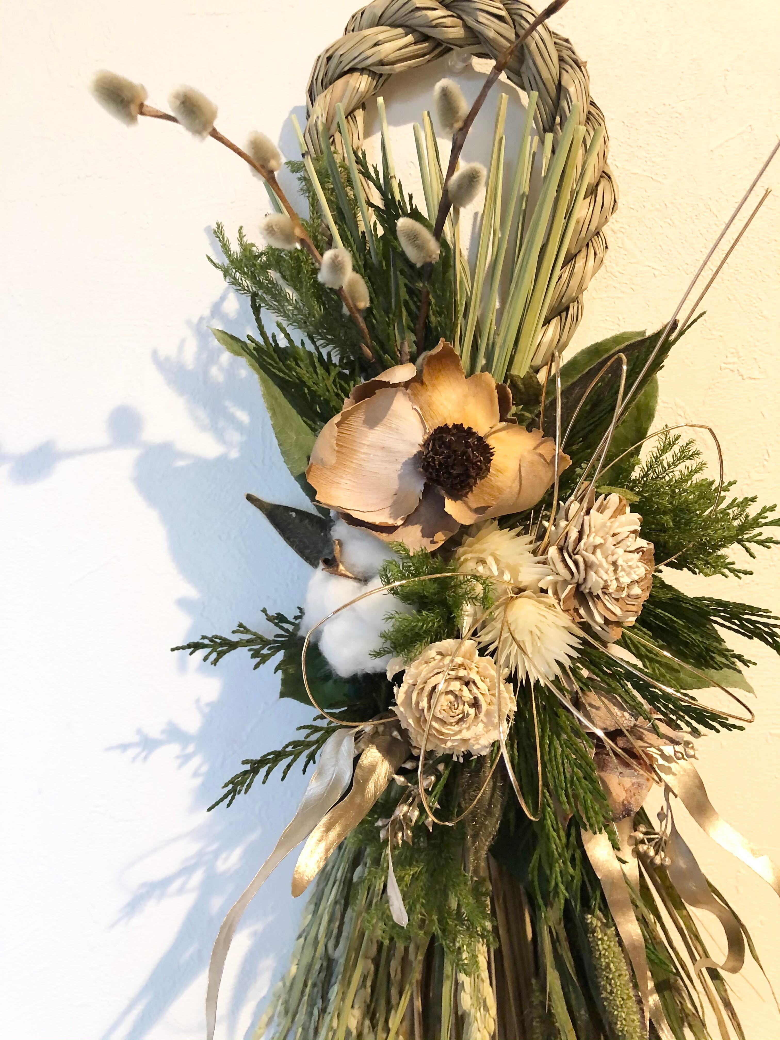 人気の花材、ホワイトウォッシュのパームフラワーをメインに、シックで落ち着いた色合いのしめ飾り。