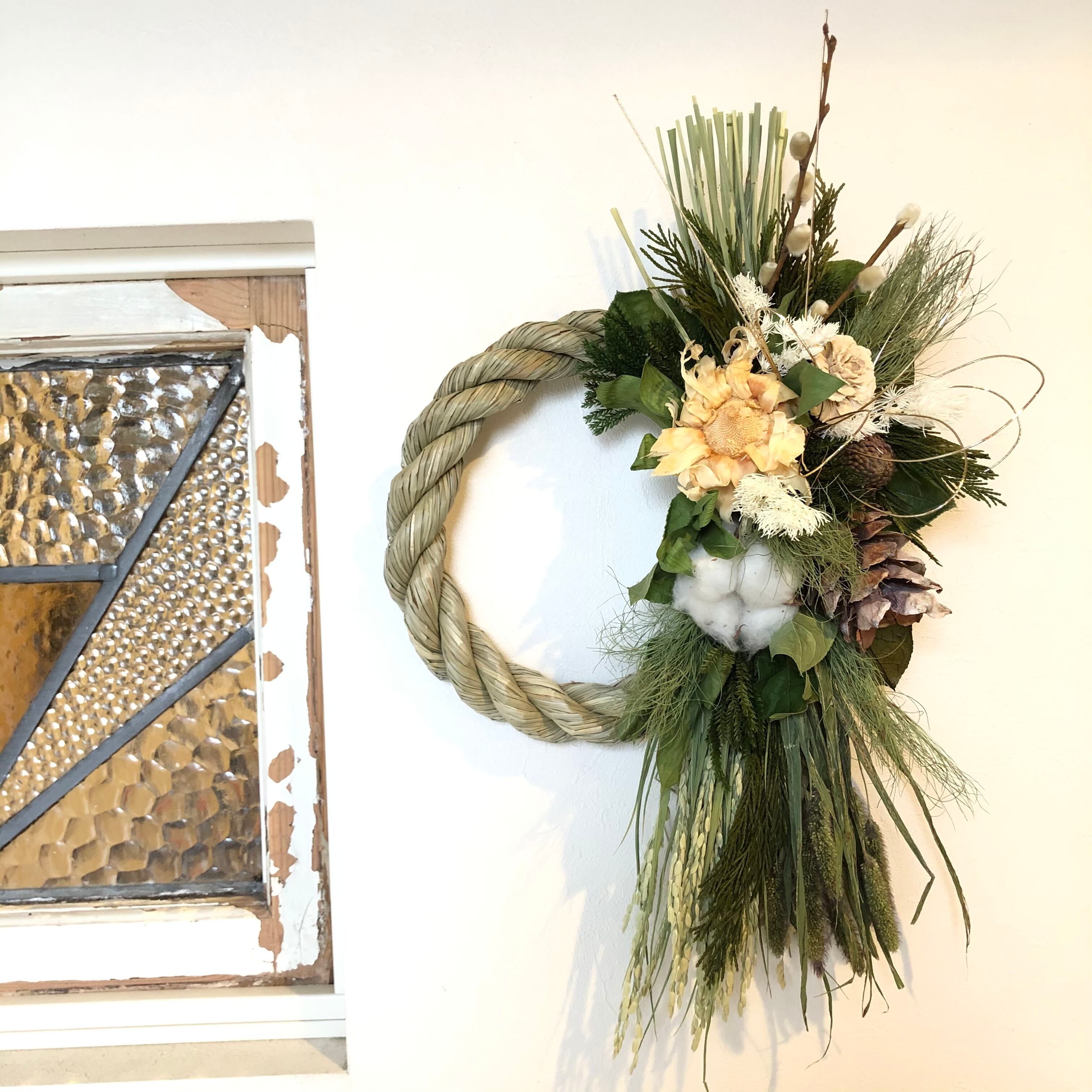 ストローブ松、コットン、リペンスなど、冬色の大きな花材をメインに、シンプルに仕上げたしめ飾り。