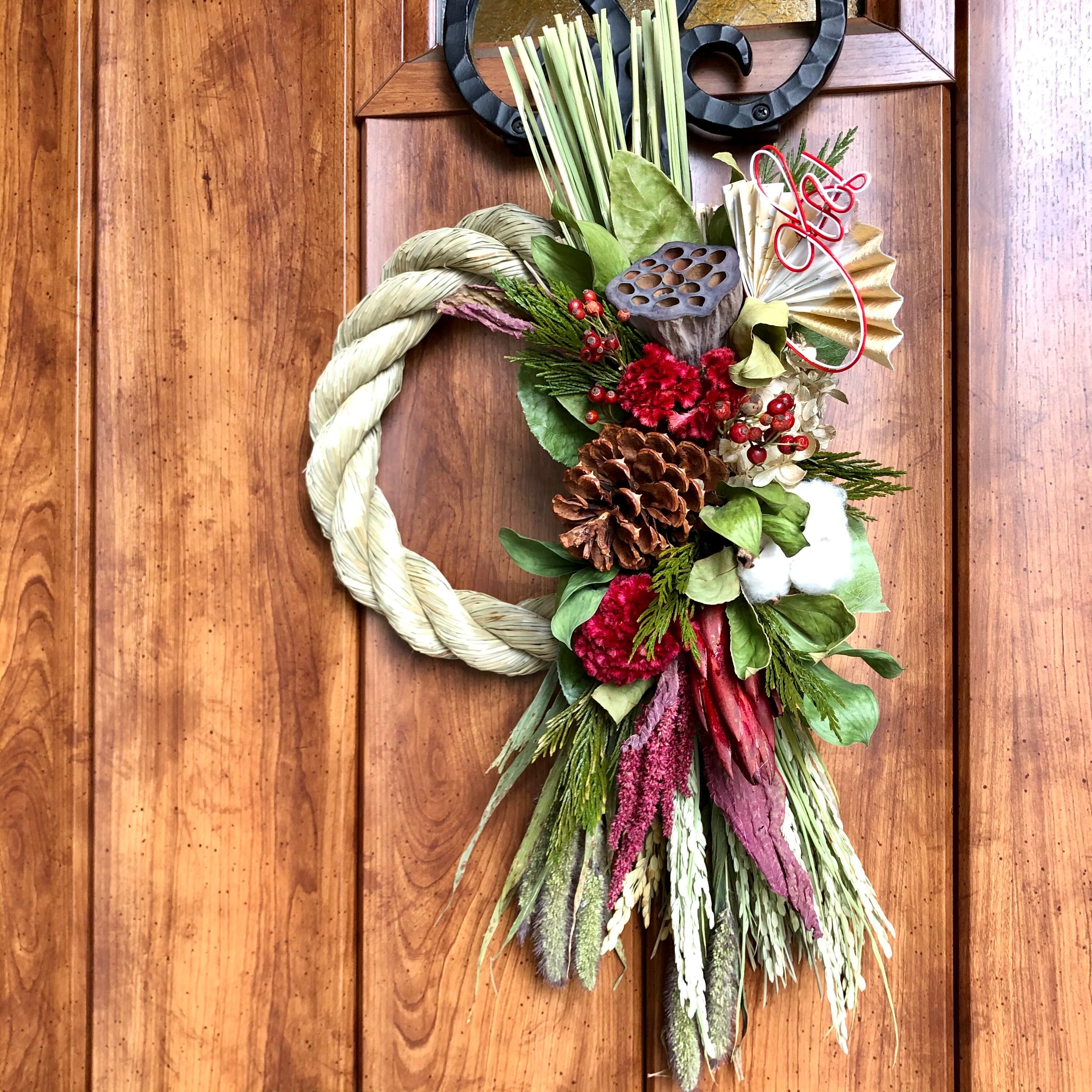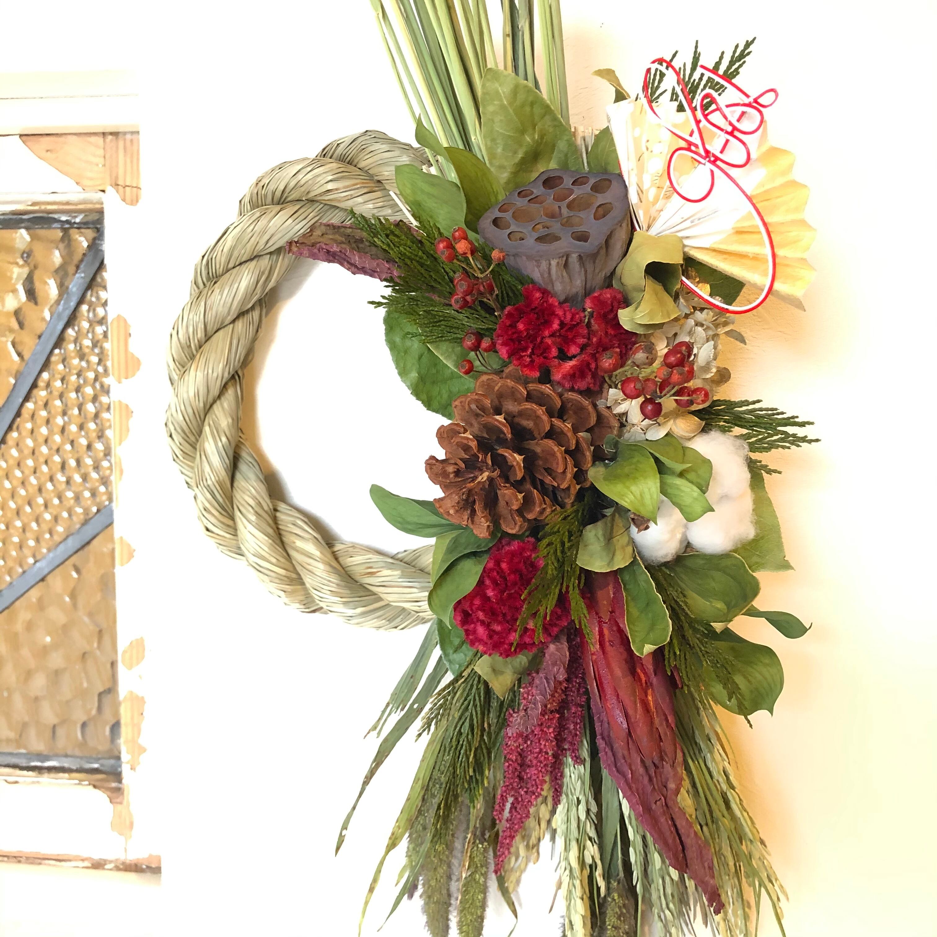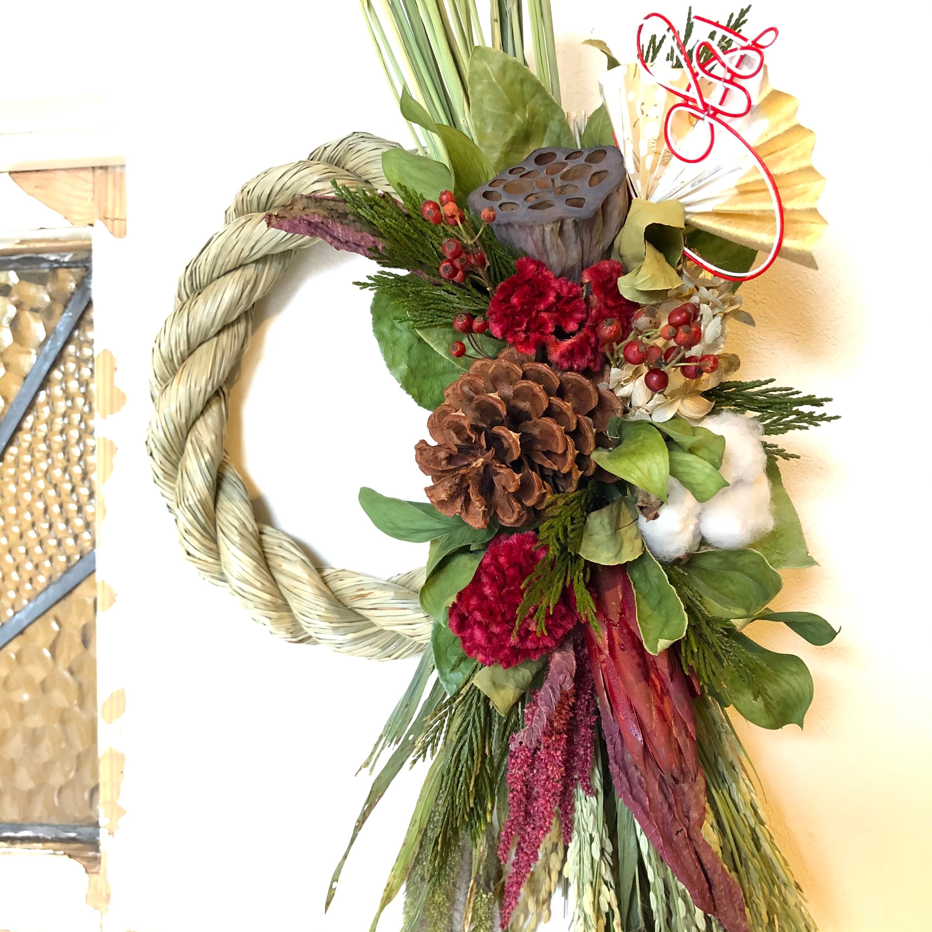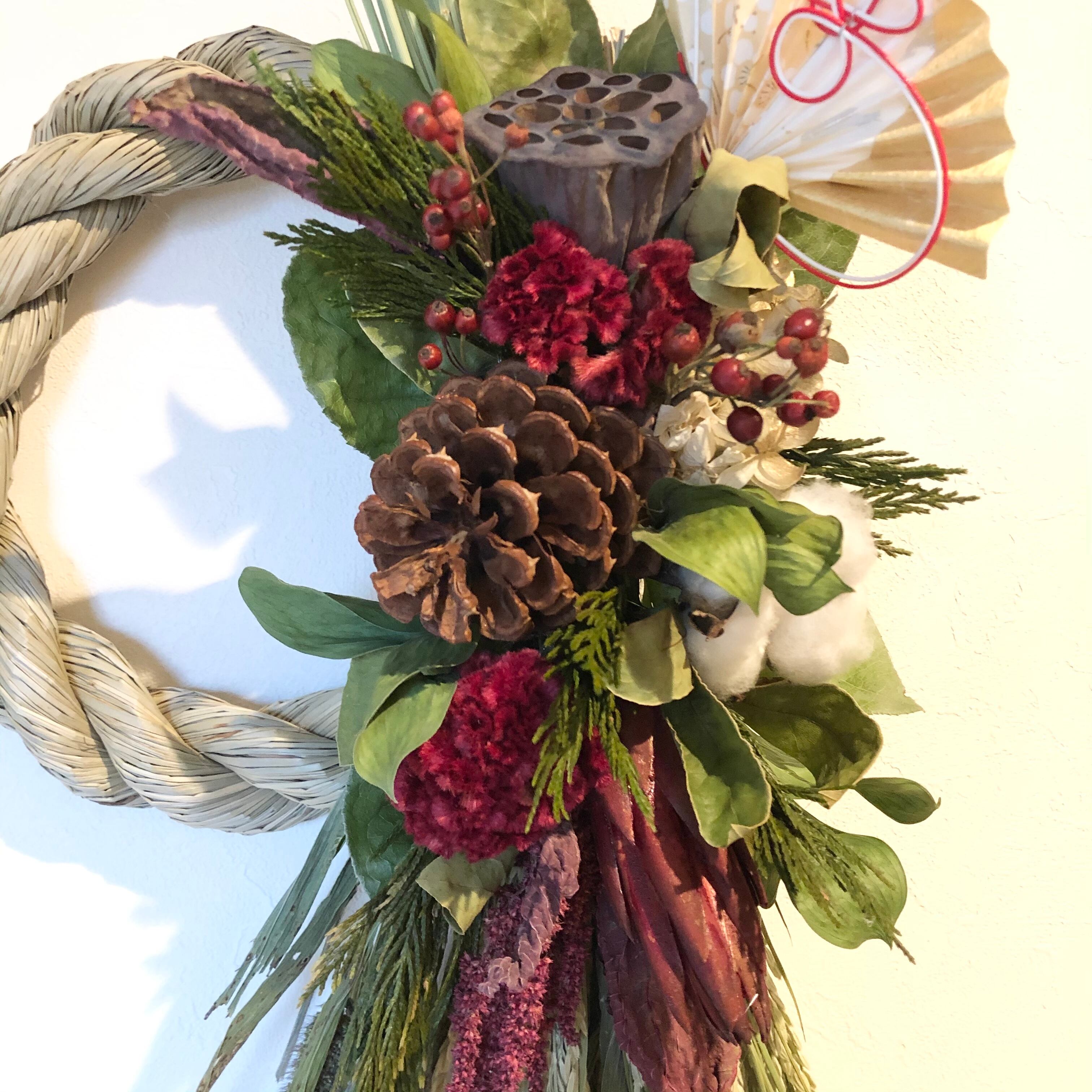 大きなハス、マックコーンをメインに、こっくりとしたケイトウの赤、アマランサスなど、あたたかい色合いの花材をたっぷりと入れたしめ飾り。