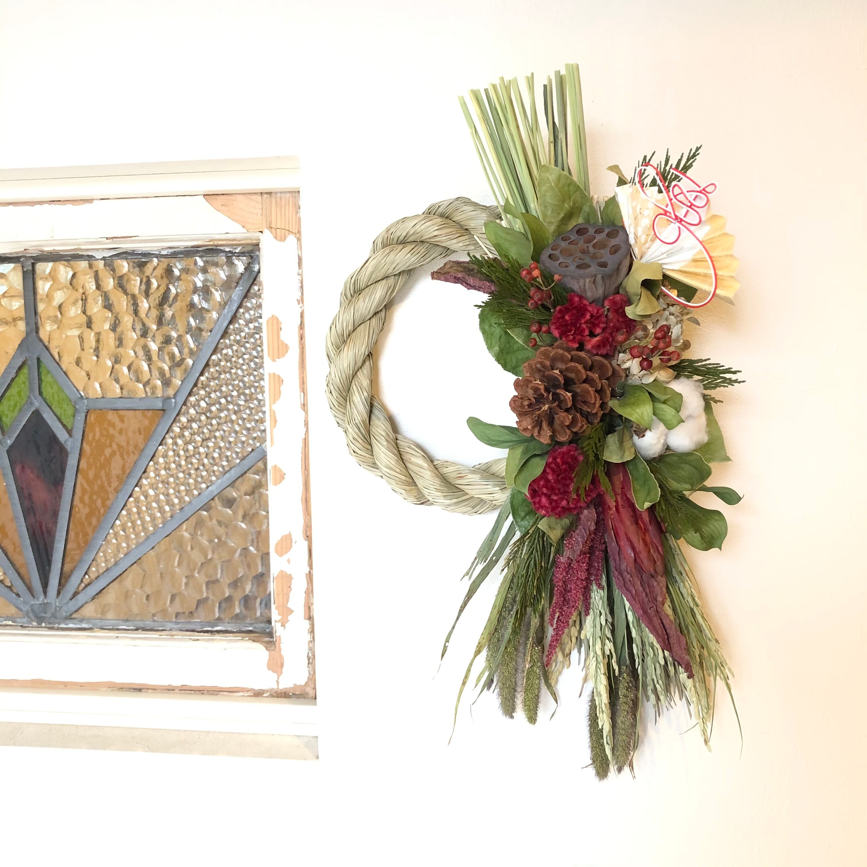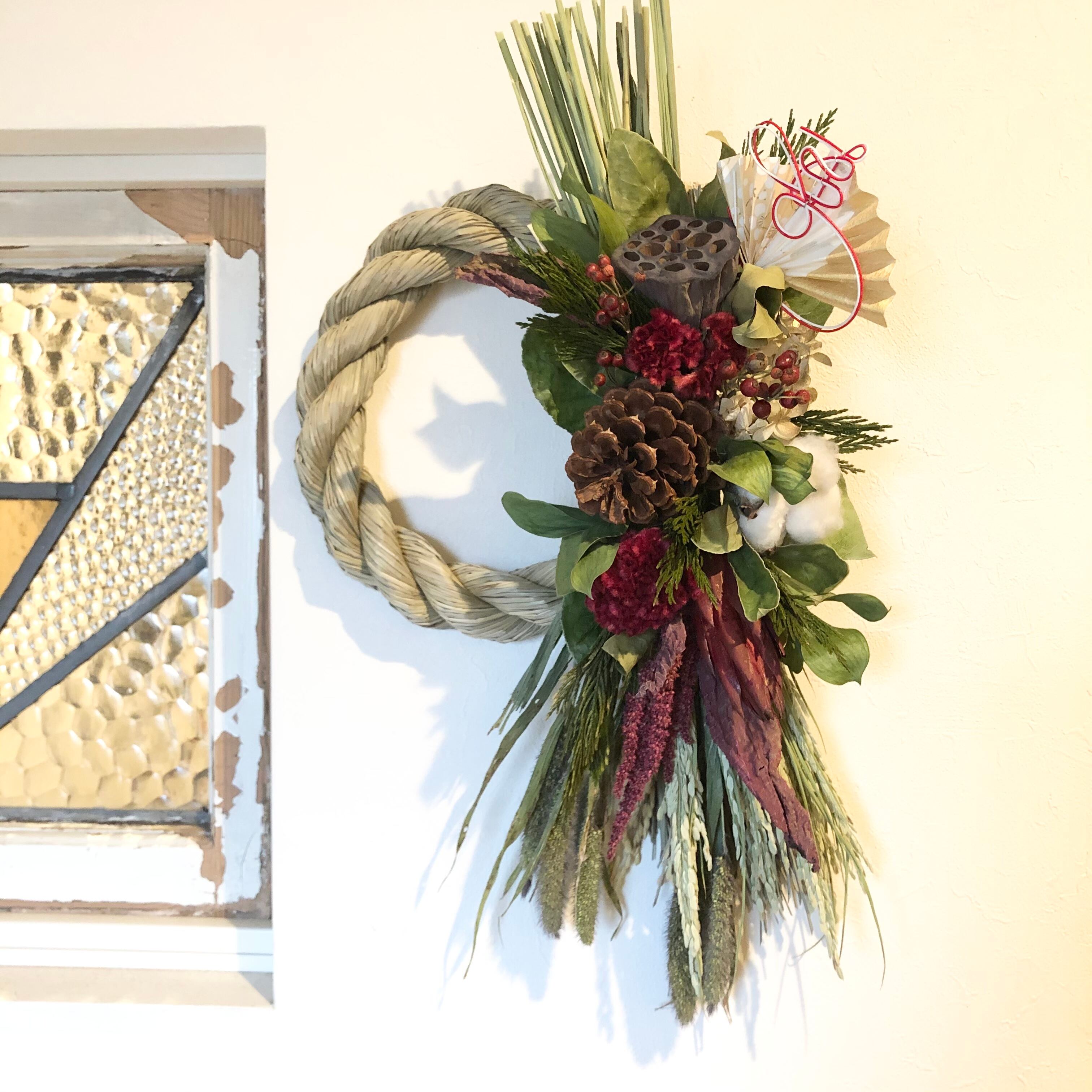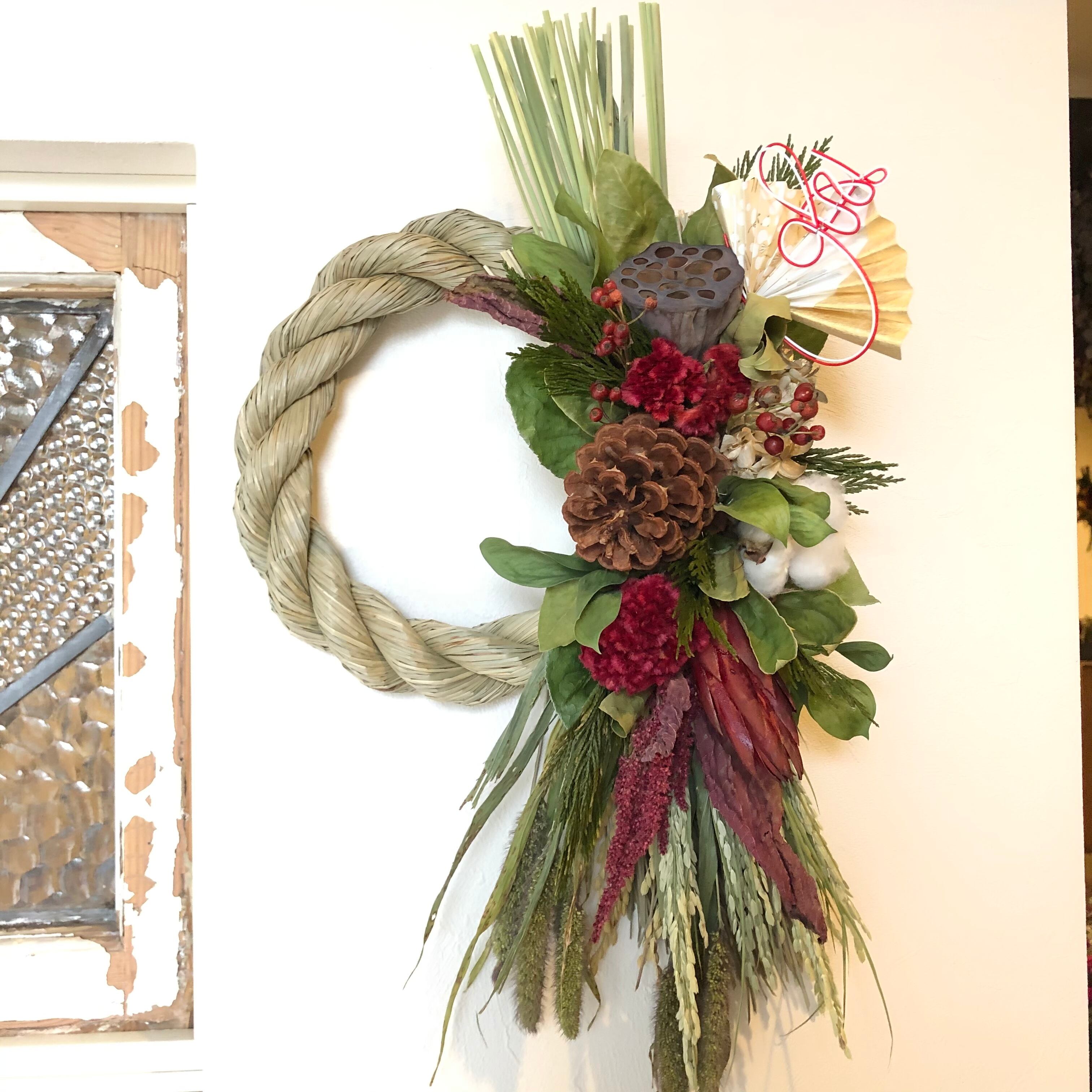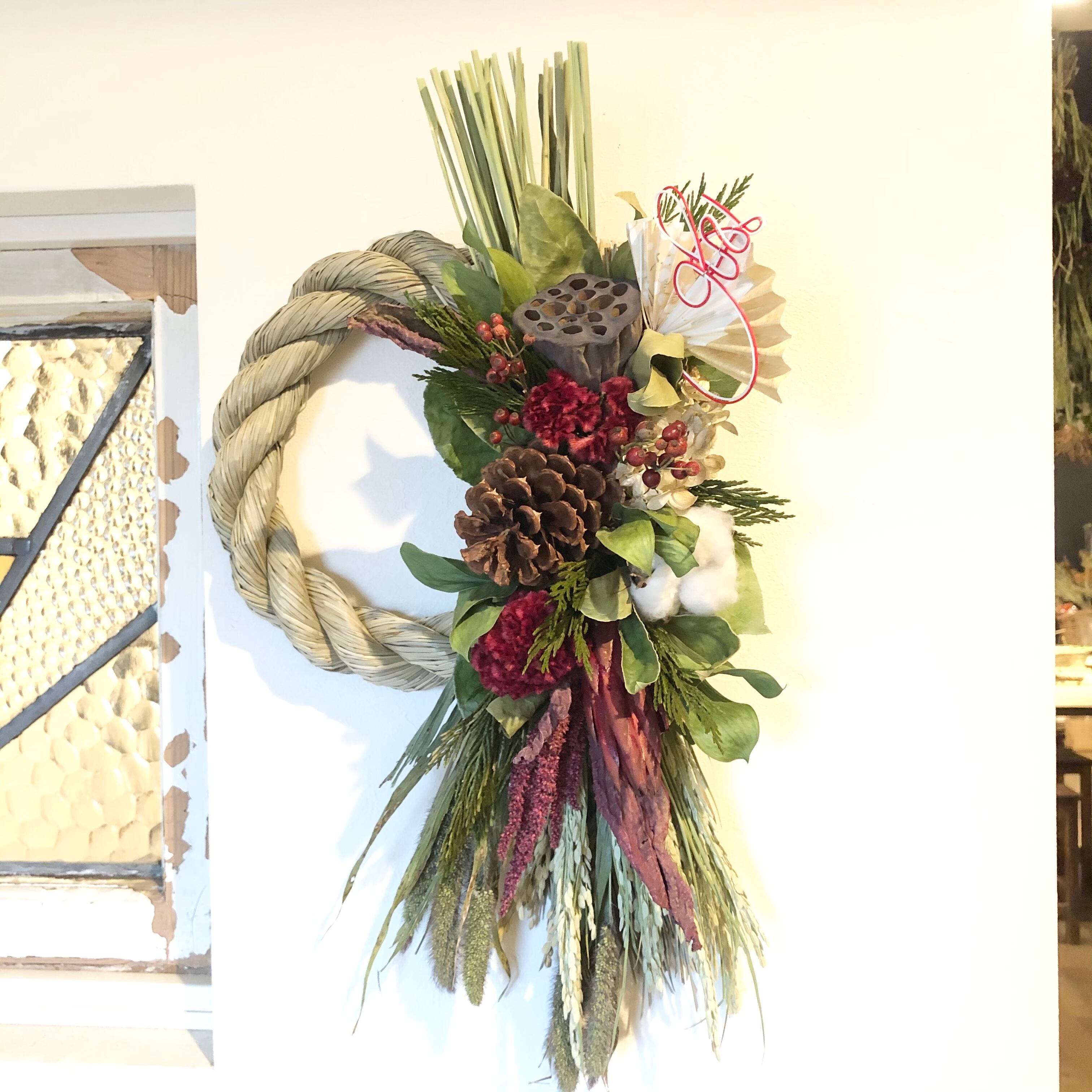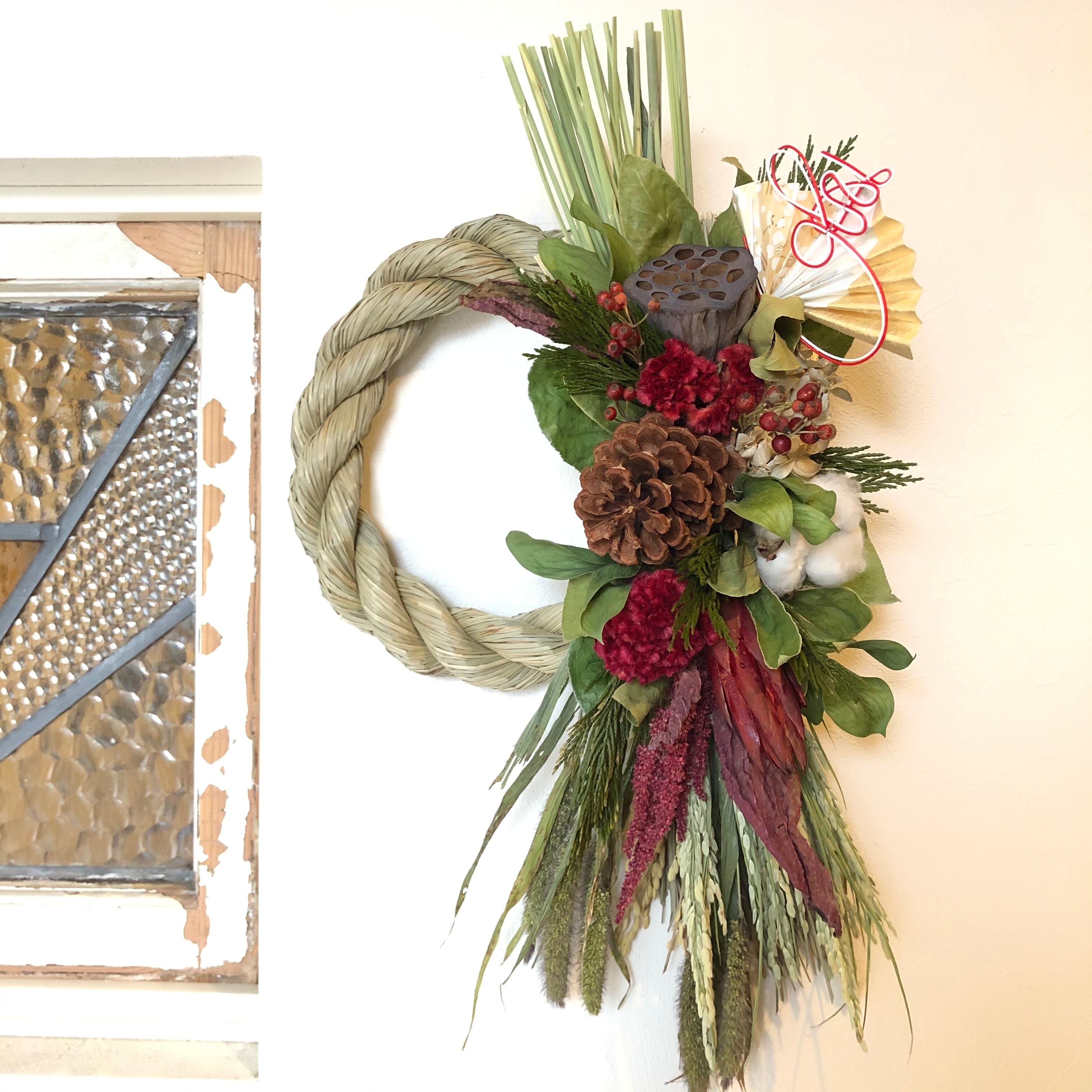 大きなハス、マックコーンをメインに、こっくりとしたケイトウの赤、アマランサスなど、あたたかい色合いの花材をたっぷりと入れたしめ飾り。