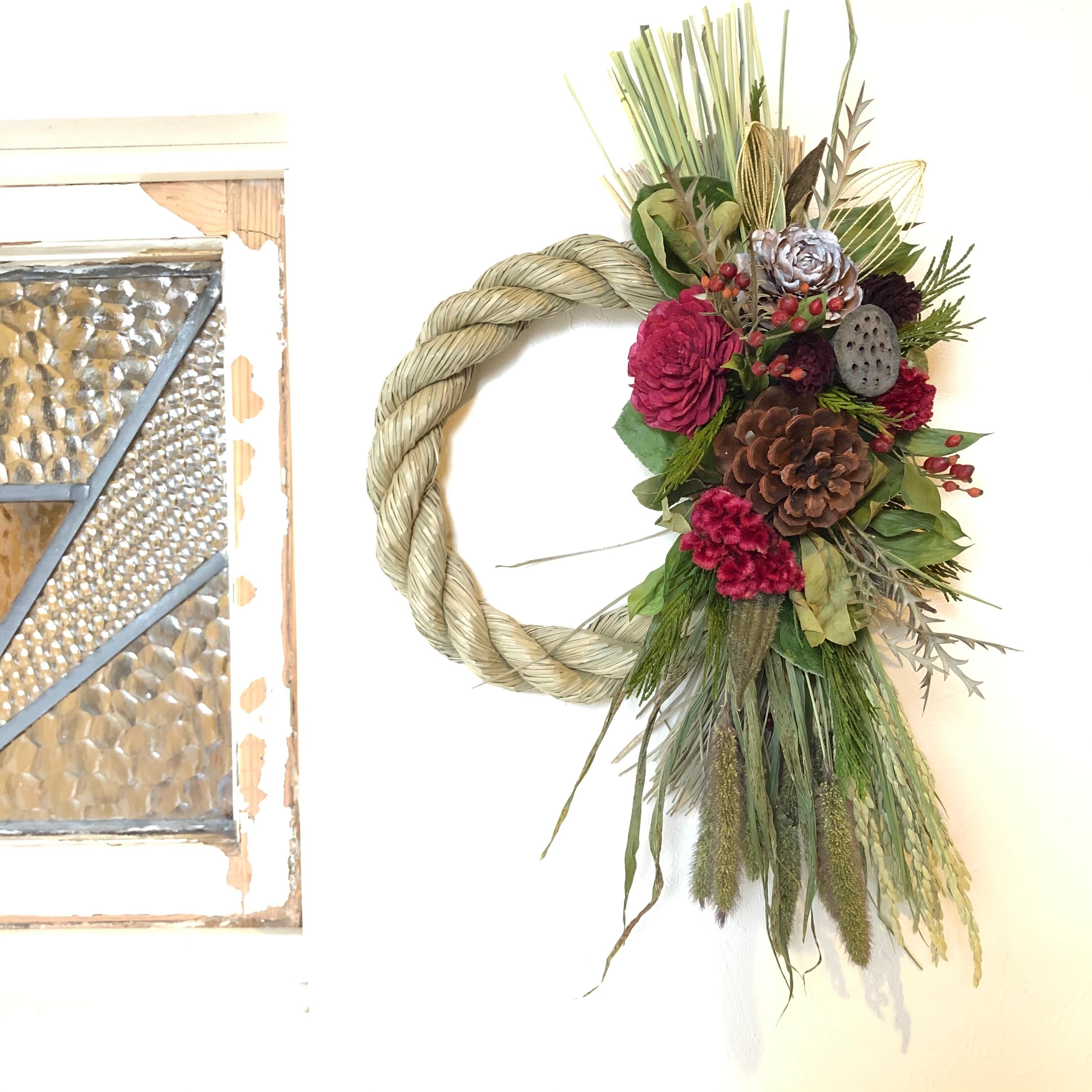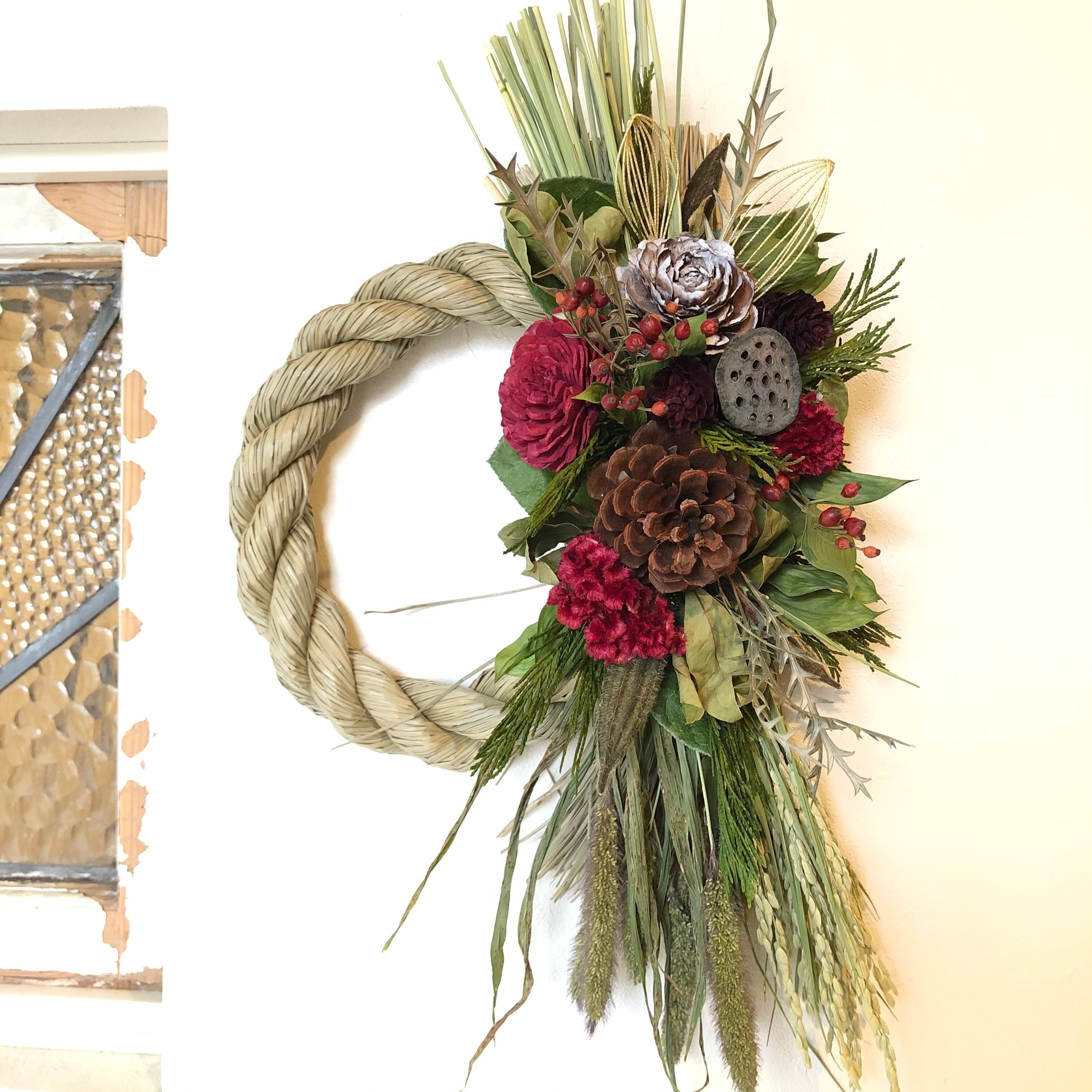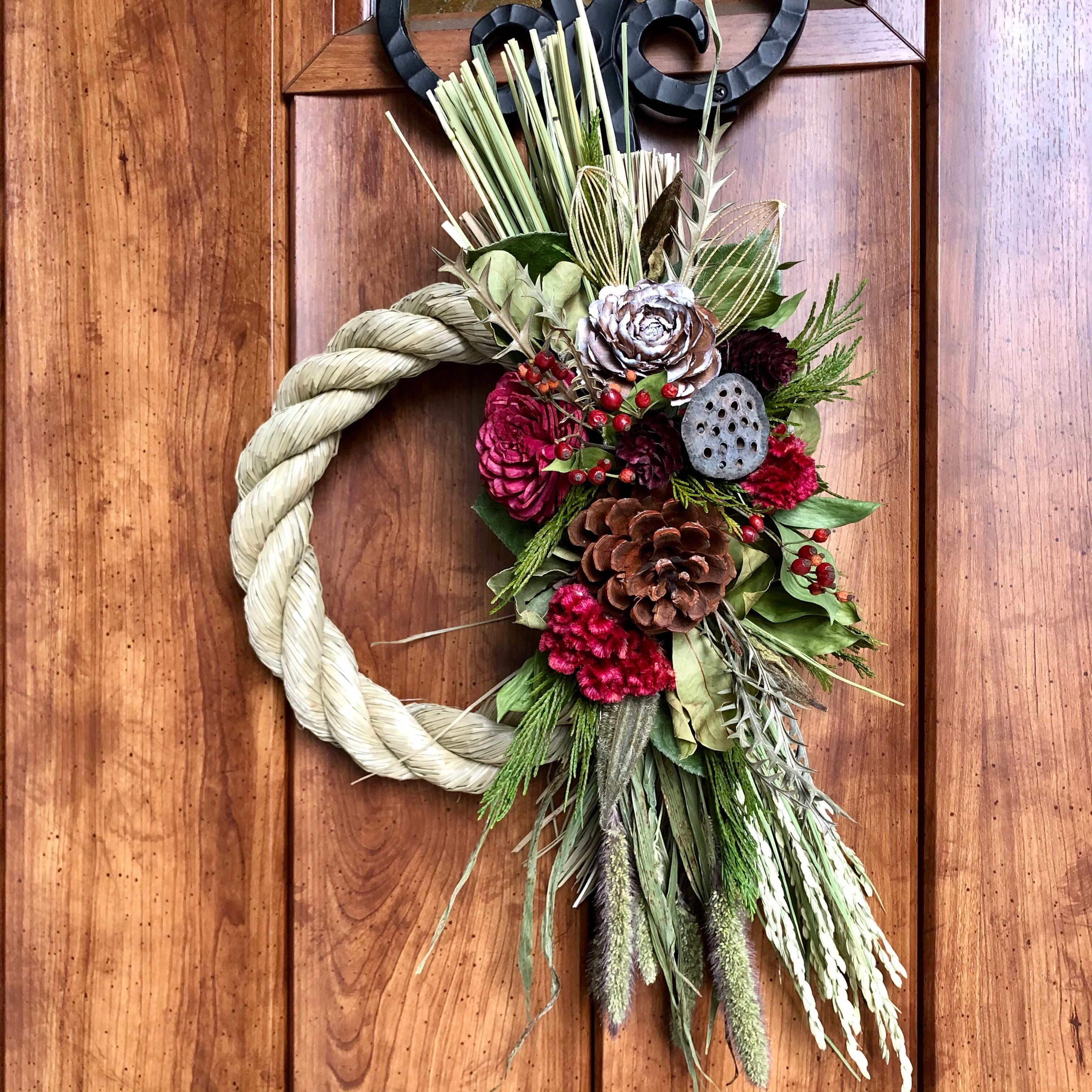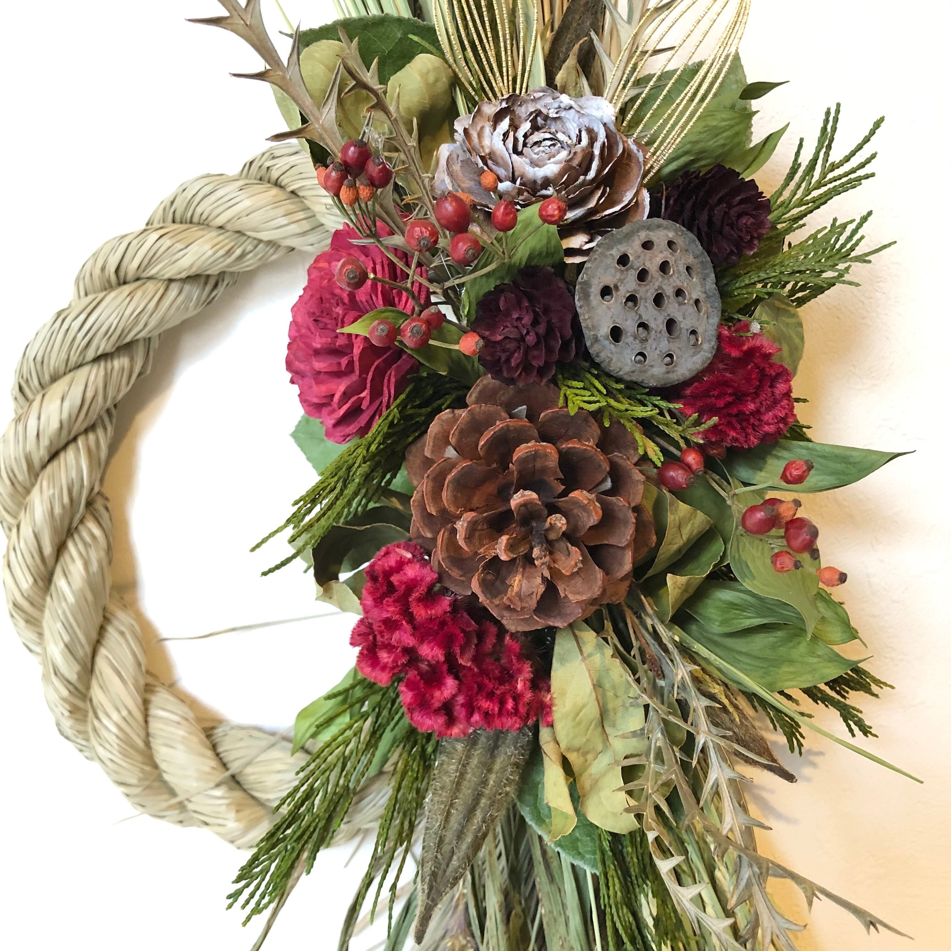 大きなマックコーンとソーラーローズをメインに、縦にすっと伸びるラインが美しいシンプルなしめ飾り。こっくりとしたケイトウの赤もとてもきれいです。