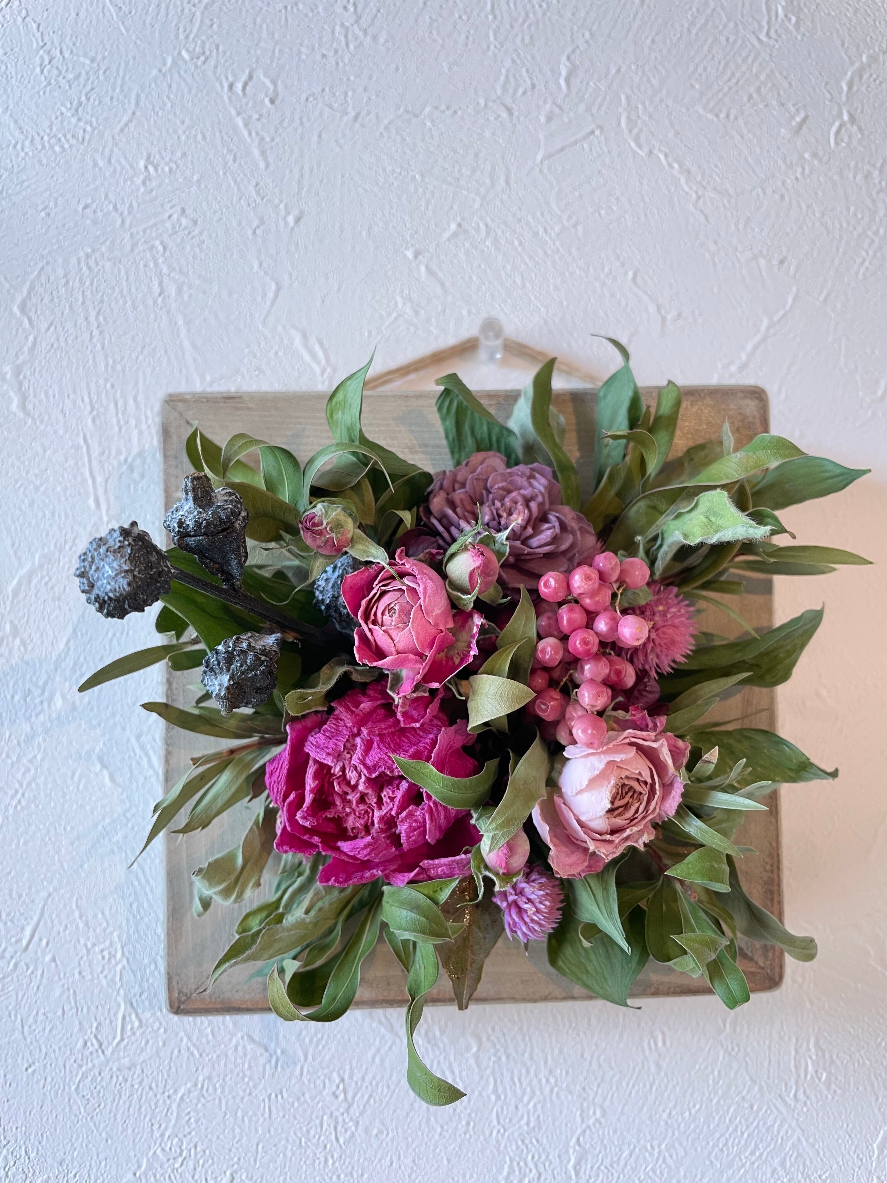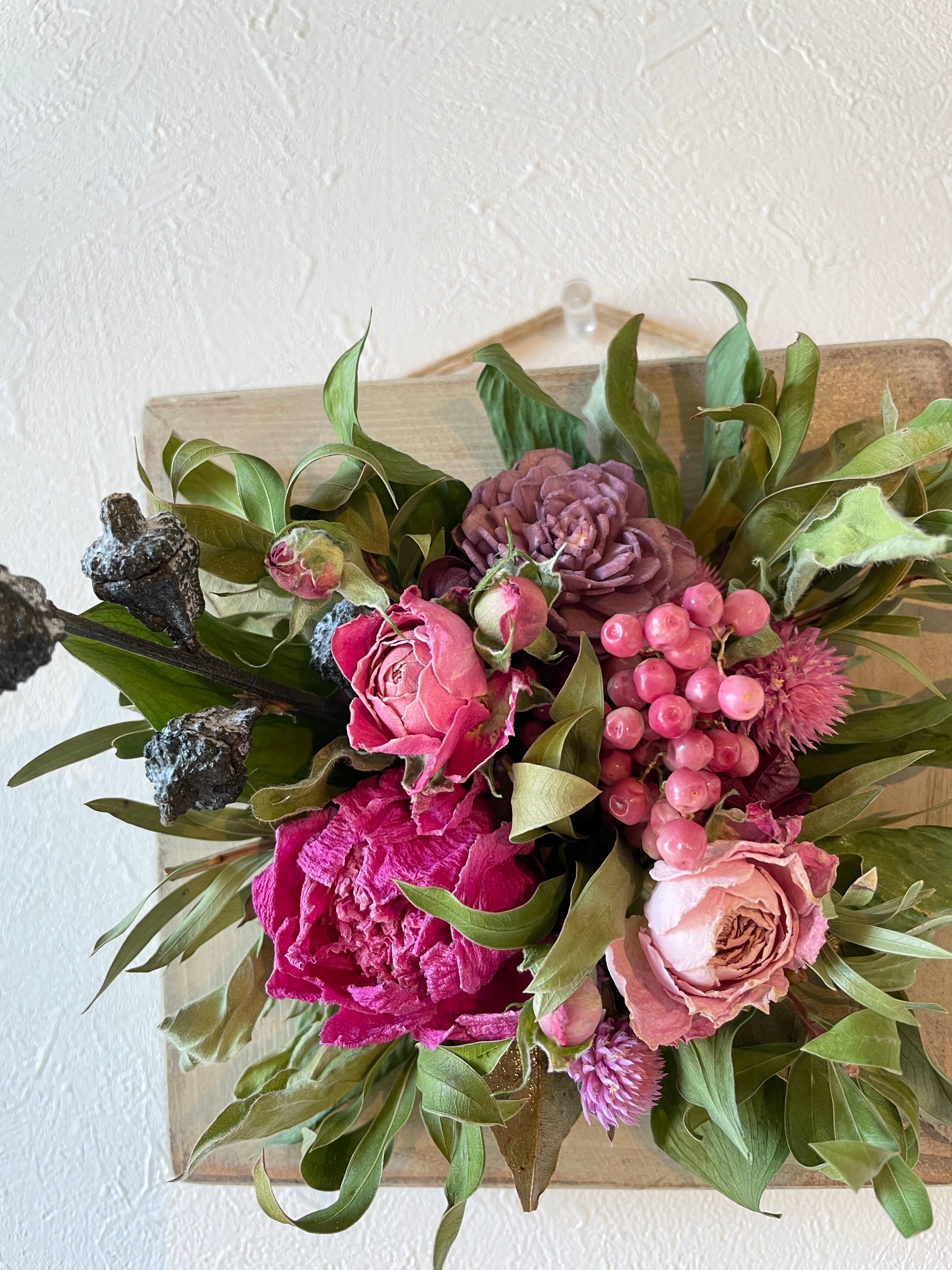 ピンクのシャクヤクをメインに、ペッパーベリーやユーカリの実がなんとも可愛らしい、