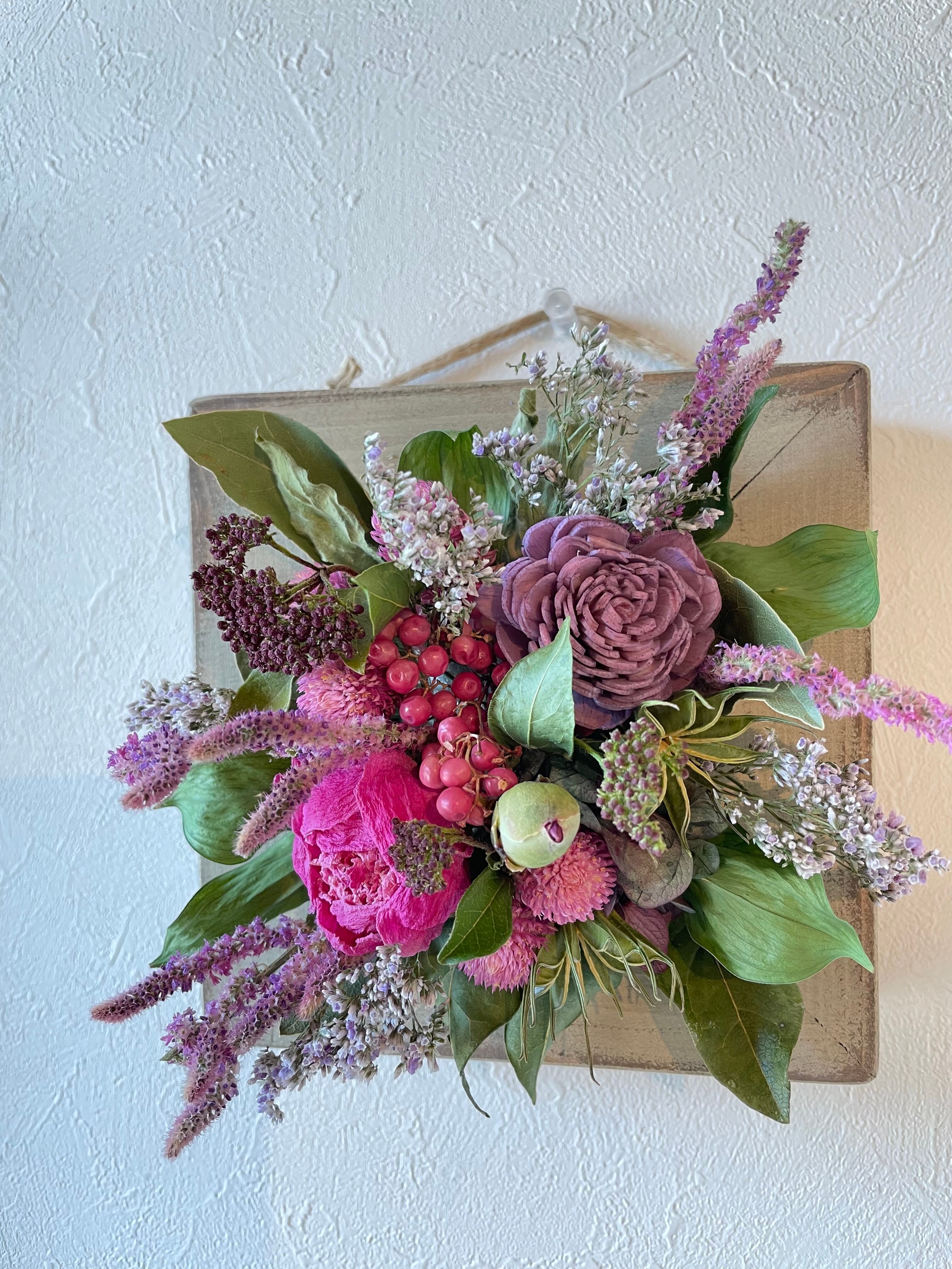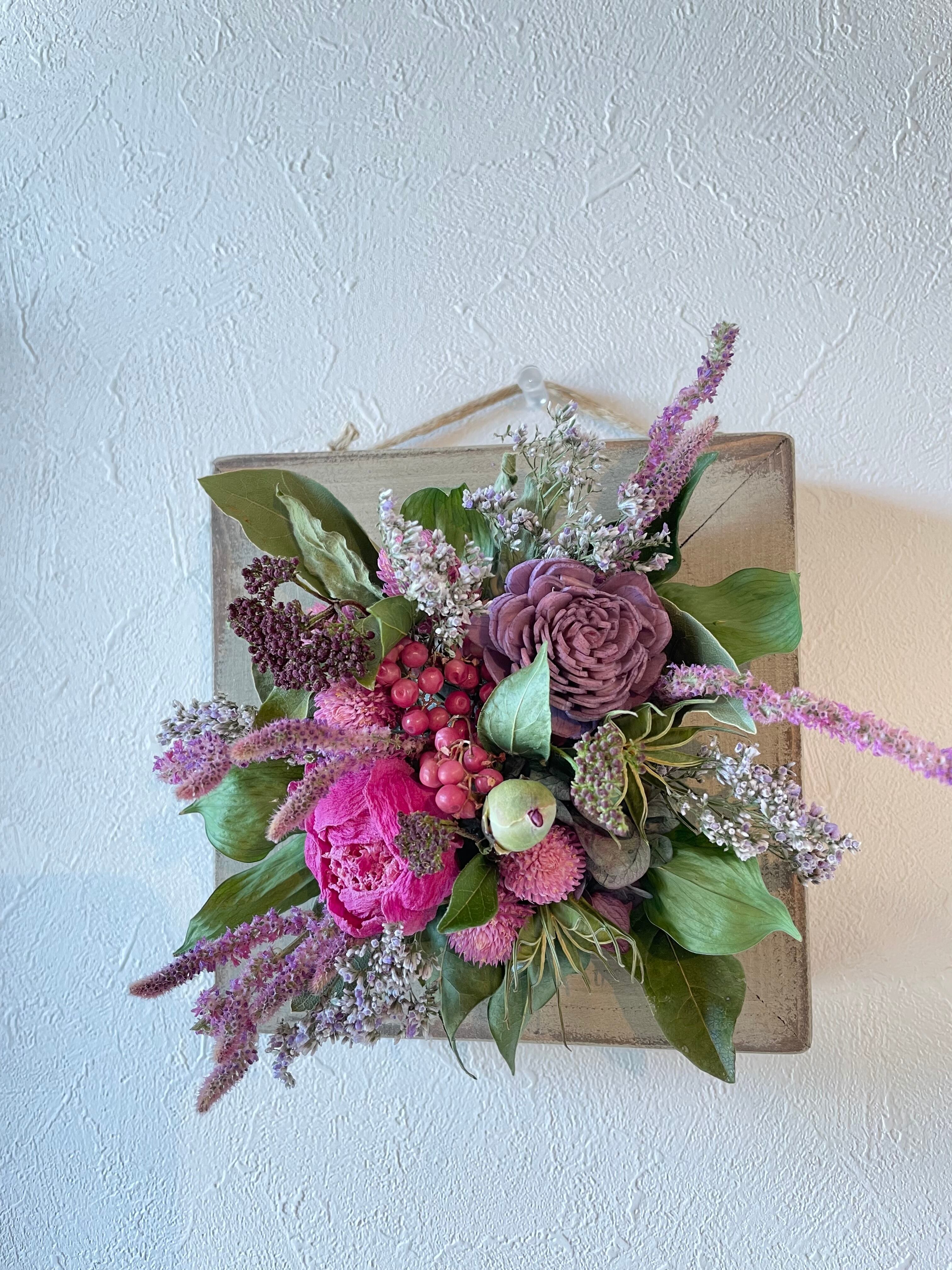 ひとつひとつ、手作りのウッドフレームにドライフラワーをアレンジ。