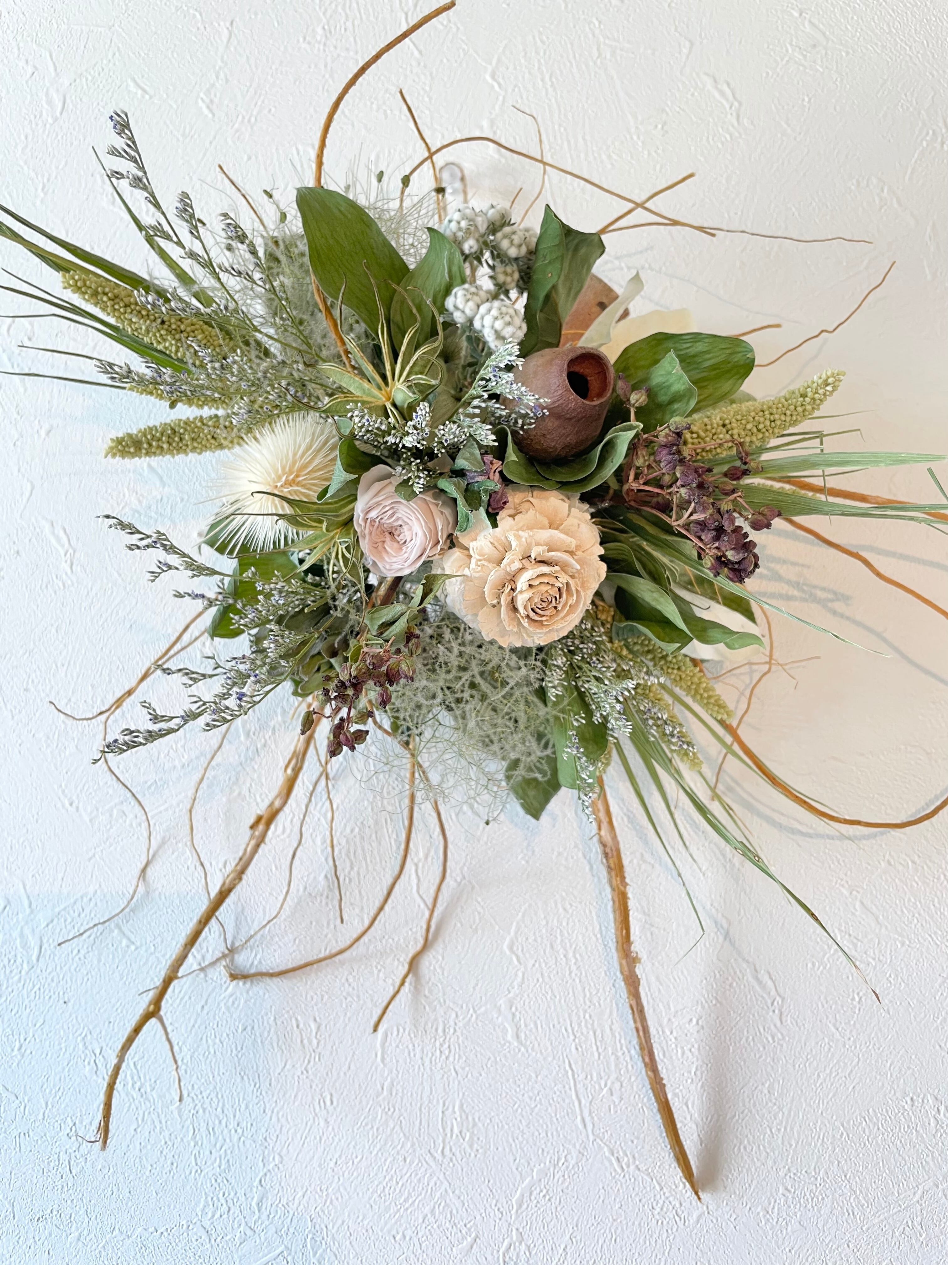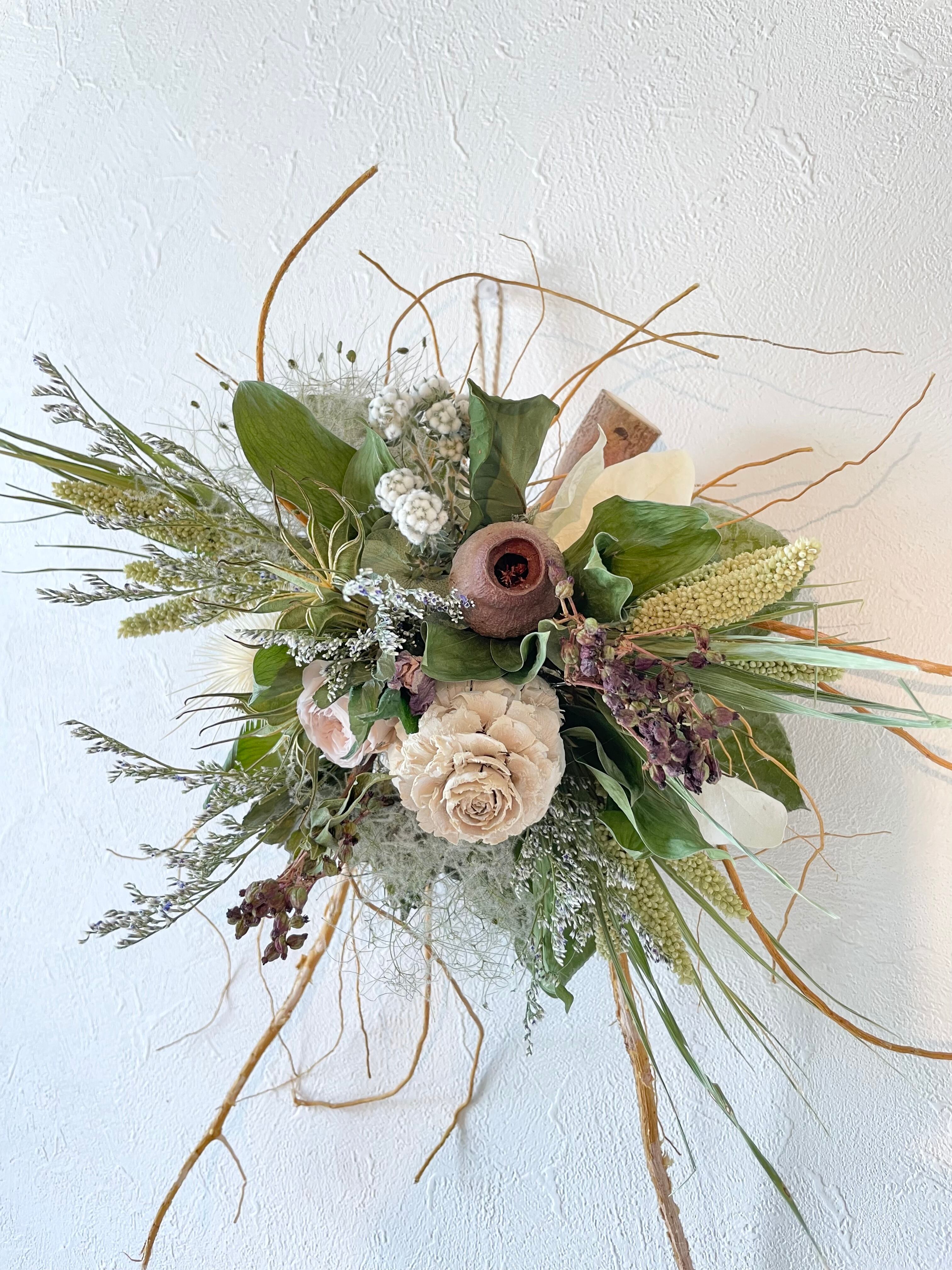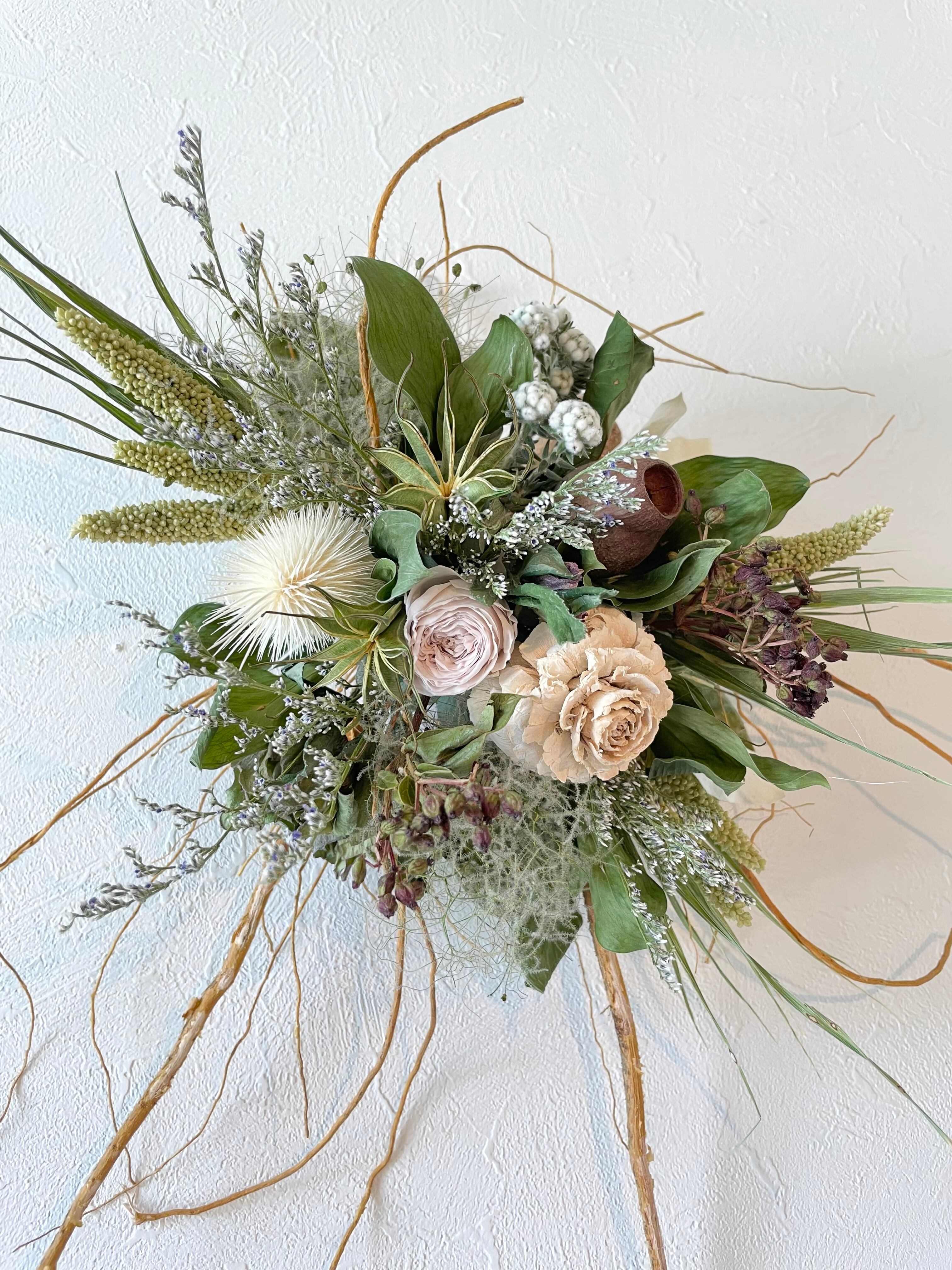 プリザーブドの淡いピンクベージュのバラを入れて華やかに。