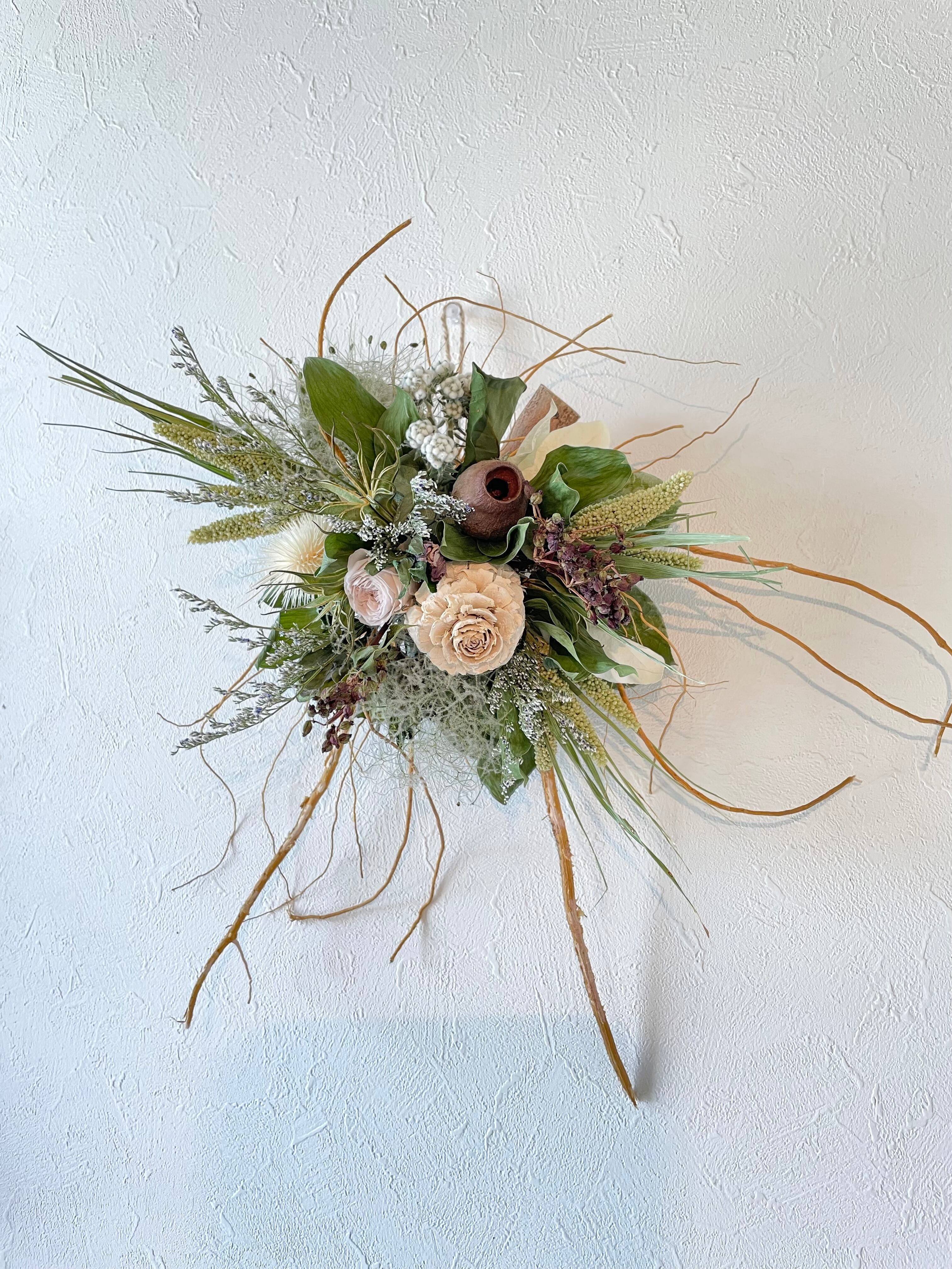 コットンの根をベースにして、白グリーン系の夏らしい花材をアレンジしました。