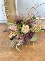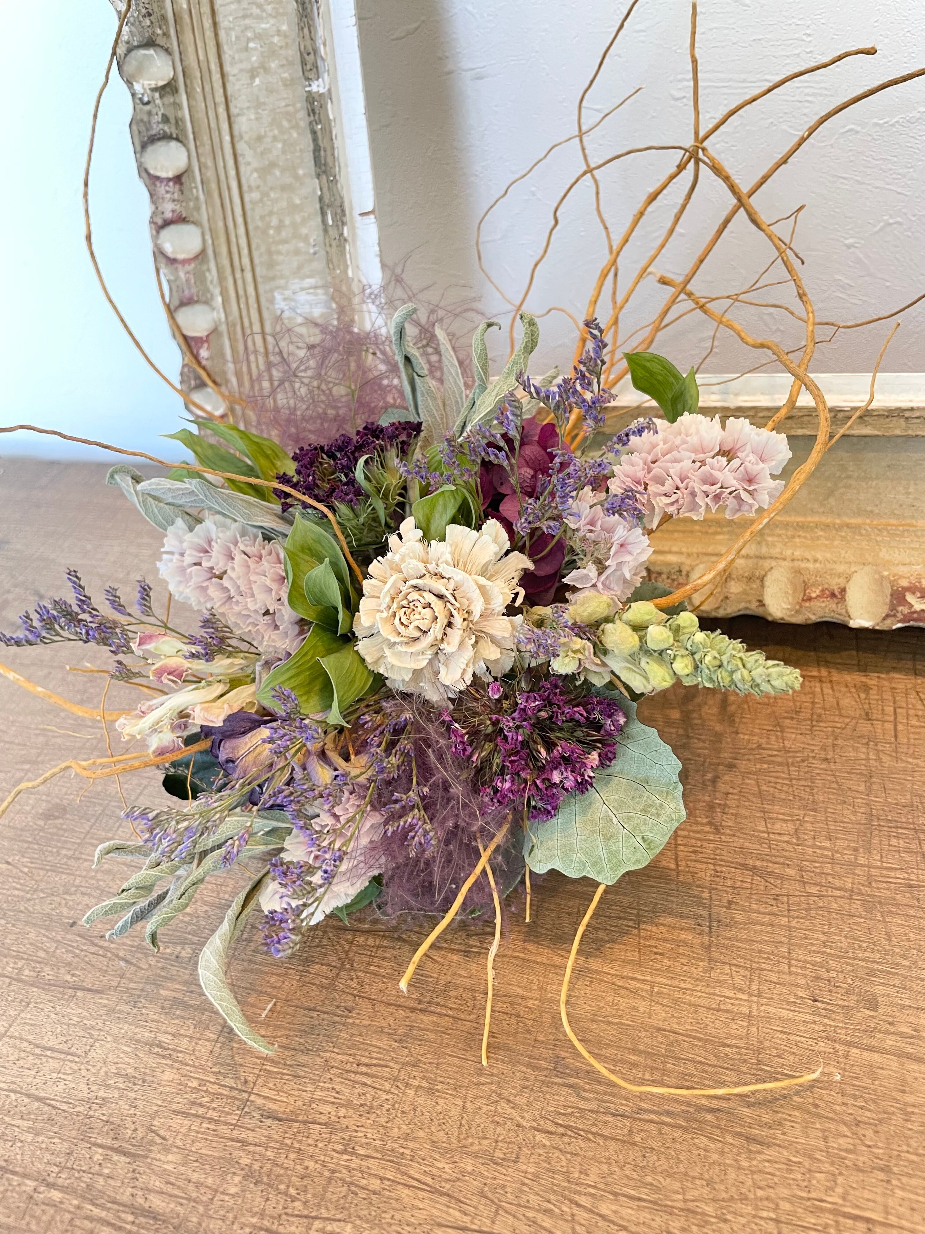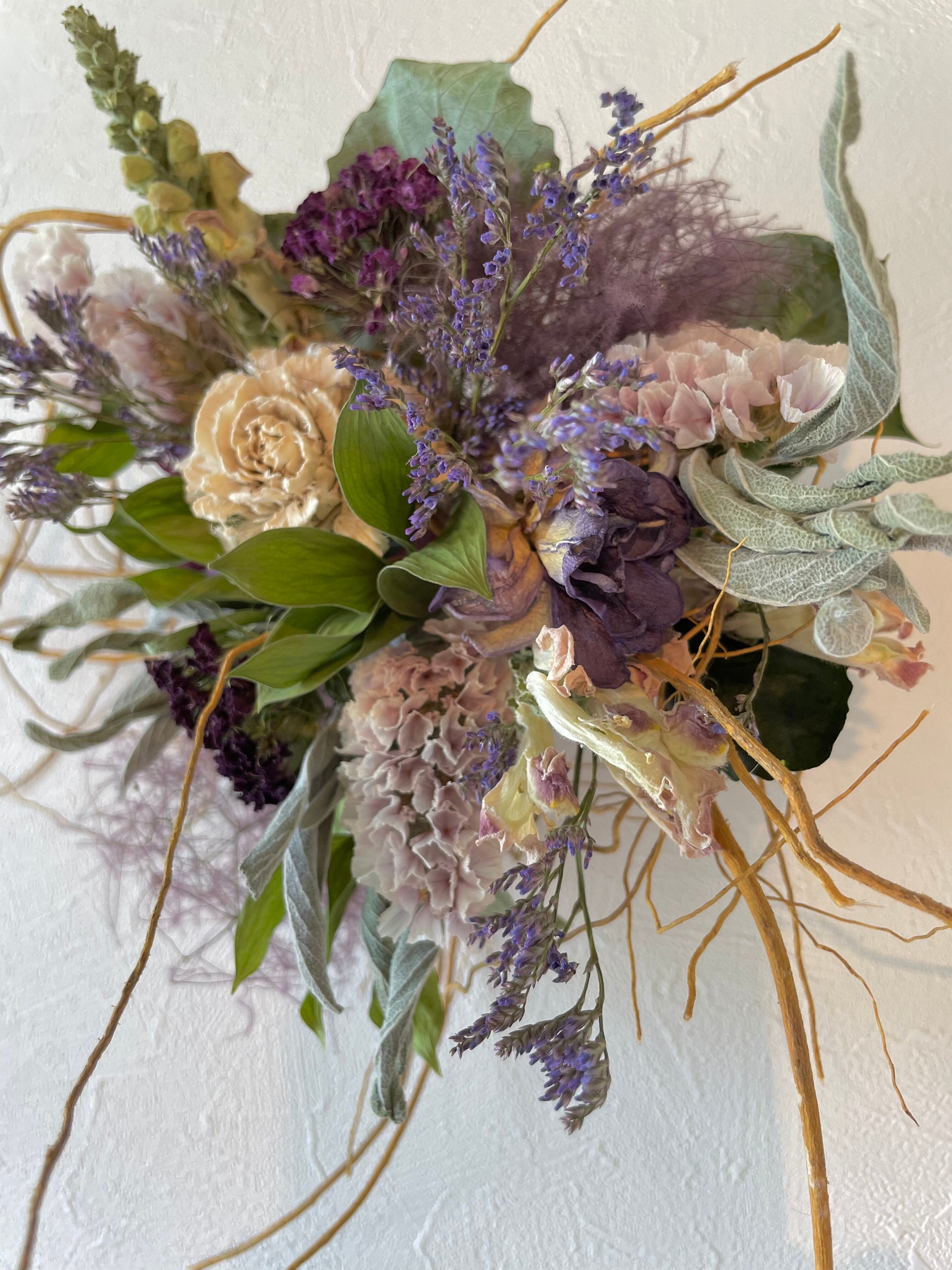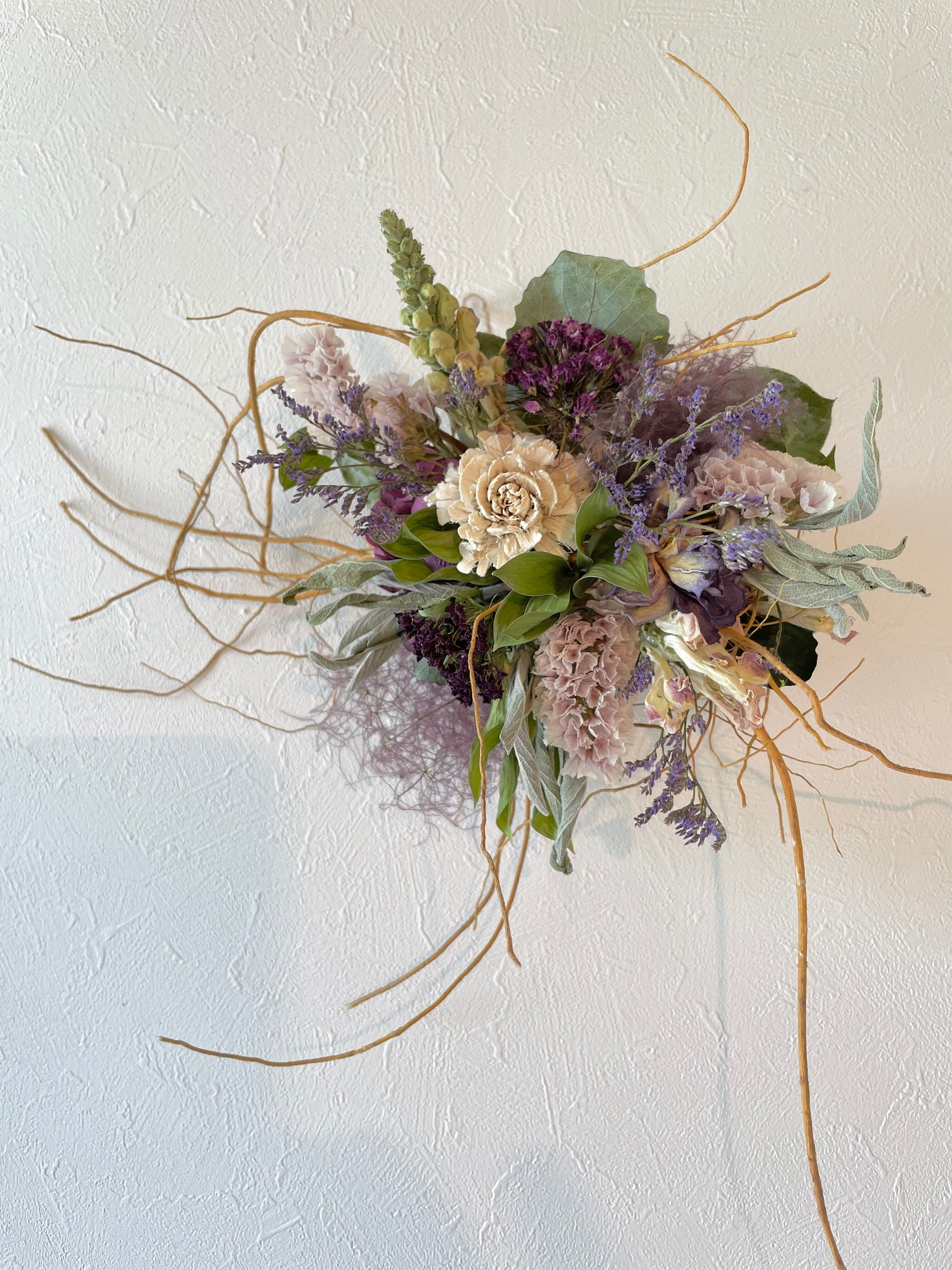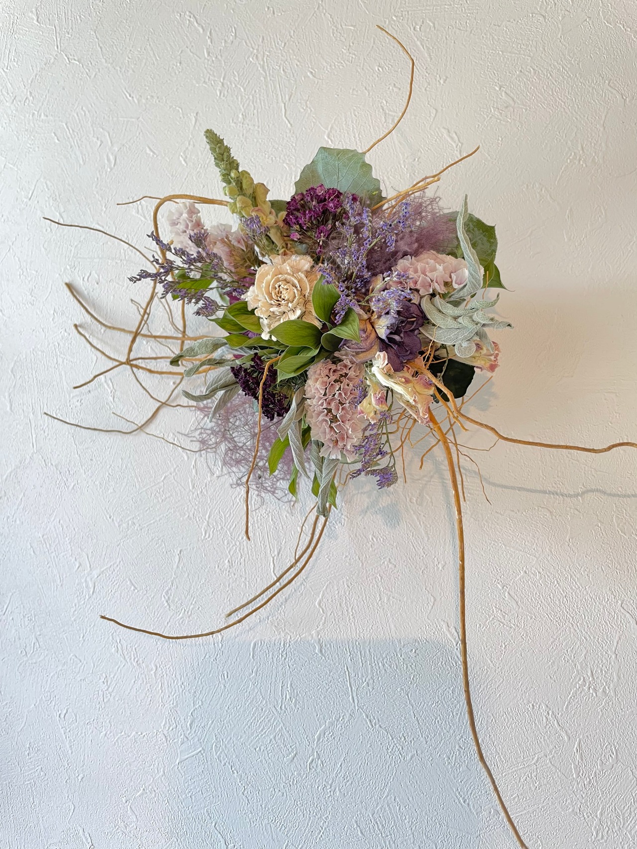 コットンの根をベースにして、シックな淡いパープルのスターチスや、珍しいチューリップやスナップのドライフラワーも入れてアレンジしました。