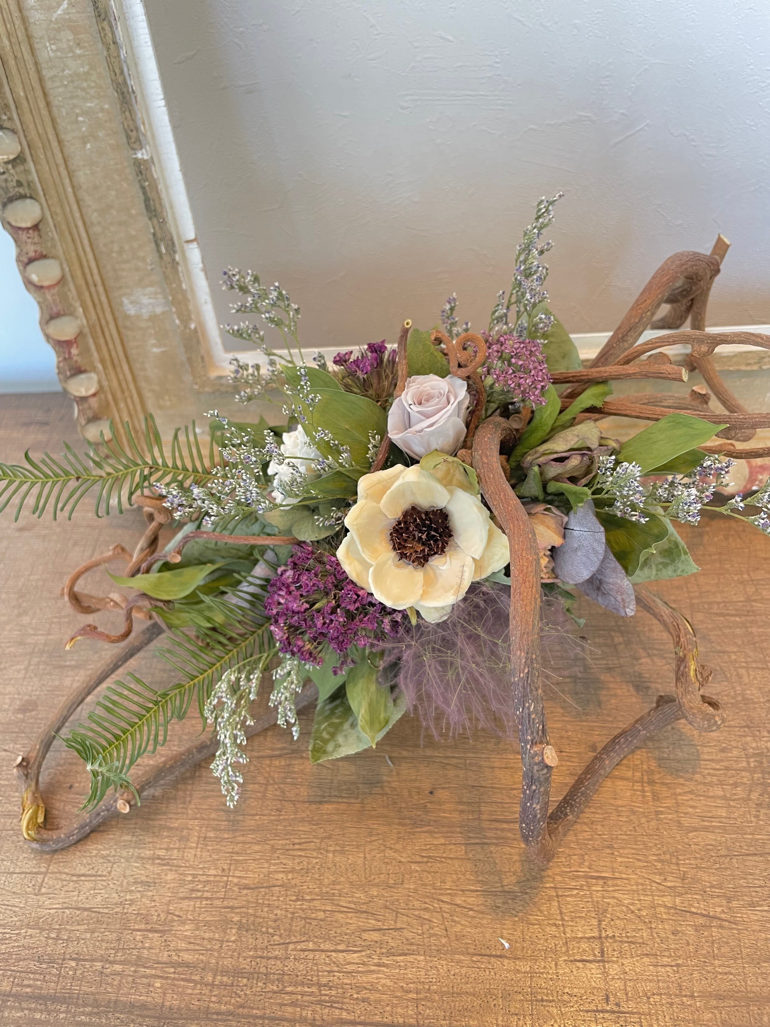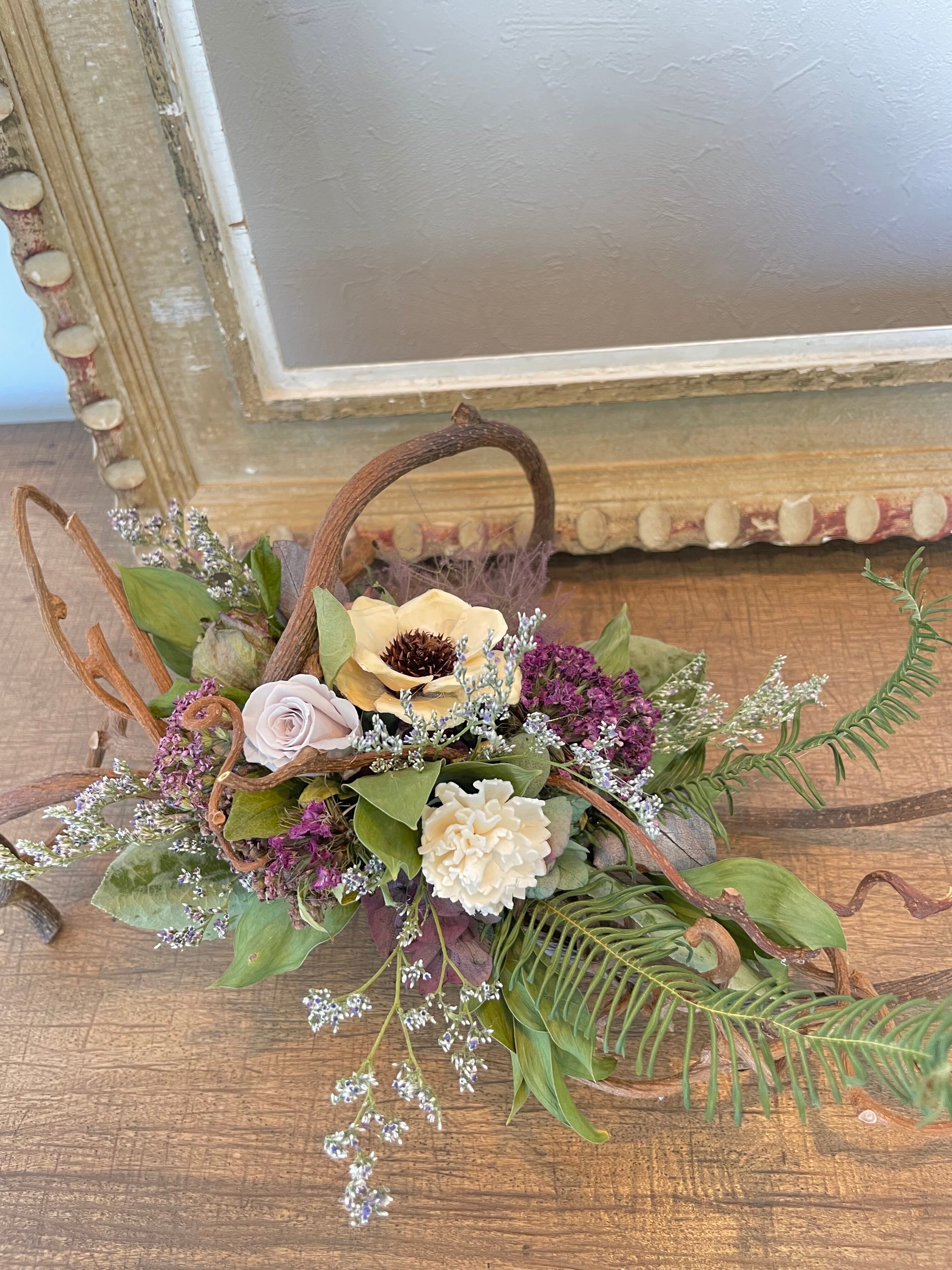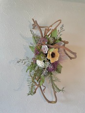 クルクルとした自然の動きがかわいい、キウイフルーツのツルをベースに淡いパープル・白系の花材をアレンジしました。