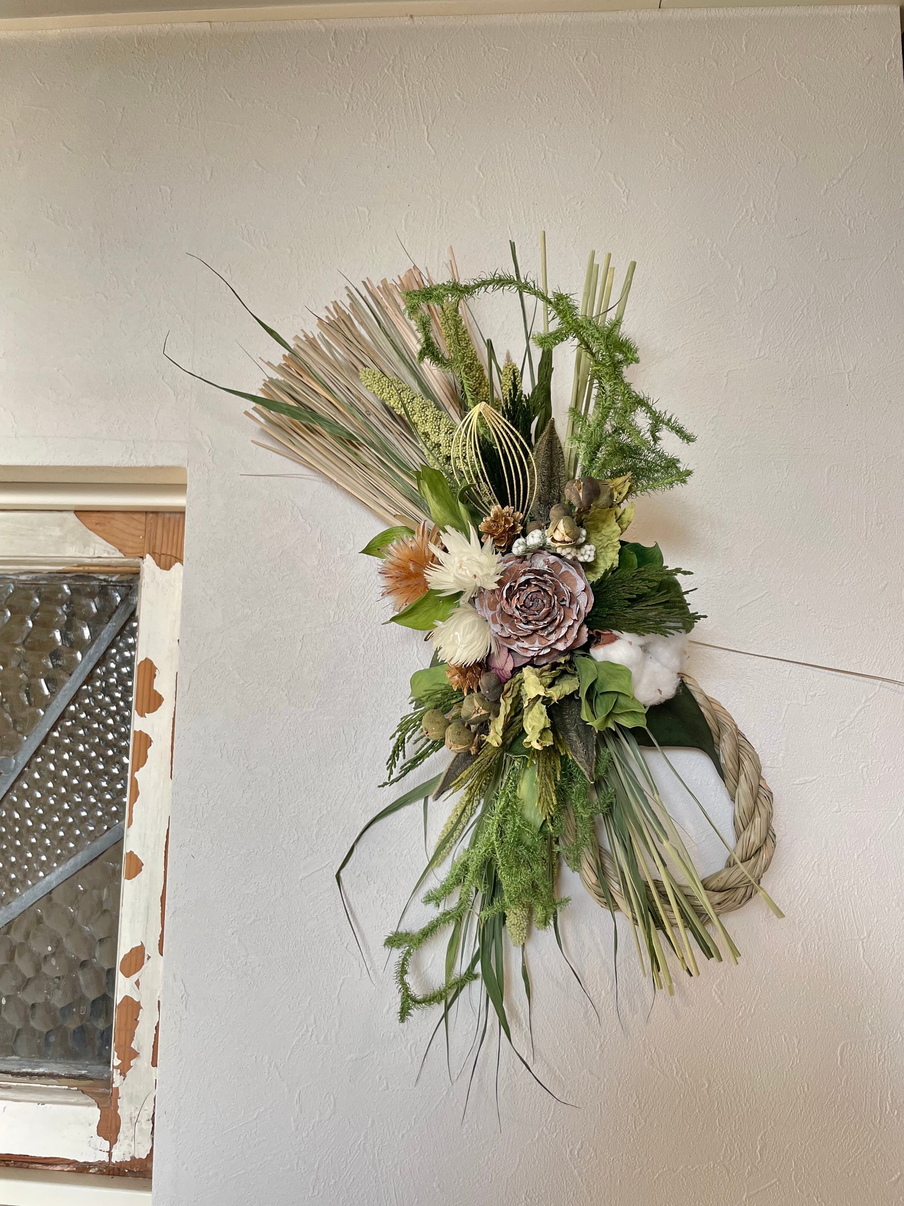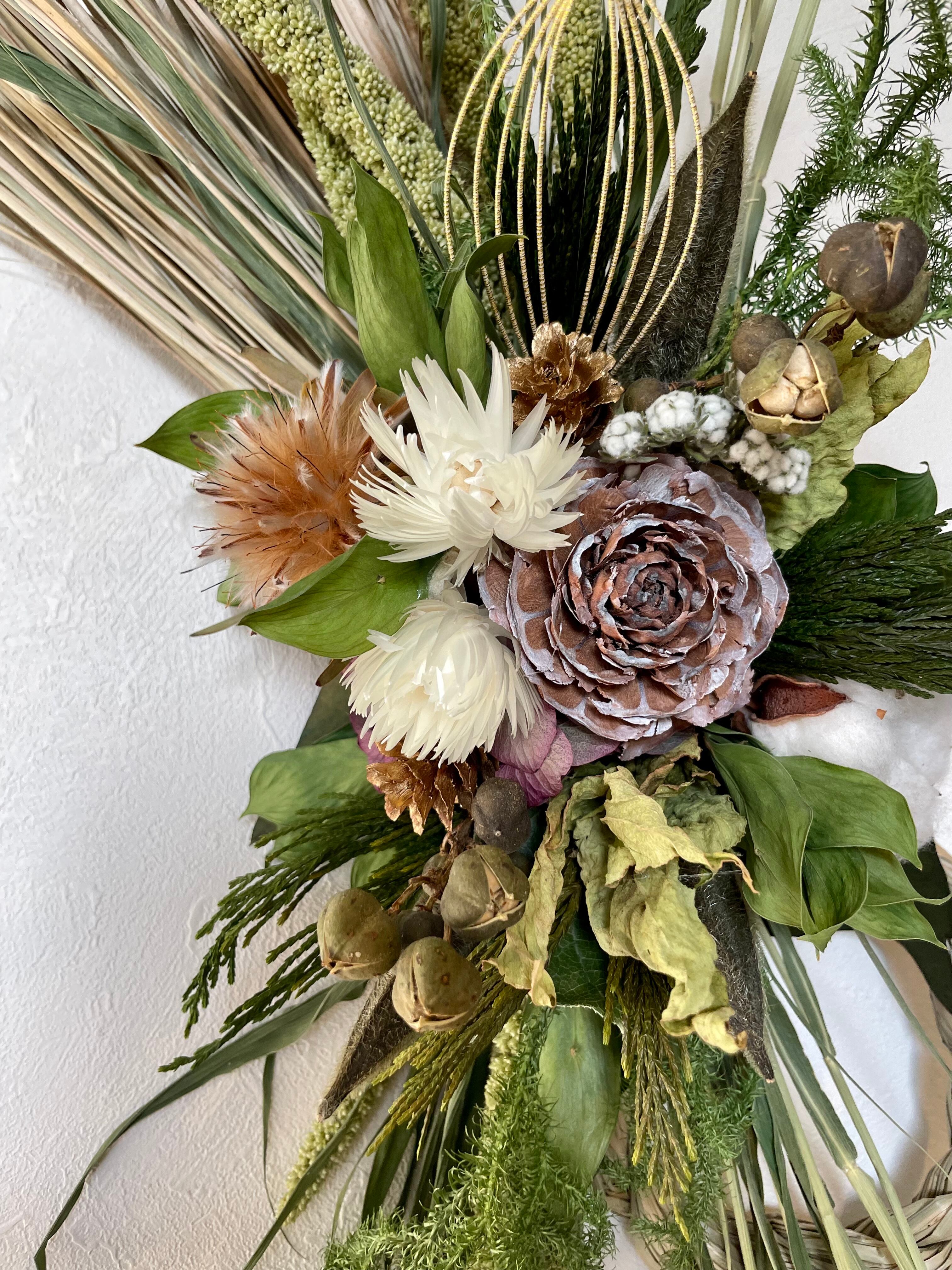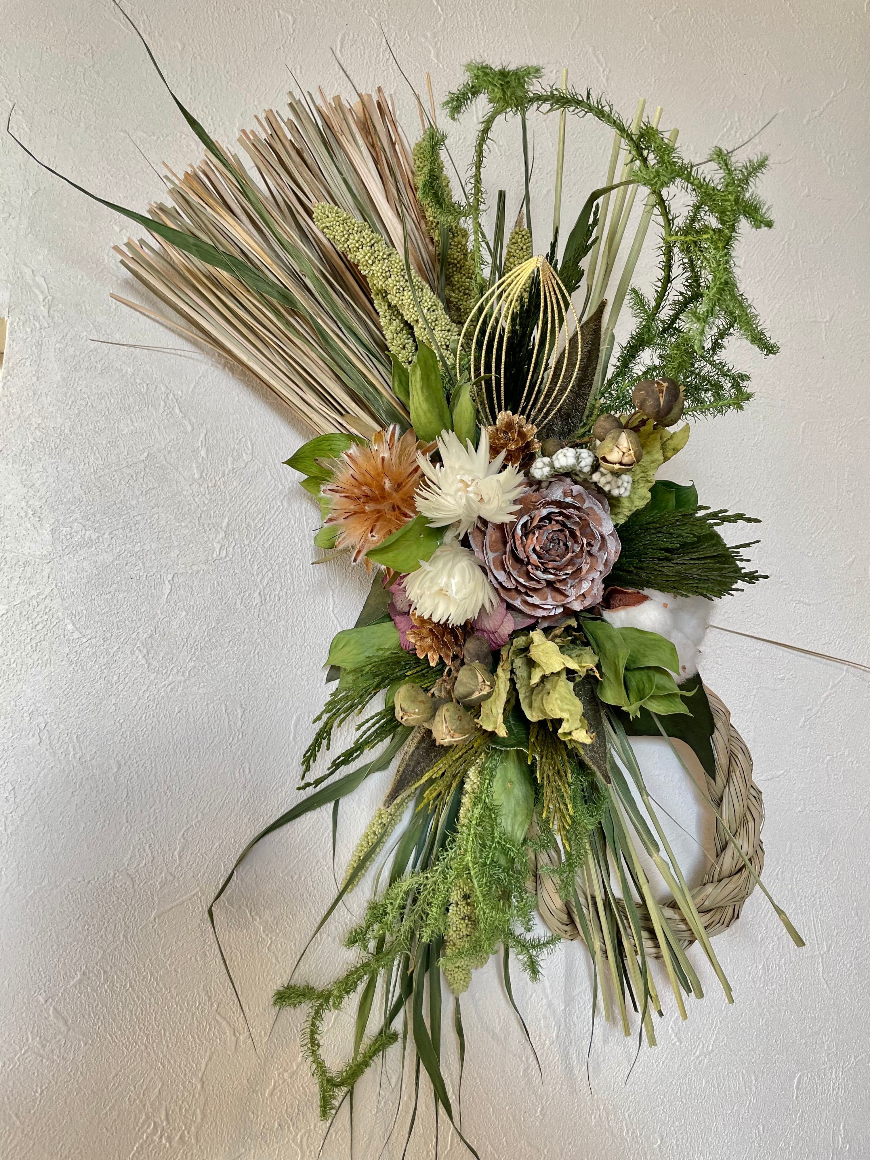 縦にボリューム感のあるスタイリッシュなしめ飾り。ヒカゲカズラの動きも面白い、個性的なしめ飾りです。シックな茶色のシダローズとコットンなどの白、コントラストが素敵な花合わせです。
