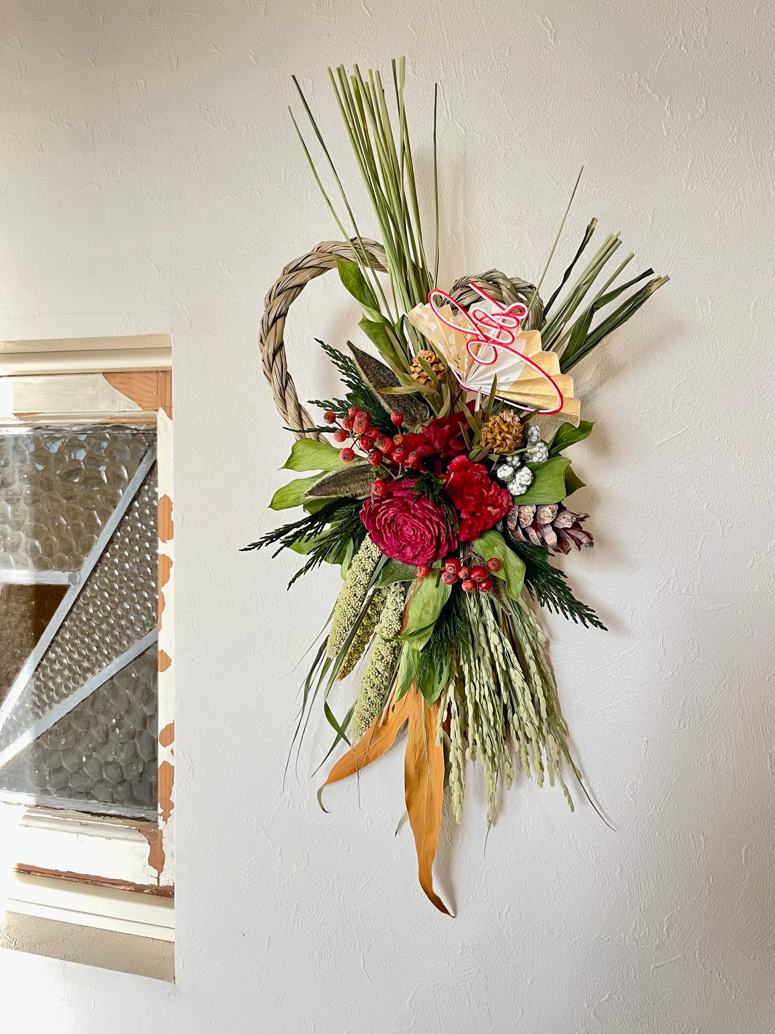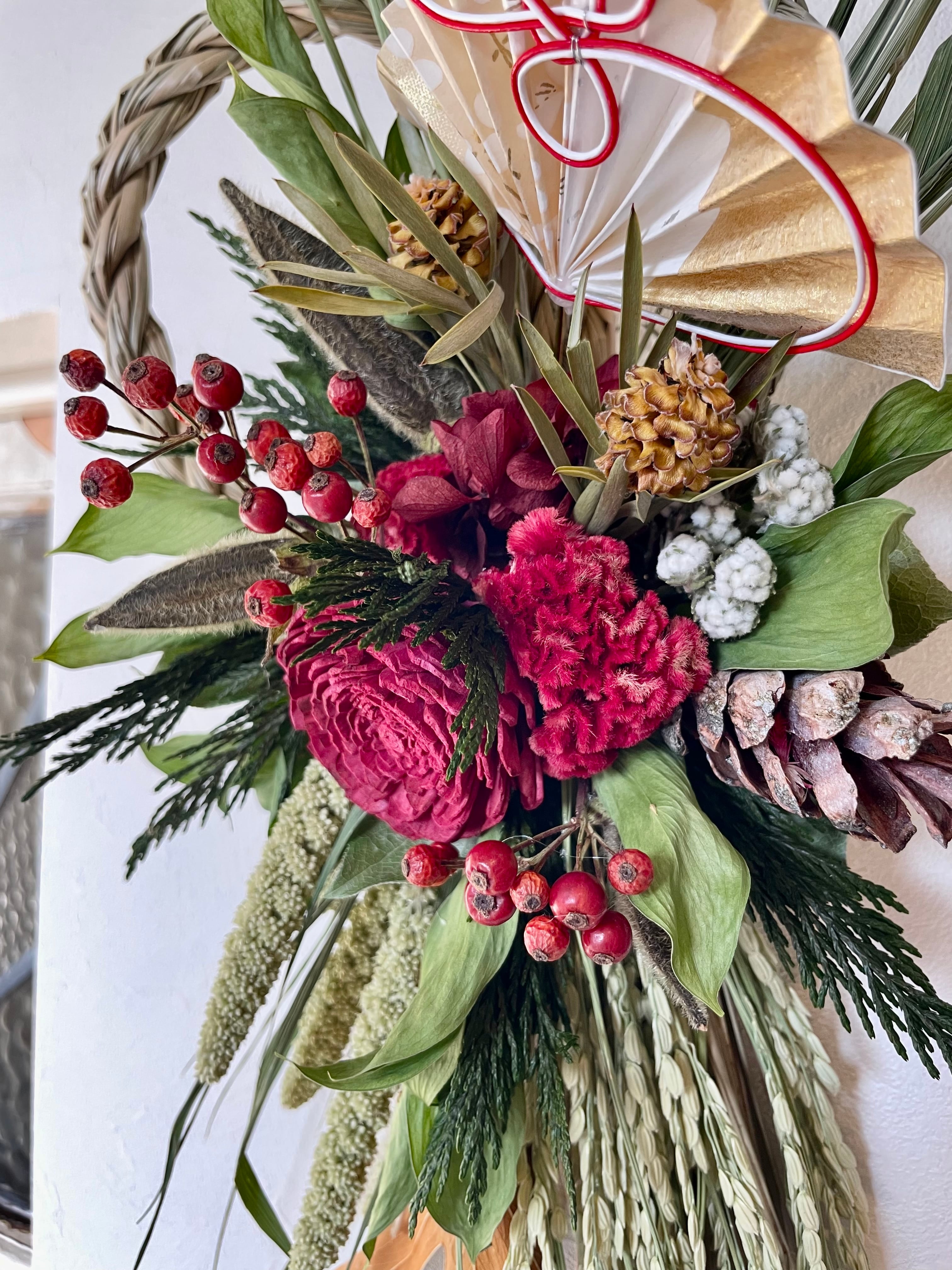 双葉になったしめ飾りベースに、赤系の花材をアレンジ。